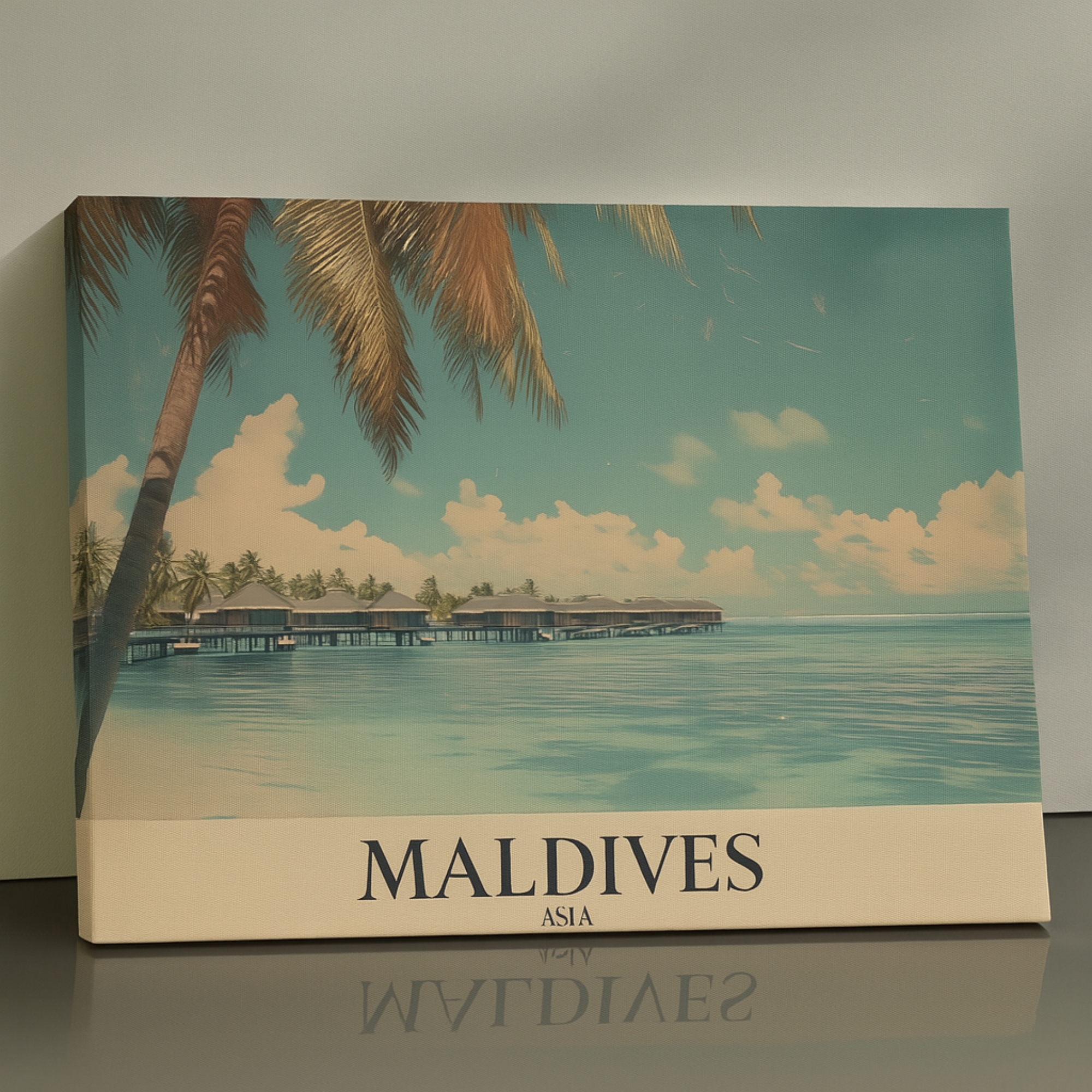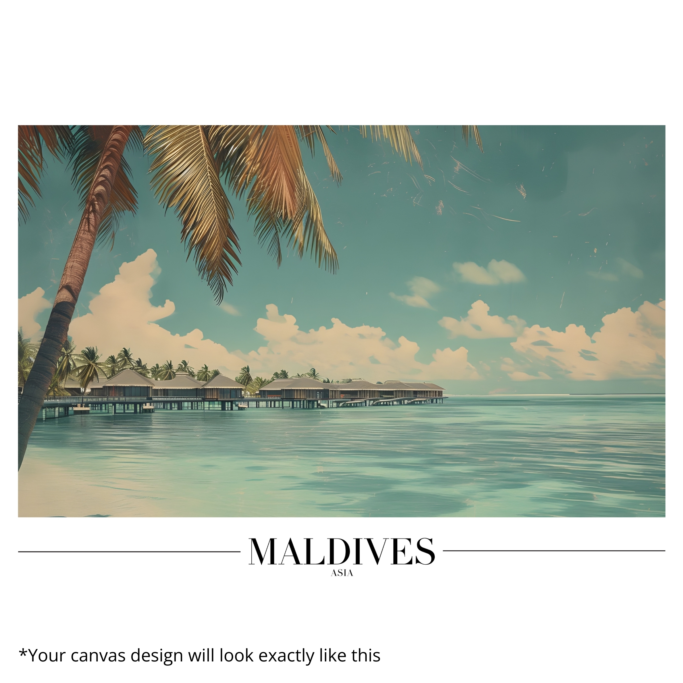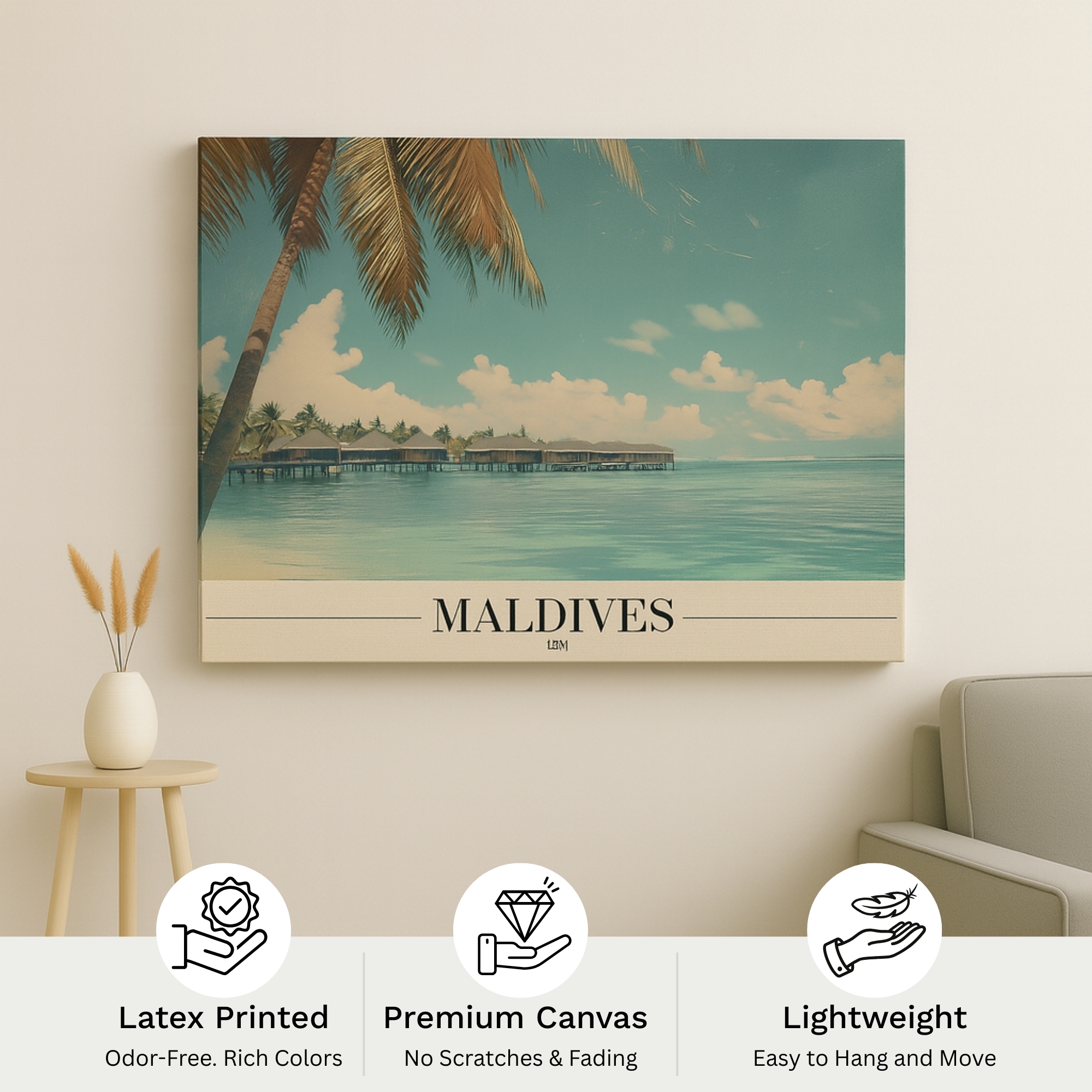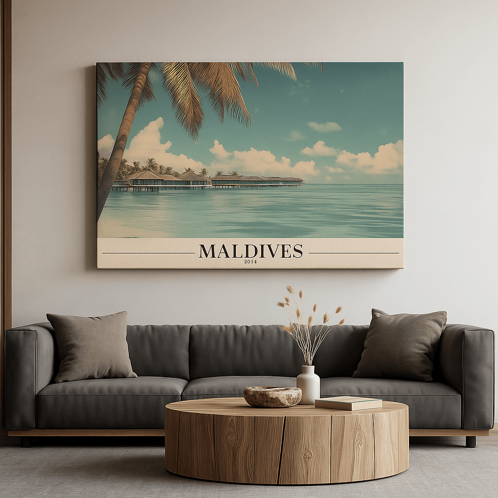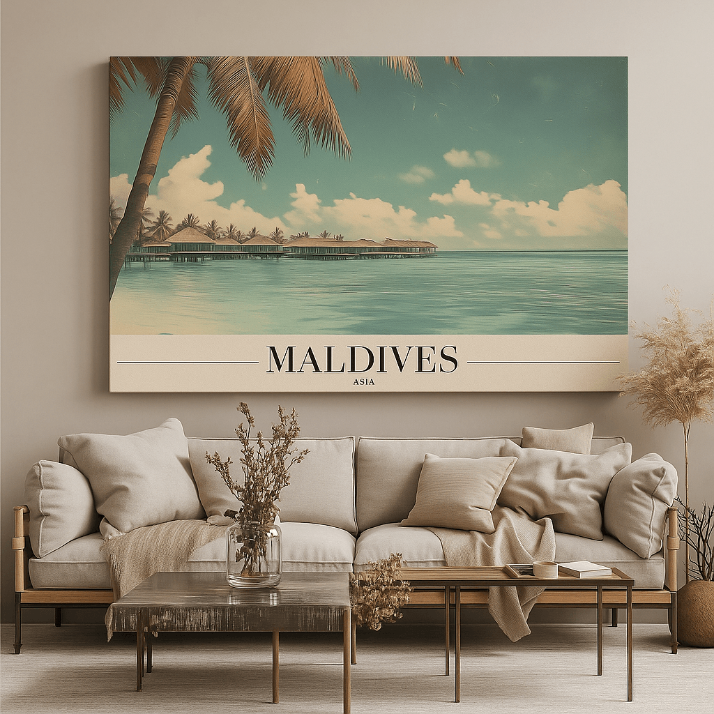 This Canvas Print inspired by the Maldives captures the beauty of crystal-clear waters, overwater villas, and tranquil skies. The peaceful scene evokes relaxation, luxury, and escape, making it ideal for bedrooms, spas, wellness spaces, and coastal-inspired interiors. Soft gradients and balanced composition create a soothing visual flow that enhances calm atmospheres. Printed on premium stretched canvas with eco-friendly latex inks, it delivers vivid detail and fade-resistant color quality. Lightweight yet durable and ready to hang, this Canvas Print transforms your wall into a serene tropical retreat with lasting elegance.