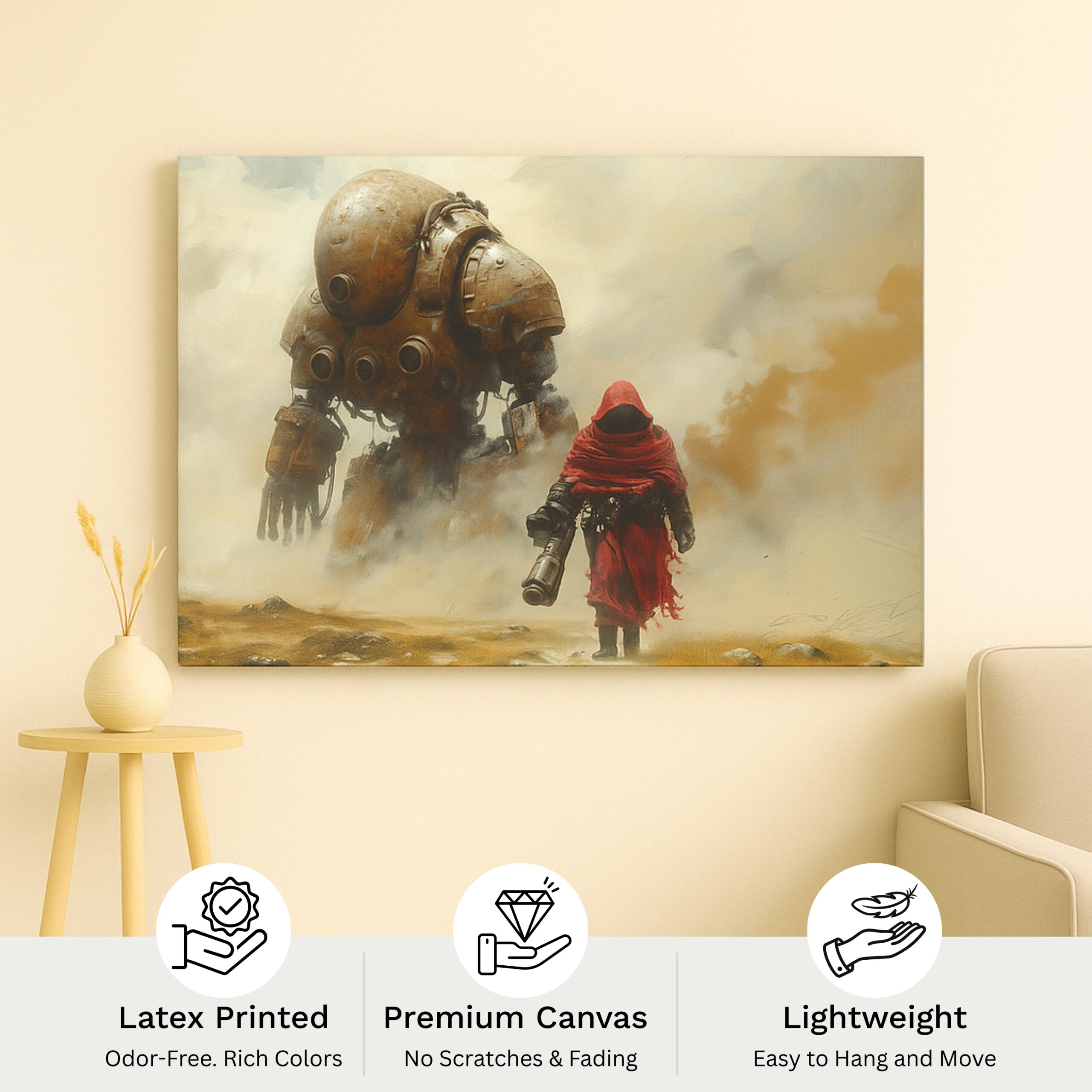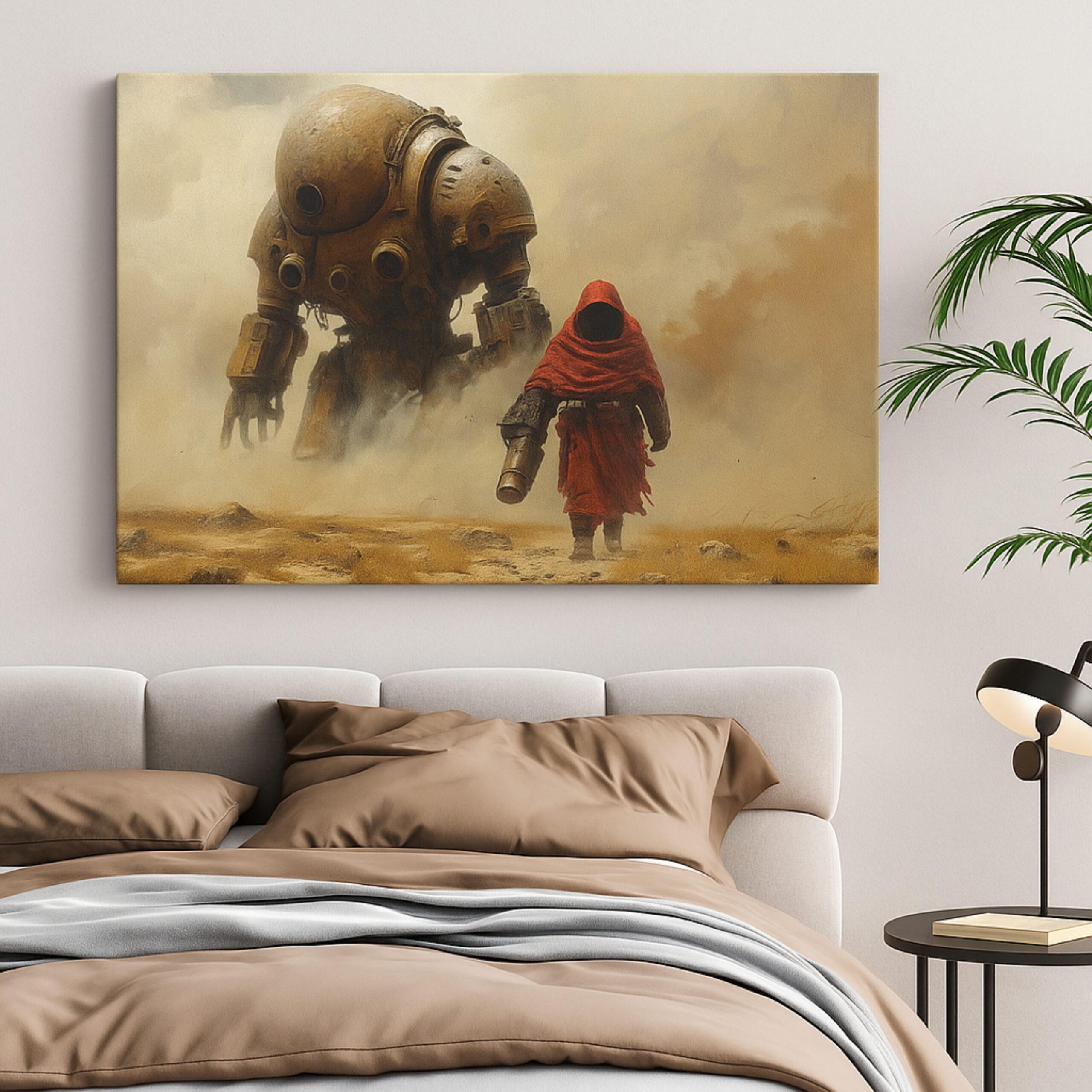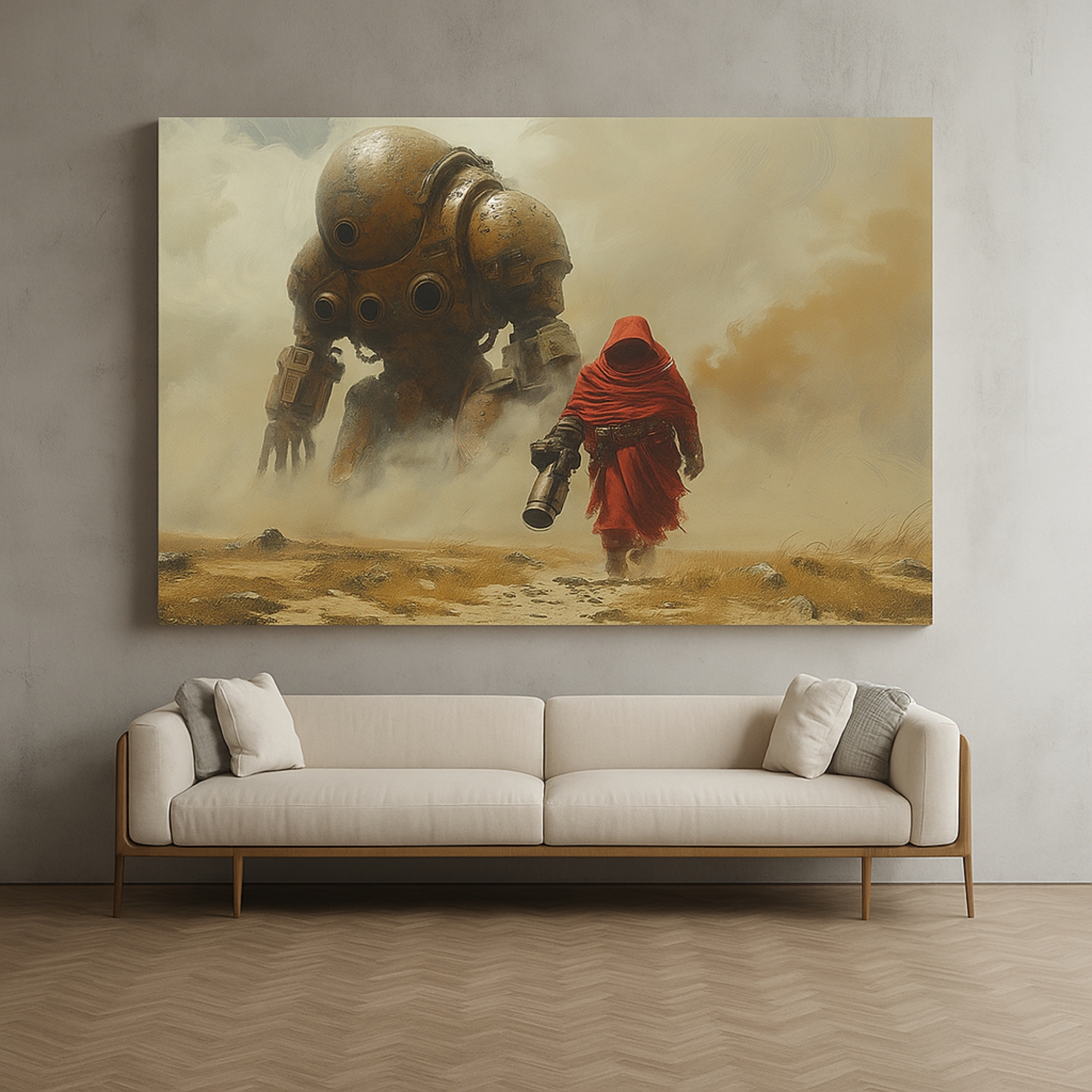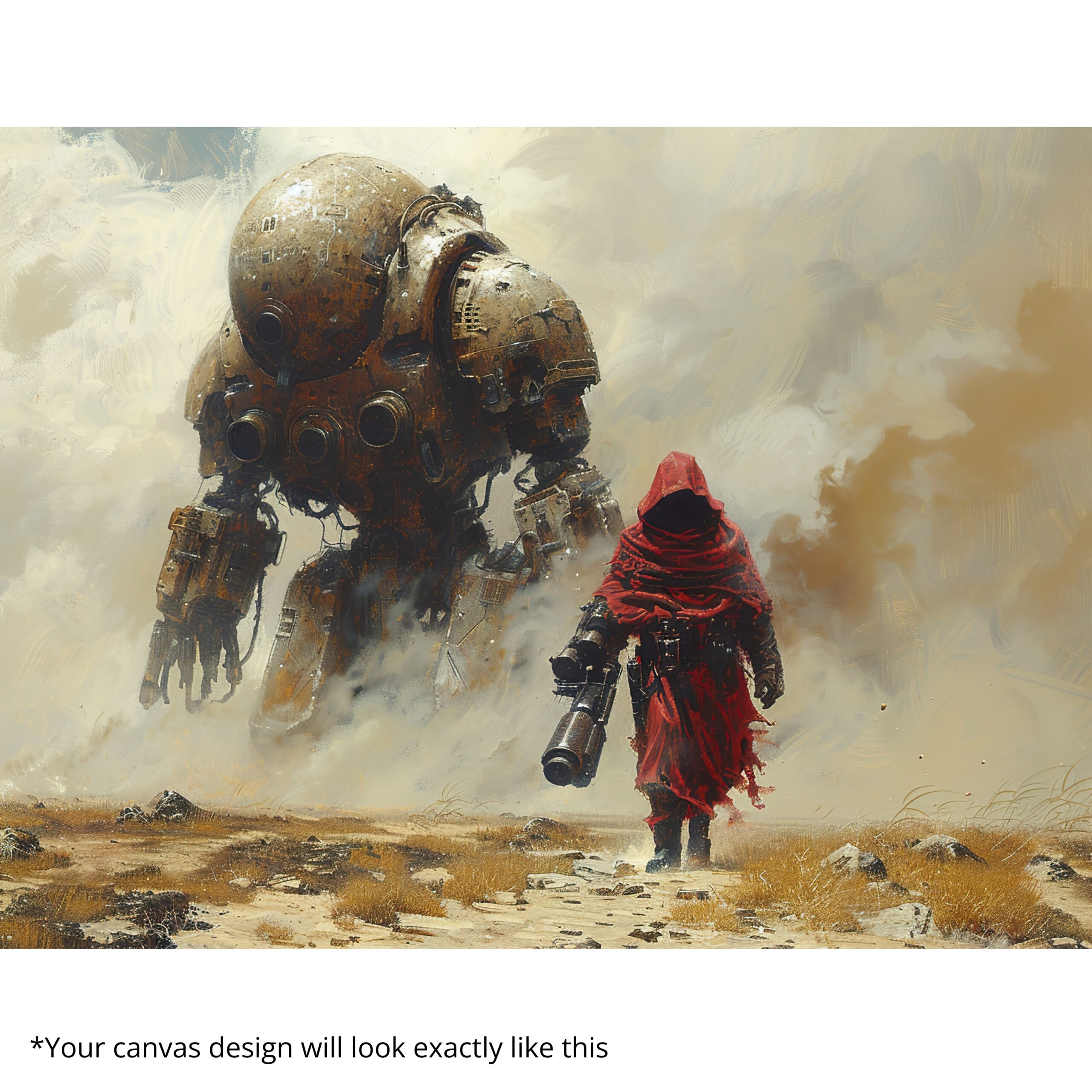 Futuristic mech and lone figure in cinematic desert scene. Premium canvas, fade-resistant inks, hand-stretched, and ready-to-hang.