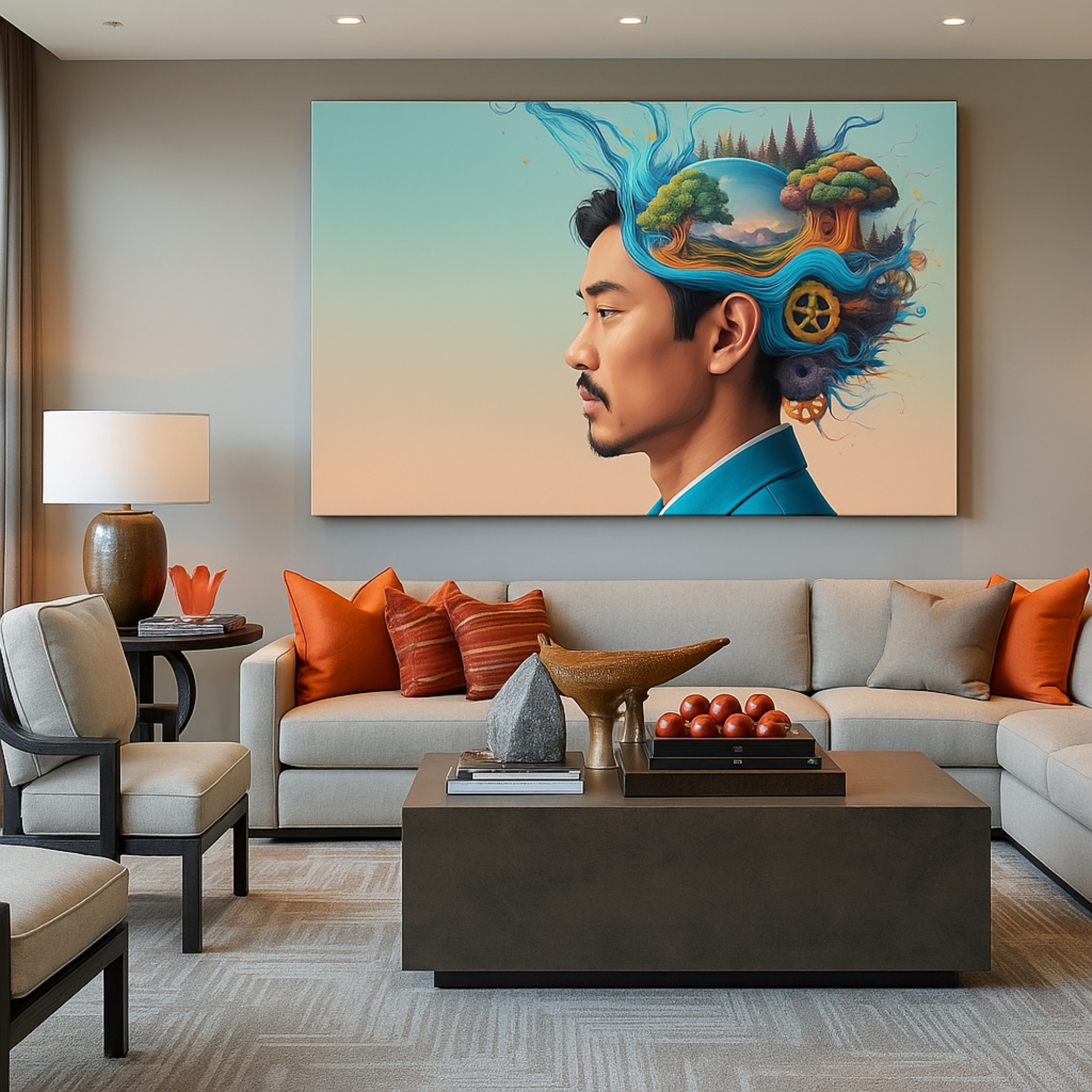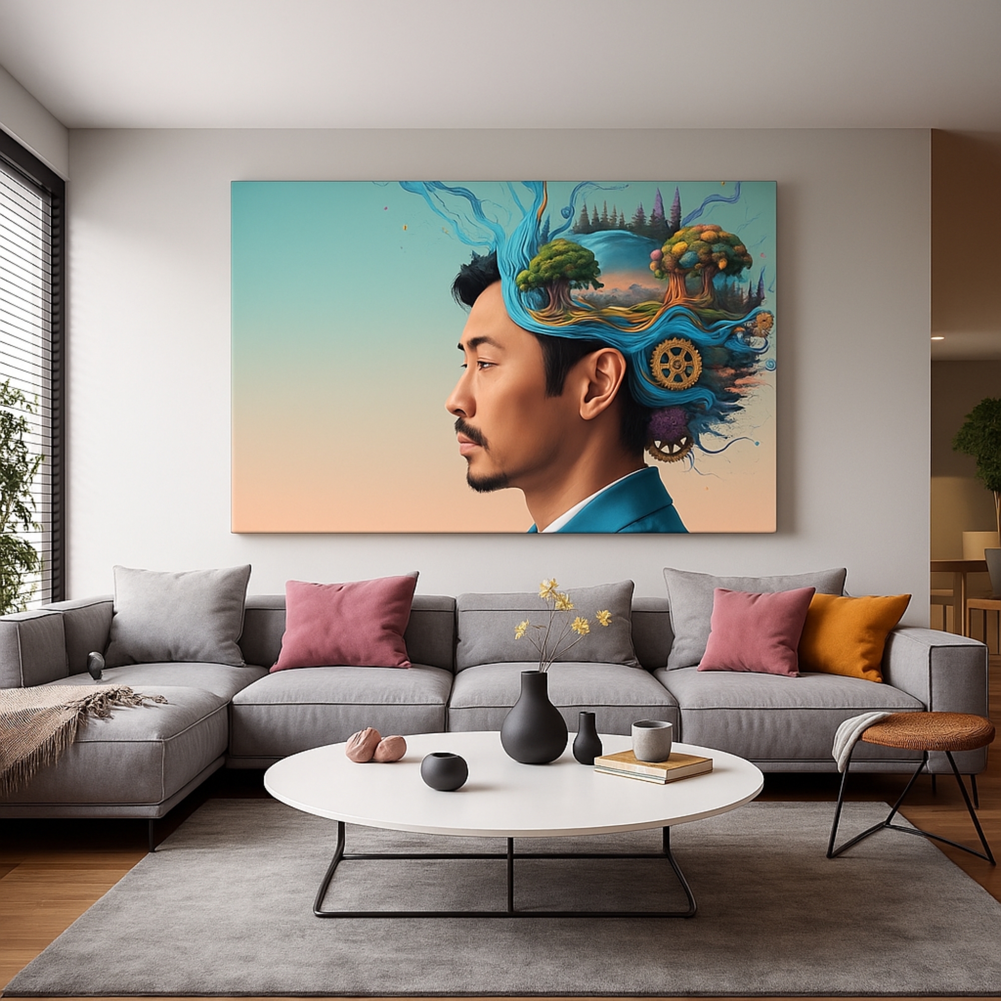 This Canvas Print presents a contemplative human figure seated calmly against a deep green backdrop, with their head transformed into a soft white cloud. The Canvas Print symbolizes introspection, emotional release, and those quiet moments when thoughts drift freely, making it ideal for modern homes, creative studios, and meditation spaces where calm and clarity are essential. A minimalist composition paired with gentle surrealism creates a balanced visual that feels both grounded and deeply relatable.