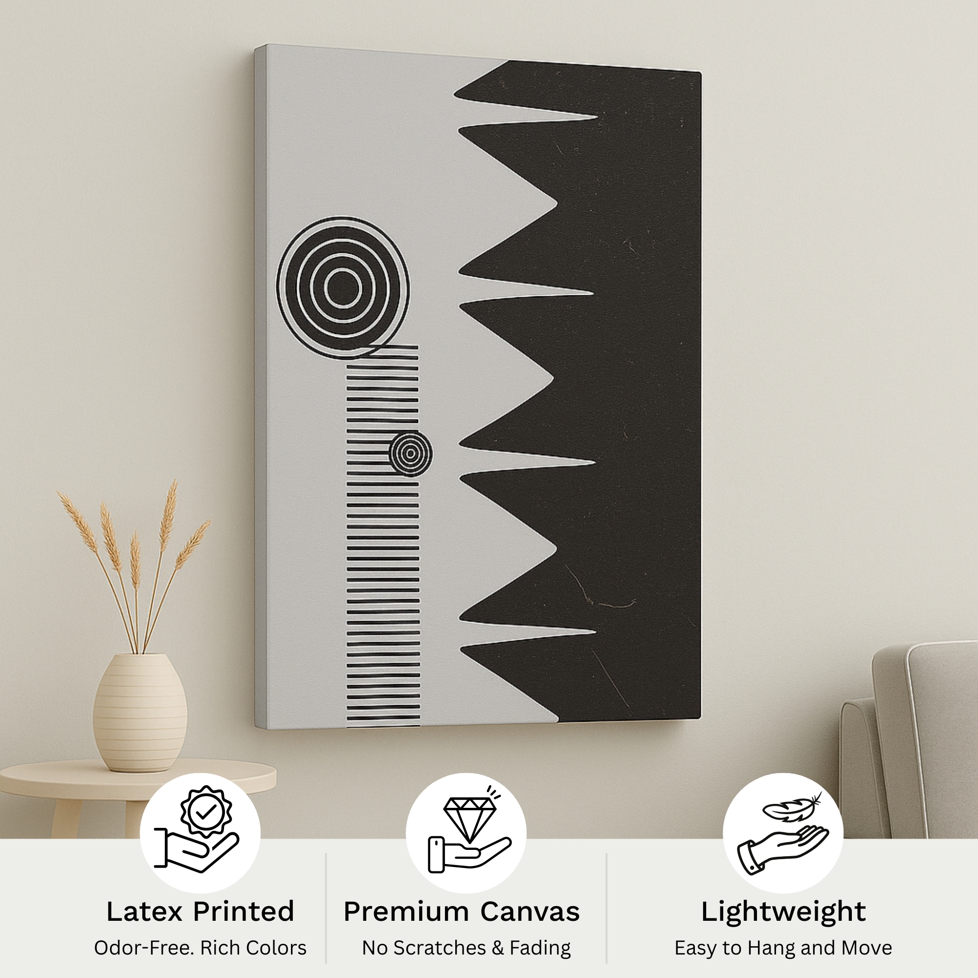 Curate it with matte black frames, concrete textures, or wood tones to sharpen contrast and depth. This minimalist canvas print also makes a refined gift for design lovers and monochrome aesthetes. Printed on premium stretched canvas with fade-resistant inks, it maintains crisp edges and rich tones for years. Proudly made in India.