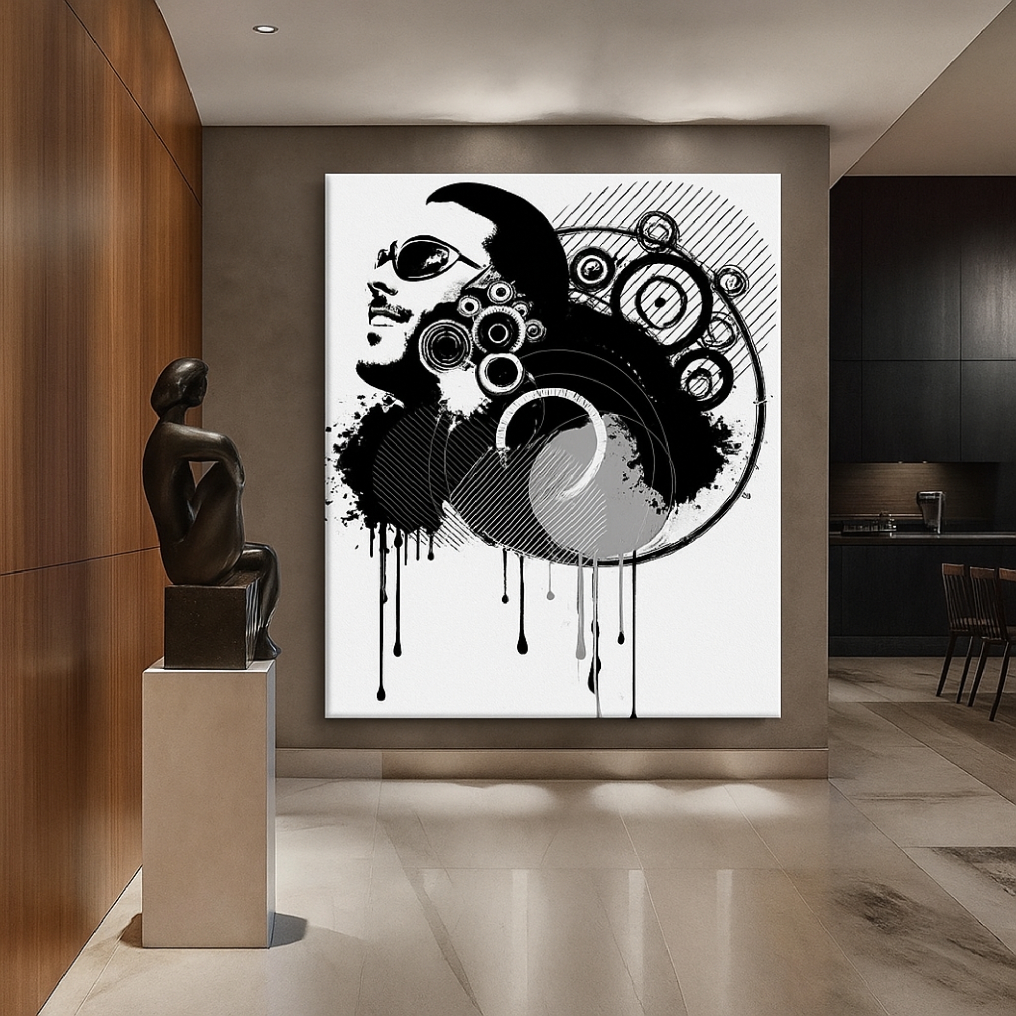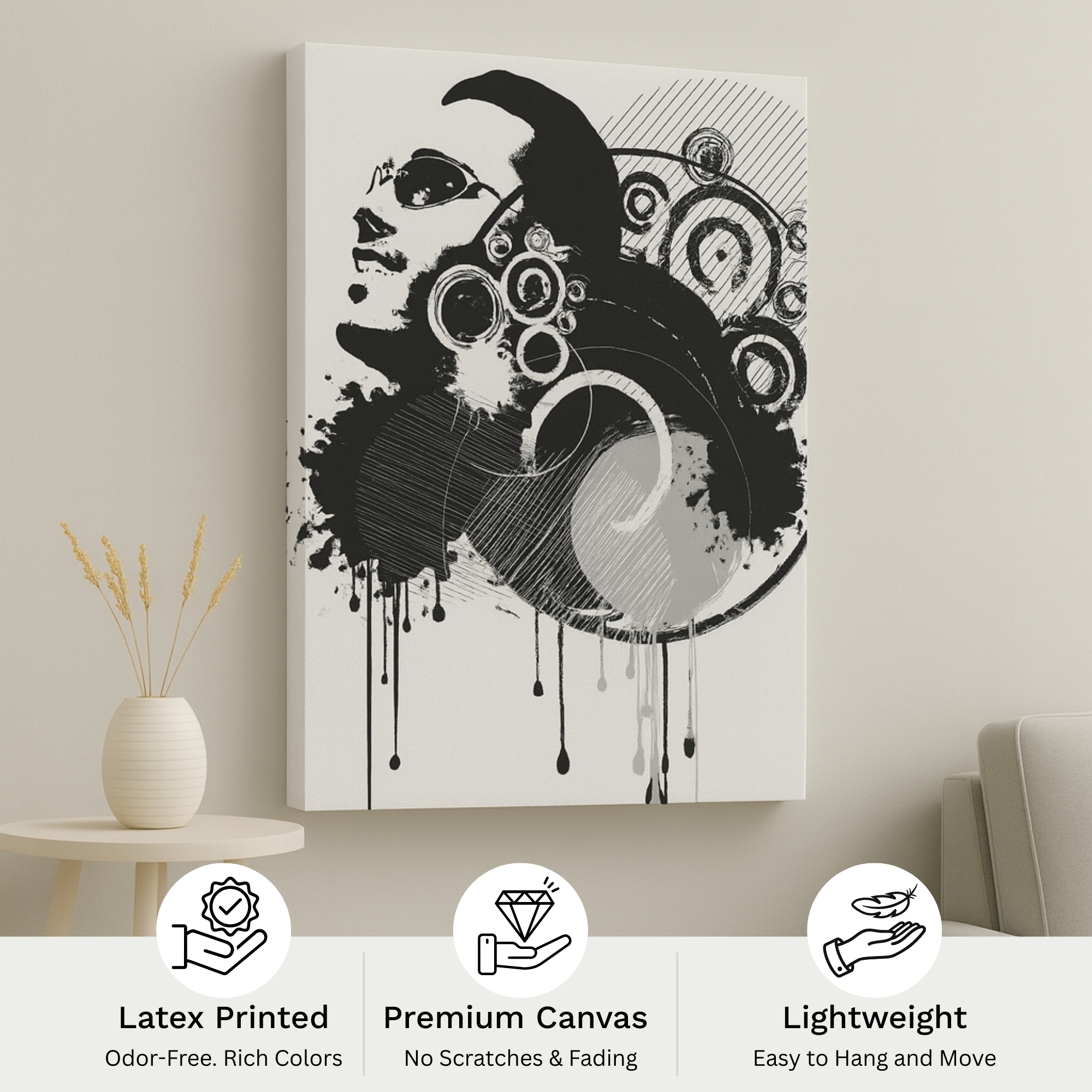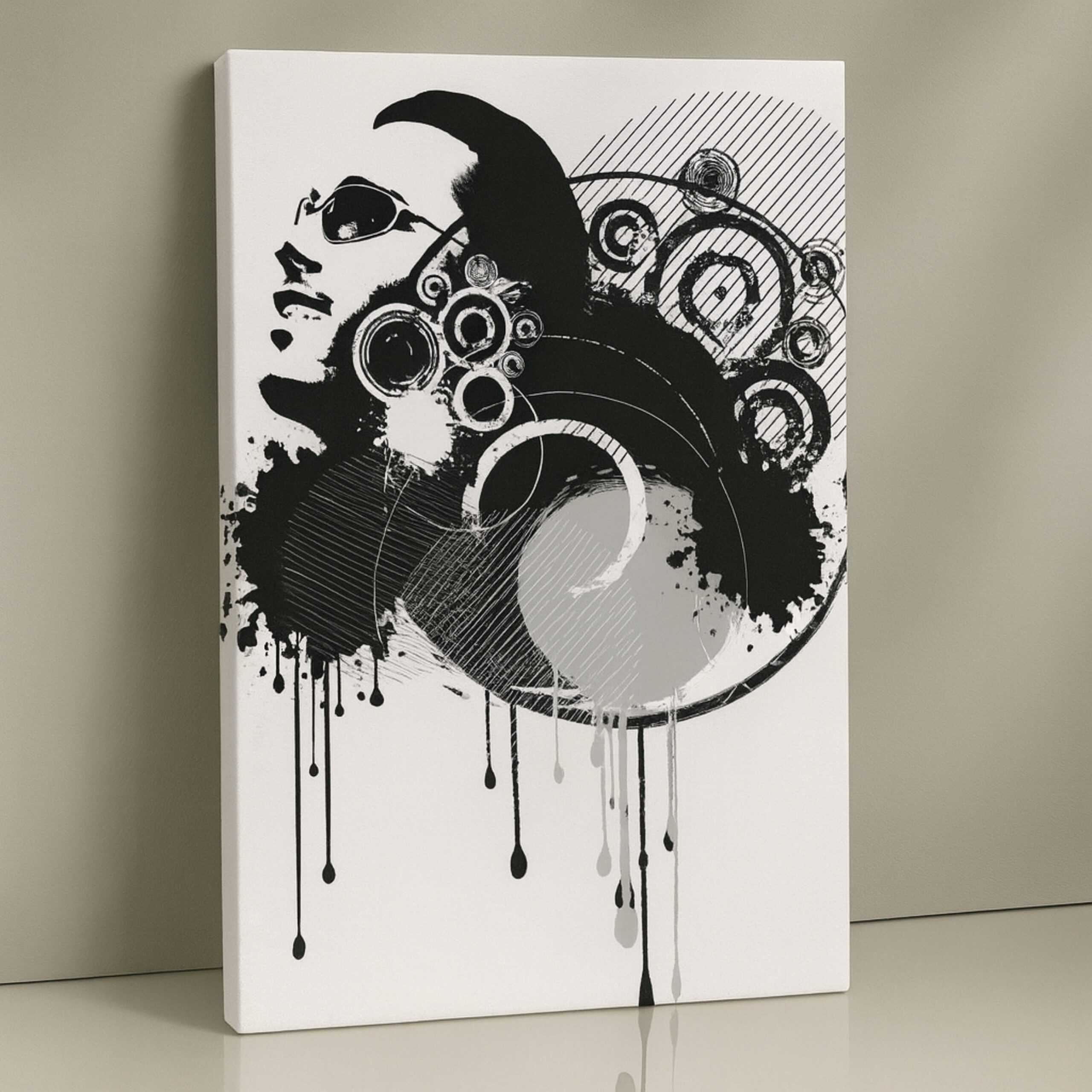 The Monochrome Beats Canvas Print celebrates rhythm in pure black and white. Featuring abstract sound waves and urban grunge detail, it captures the spirit of music through minimalist yet striking form. A joyful portrait surrounded by circular waves adds creative rhythm to interiors.