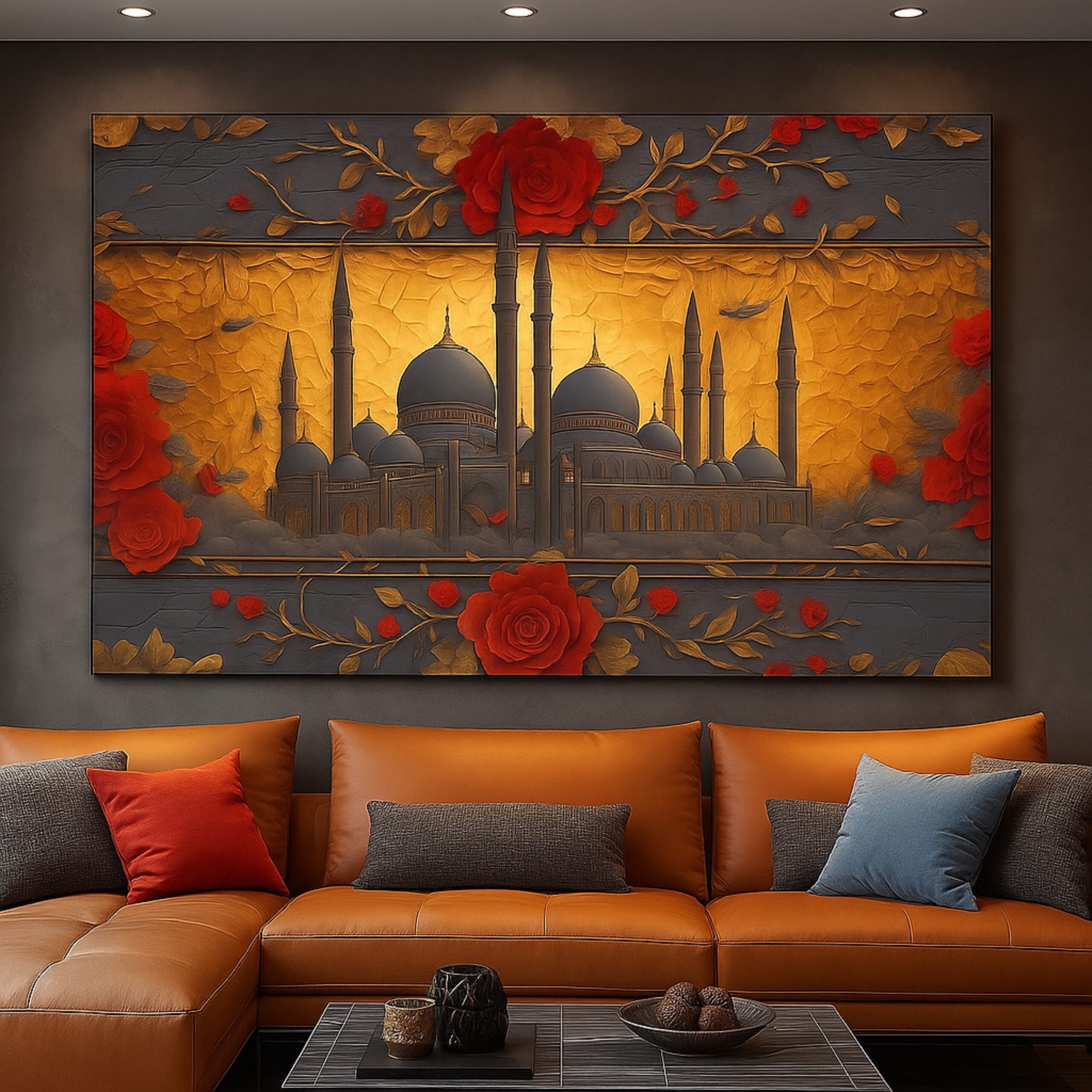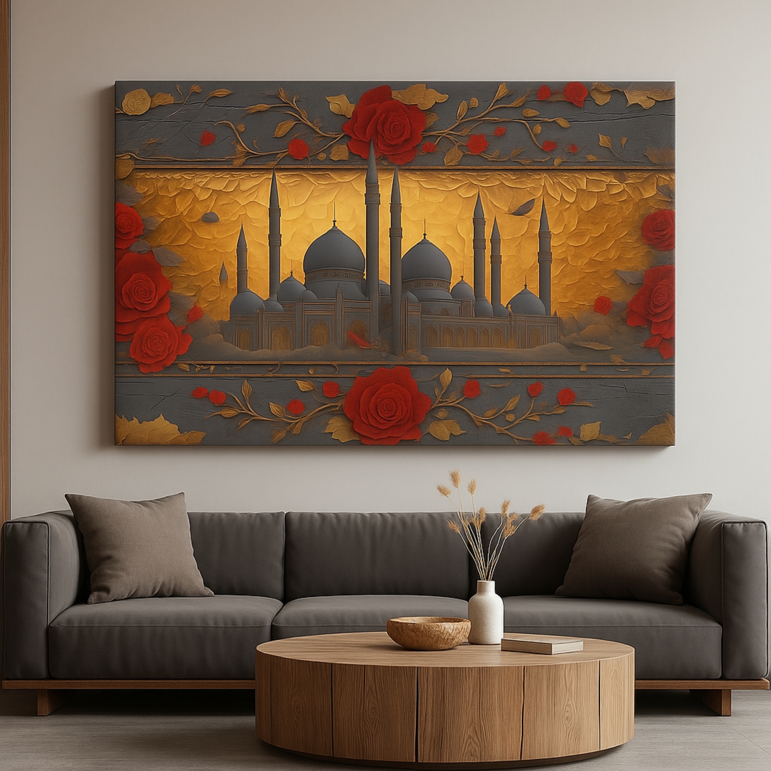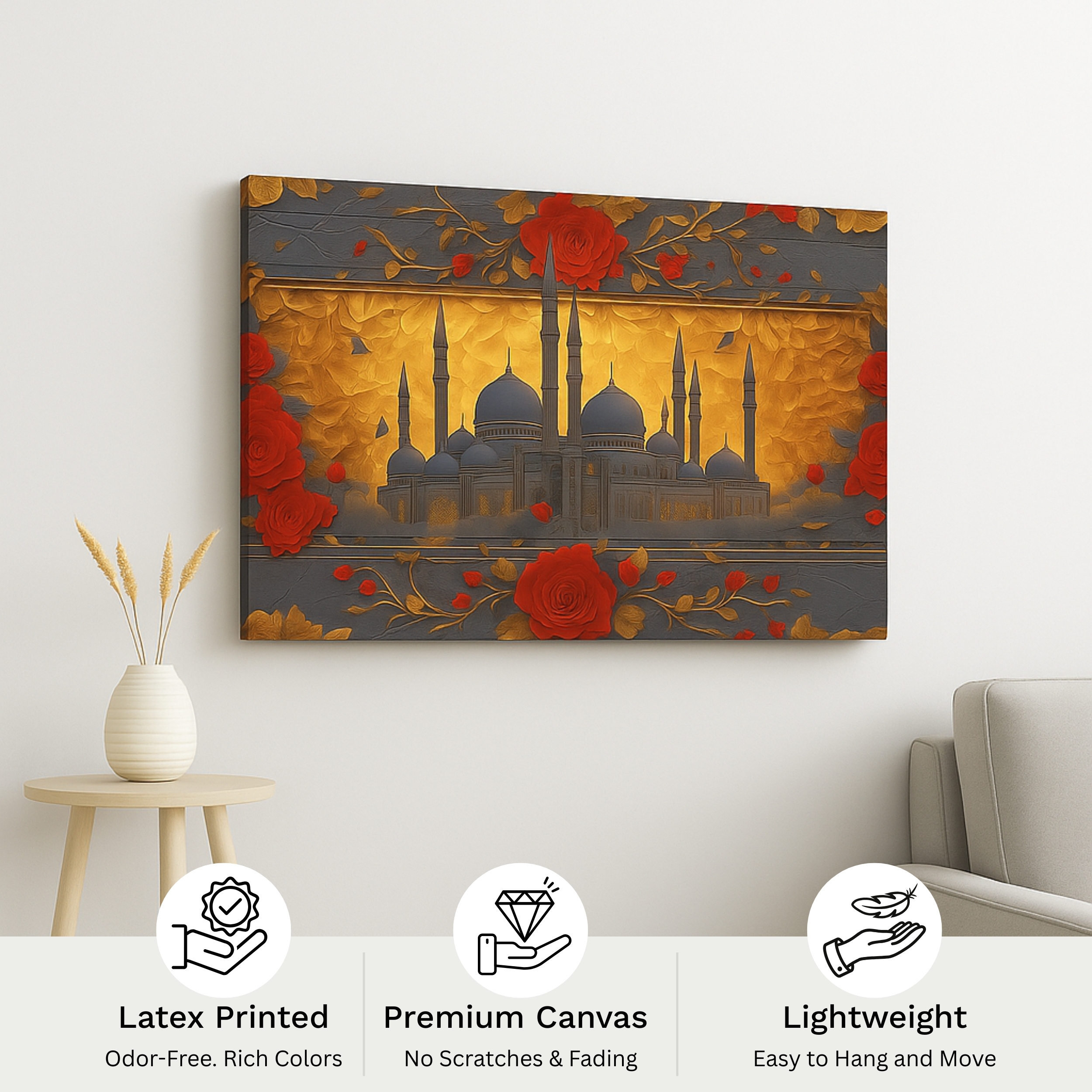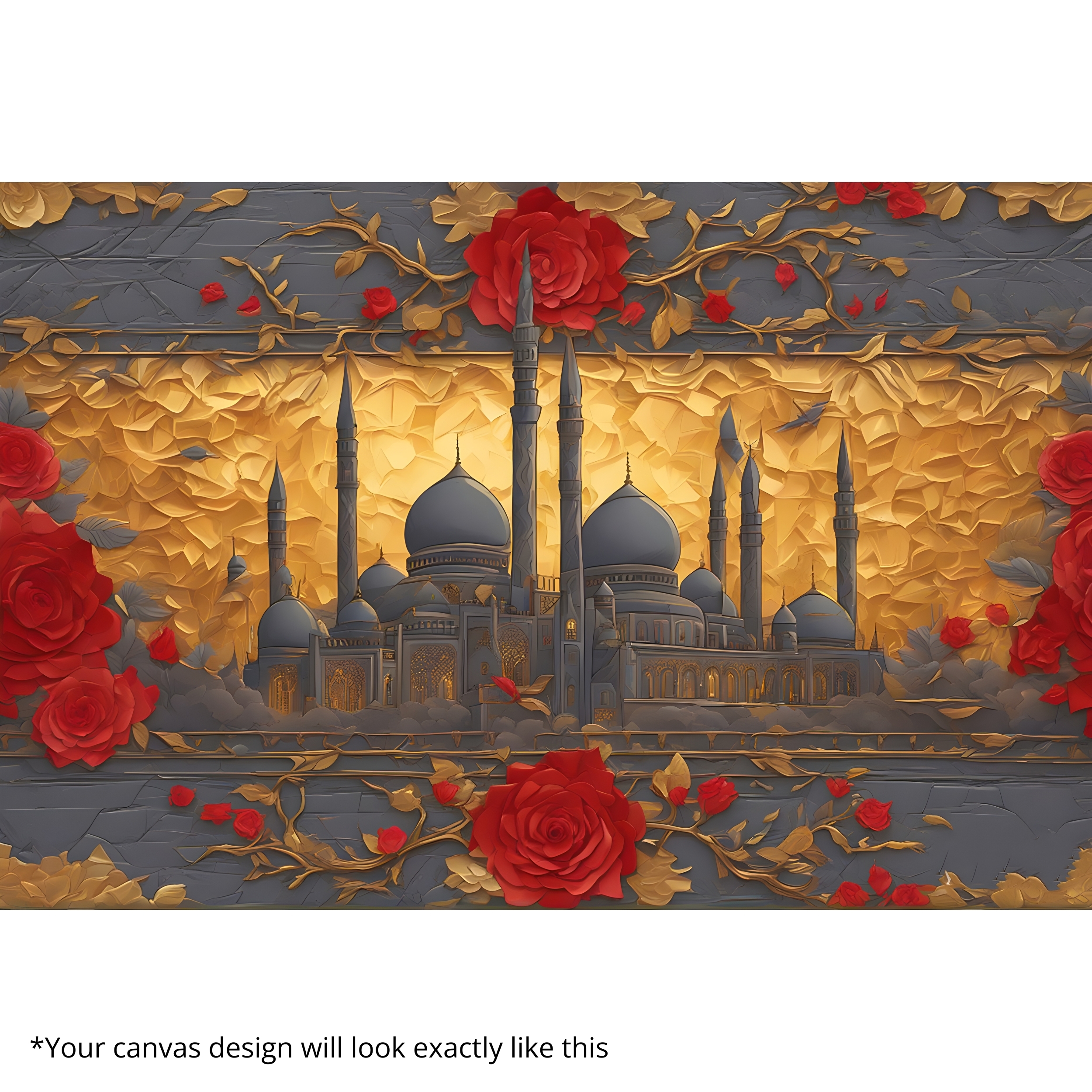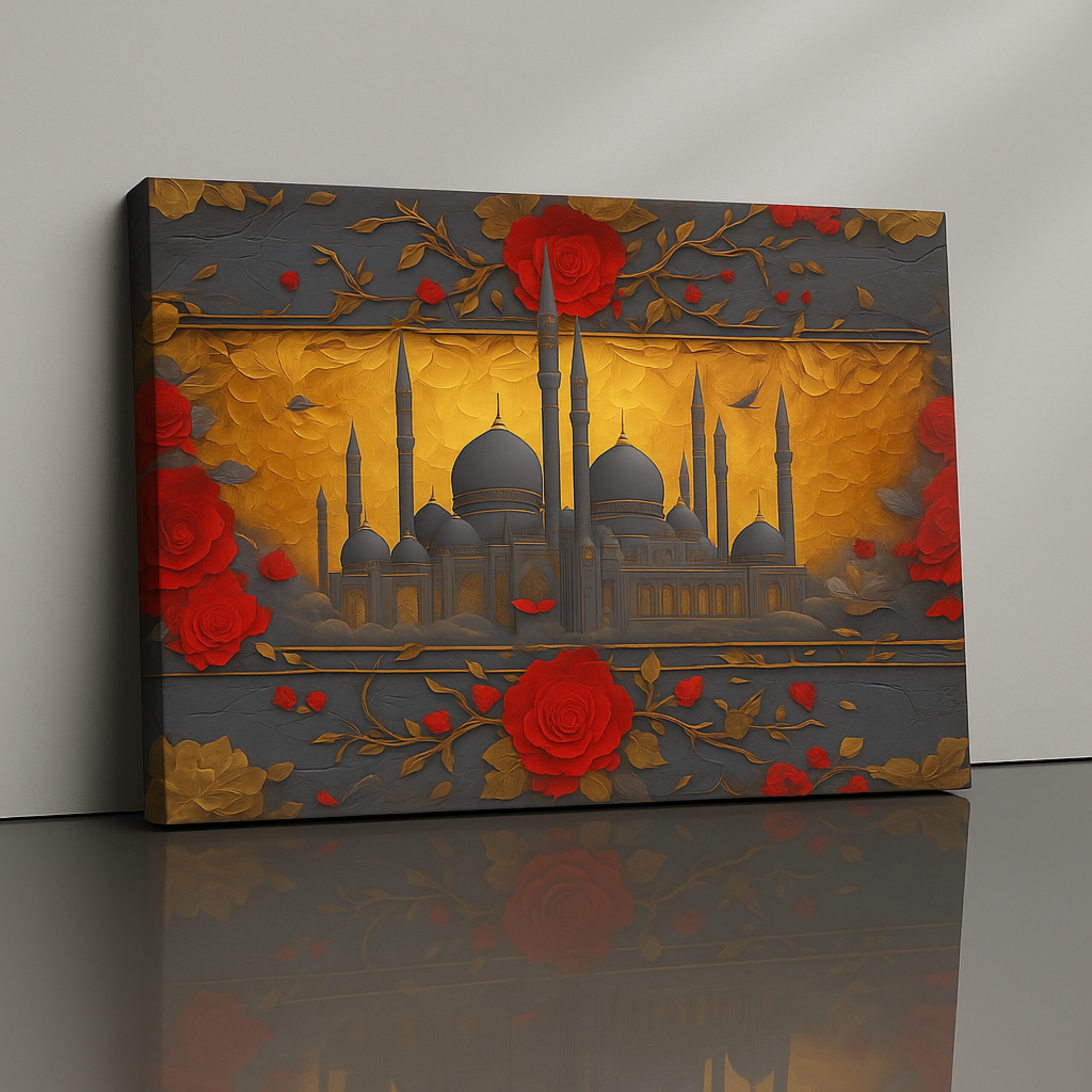 The Mosque Resonance Canvas Print illuminates a majestic mosque framed by gold and red floral patterns. This canvas artmerges faith and art through vivid contrast and ornamental detail. Printed on premium stretched canvas with eco-friendly inks, each element retains luxurious depth and texture. Smooth edges and ready-to-hang finish make installation effortless. This canvas print brings cultural richness and warmth to any space.
