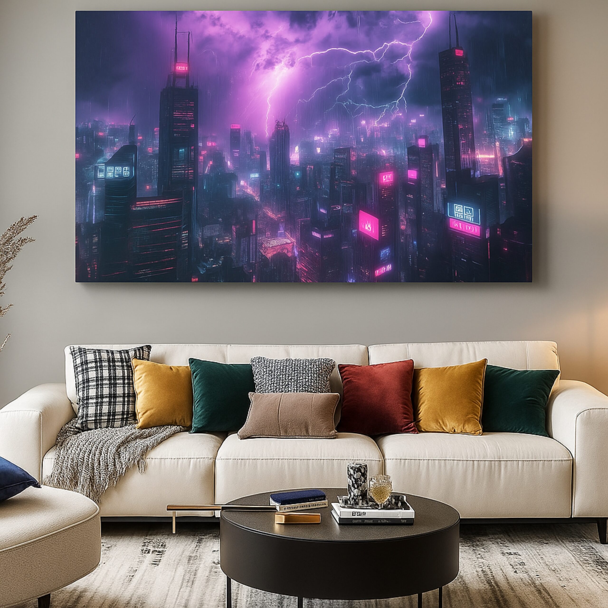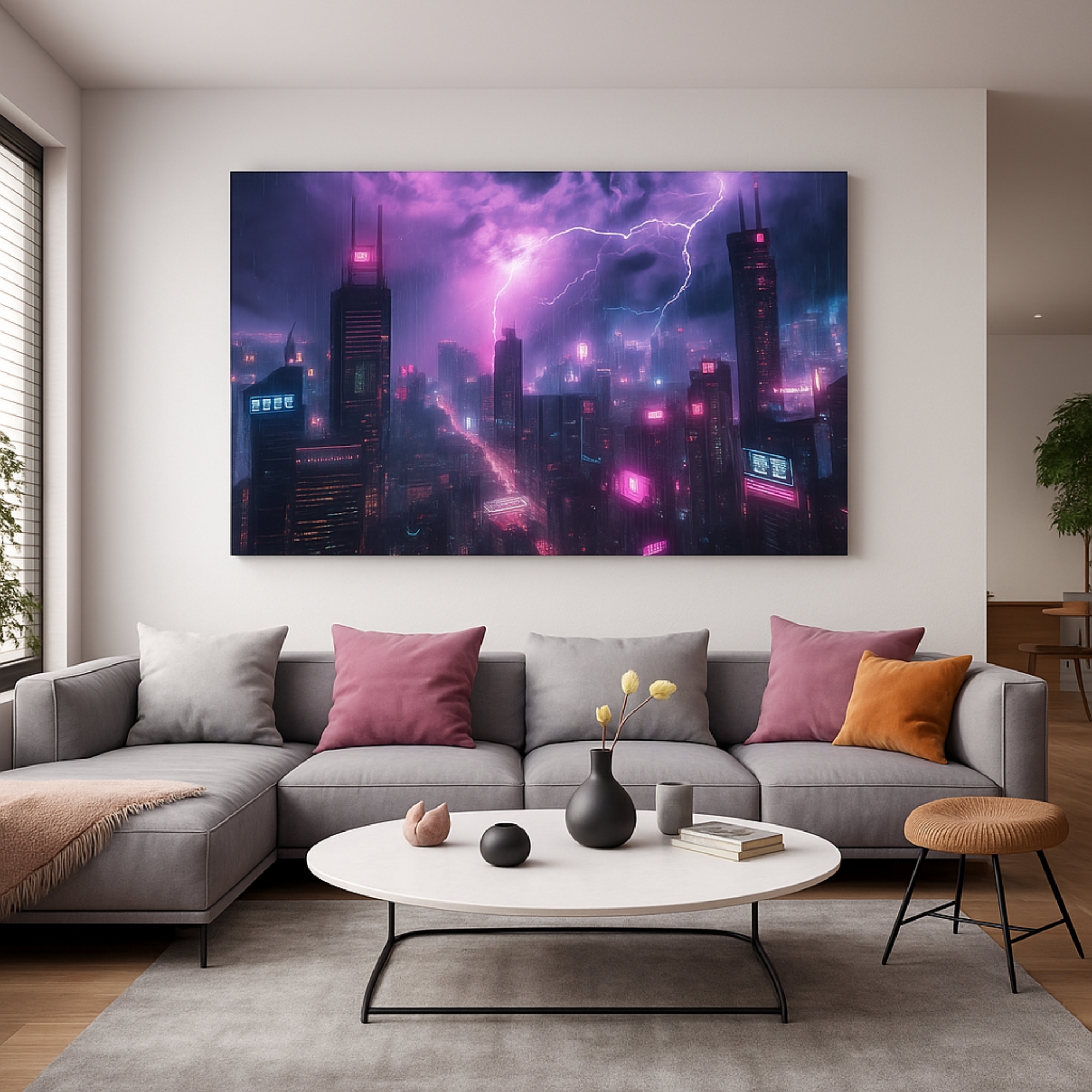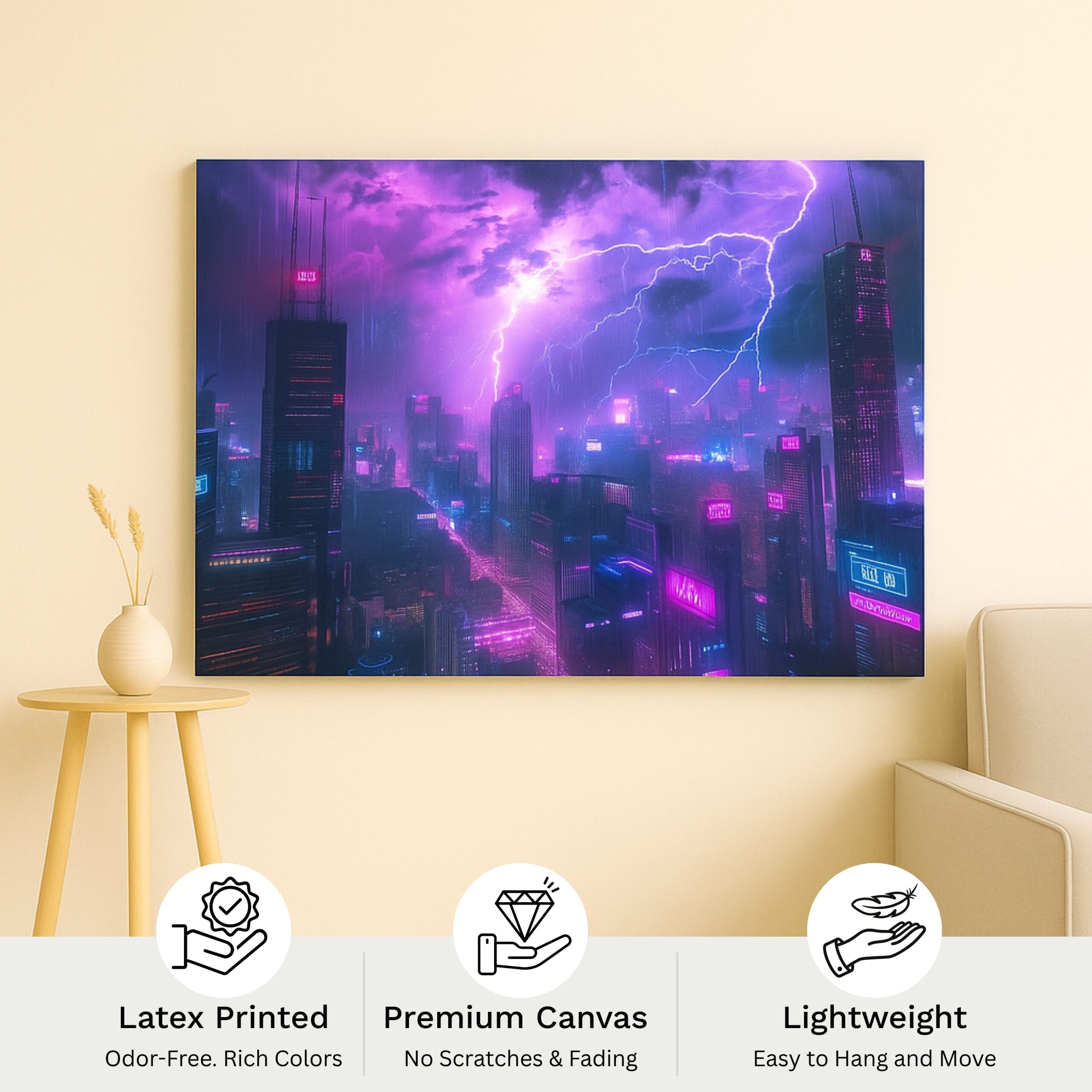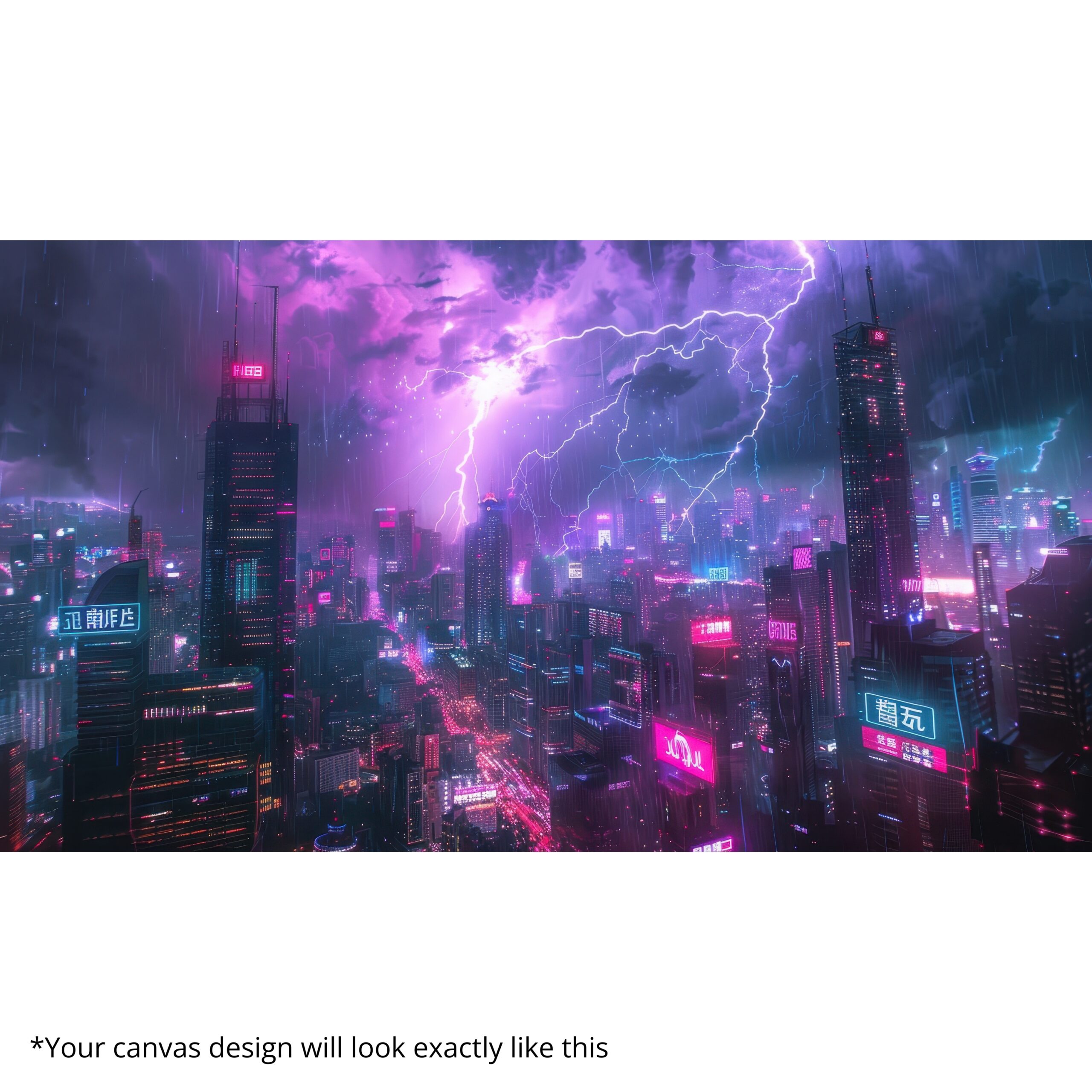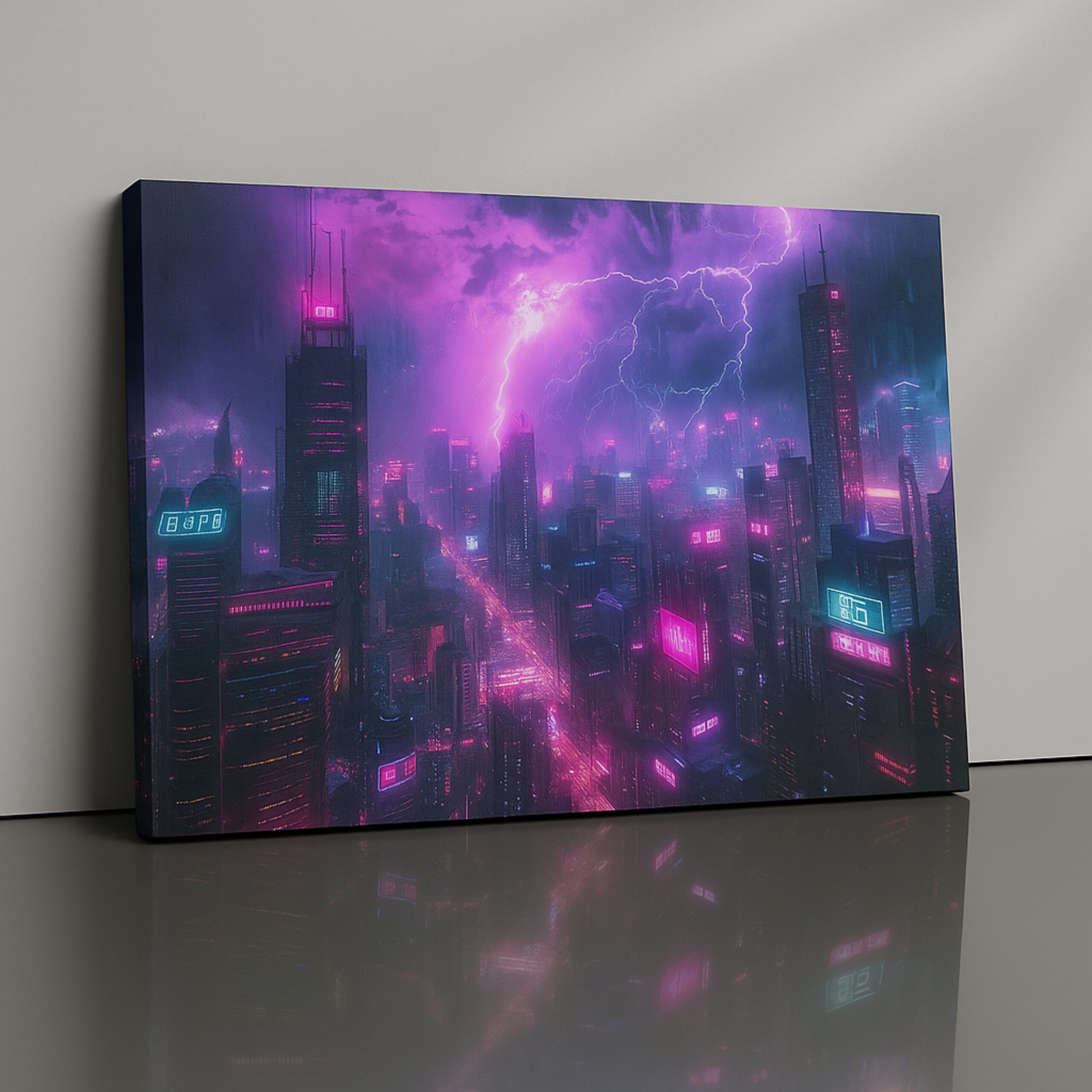 The Neon Tempest Canvas Print electrifies interiors with a futuristic skyline drenched in vibrant neon pinks and purples under storm-charged skies. Merging cyberpunk aesthetics with raw power, this canvas print reflects ambition, intensity, and limitless imagination. Its glowing skyscrapers and lightning-lit clouds create a cinematic vibe that transforms any room into a bold statement of modern design and energy.