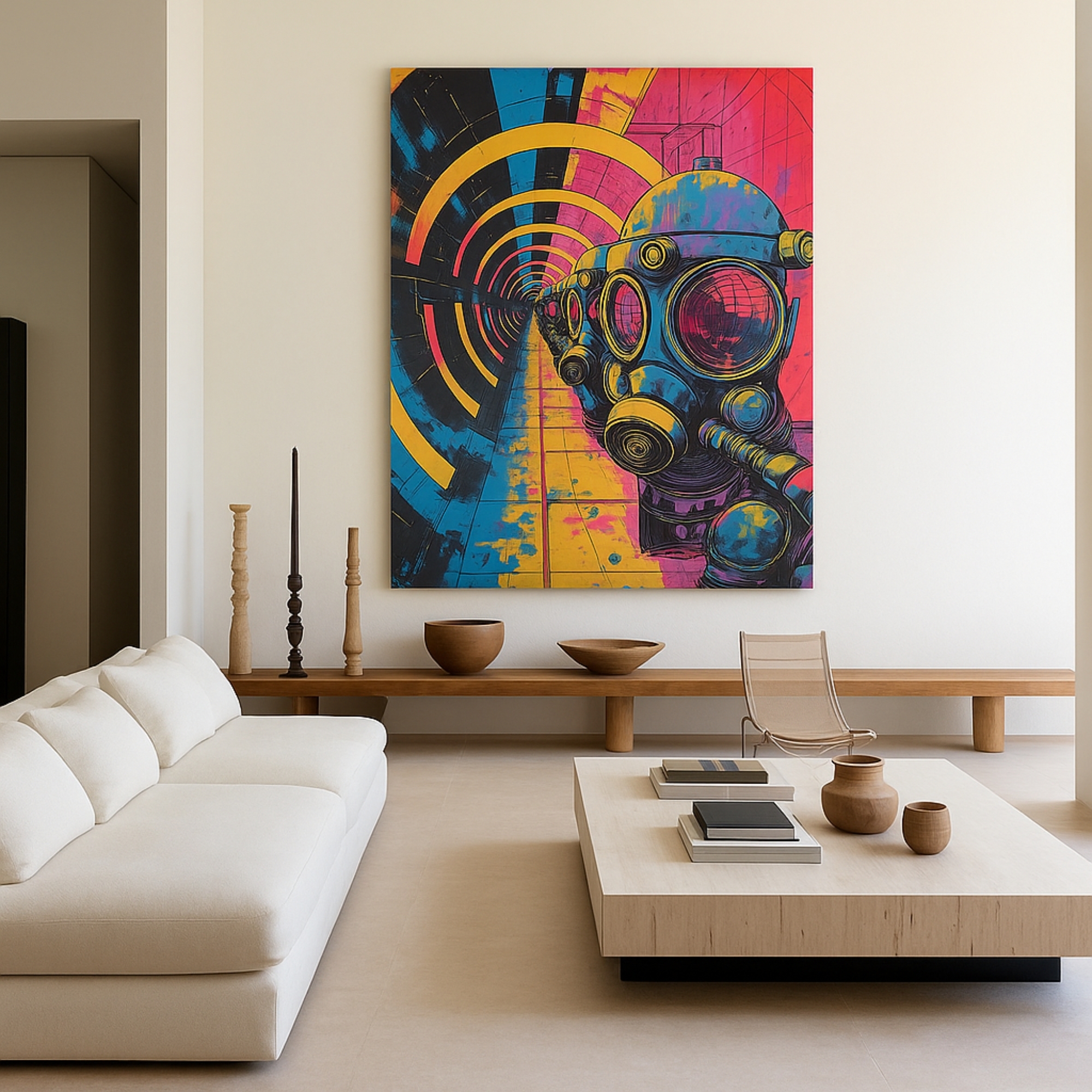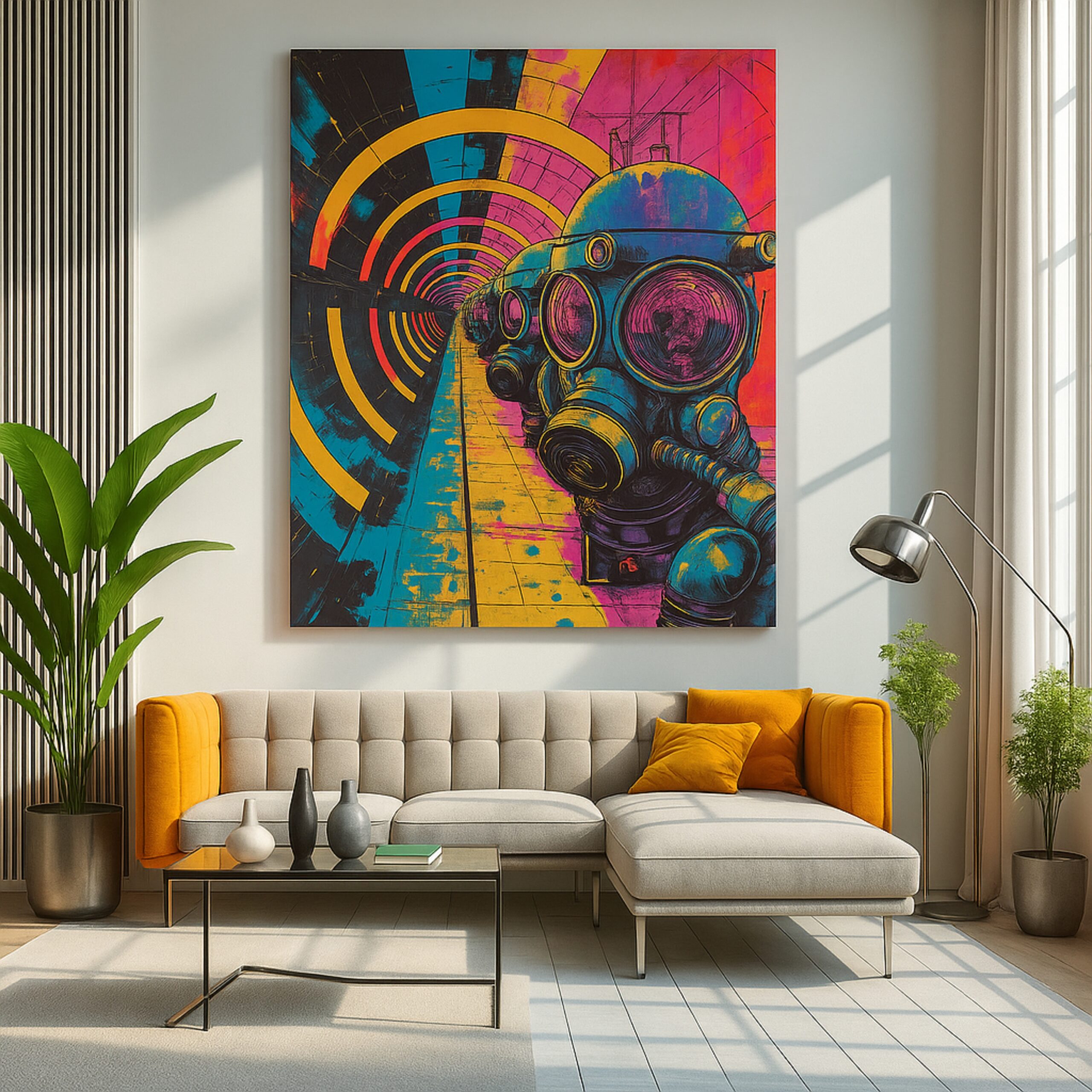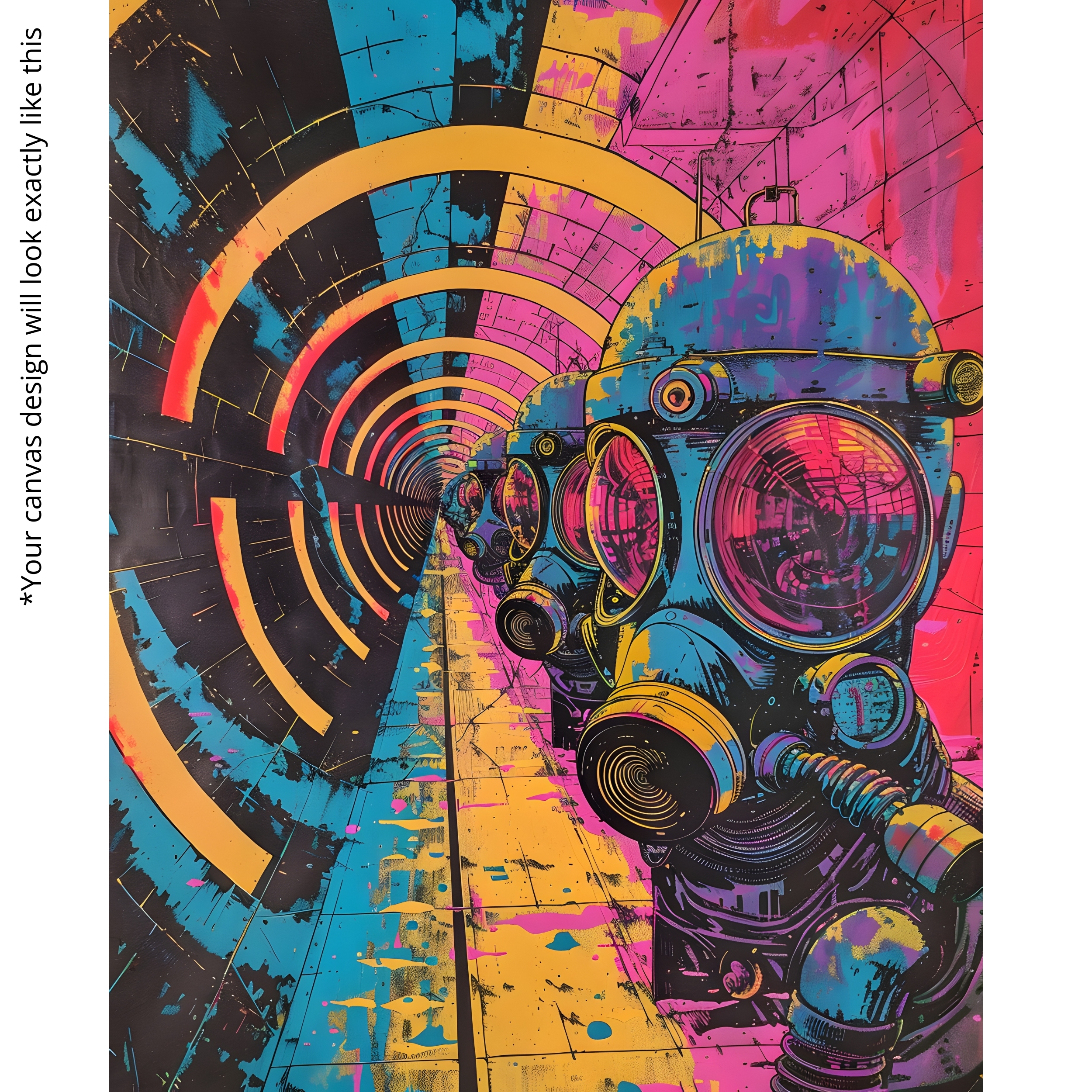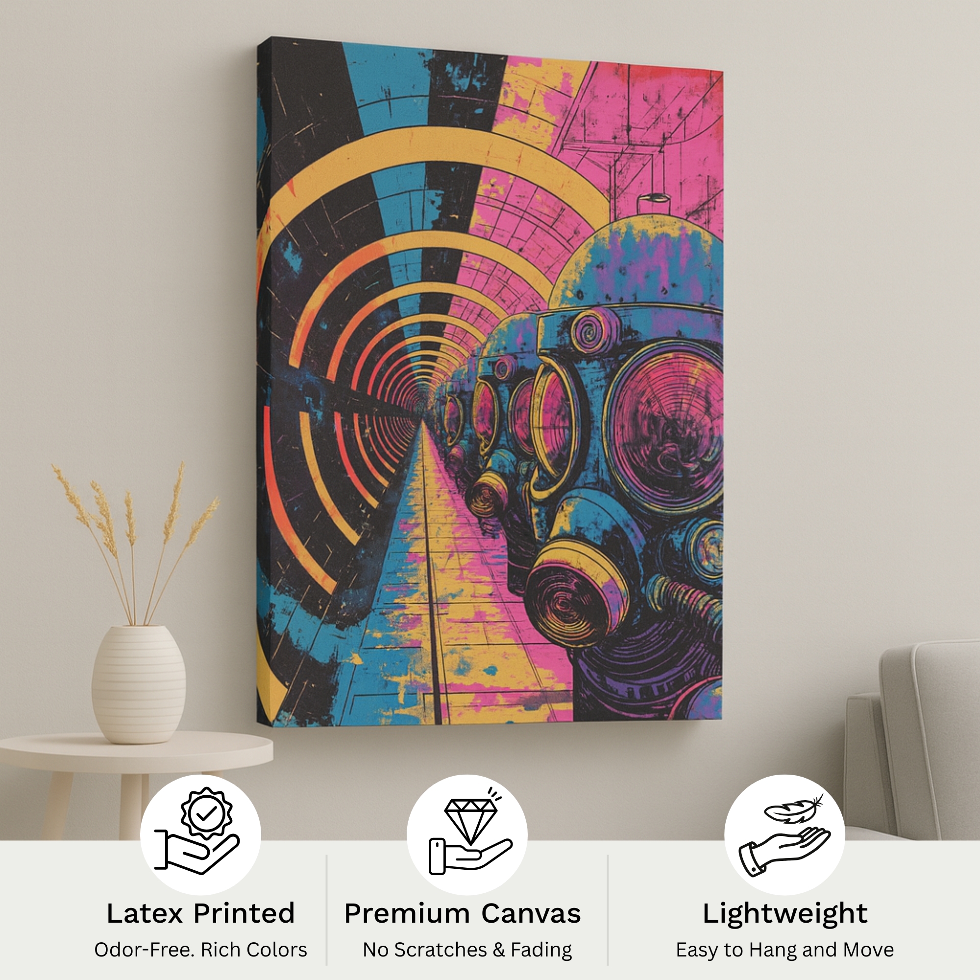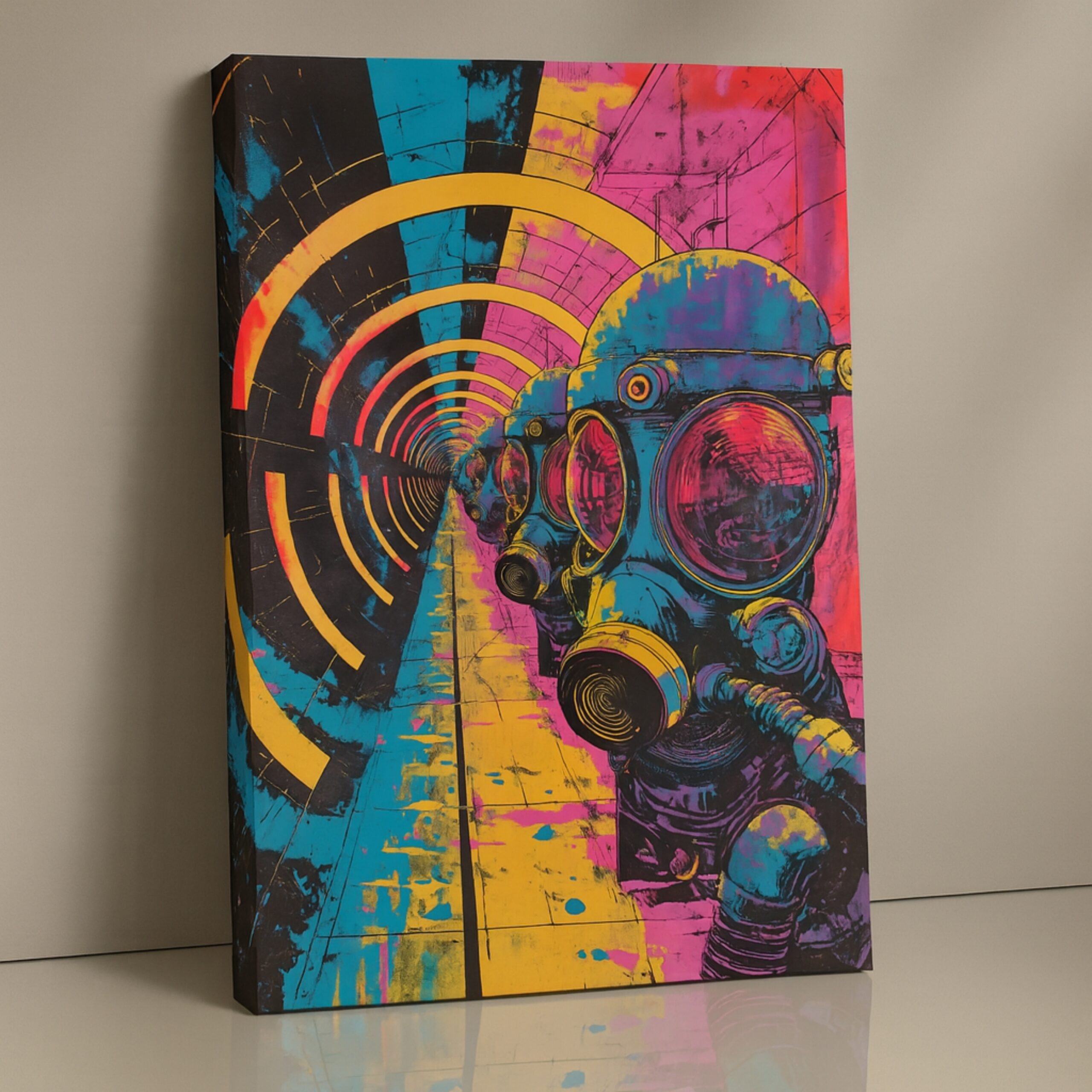 The Neon Tunnel Vision Canvas Print pulls viewers into a bold dystopian world. Gas-mask figures march through a neon-lit tunnel, symbolizing resilience and modern mystery. Bright tones of cyan, pink, and yellow create intensity and futuristic flair.