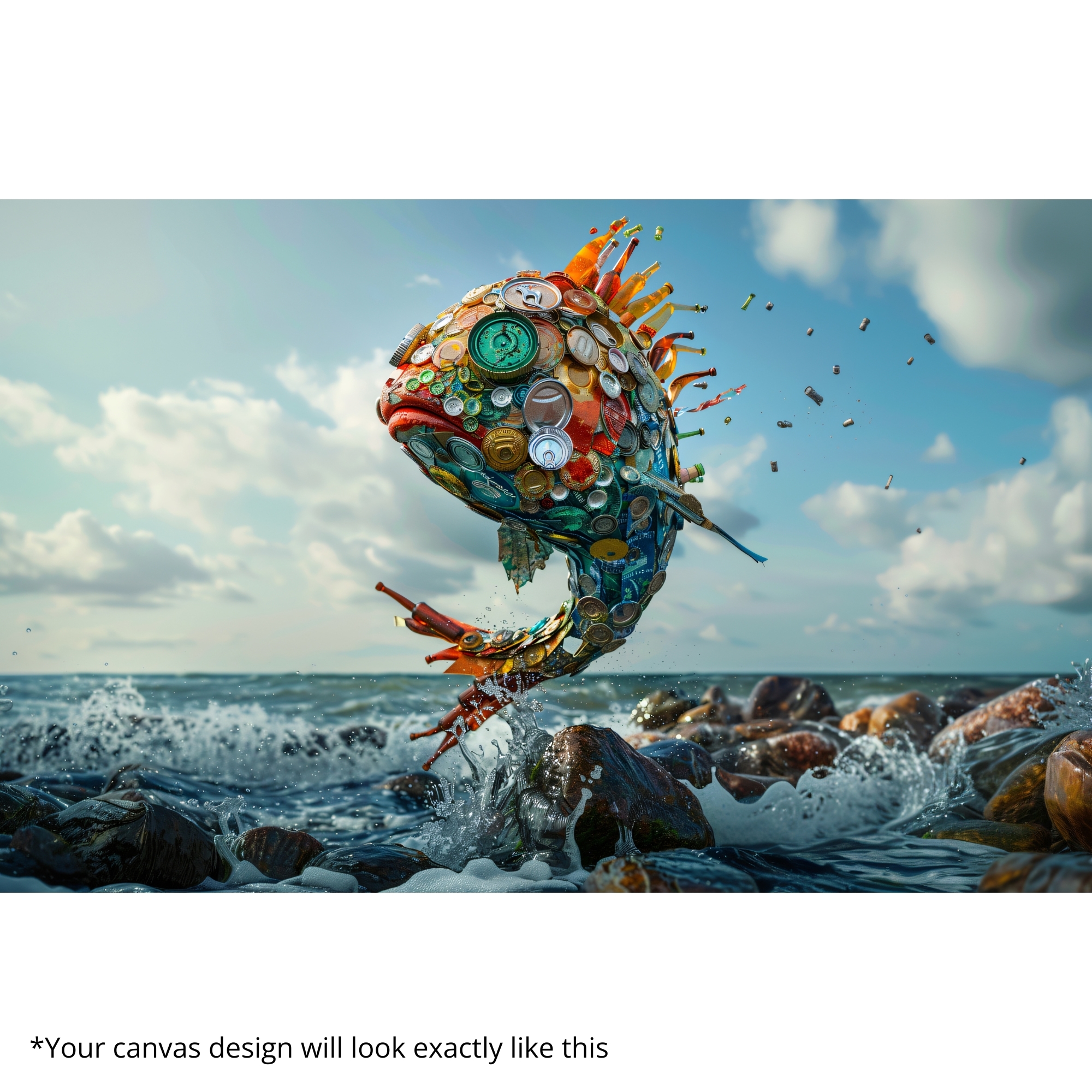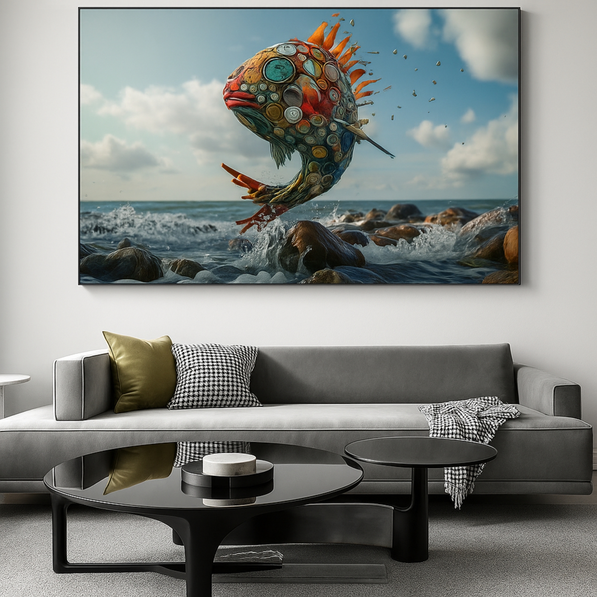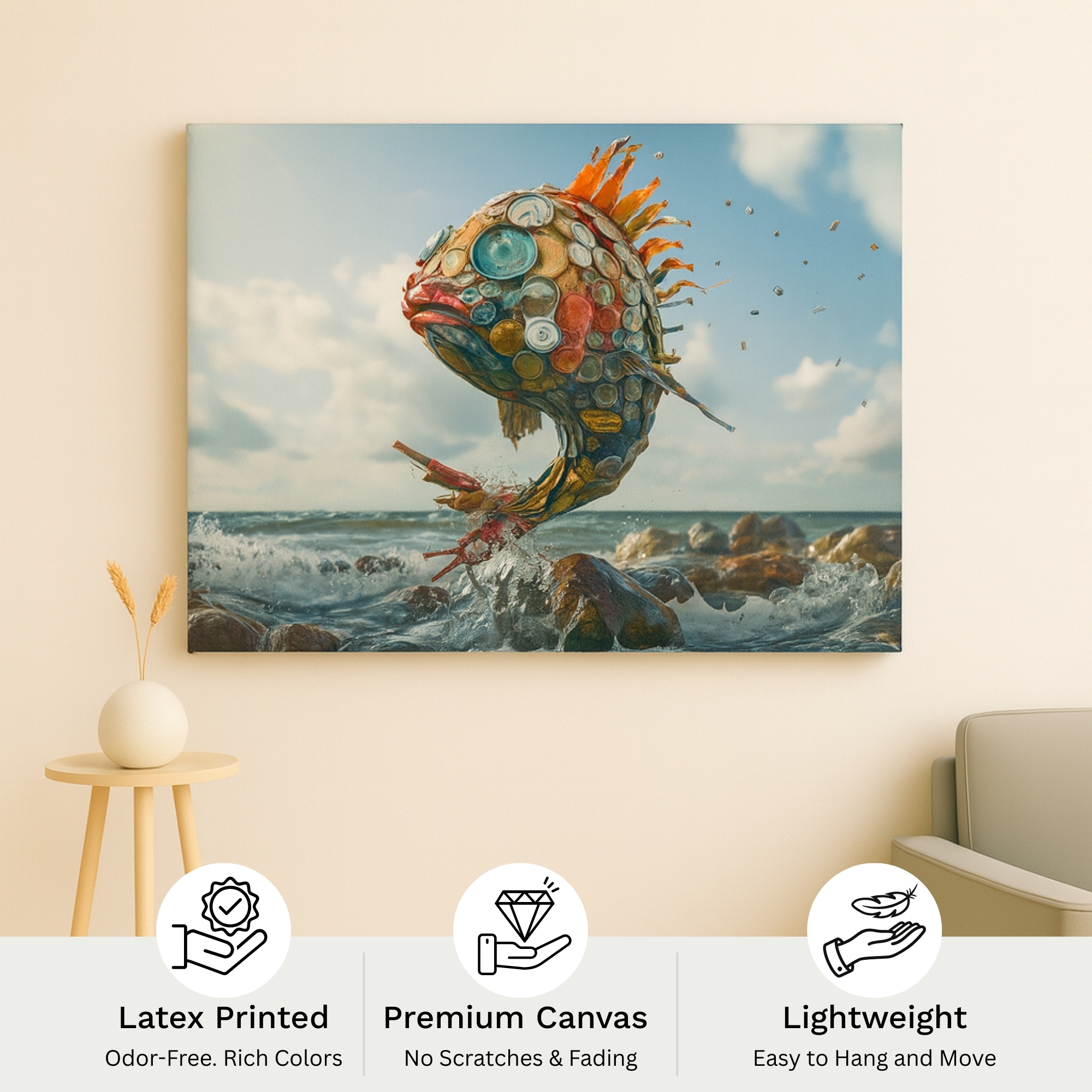 This Canvas Print features a powerful surreal sea creature emerging from dynamic ocean waves, crafted with recycled textures and vibrant color accents. The Canvas Print symbolizes ocean conservation, inner strength, and harmony with nature, making it an impactful addition to modern homes, studios, and eco-inspired interiors. Expressive movement and layered elements create striking depth without overwhelming the space.