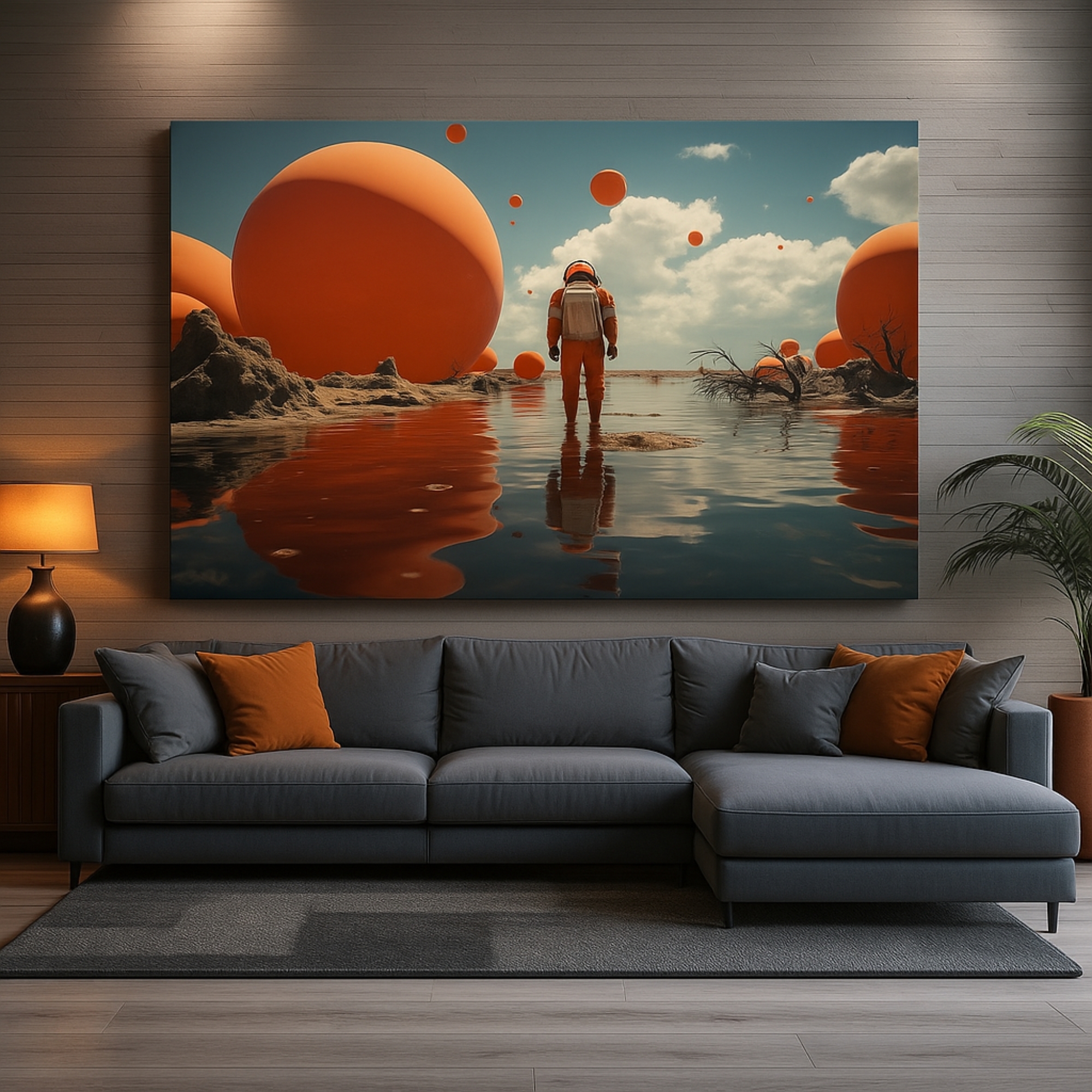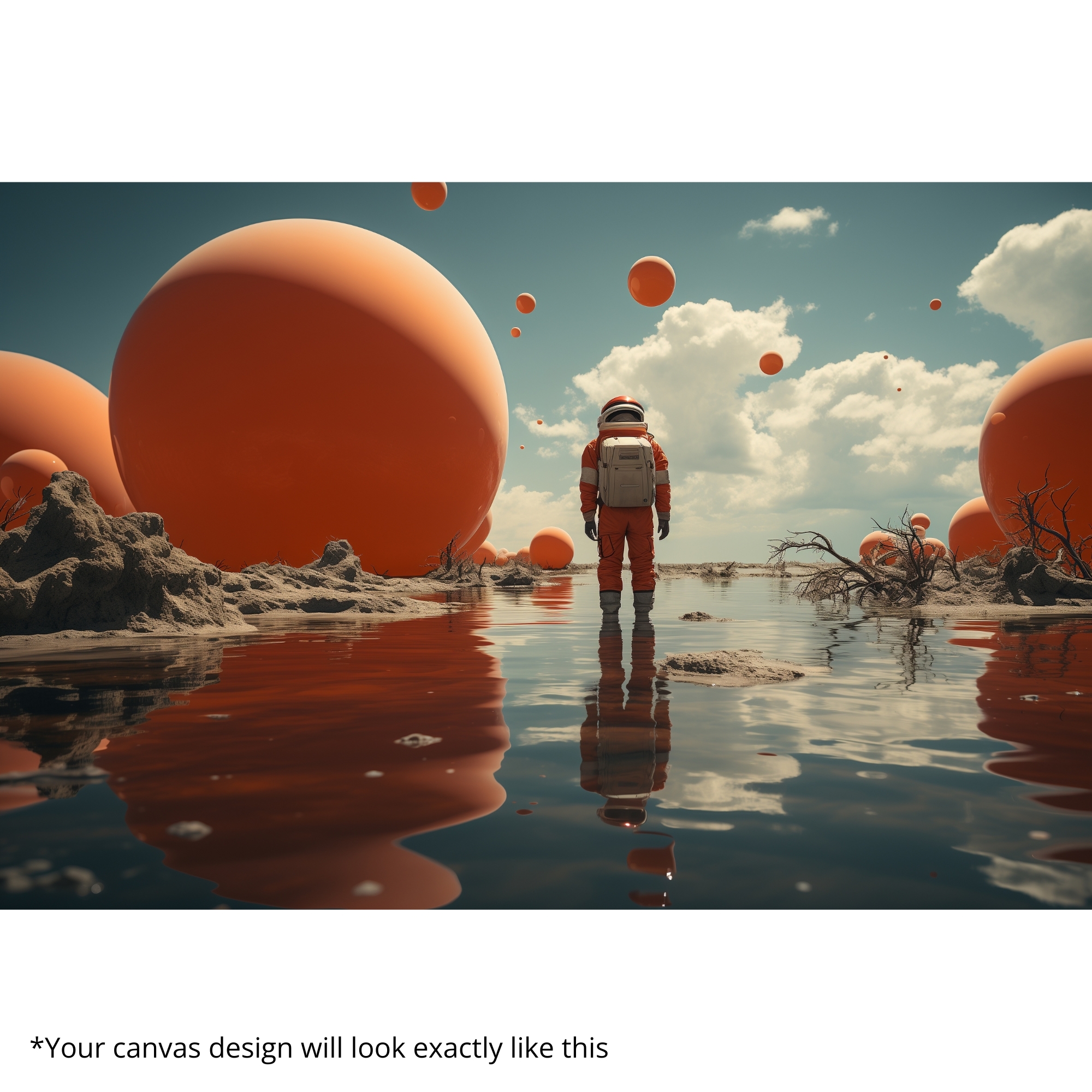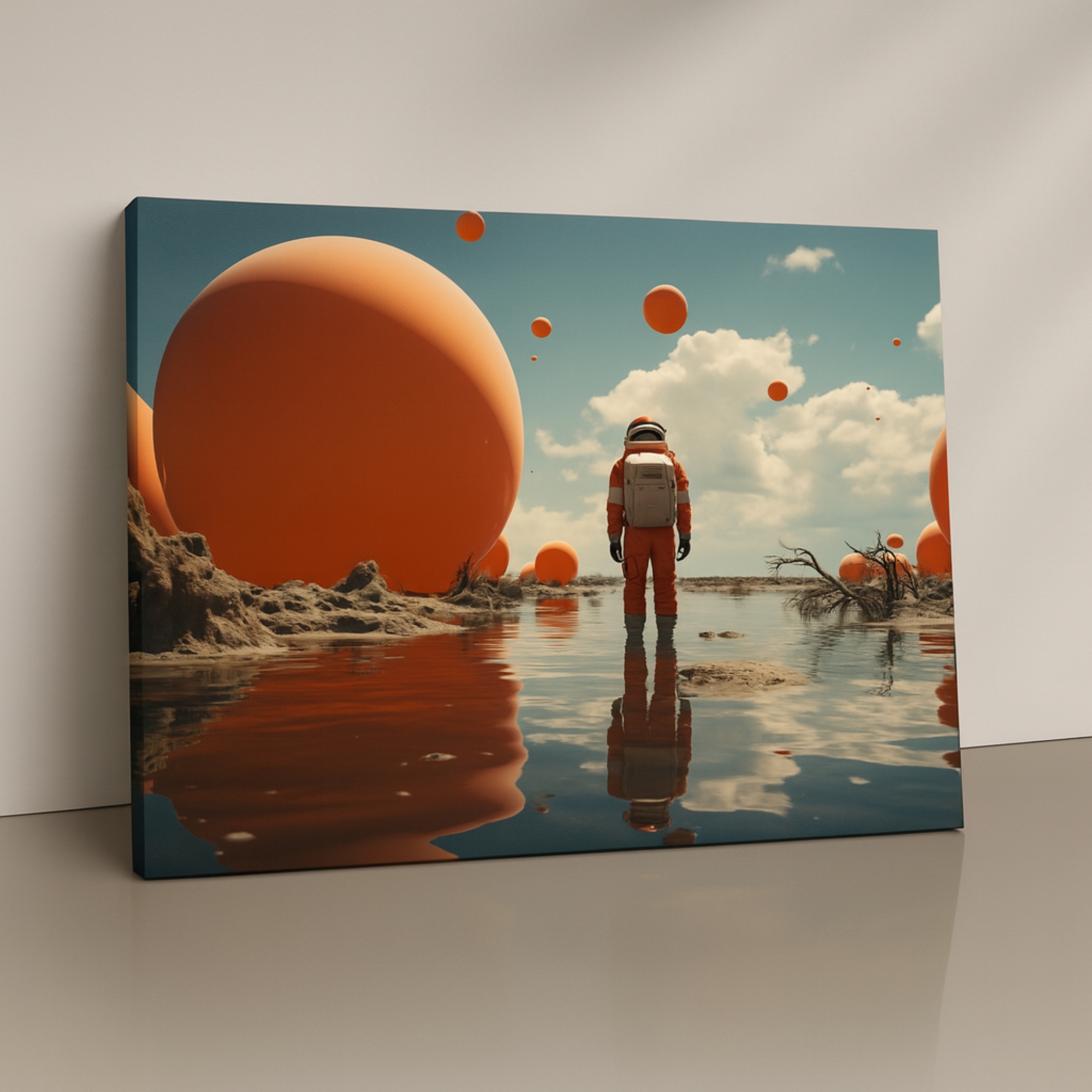 This Canvas Print showcases a lone astronaut standing in a surreal red desert, surrounded by vast planets drifting across a cosmic sky. The Canvas Print inspires curiosity, courage, and quiet introspection, making it a striking choice for modern living rooms, offices, and creative studios. Bold contrasts between warm desert tones and cool planetary hues create cinematic depth and visual balance without overwhelming the space.