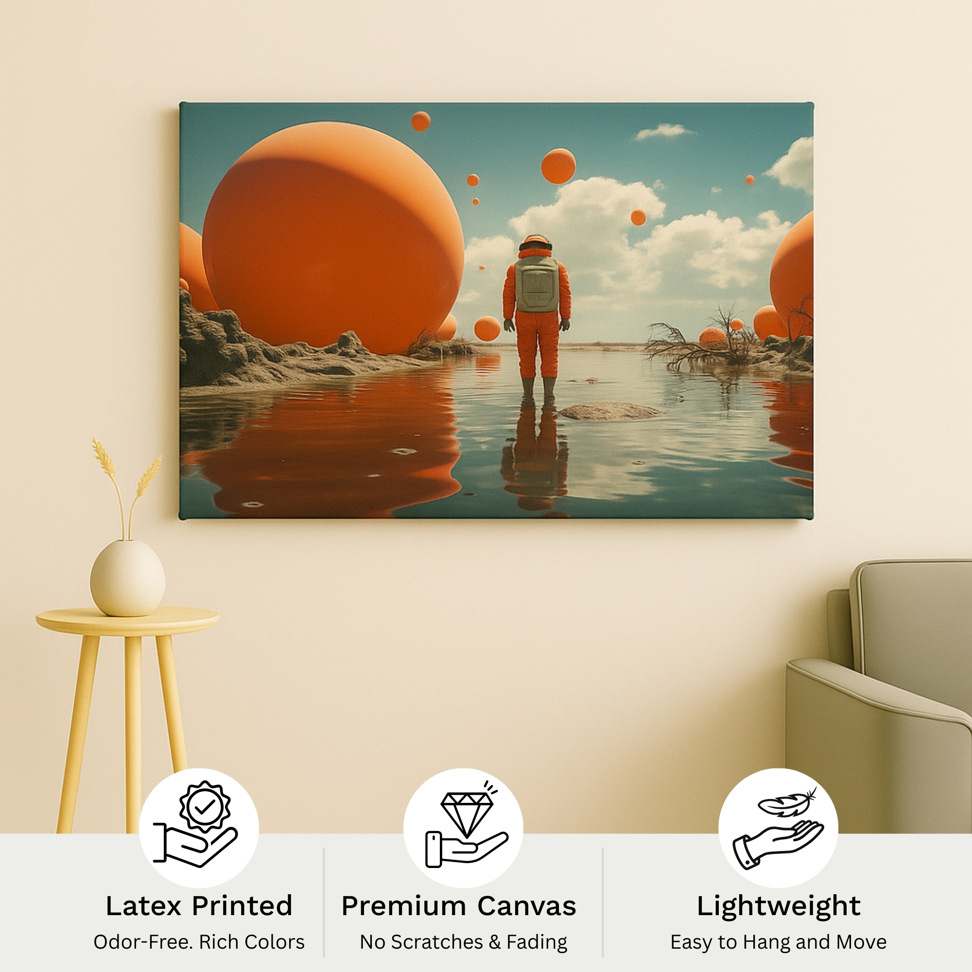 Style this astronaut artwork with minimalist decor, neutral furnishings, and ambient lighting to enhance its futuristic yet contemplative appeal. It also makes a thoughtful gift for science-fiction lovers, dreamers, and space enthusiasts. Each Artfy Canvas print is crafted to deliver lasting color brilliance, fine detail, and a refined gallery-grade finish.