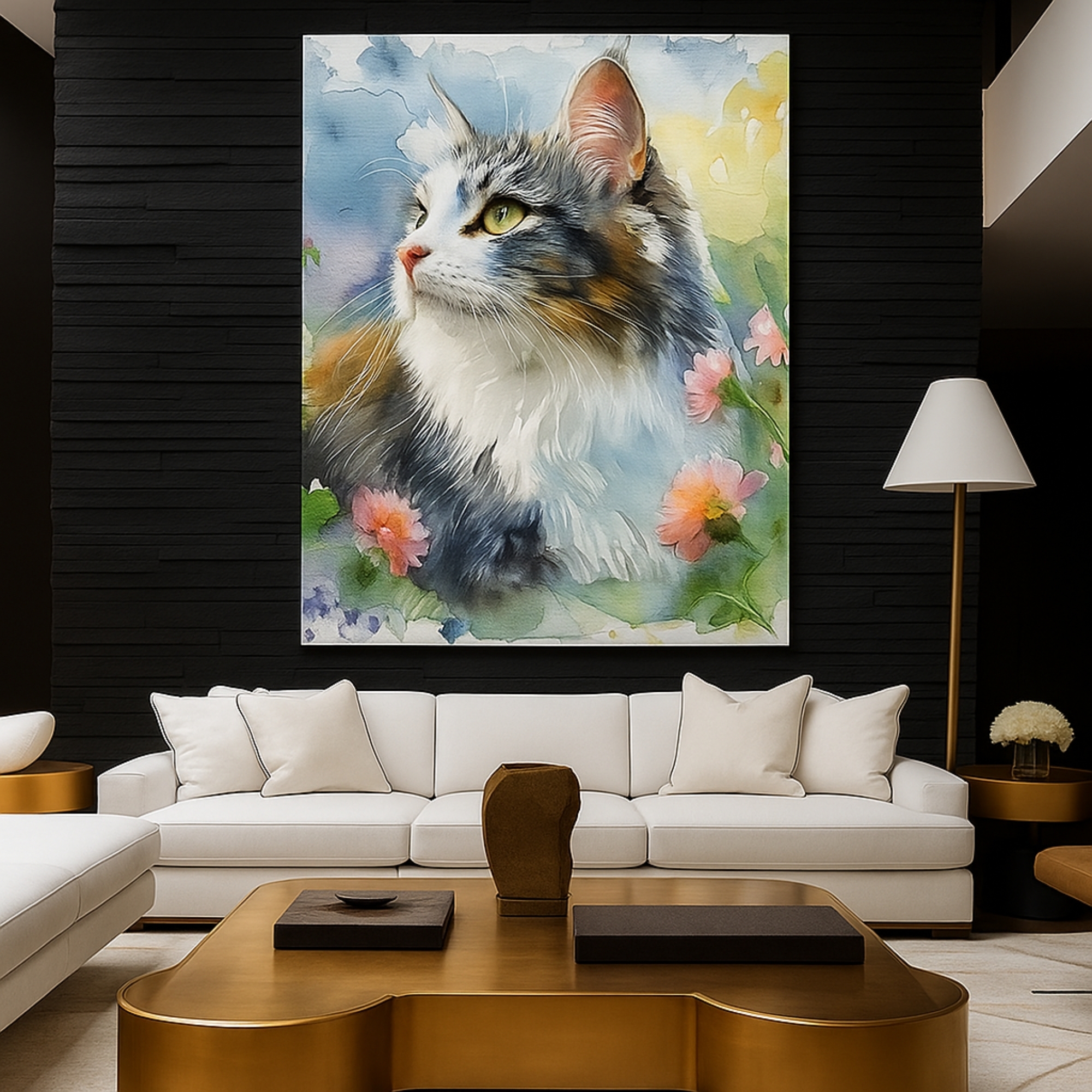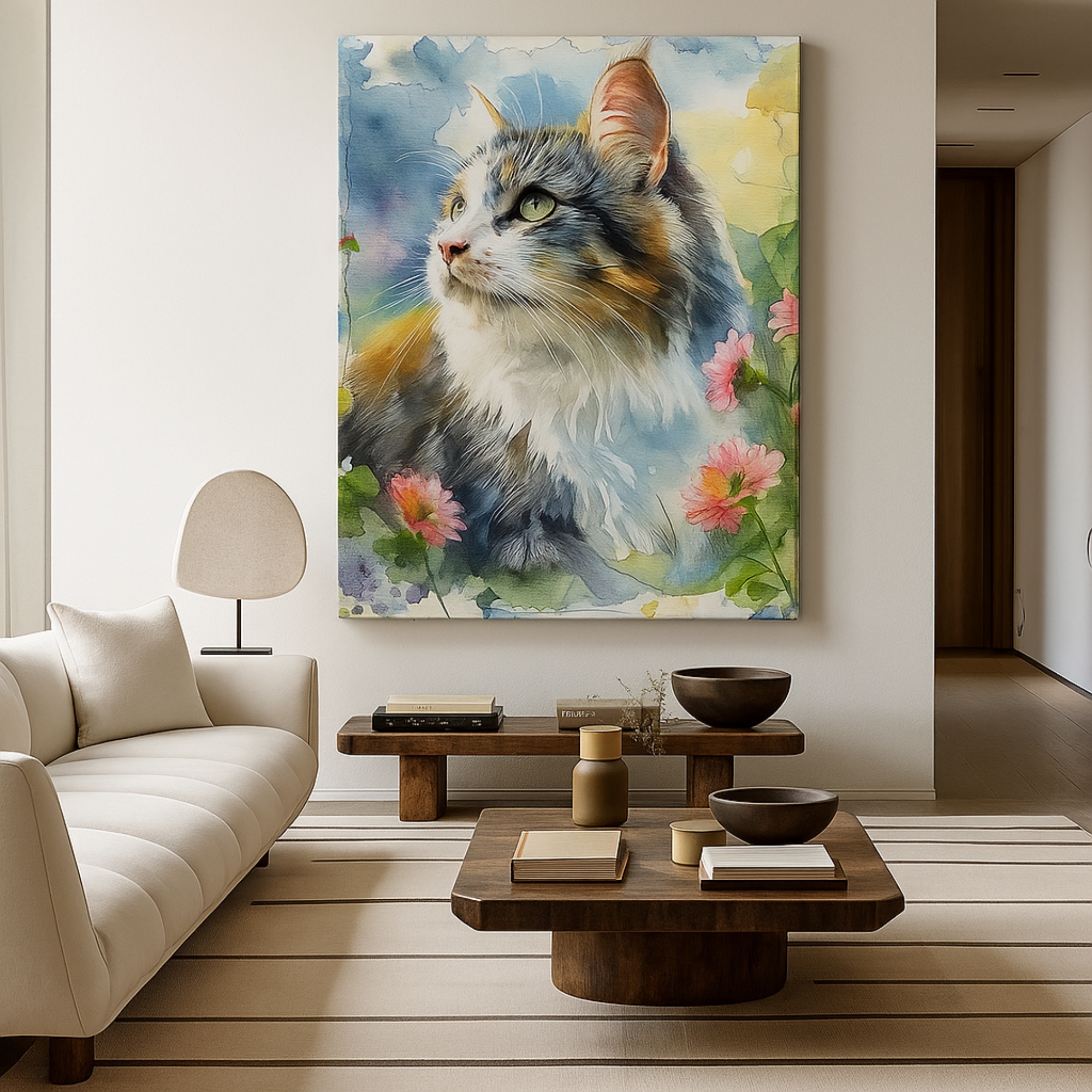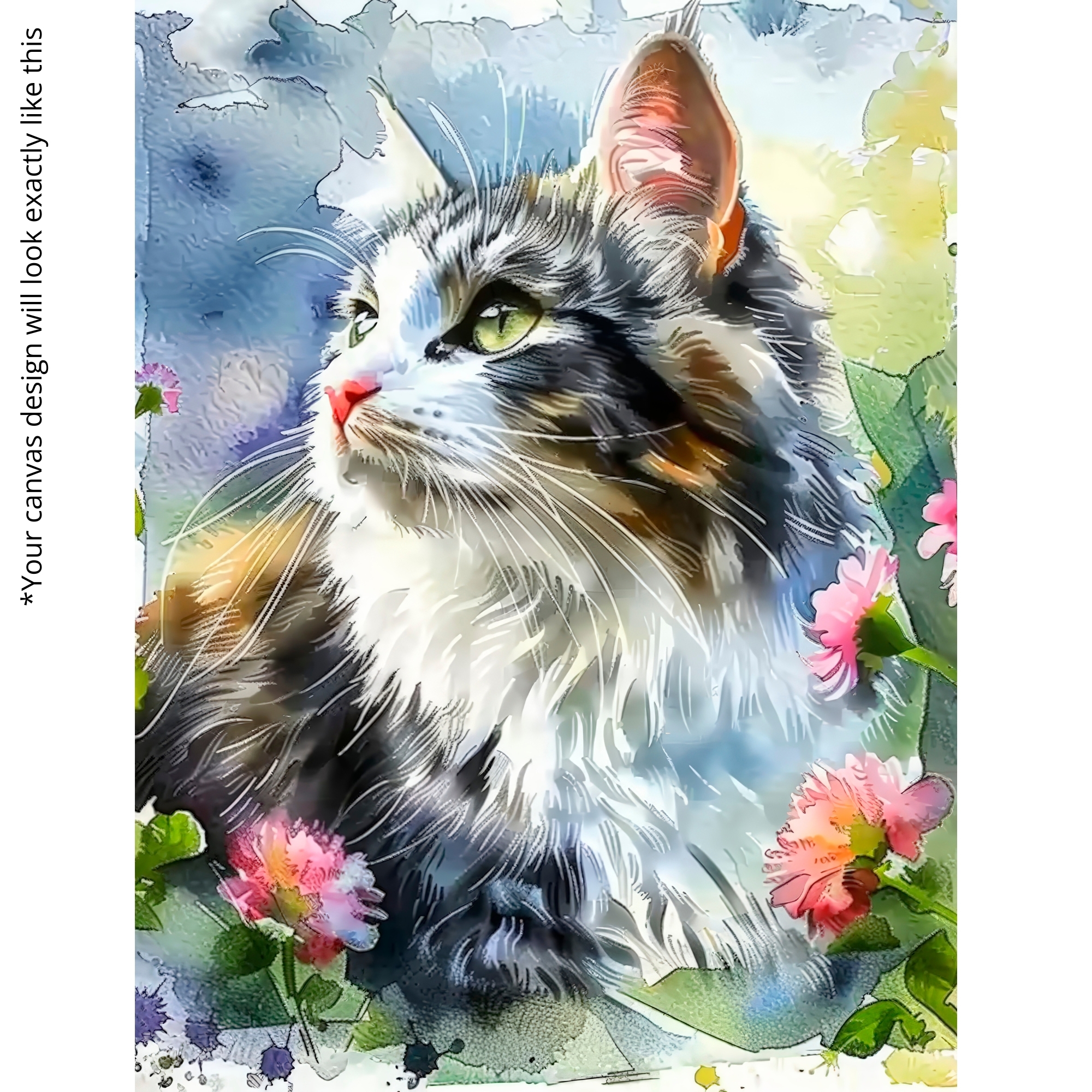 Pastel Whiskers Canvas Print showcases a dreamy watercolor cat portrait with soft hues, delicate brush textures, and a peaceful spring ambience. Perfect for pet lovers, cozy homes, creative studios, and elegant wall décor.