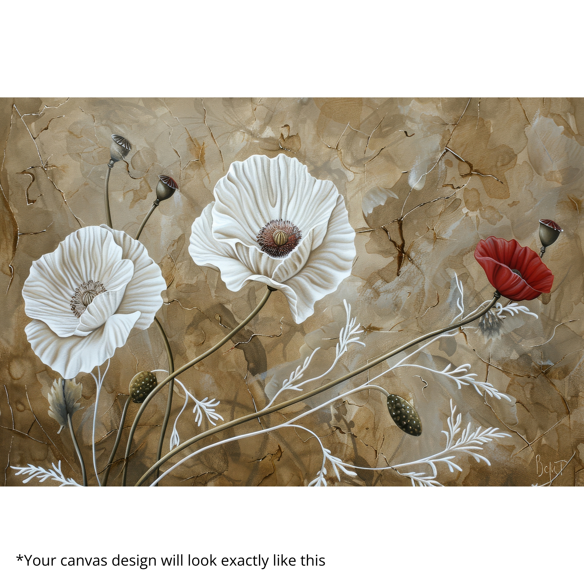 “Poppy Reverie” is a timeless Canvas Print that celebrates delicate poppies in warm earthy tones. Muted textures and painterly strokes enhance the vintage charm, while each detail radiates natural elegance. This artwork transforms walls into a graceful reflection of floral beauty and nostalgic style.