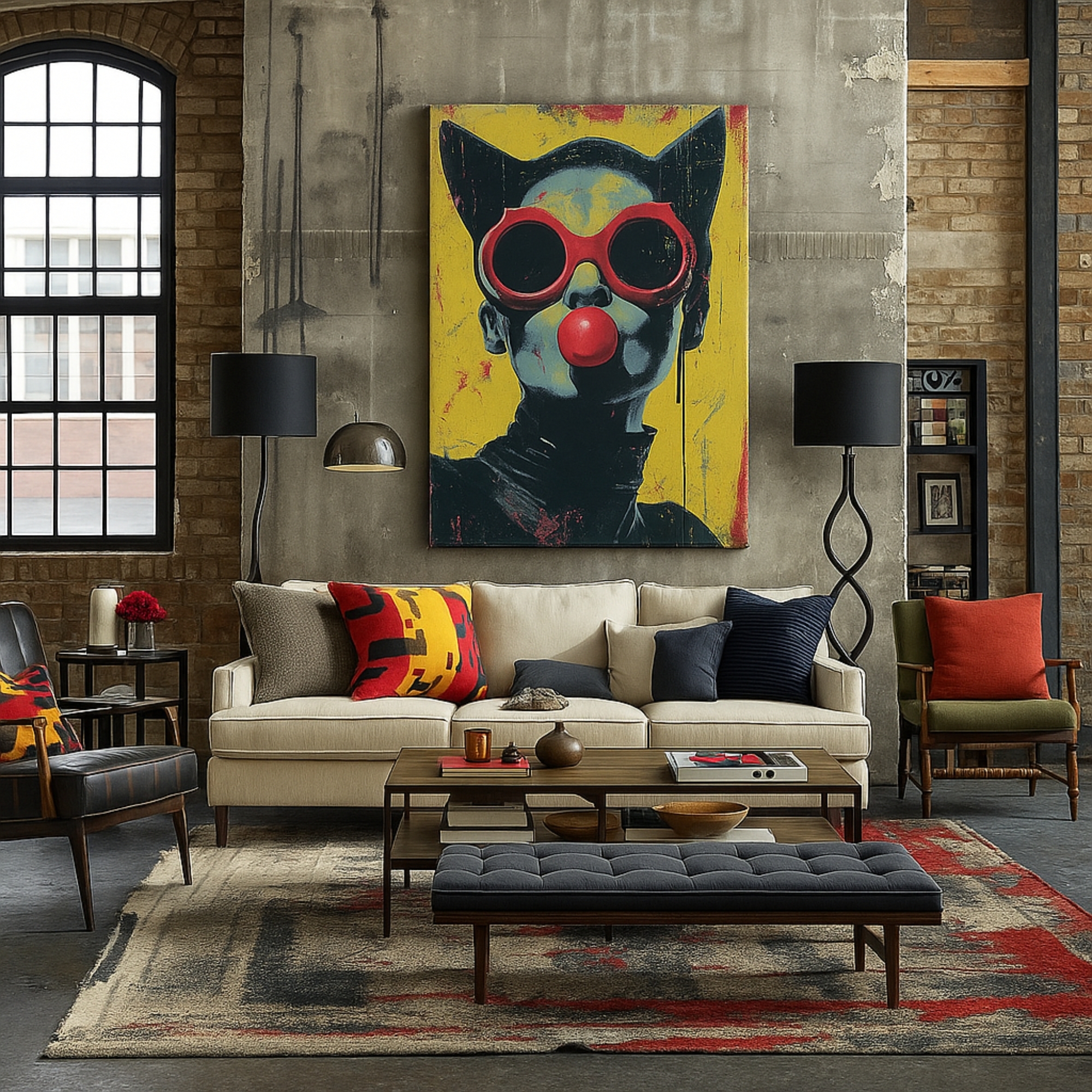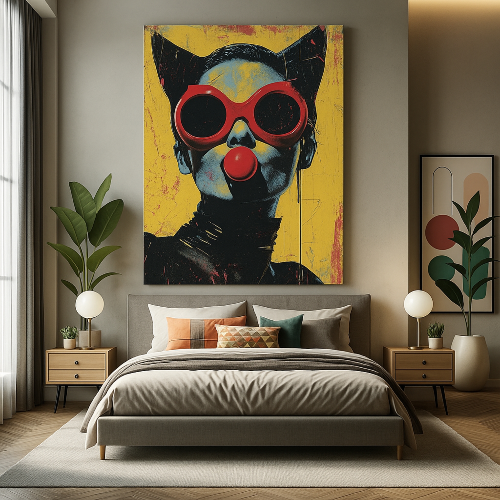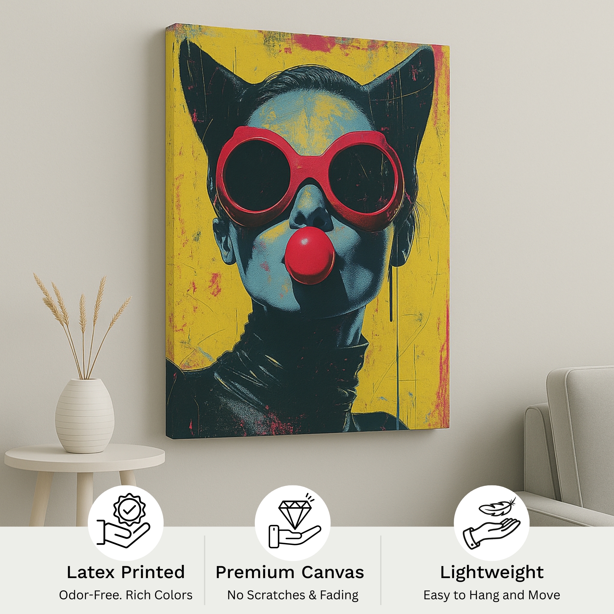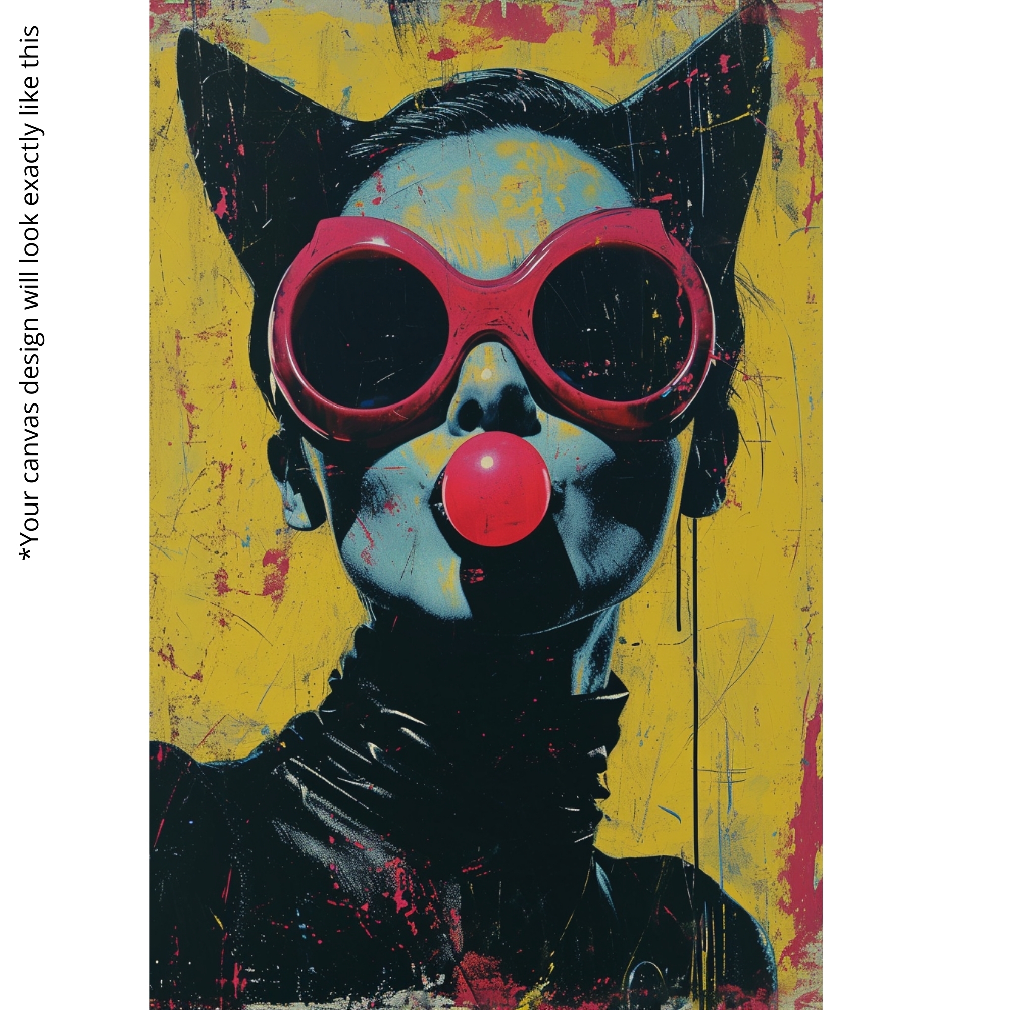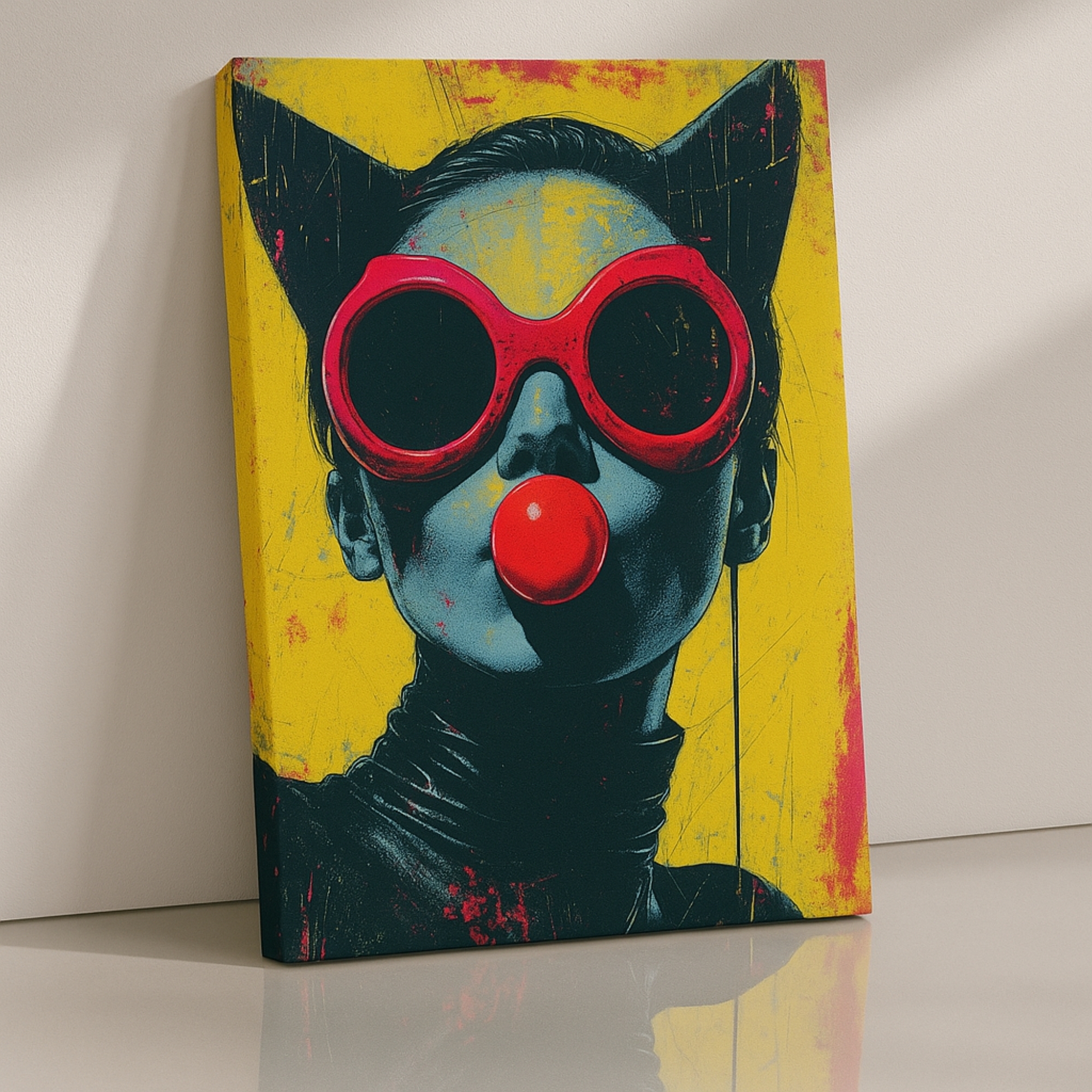 Add attitude with the Canvas Print of Bubble Noir. Featuring a Catwoman-inspired figure in oversized red glasses with bubblegum flair, this comic-styled pop art radiates confidence and playful edge. A fusion of urban fashion and comic-book culture, it’s a striking centerpiece for fashion-forward homes, trendy lofts, or boutiques.