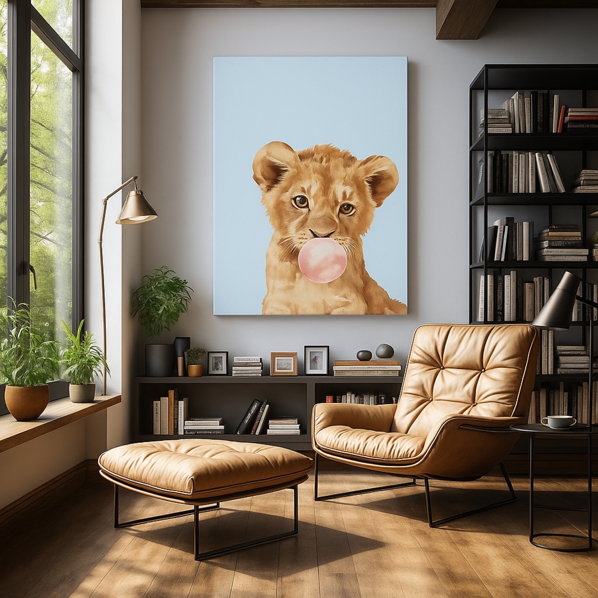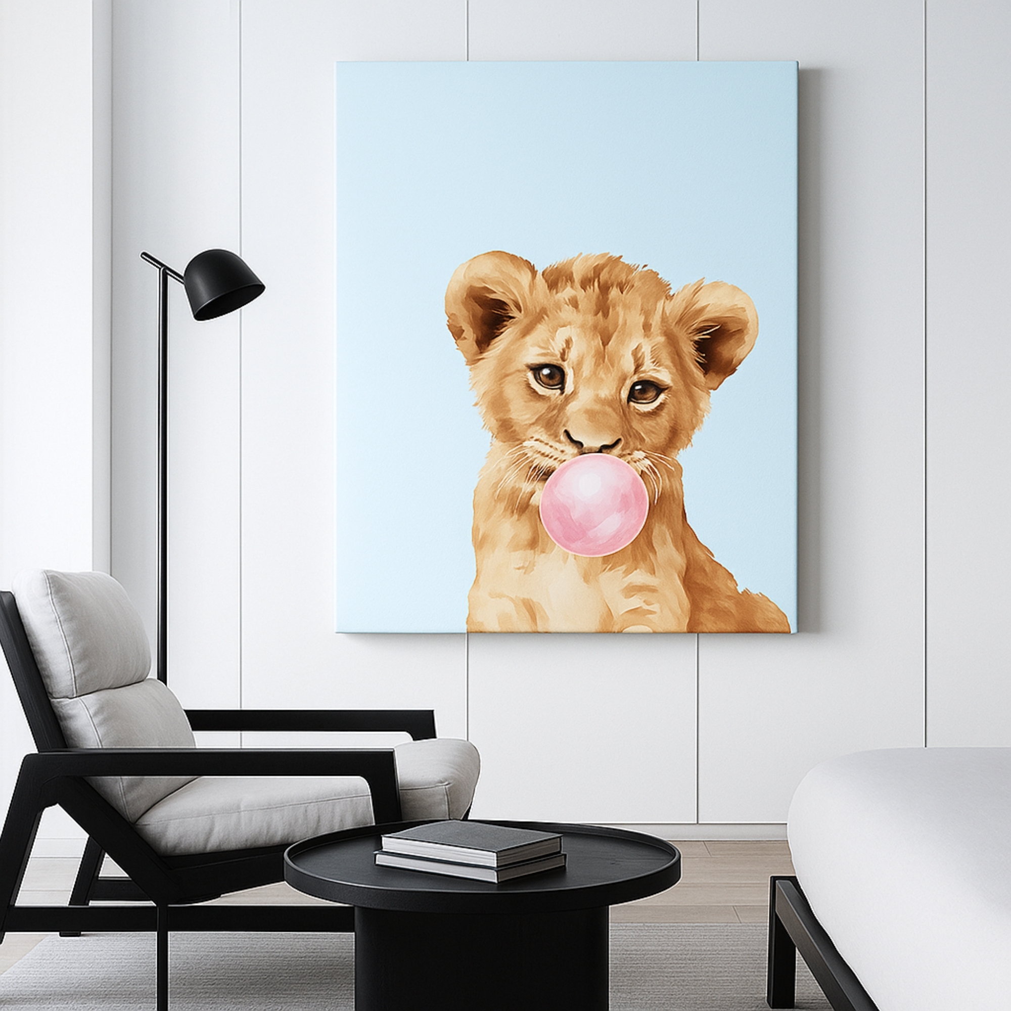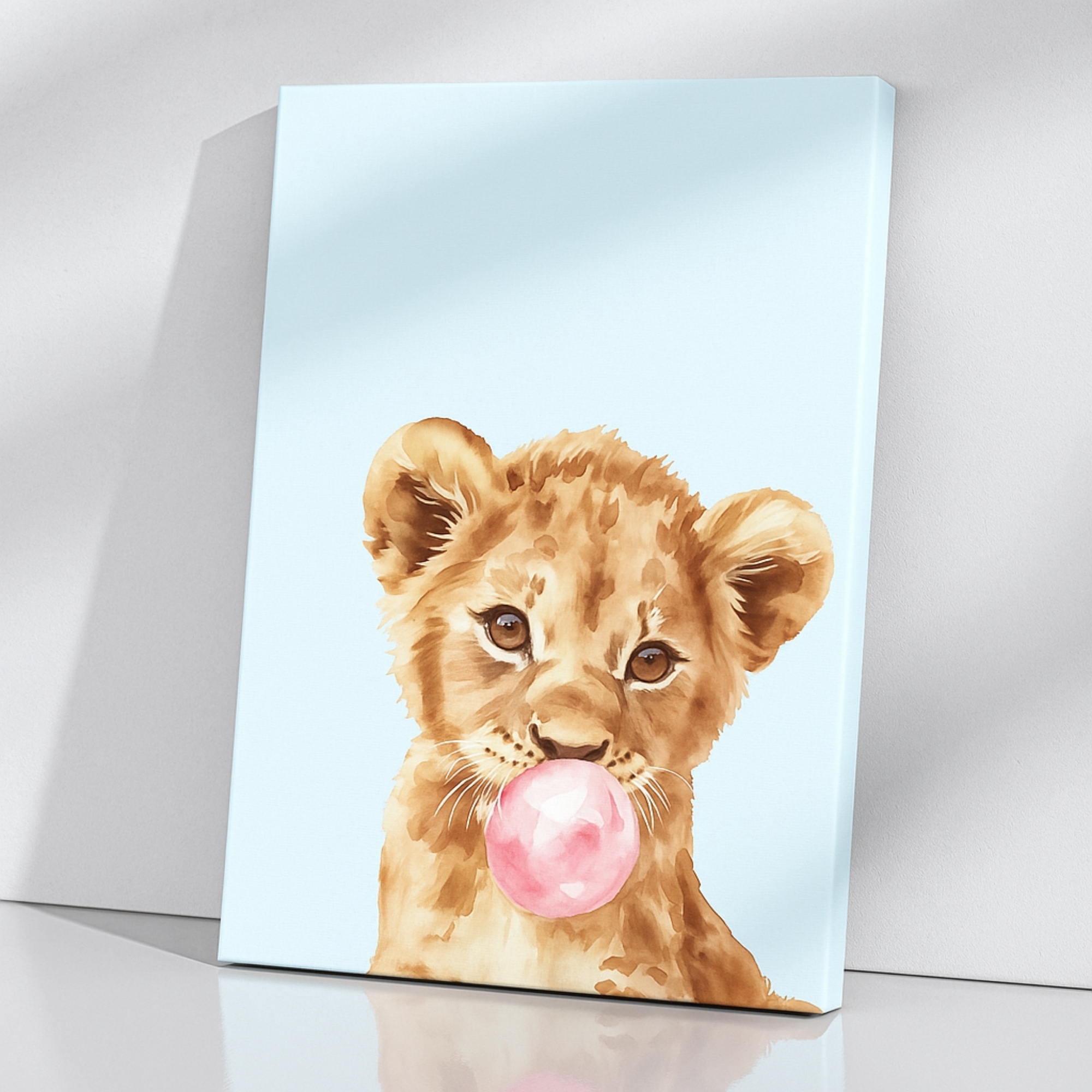 Add fun and warmth with the Canvas Print of Bubblegum Cub. This cheeky pop art features a lion cub blowing pink bubblegum, creating a delightful mix of humor and charm. With pastel tones and a child-friendly palette, it’s perfect for nurseries, kids’ rooms, and playful modern homes. Its lighthearted design makes it an ideal gift for animal lovers and families alike.