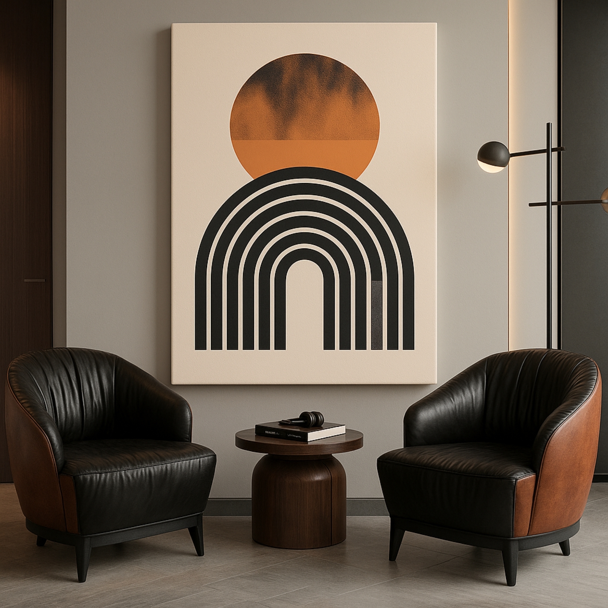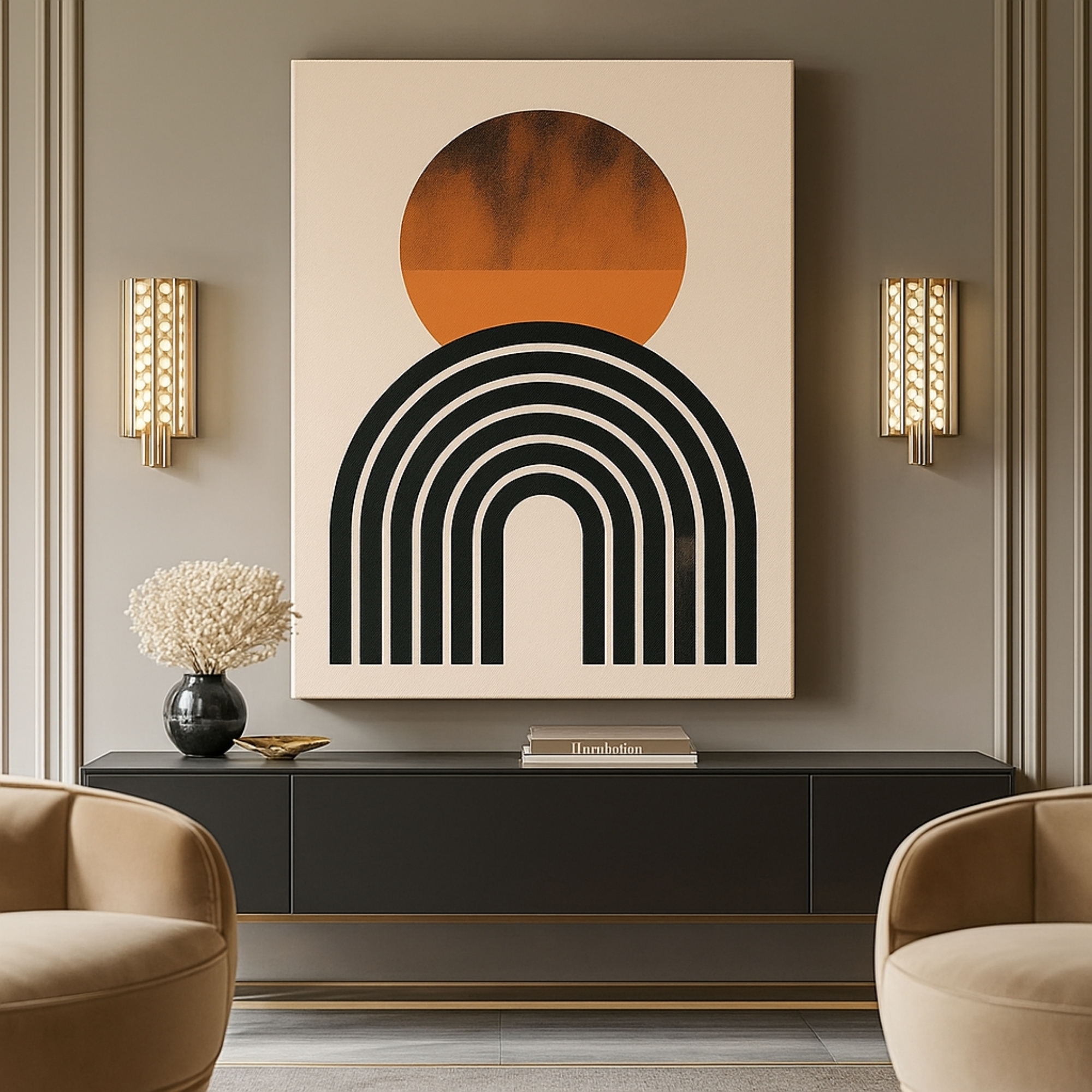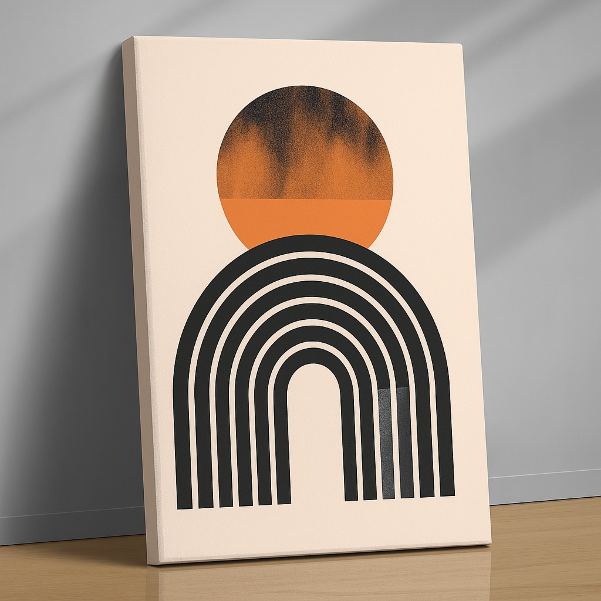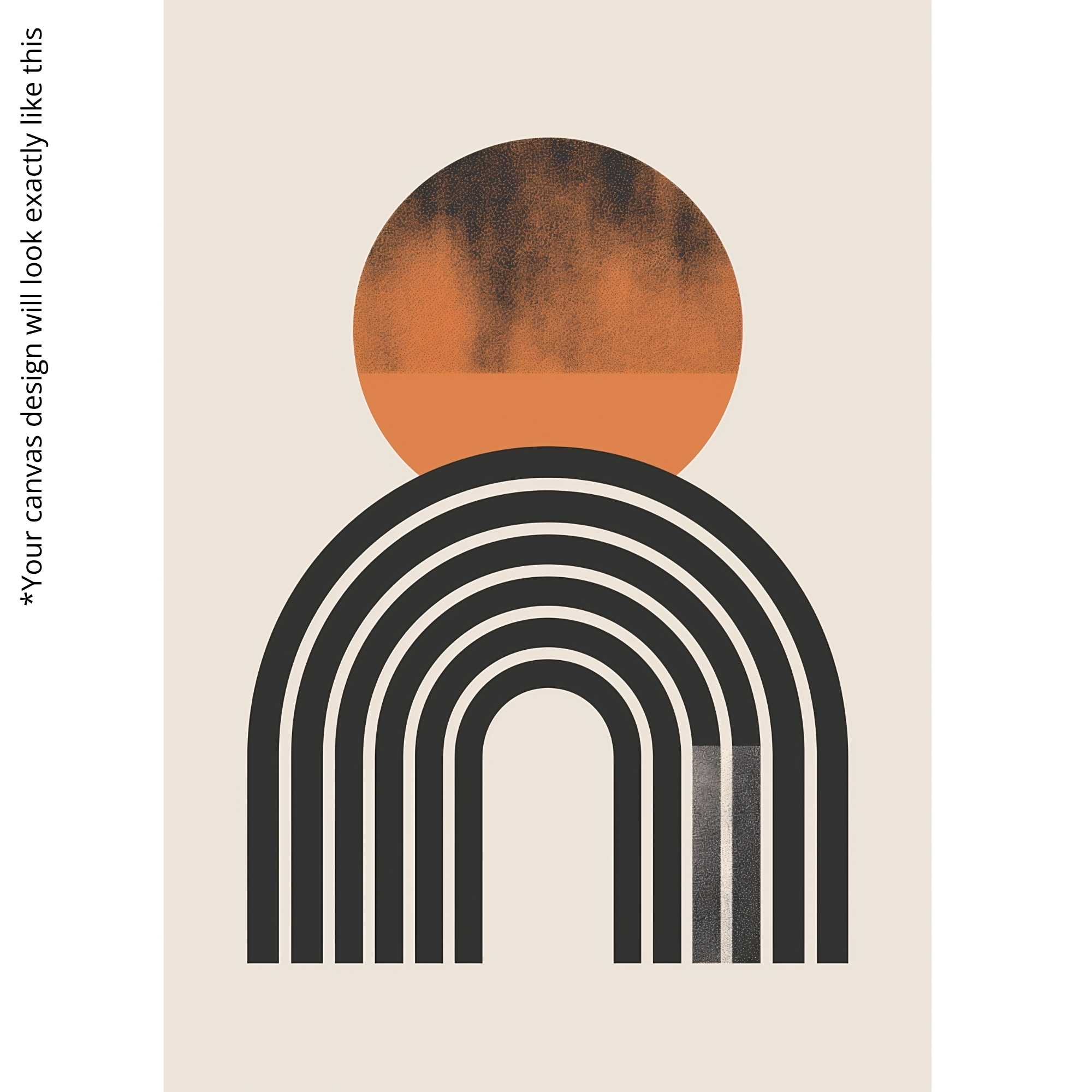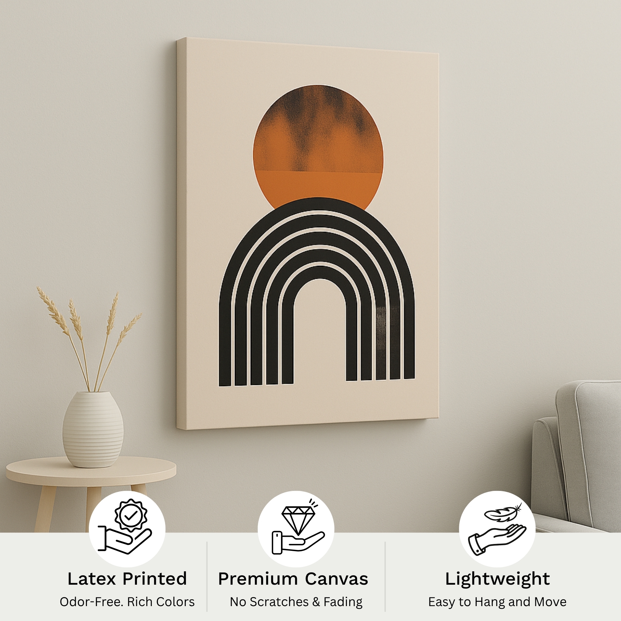 Add contrast and warmth with the Burnt Skyline Canvas Print. Featuring a burnt orange sun rising above layered black arches, this artwork captures the mood of a distant horizon in bold geometric style. Its warm and dramatic palette adds depth and sophistication to modern homes.