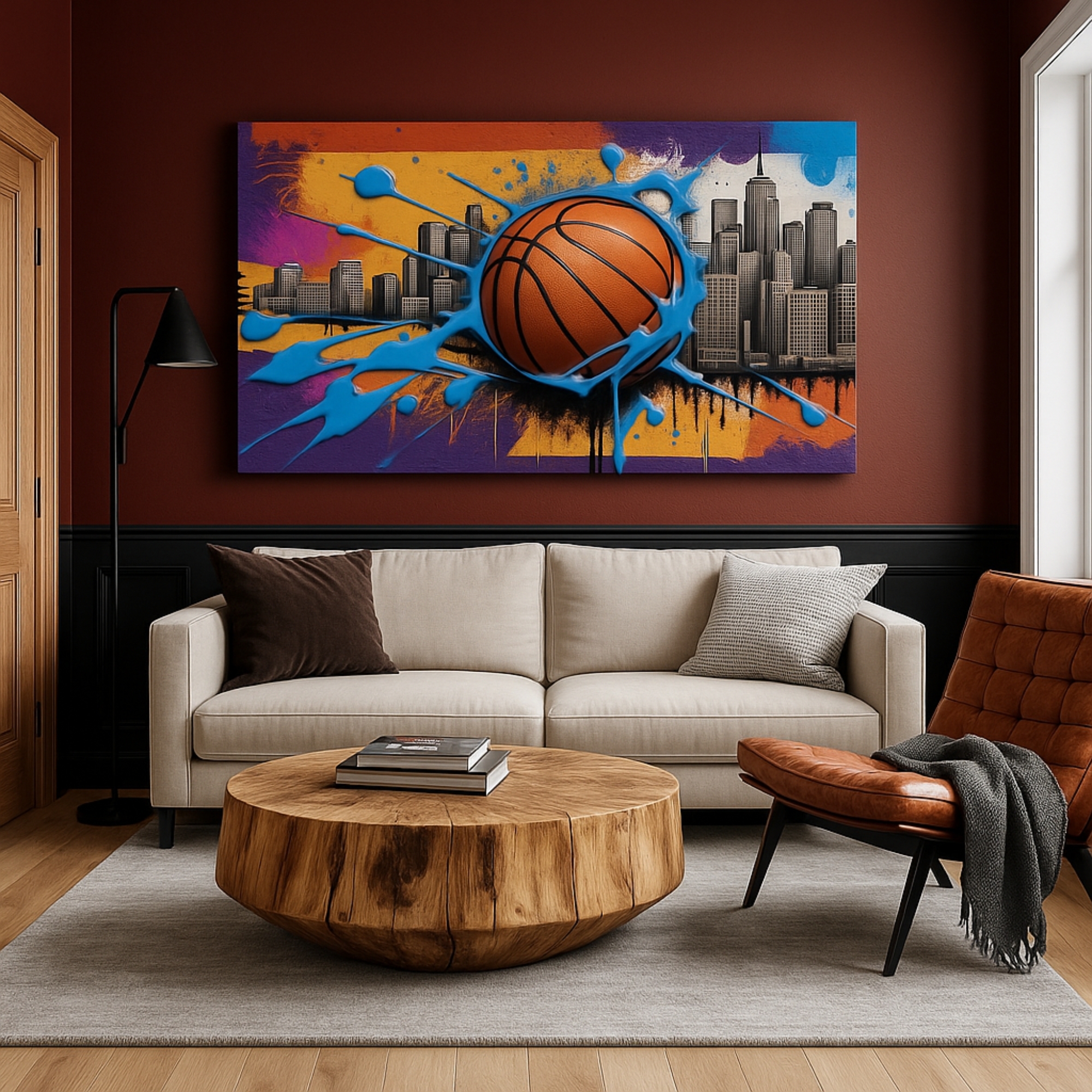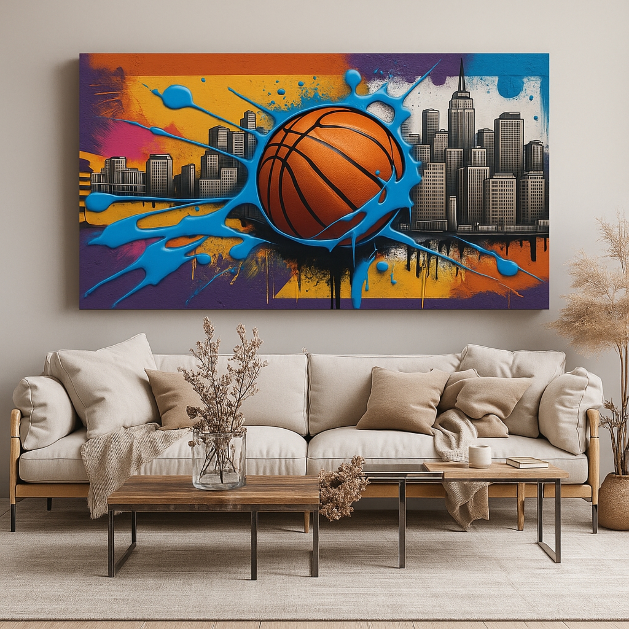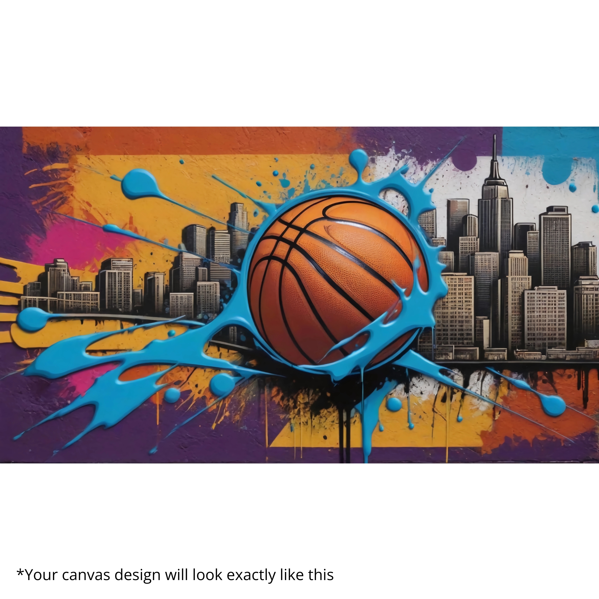 “City Dunk Splash” is a thrilling Canvas Print that combines urban graffiti with the spirit of basketball. A giant ball bursts into blue paint splashes against a skyline backdrop, symbolizing power, ambition, and motion. This bold piece transforms any wall into a celebration of urban sports culture.