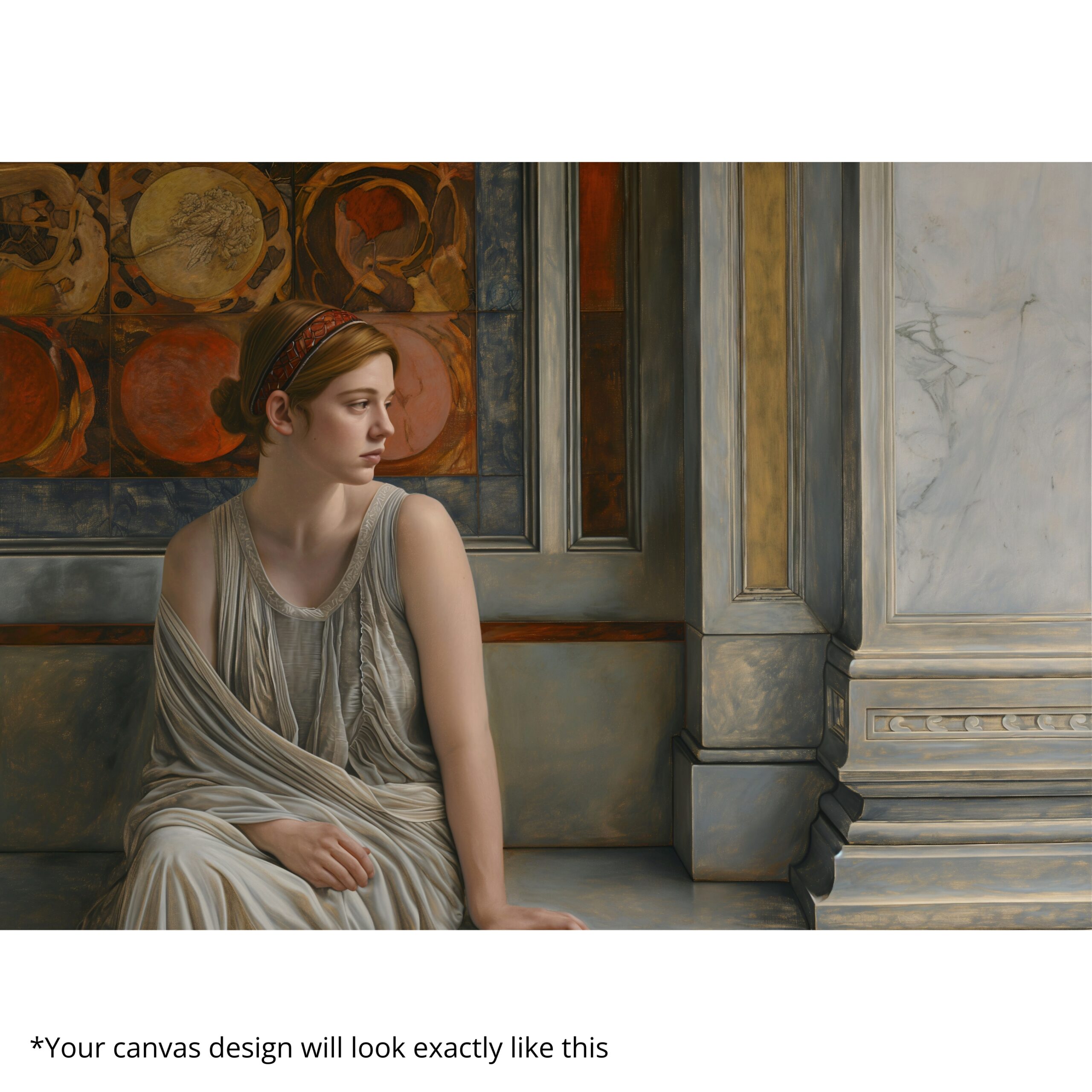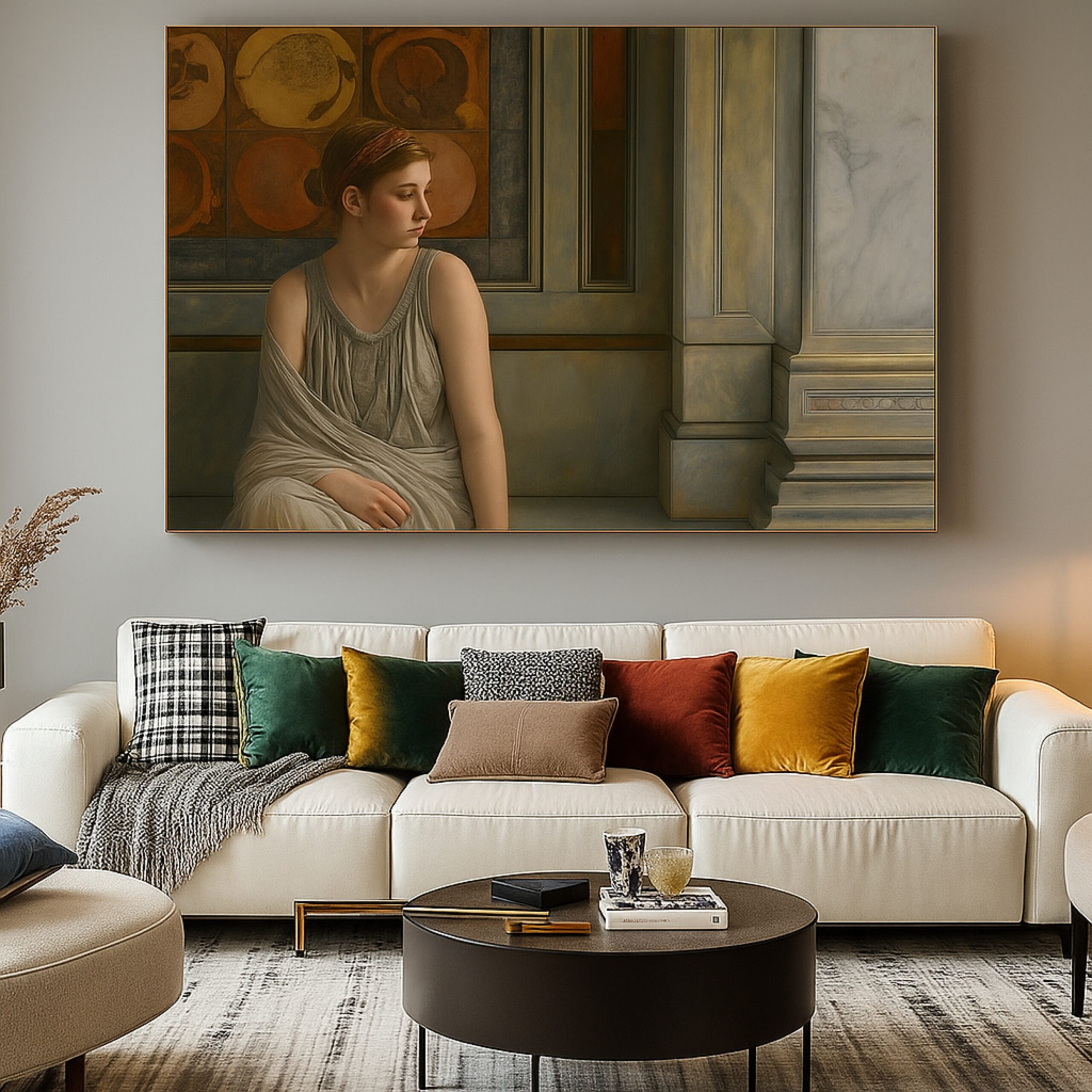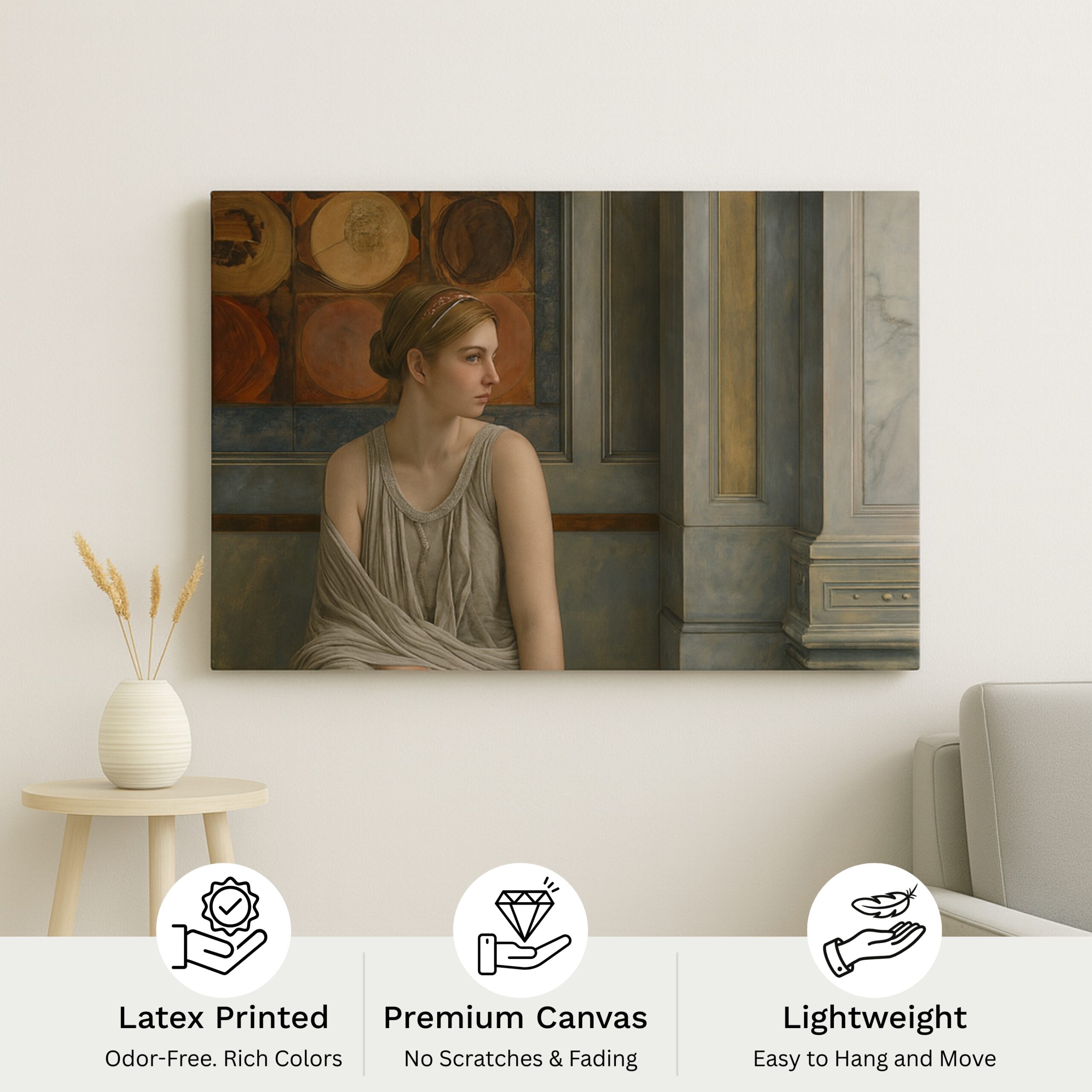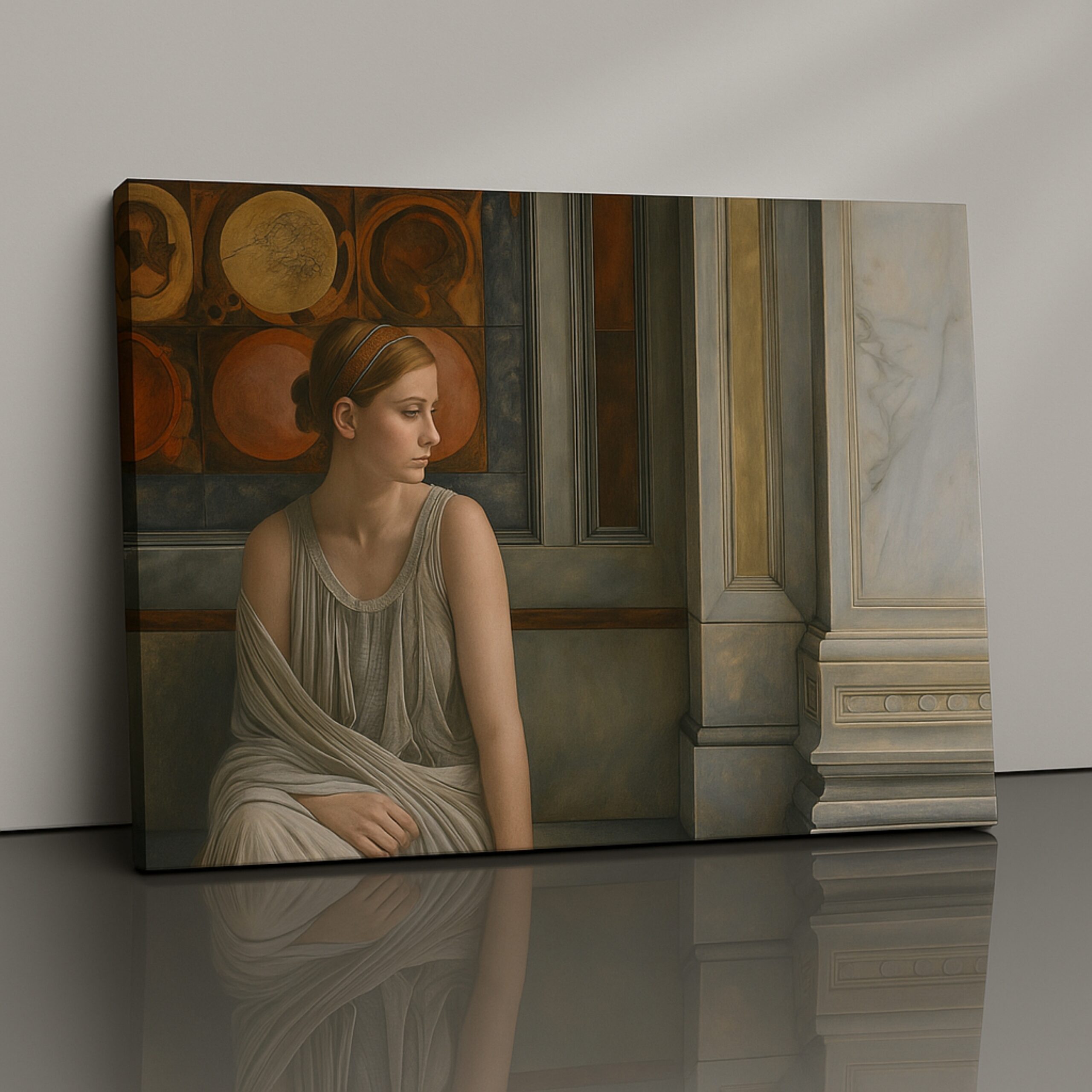 Classical Matrix reflects timeless elegance and serene contemplation. Featuring a poised woman seated against warm-toned classical architecture, this canvas print blends traditional artistry with quiet introspection. It adds cultural richness and sophistication to interiors, making it more than decoration — it is an artistic statement of calmness and refinement.