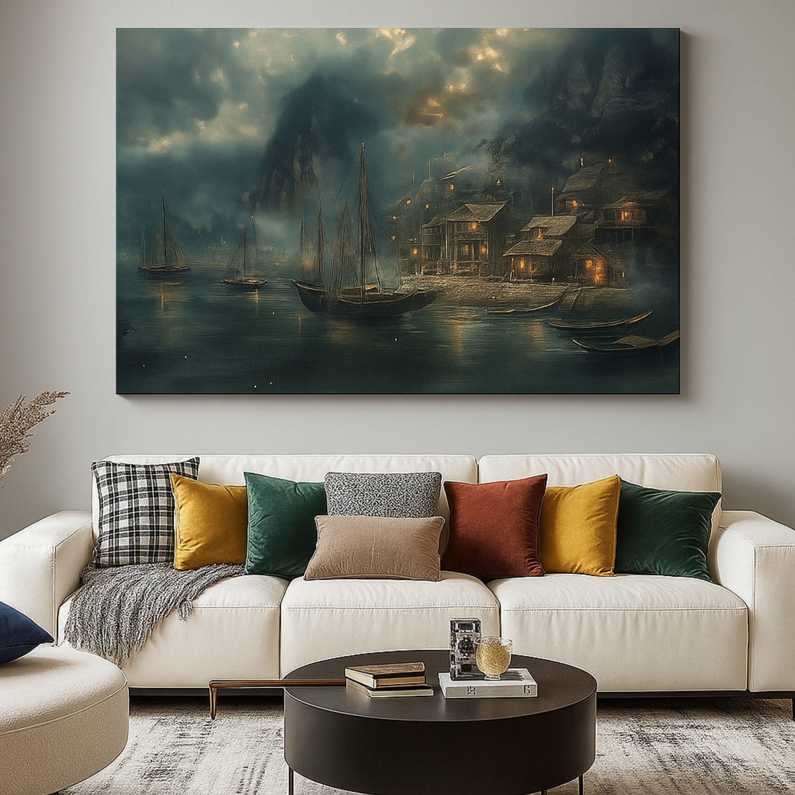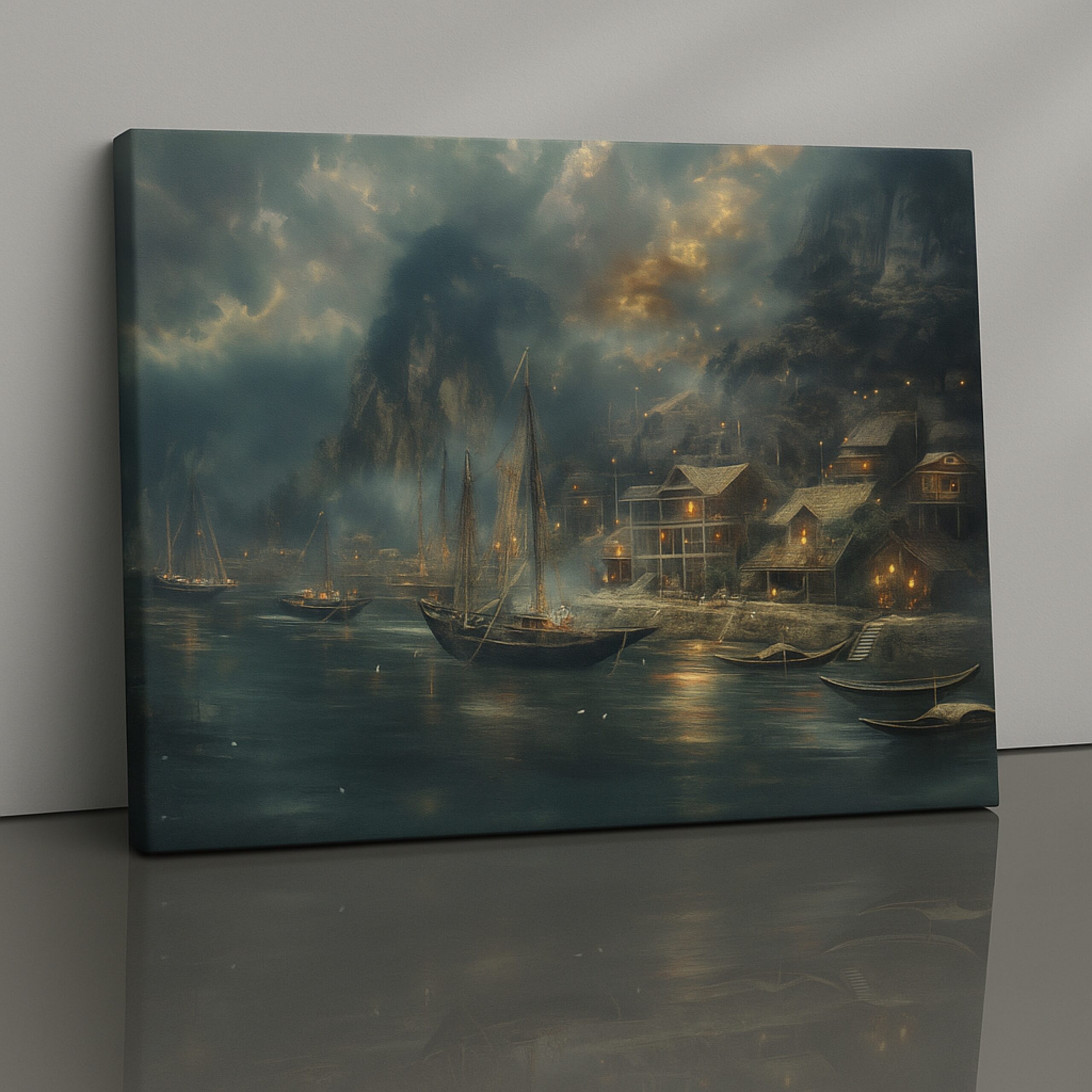 Canvas Print of Cloud Harbor immerses viewers in the mystery of a dreamy coastal village illuminated by lanterns and moody skies. With mist-shrouded ships and glowing reflections, this artwork creates a sense of cinematic atmosphere and maritime wonder. More than décor, it transports interiors into spaces of storytelling and enchantment, perfect for lovers of fantasy-inspired landscapes.