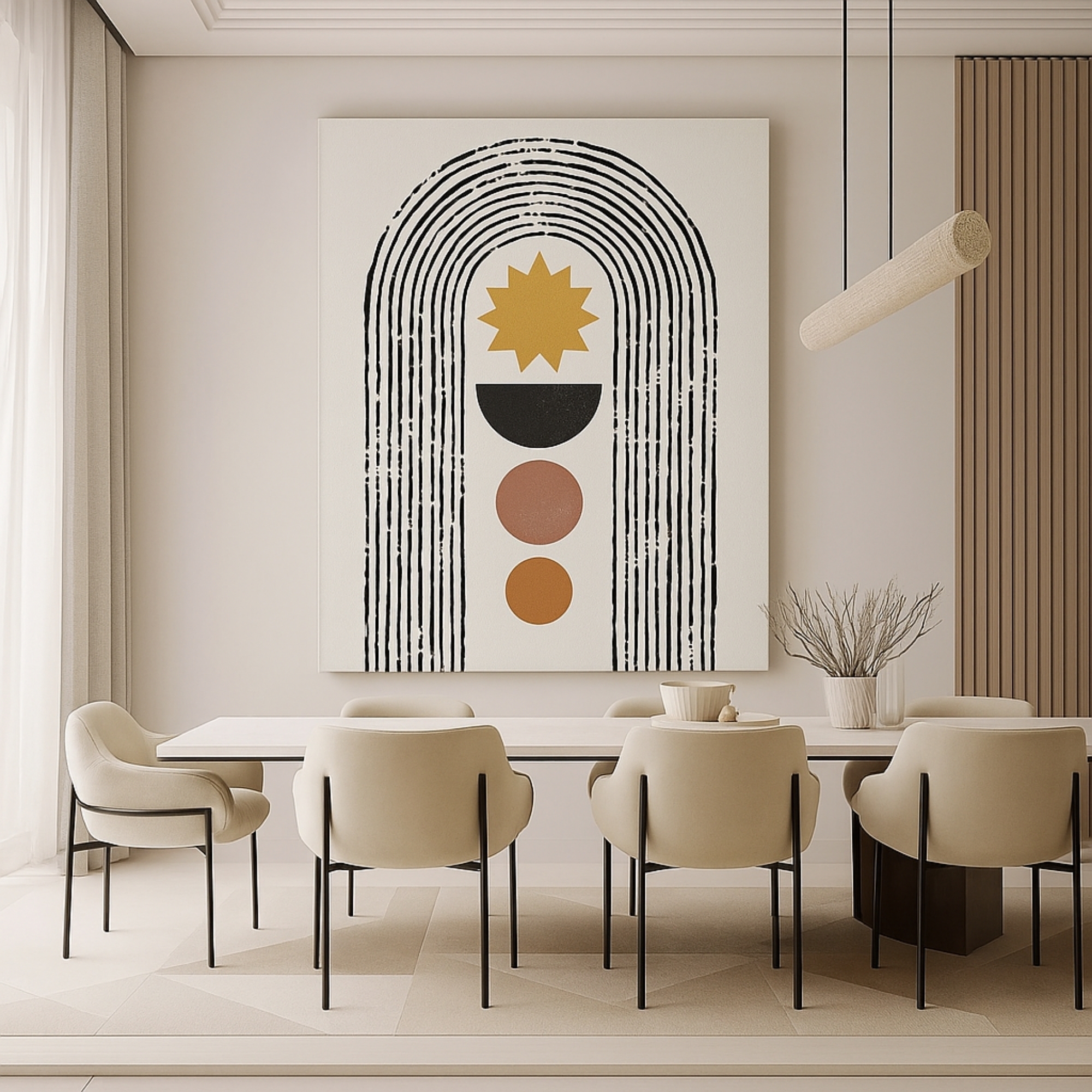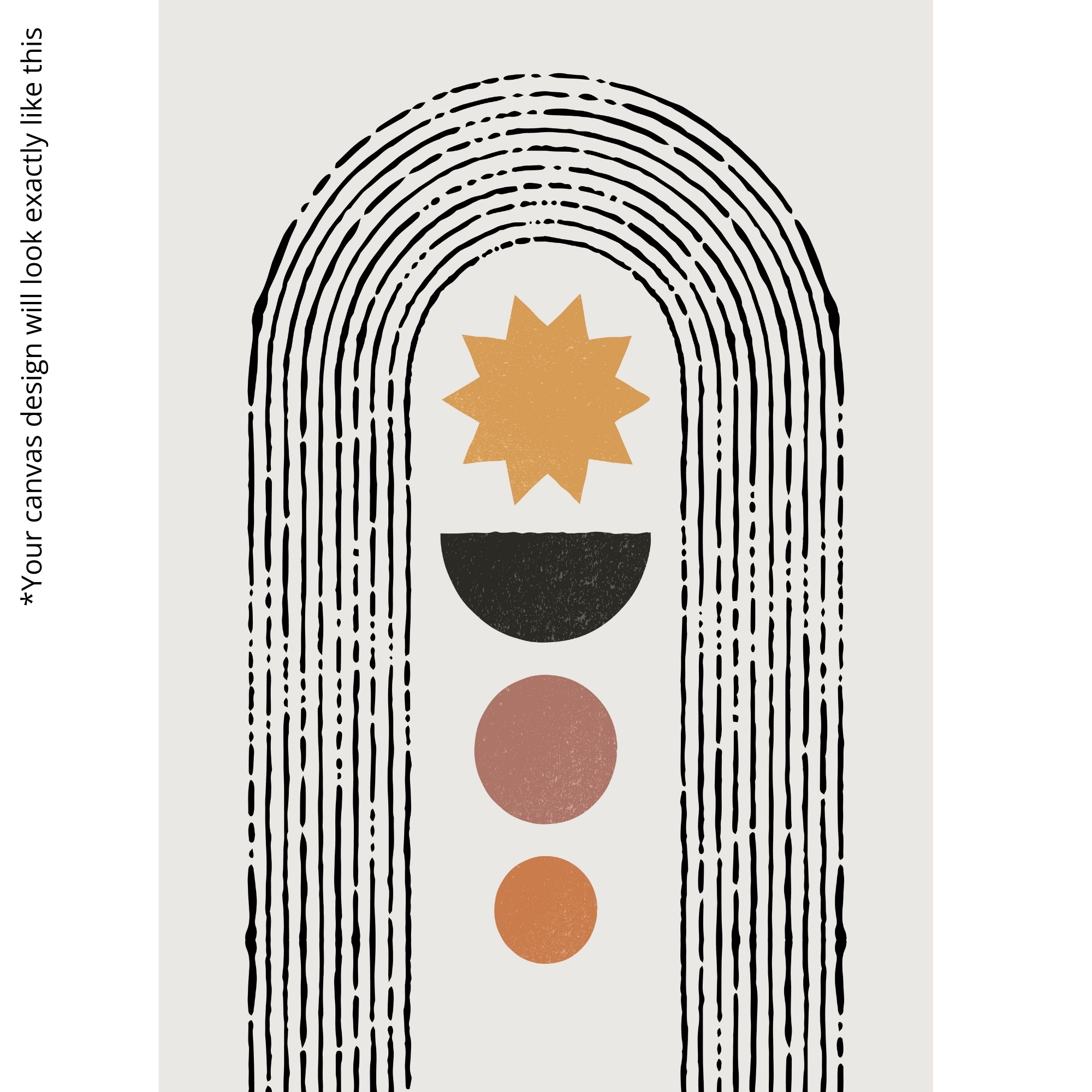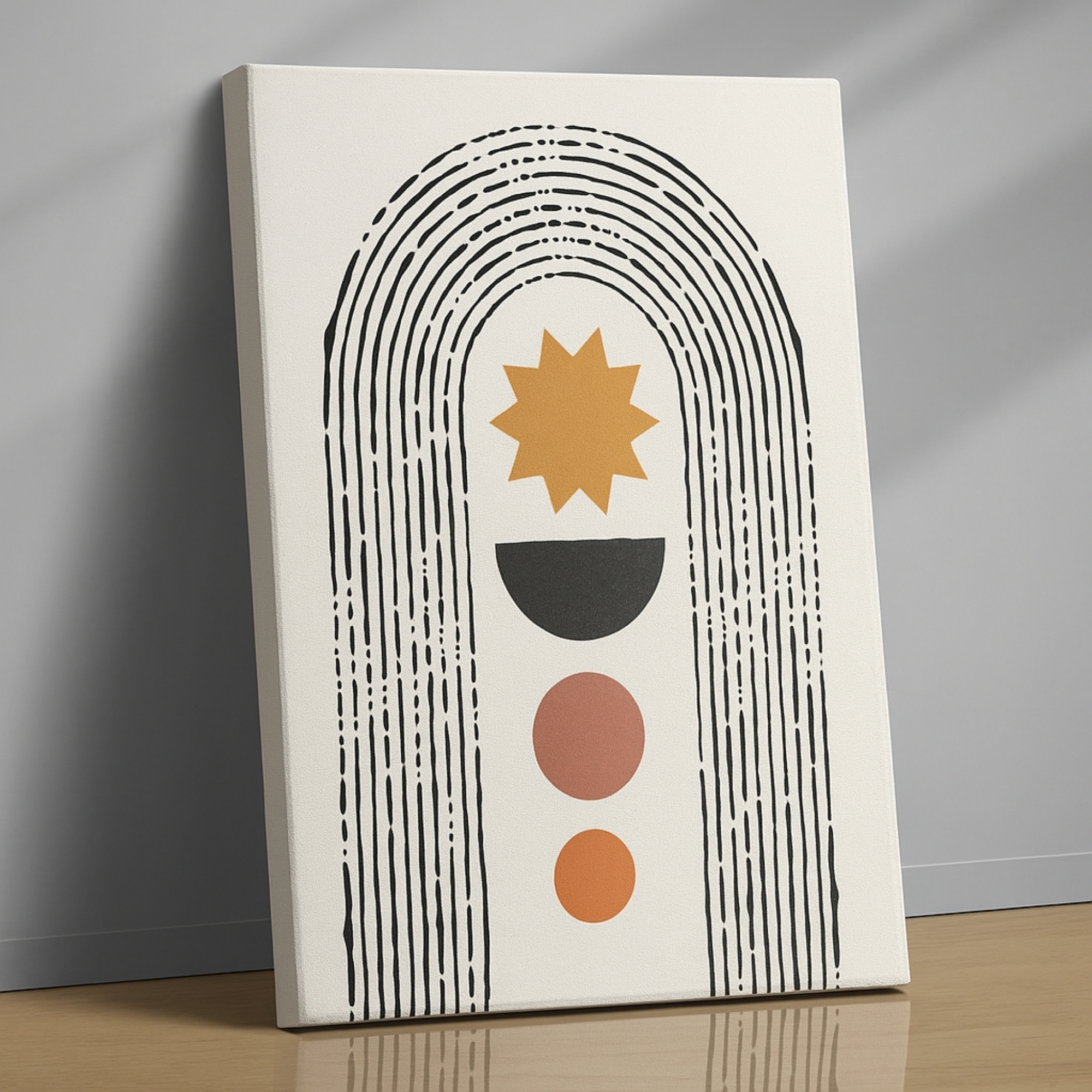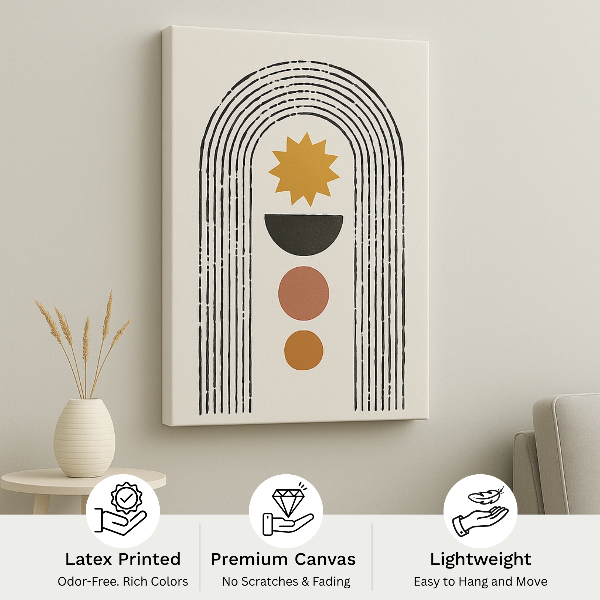 Elevate your interiors with the Cosmic Path Canvas Print. This artwork features an ochre starburst, half-moon, and earthy-toned circles framed within elongated arches, symbolizing cosmic calm and spiritual balance. A harmonious blend of geometry and celestial motifs, it adds grounding and positivity to modern homes.