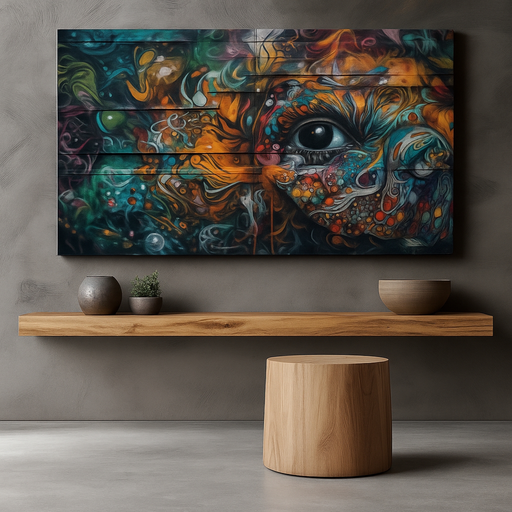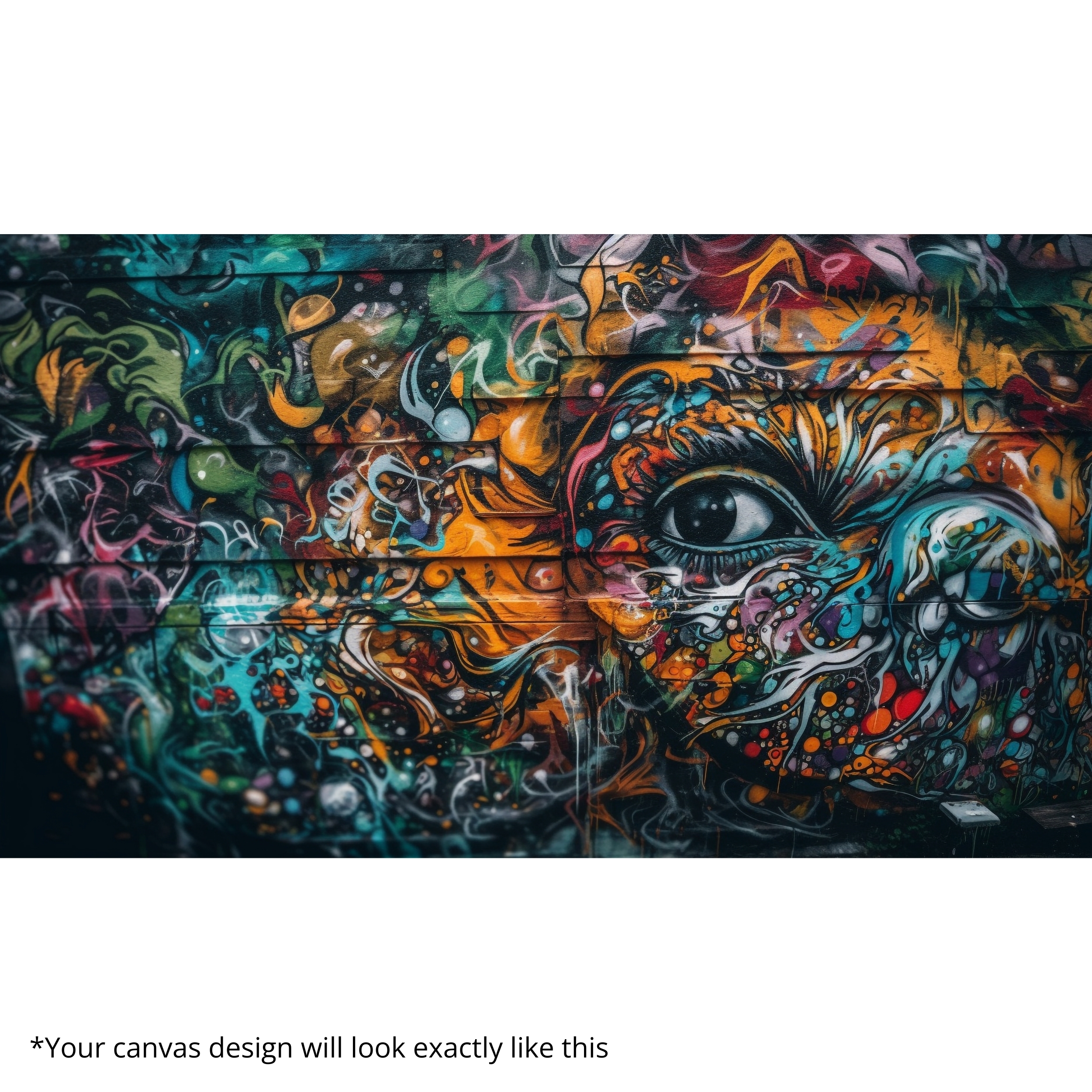 “Cosmic Vision Wall” is a mesmerizing Canvas Print that merges graffiti abstraction with cosmic symbolism. A swirling explosion of colors, textures, and patterns forms a face-like composition, bringing depth and mystery to your interiors. This bold artwork is perfect for those who enjoy imaginative design and vibrant modern décor.