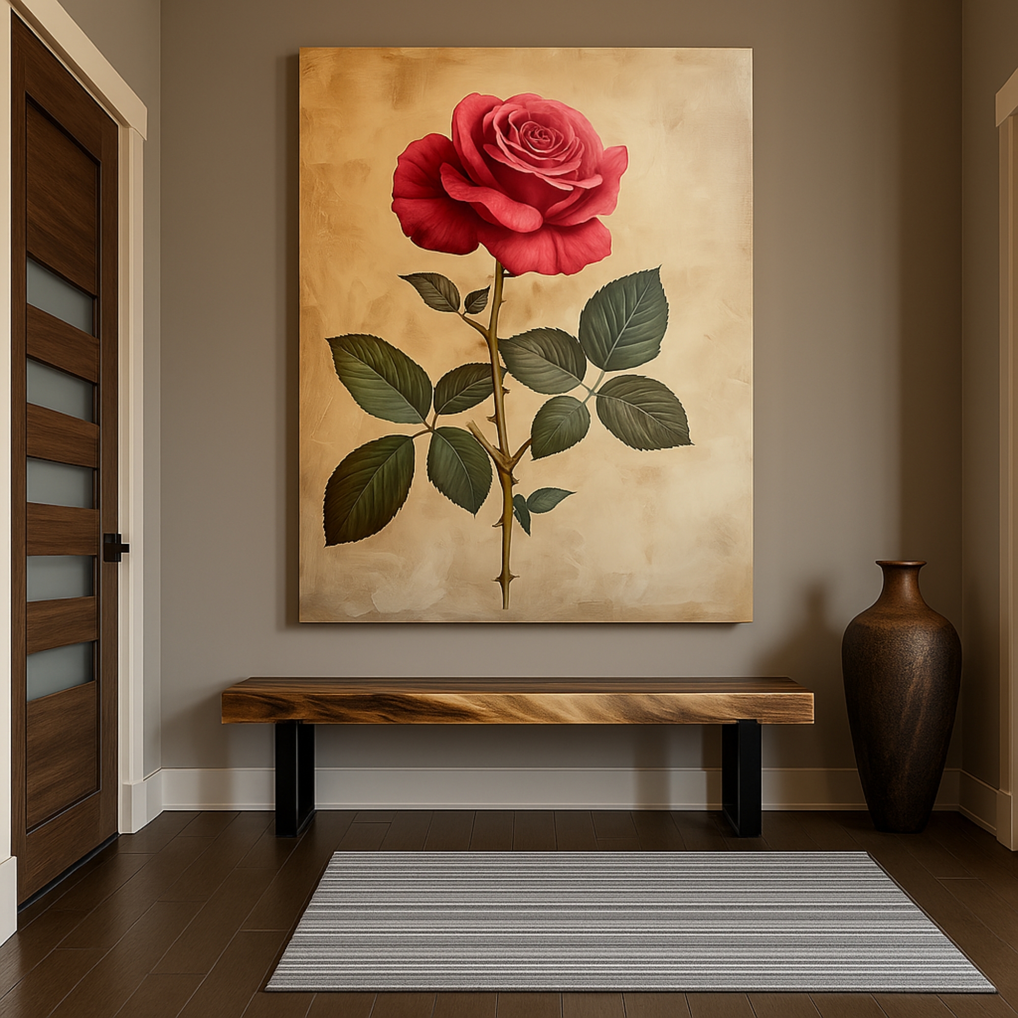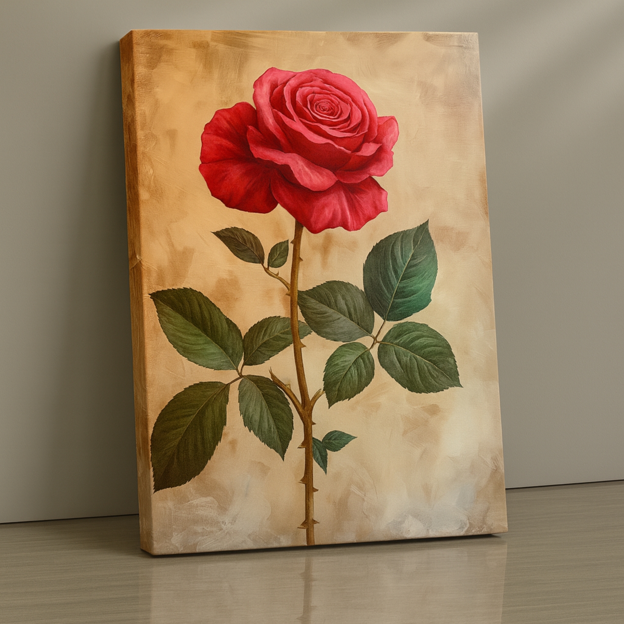 Introduce refined floral beauty with the Crimson Petal Royale Canvas Print. This artwork presents a rich crimson rose with delicate shading and depth. As a result, it adds warmth and classic sophistication to your walls. The painterly texture enhances its timeless appeal.