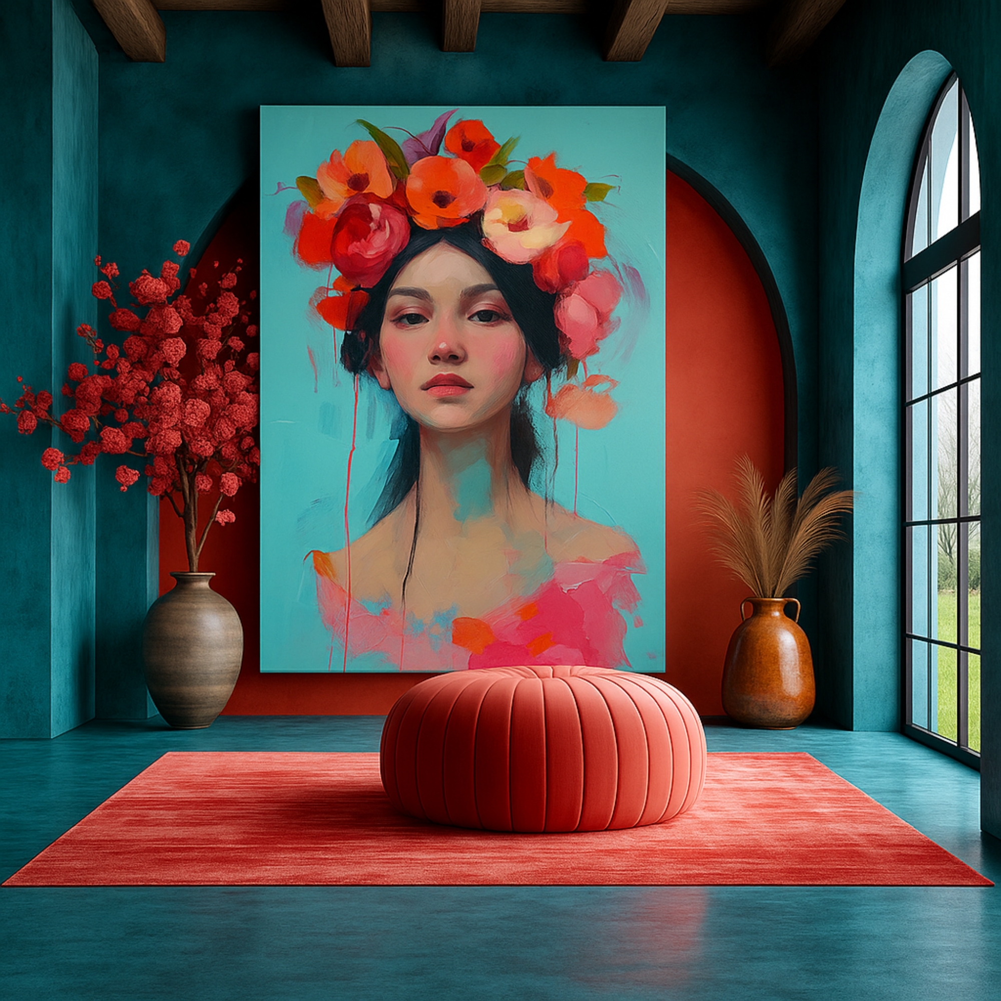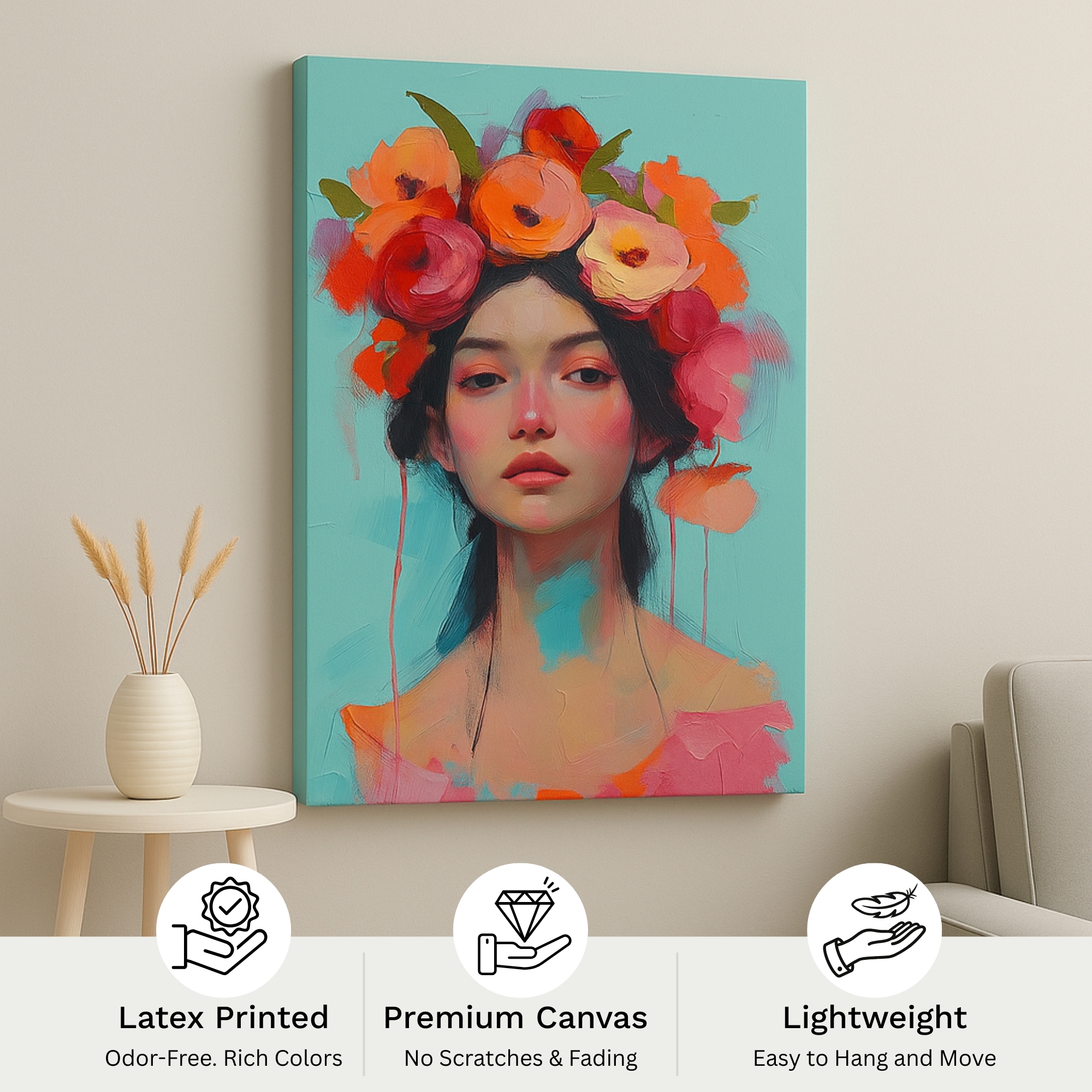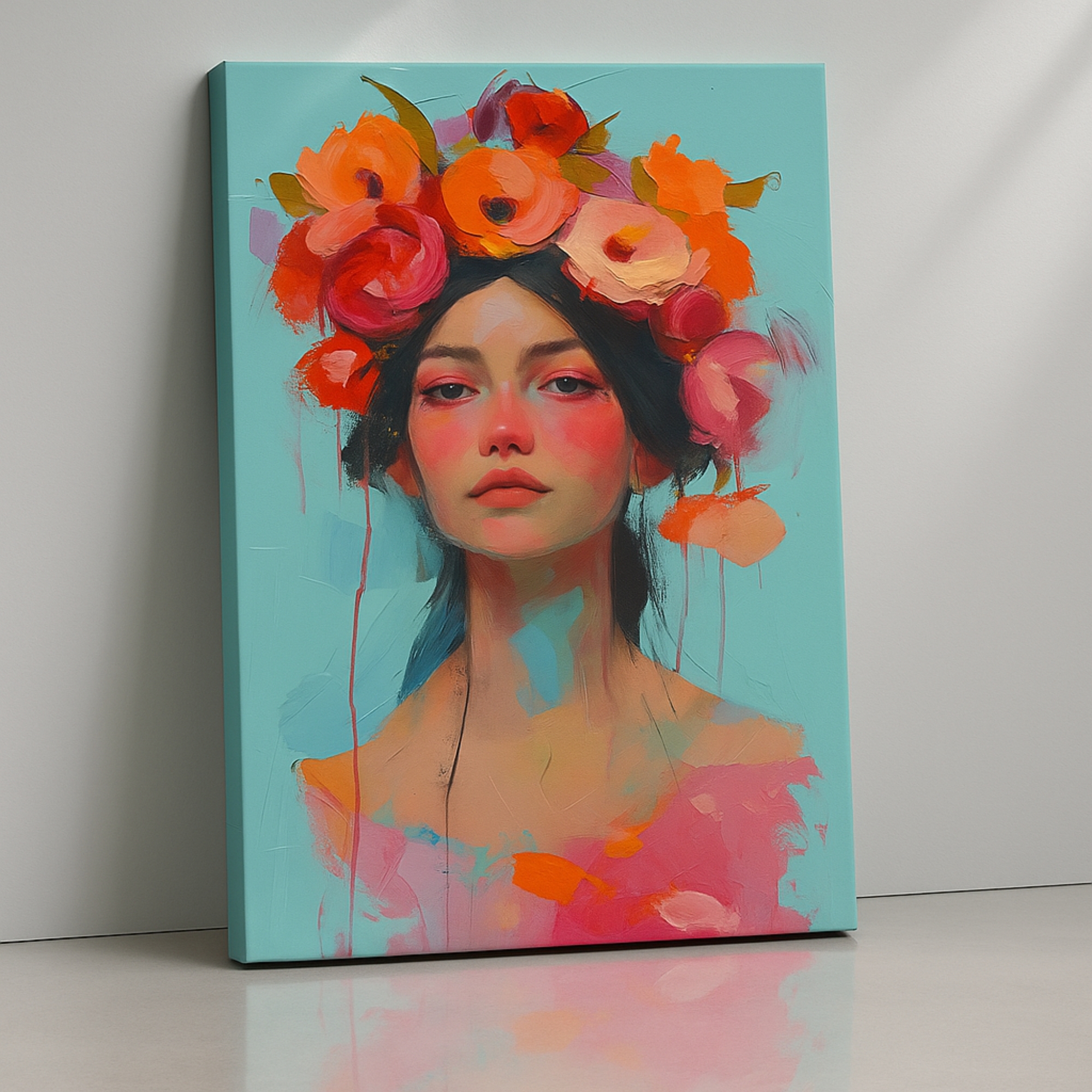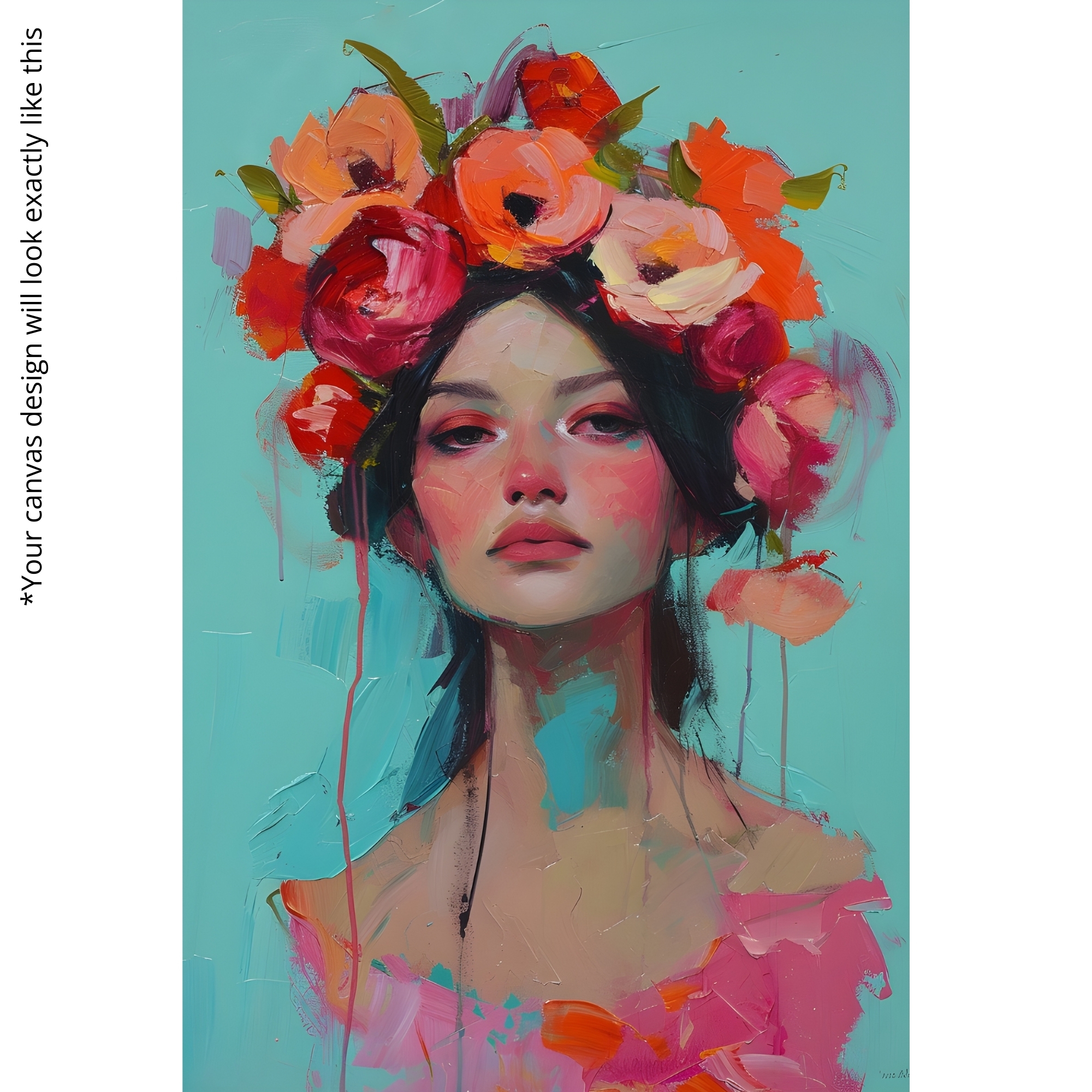 Feminine portrait with coral flower crown against turquoise. Premium stretched canvas, eco-friendly inks, ready to hang.