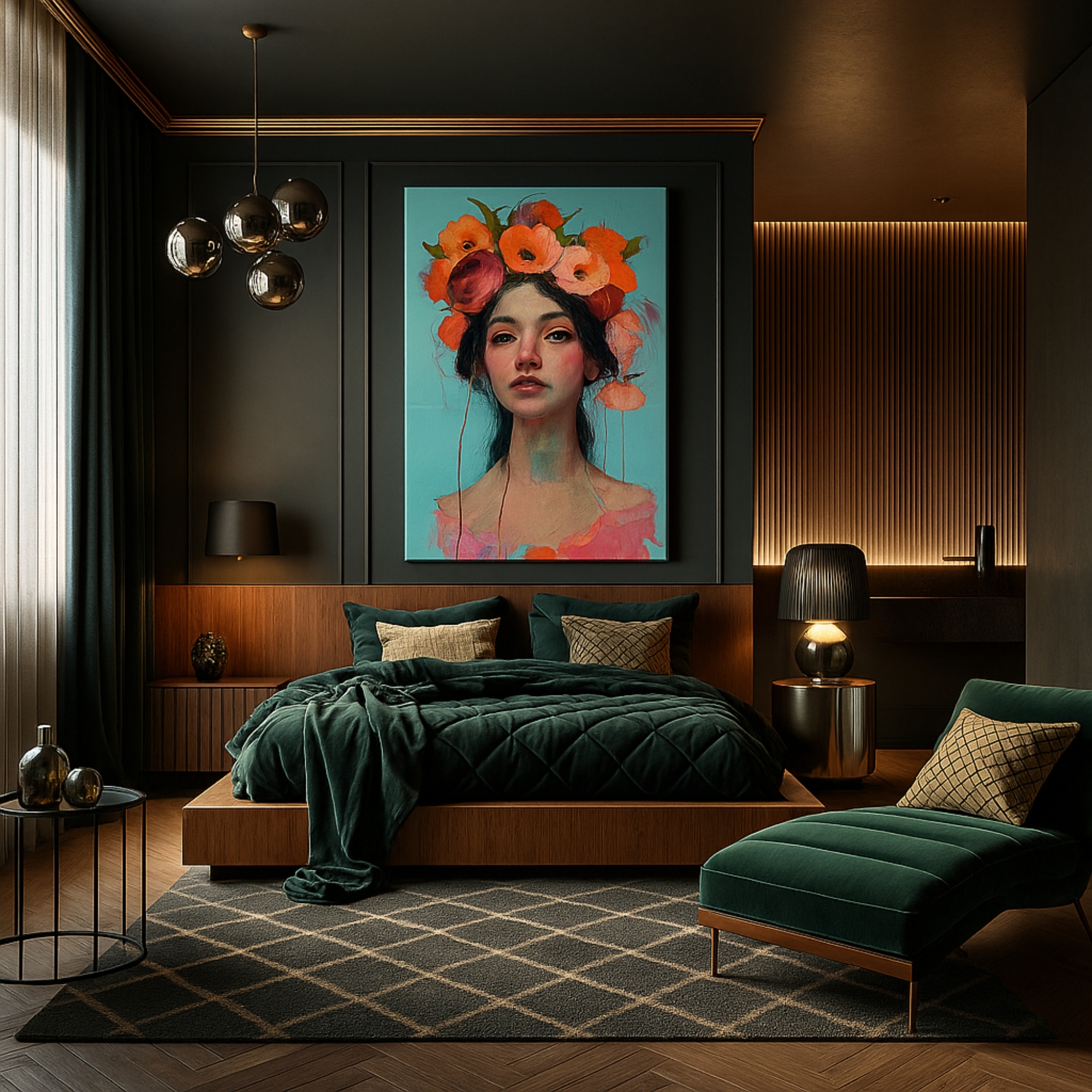 Bring poetic elegance with the Canvas Print of Crown of Coral Dreams. A serene female figure crowned with coral-toned poppies rests against a turquoise backdrop, symbolizing grace and balance. Its dreamy composition and bold hues make it ideal for boho, feminine, or nature-inspired spaces, transforming ordinary walls into soulful art displays.