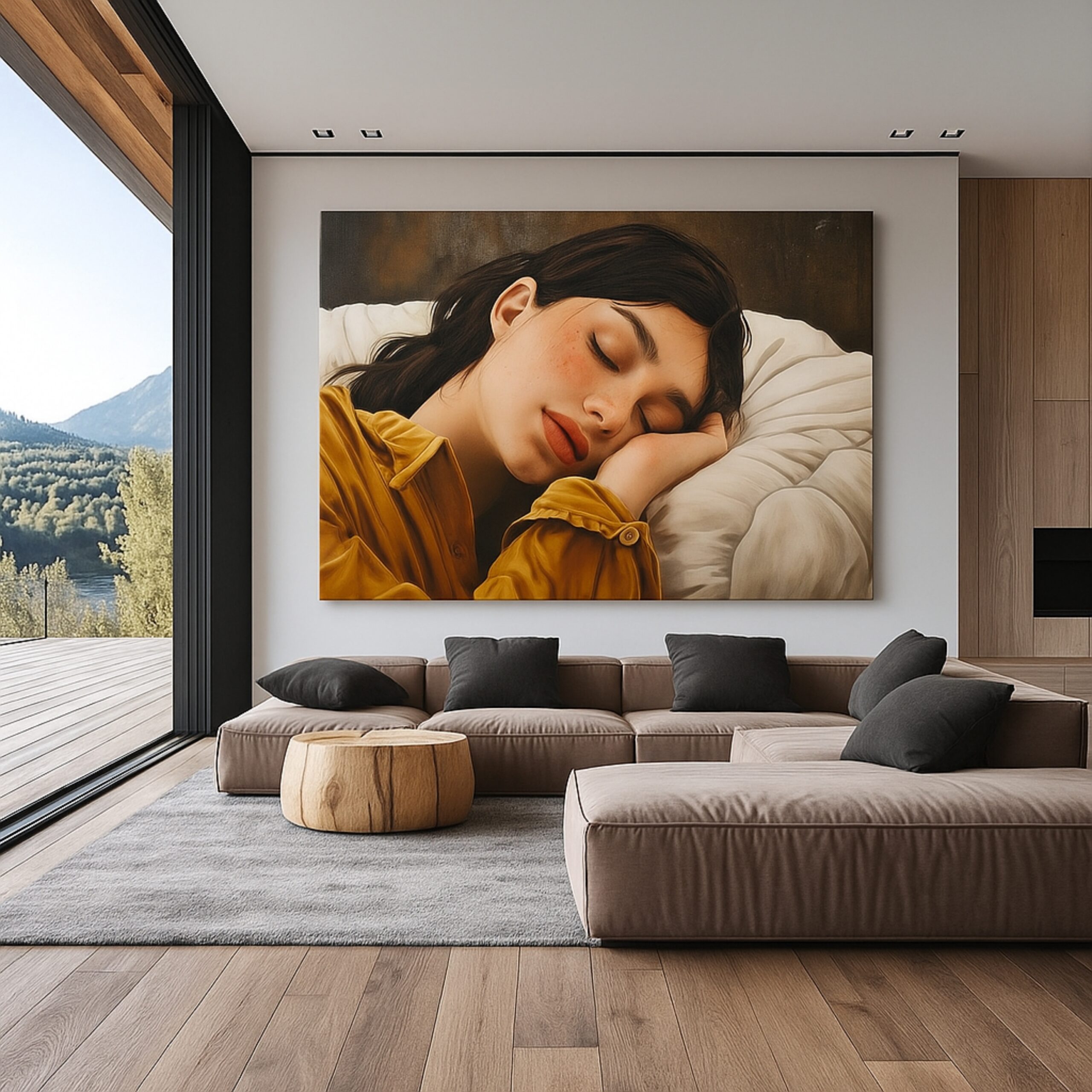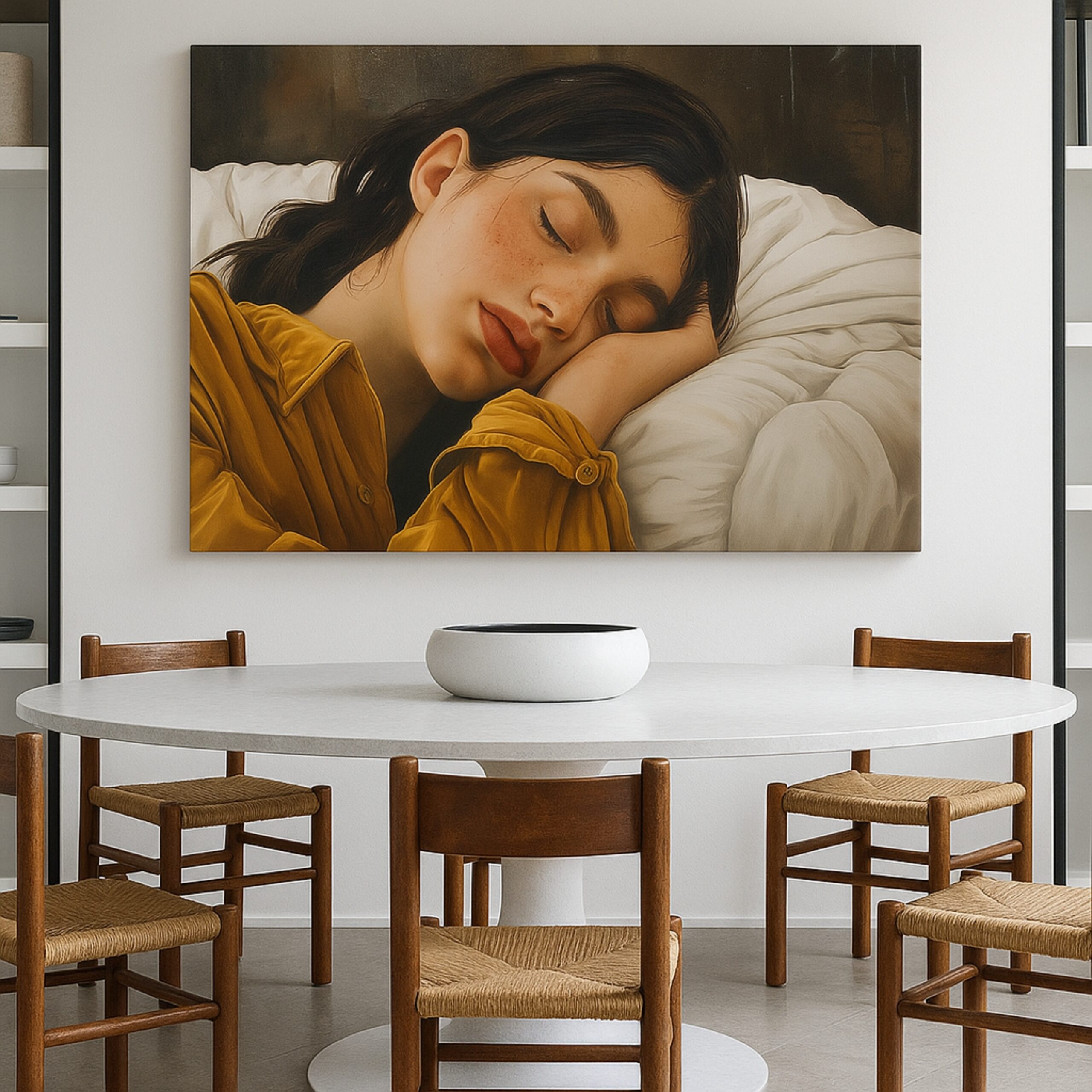 Dream Protocol evokes peace and calm through the delicate portrayal of a young woman asleep. The soft tones, lifelike textures, and serene composition make this artwork a soothing addition to interiors. More than decoration, it is a meditative canvas print that creates restful spaces perfect for unwinding.