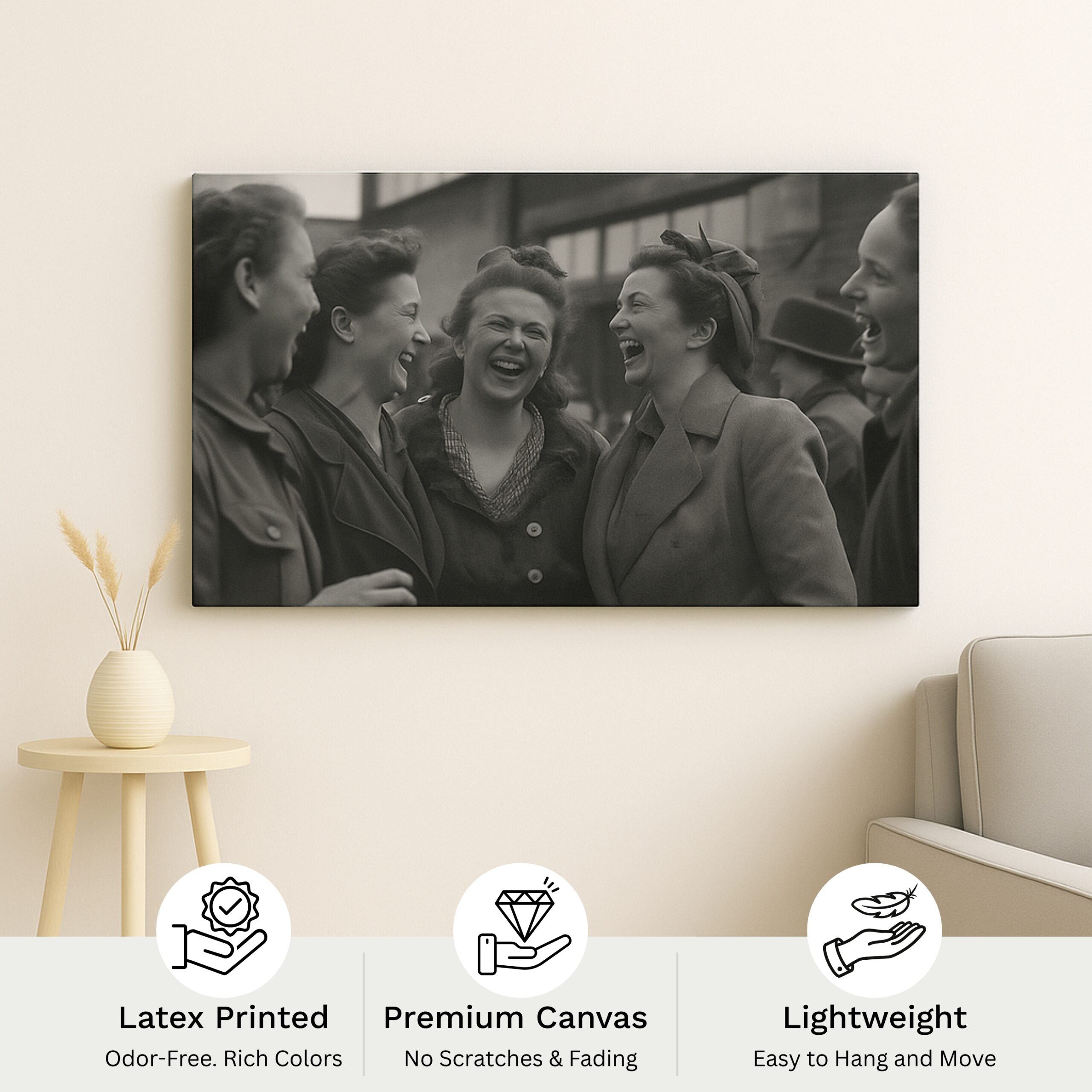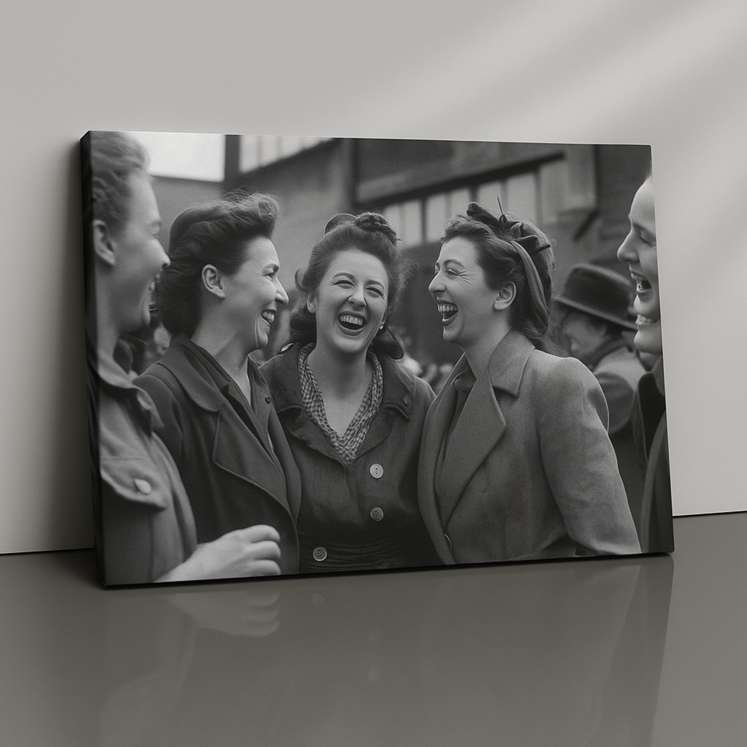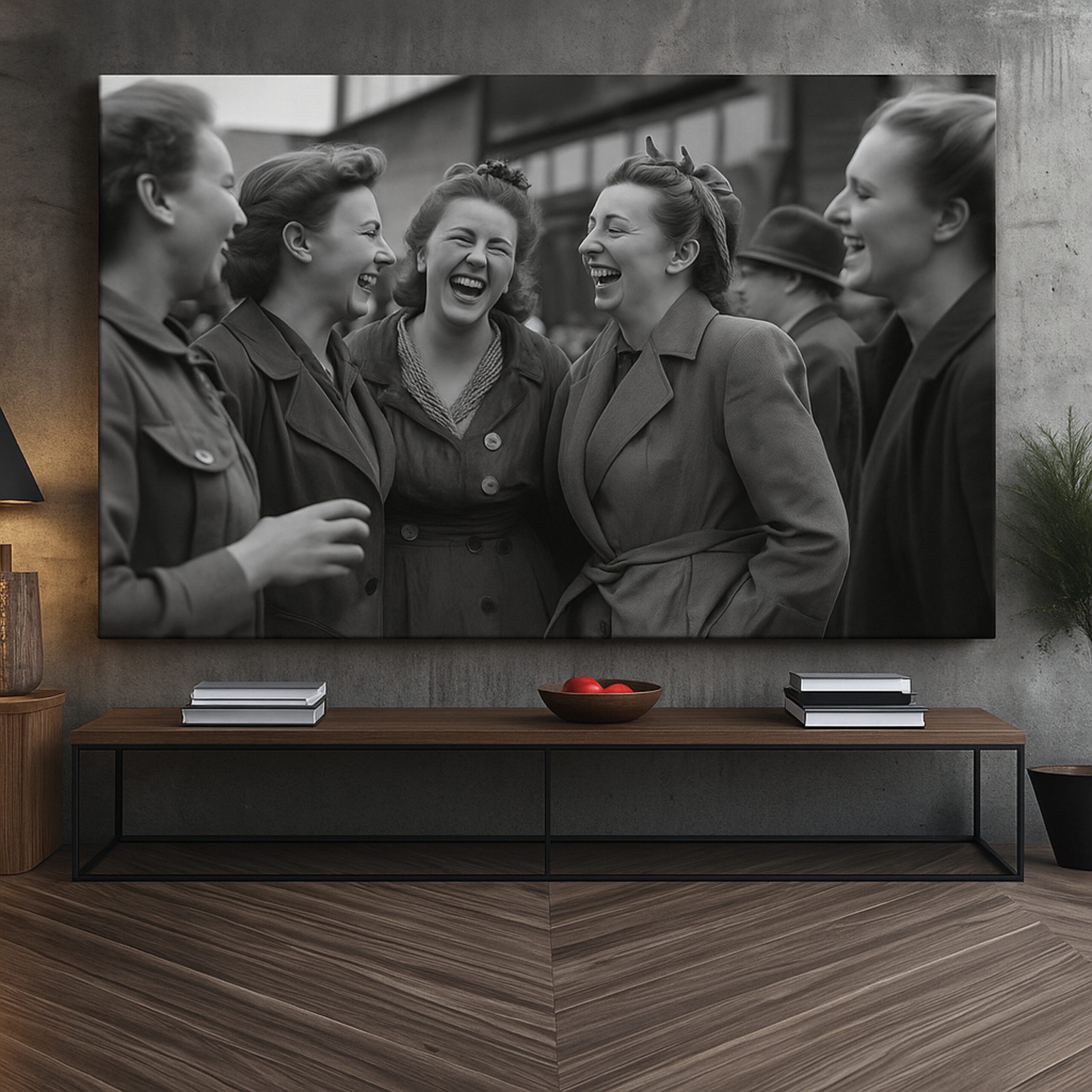 Echo Lattice celebrates timeless laughter, resilience, and human connection in a striking black-and-white composition. This artwork portrays women sharing a heartfelt laugh, capturing warmth, positivity, and vintage charm in every detail. Perfectly blending nostalgia with elegance, this canvas print adds a layer of depth and joy to modern homes. It is more than décor — it’s a symbol of friendship, resilience, and the beauty of cherished memories.