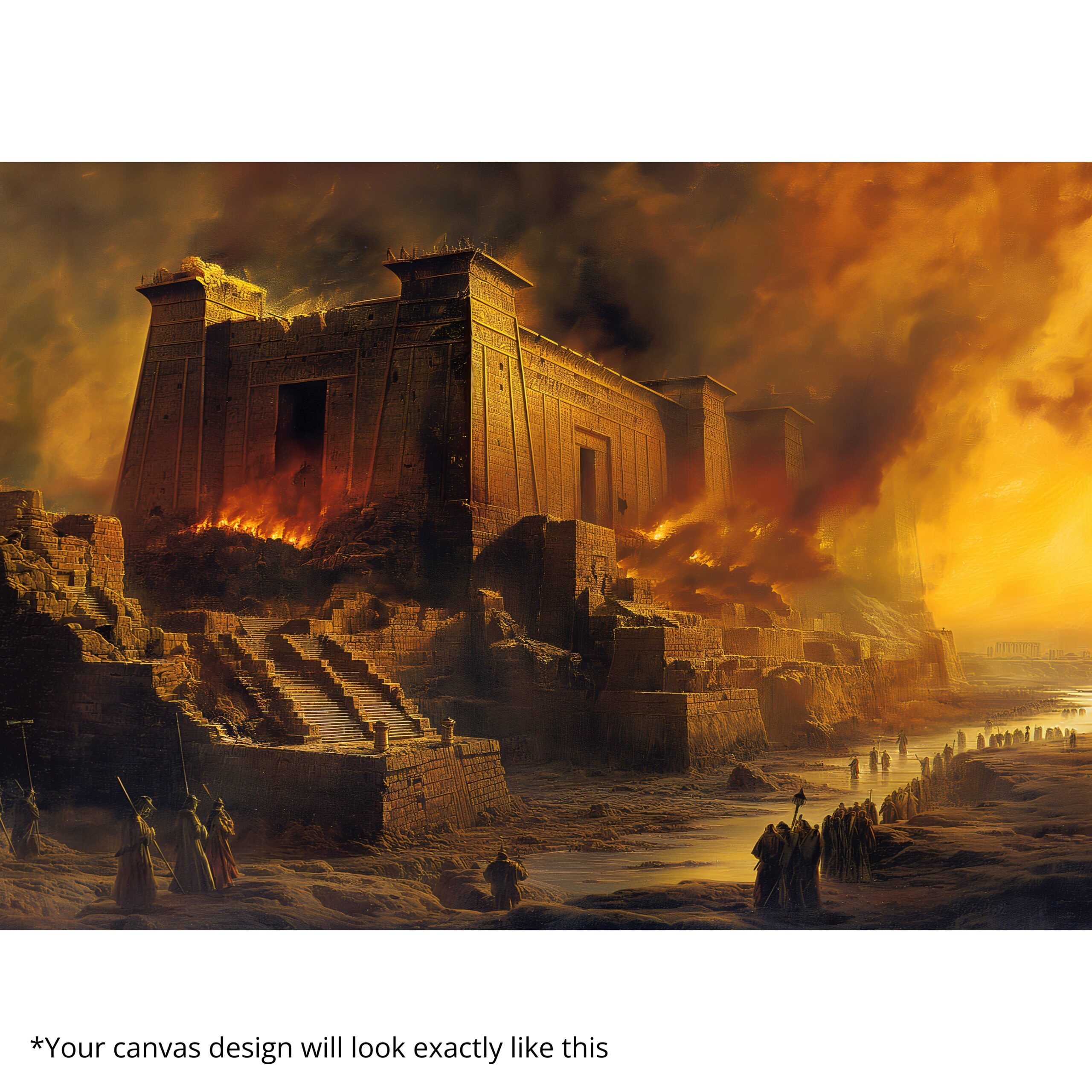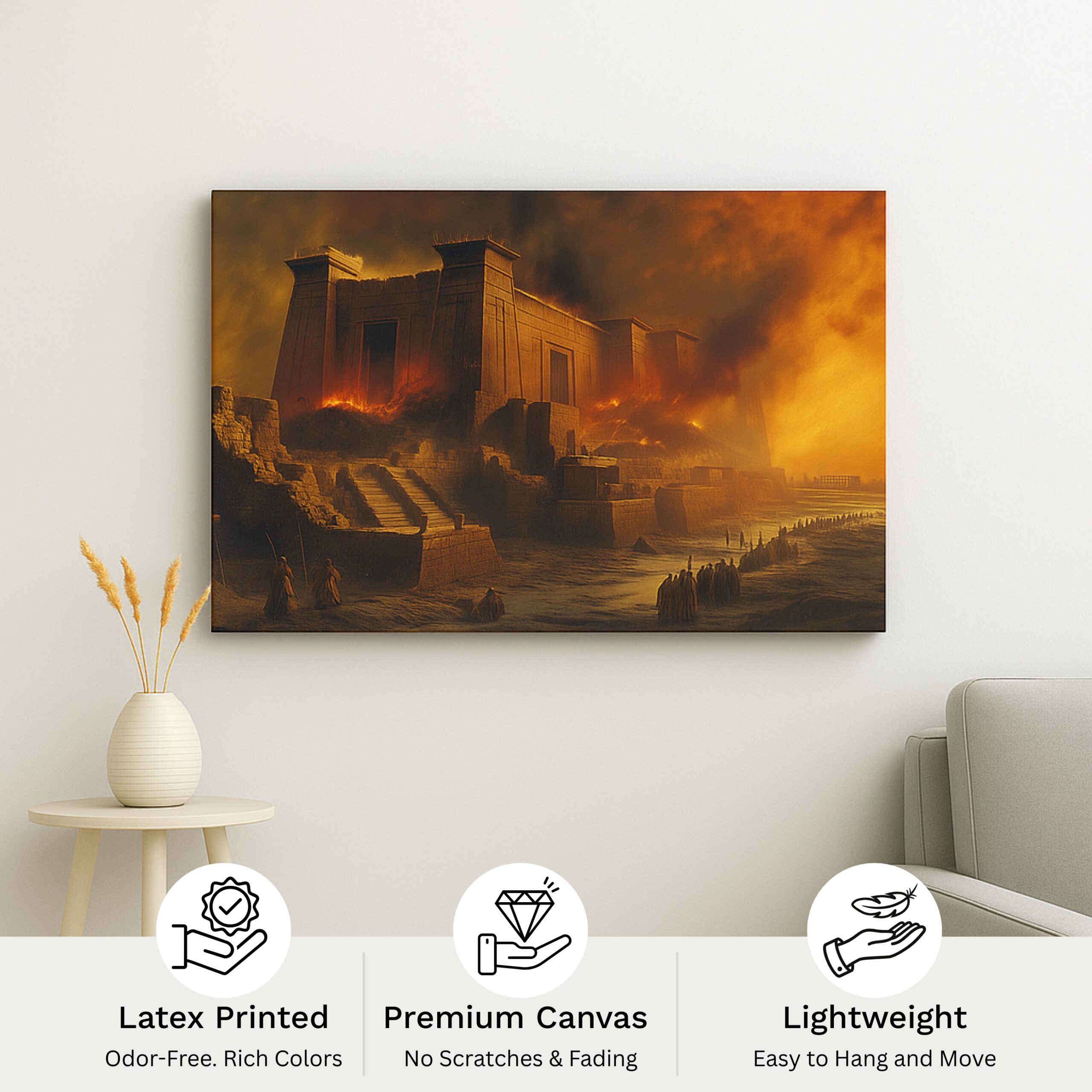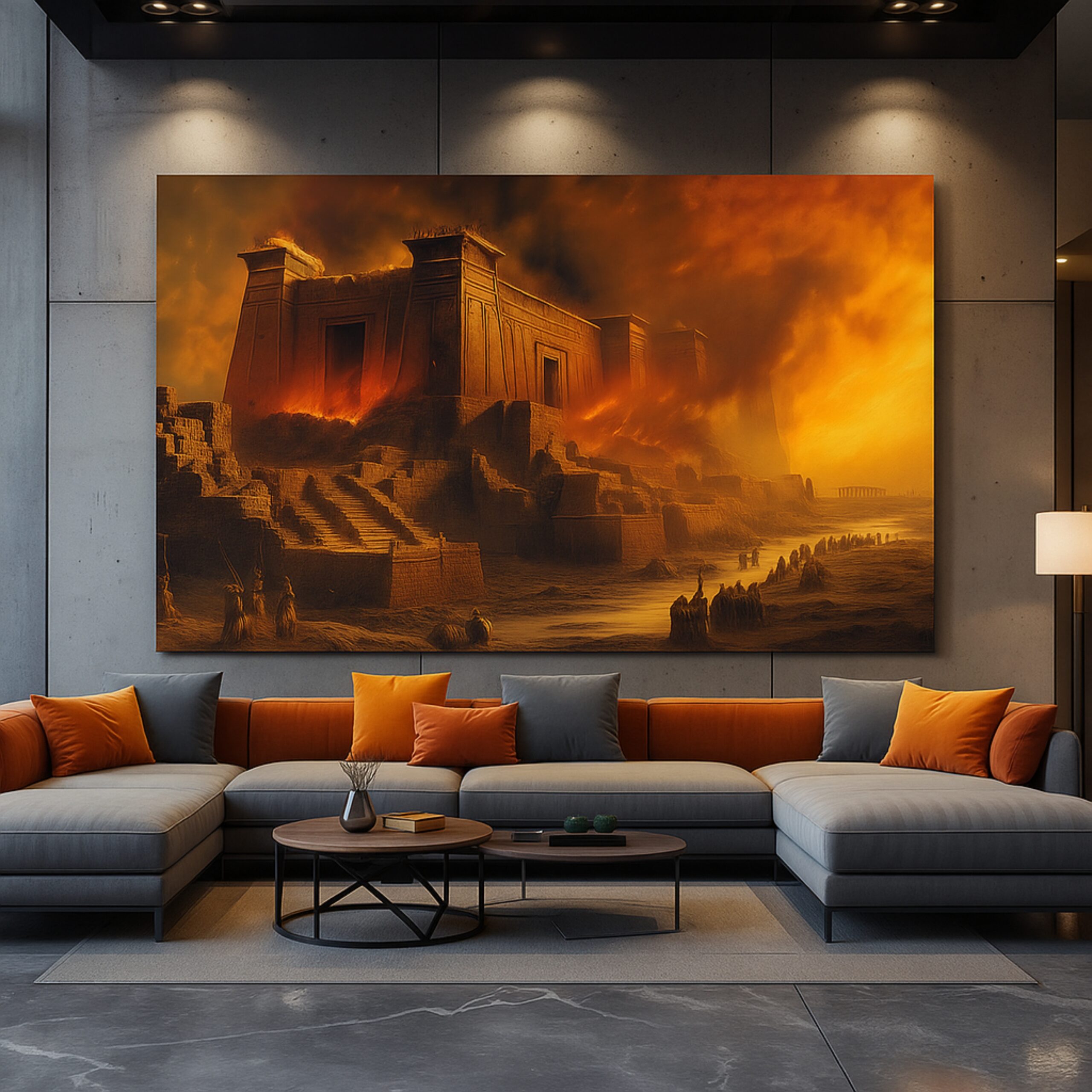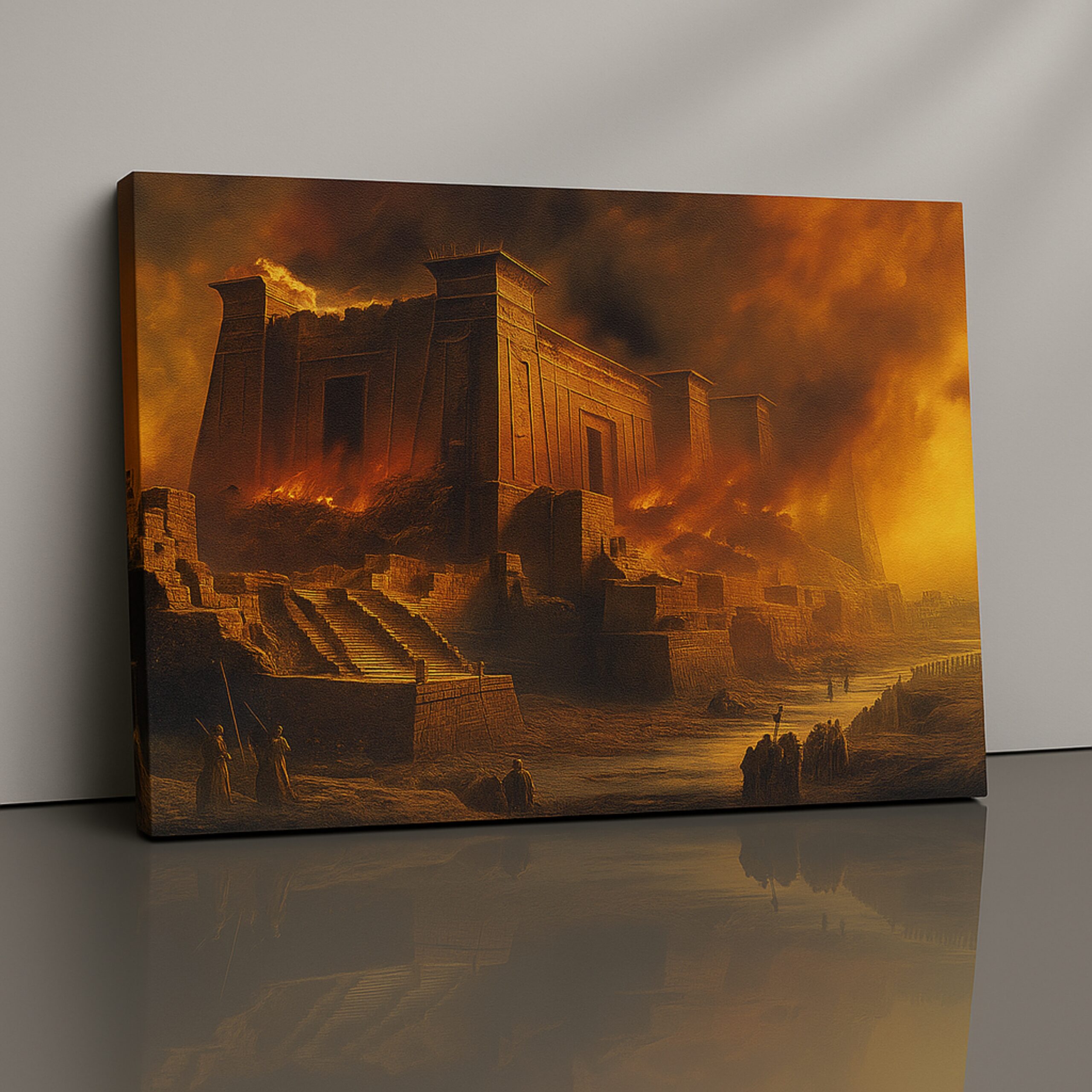 Empire Ablaze captures the fiery intensity of an ancient empire in flames. With its dramatic palette and monumental structures, this artwork conveys both destruction and resilience. A powerful centerpiece, this canvas print transforms any wall into a story of strength and history.