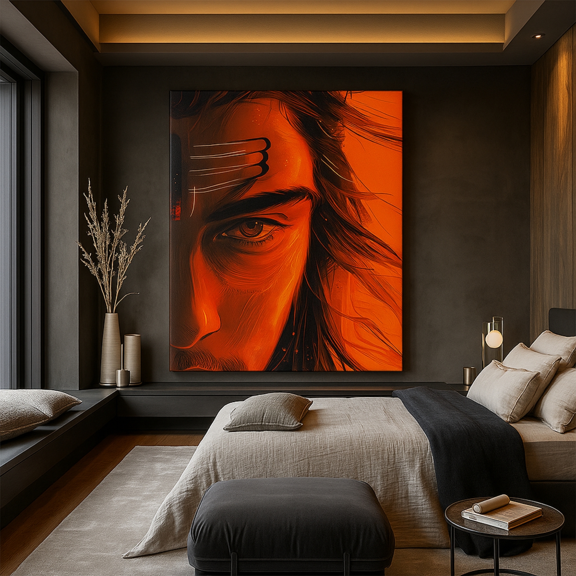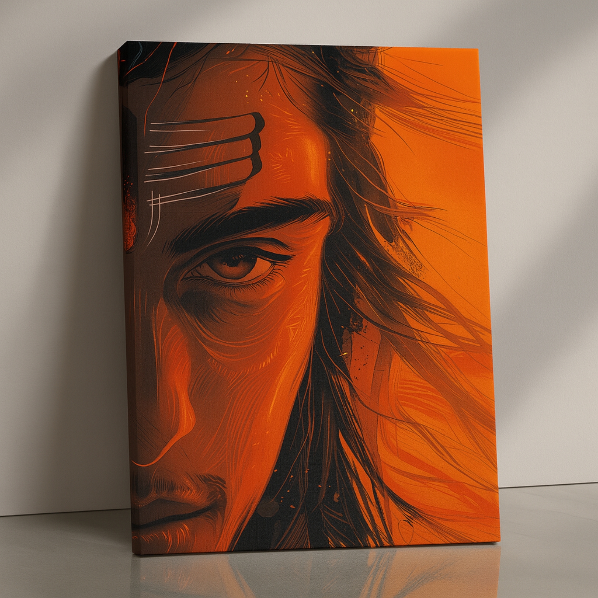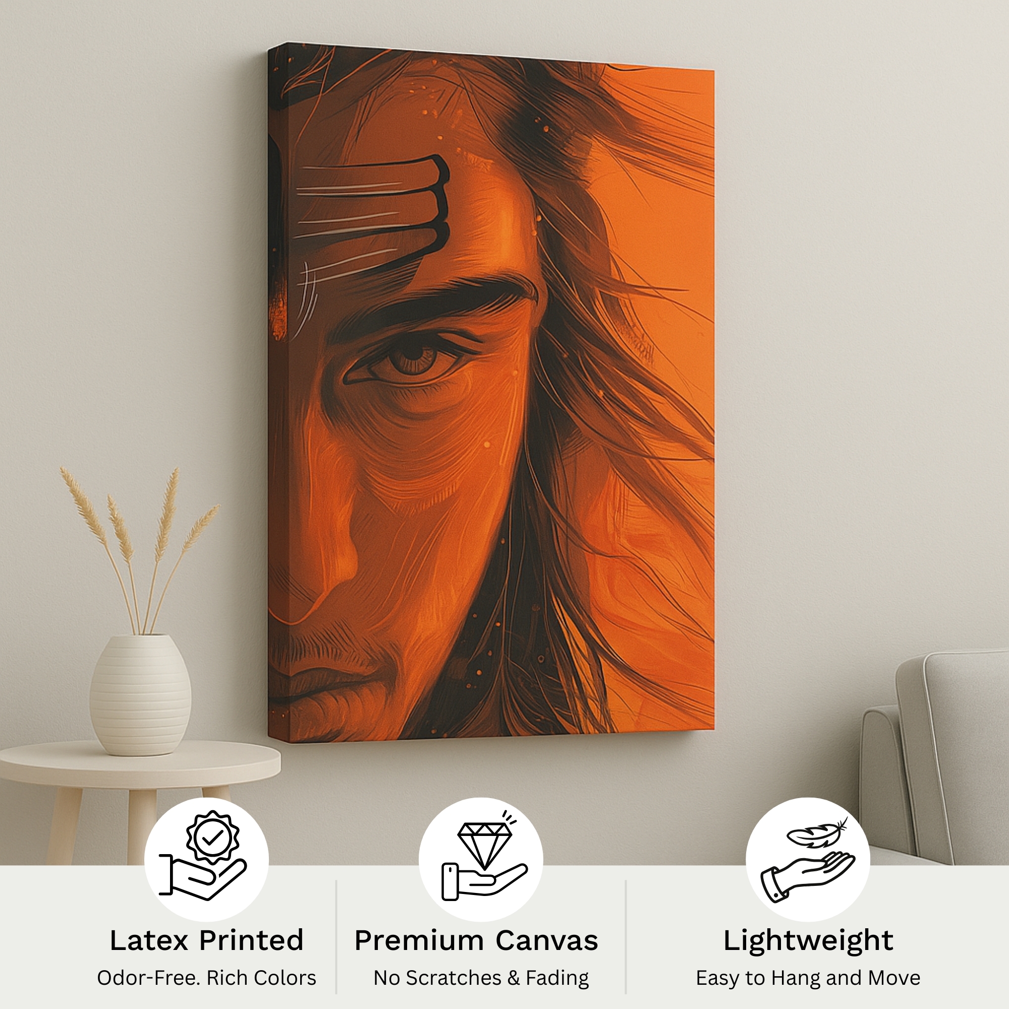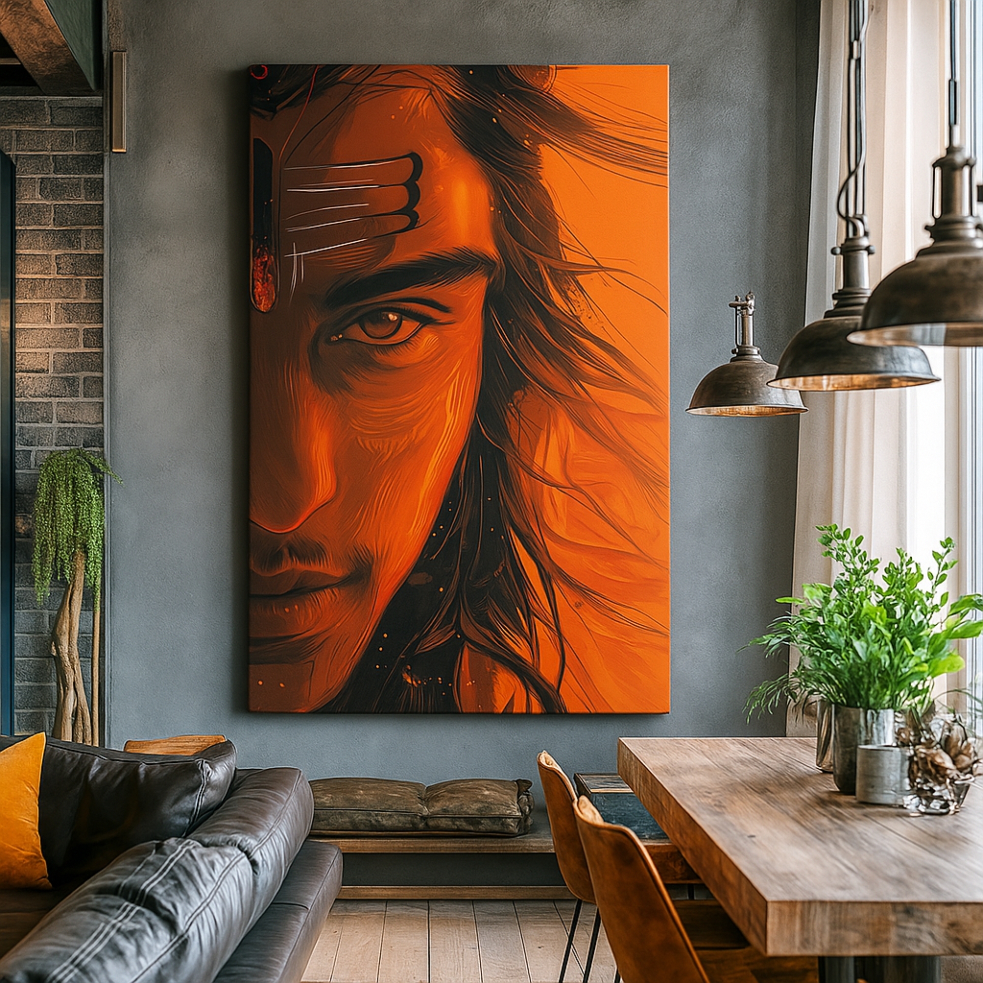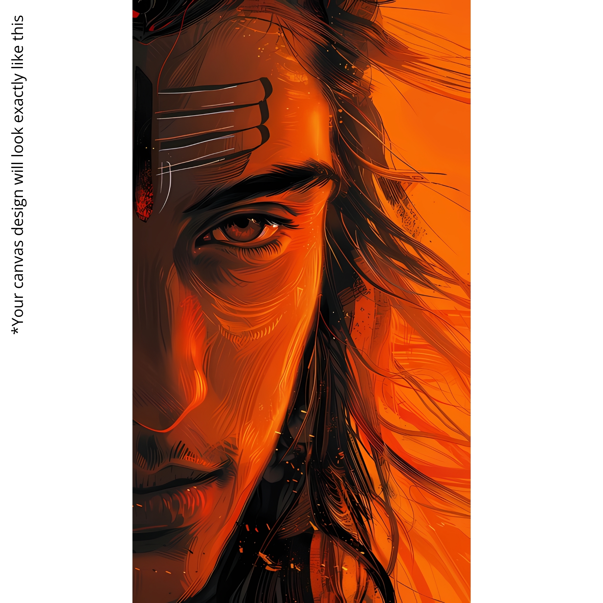 Fiery Vision Shiva Canvas Print commands attention with divine intensity. A close-up of Lord Shiva’s glowing fiery eye symbolizes cosmic fire, insight, and unwavering focus. This bold artwork radiates energy and devotion, making it a powerful addition to yoga studios, meditation spaces, or homes seeking spiritual dynamism.