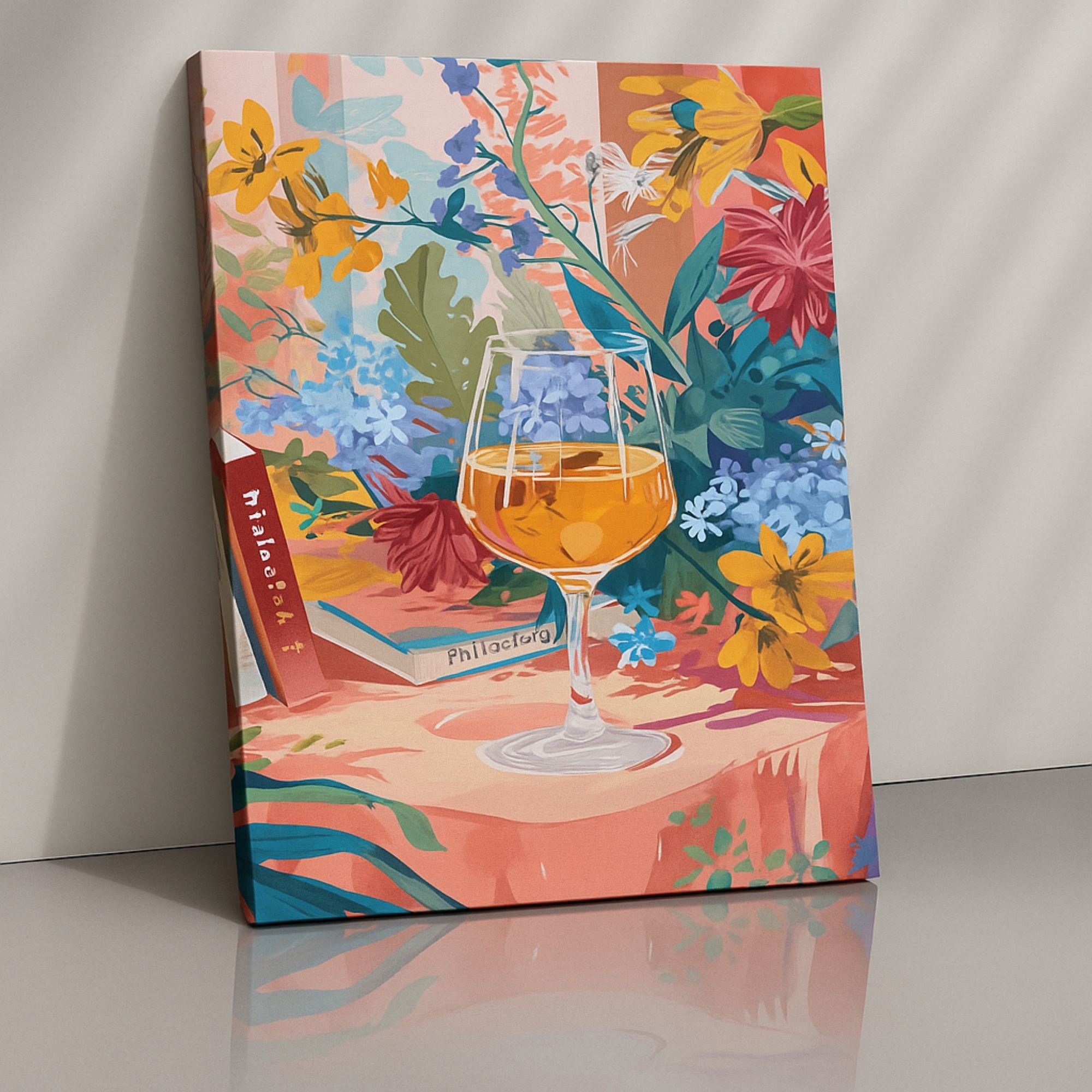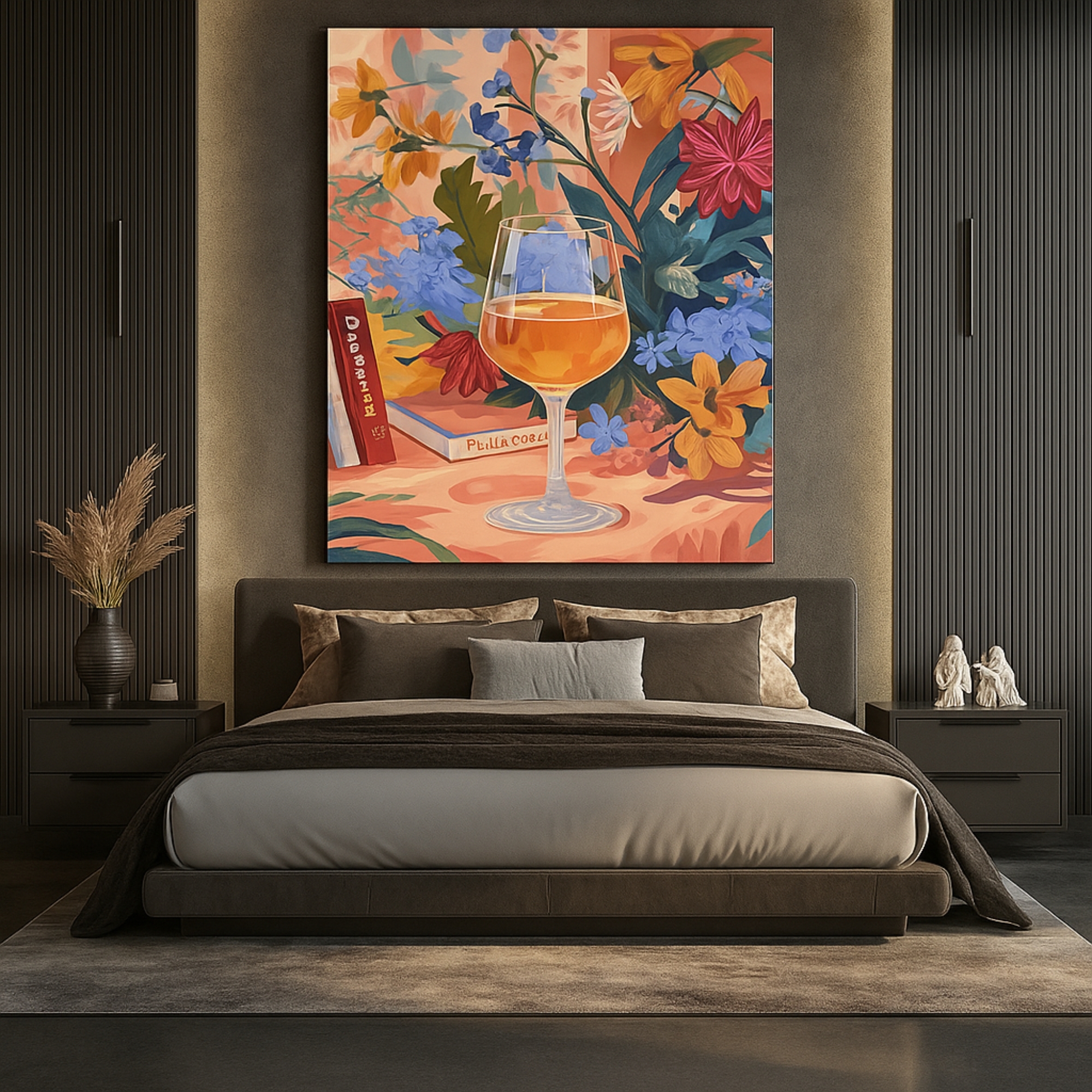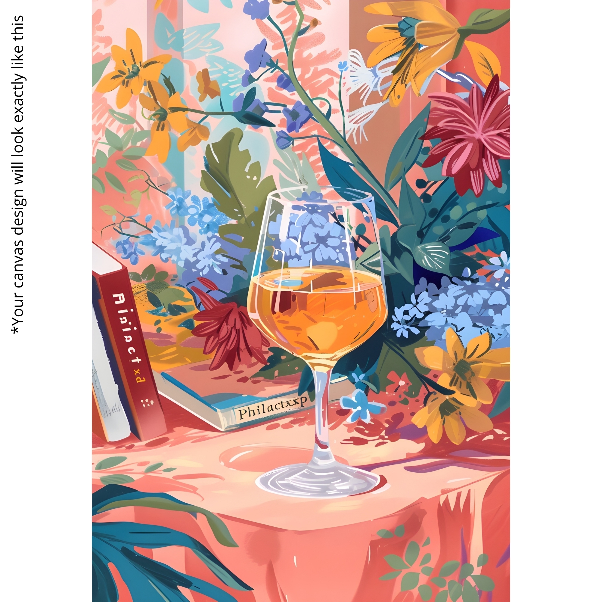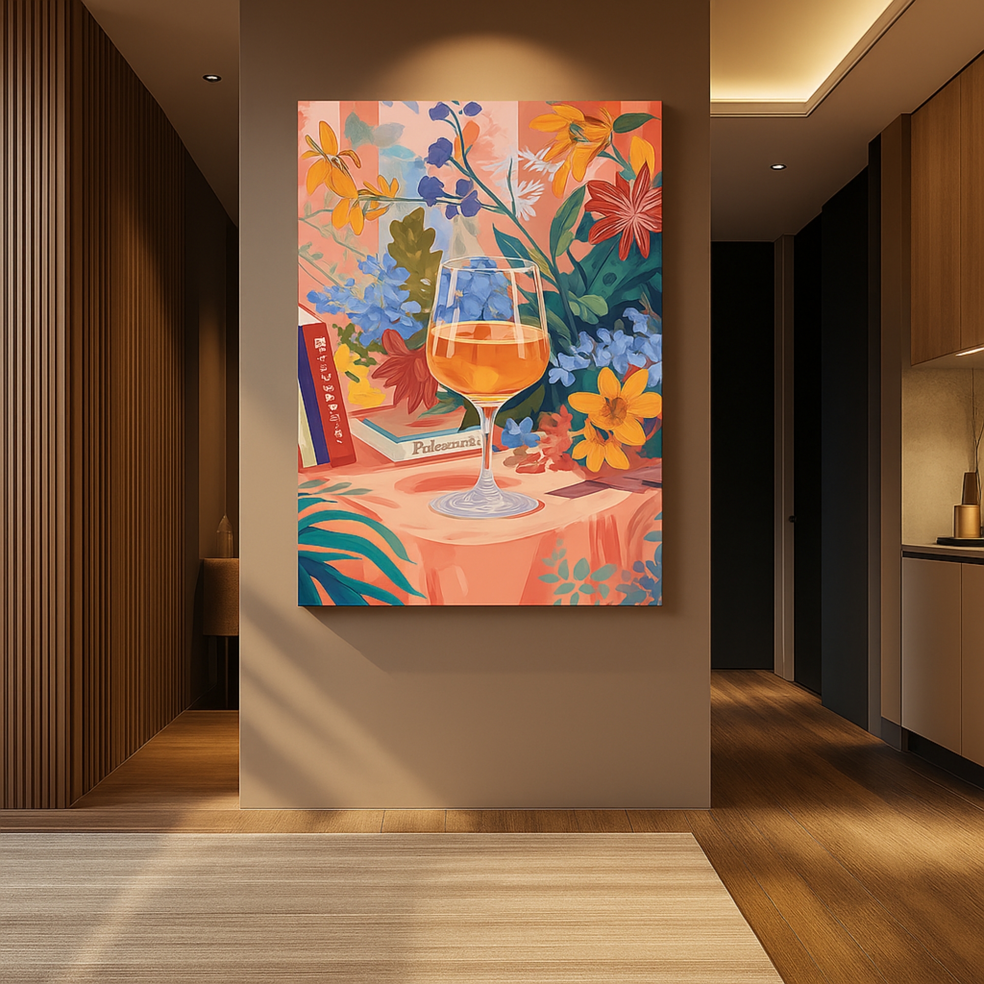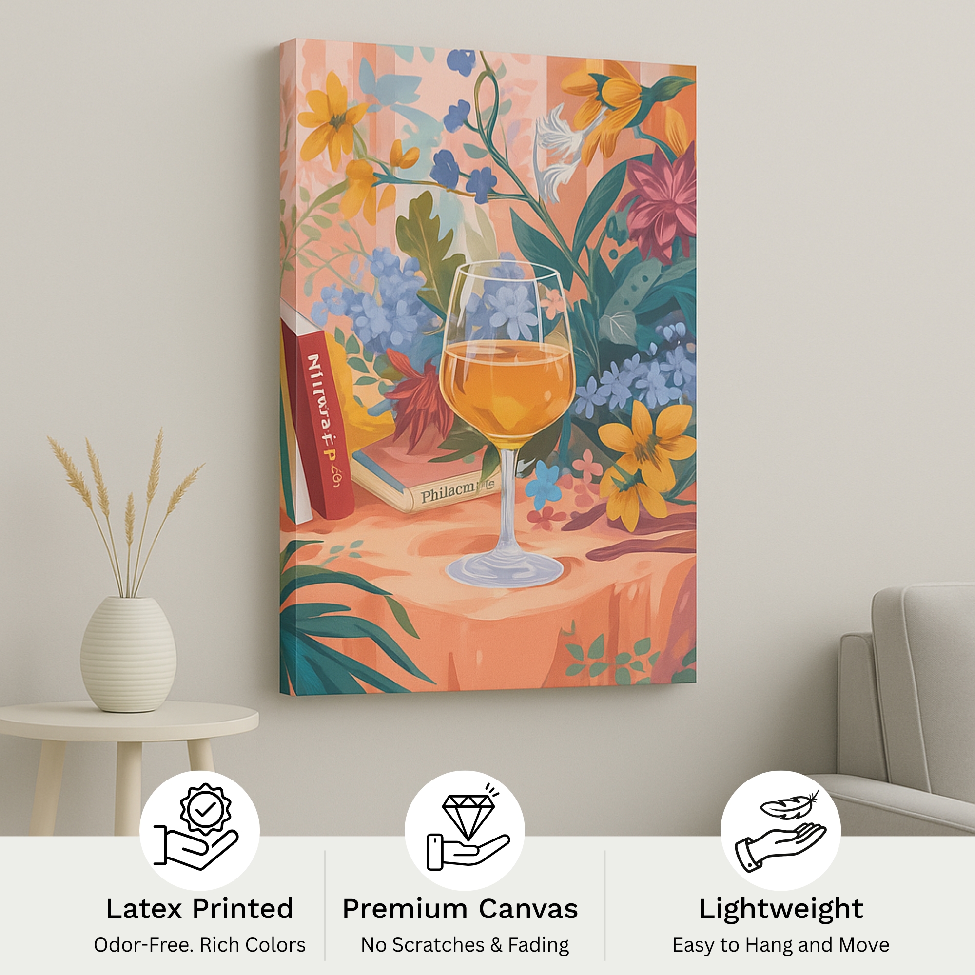 Sip elegance with the Canvas Print of Garden Harmony. A delicate wine glass sits among colorful blooms, creating a serene mix of florals and lifestyle charm. This artwork is perfect for boho, cottage core, or romantic interiors that embrace calm beauty.