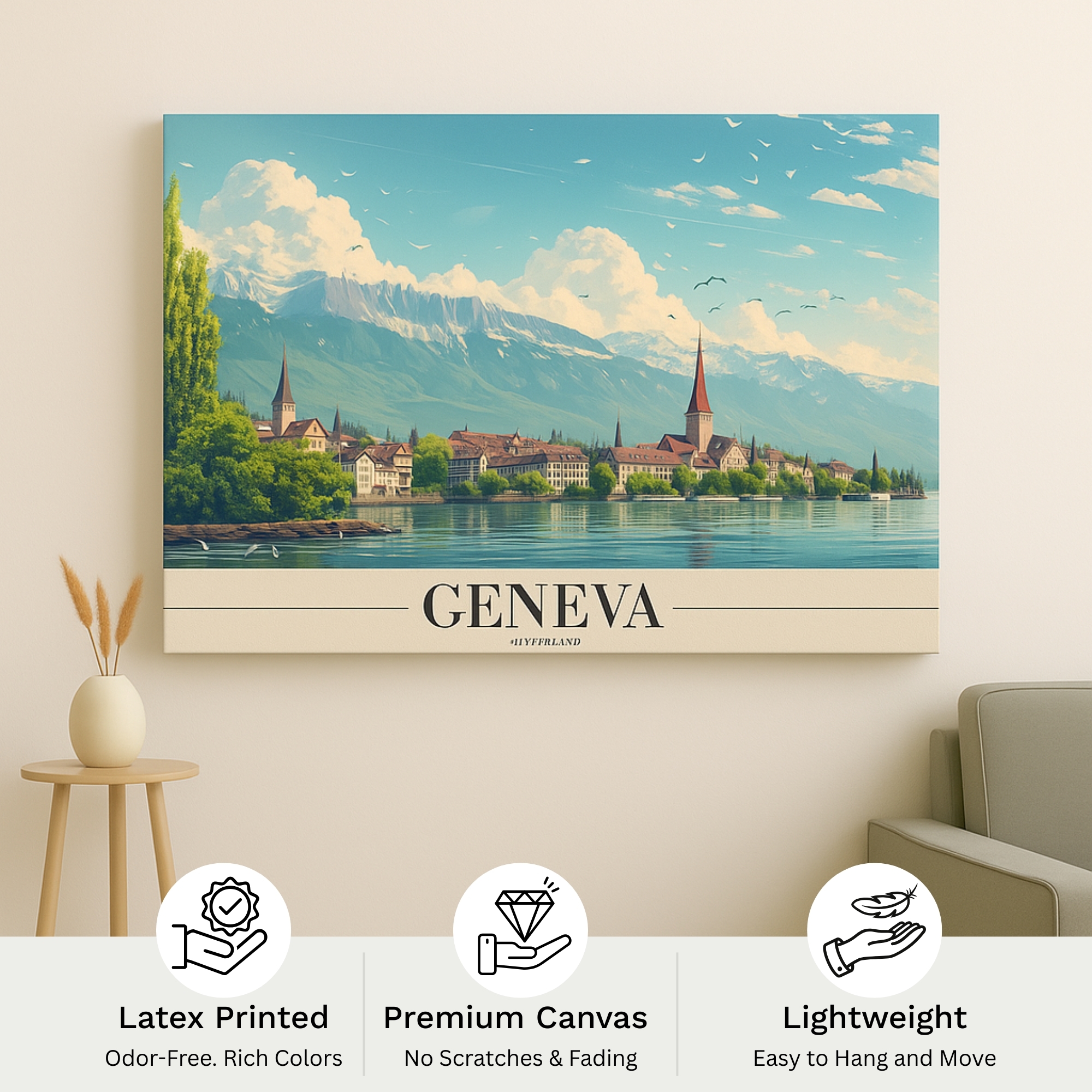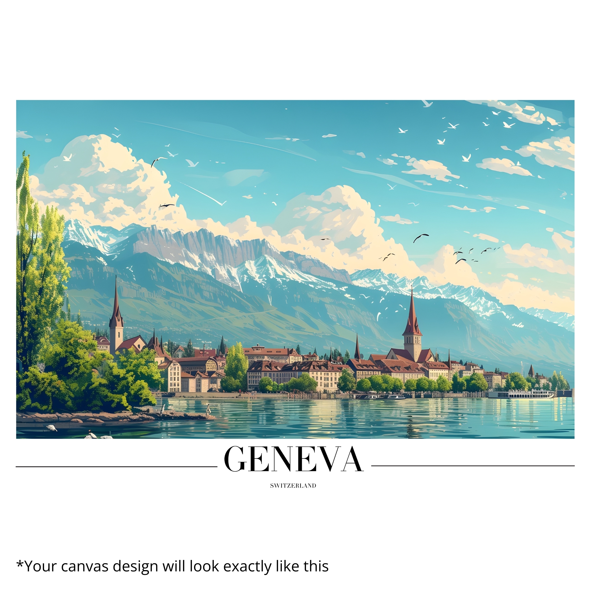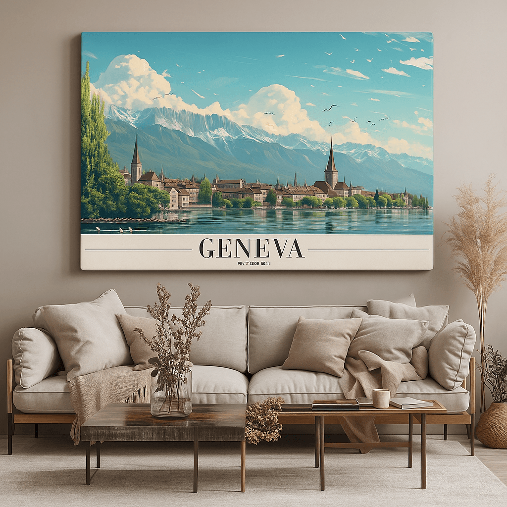 Canvas Print inspired by Geneva captures the serene harmony between alpine landscapes, calm lake waters, and historic European architecture. This artwork reflects refined travel elegance, blending soft blues, lush greens, and timeless city elements that bring depth and tranquility to your space. Designed to evoke peace and sophistication, it instantly elevates interiors with a relaxed yet cultured aesthetic. Ideal for modern homes, offices, lounges, or travel-themed decor, it works beautifully as a focal wall piece or part of a curated gallery wall.