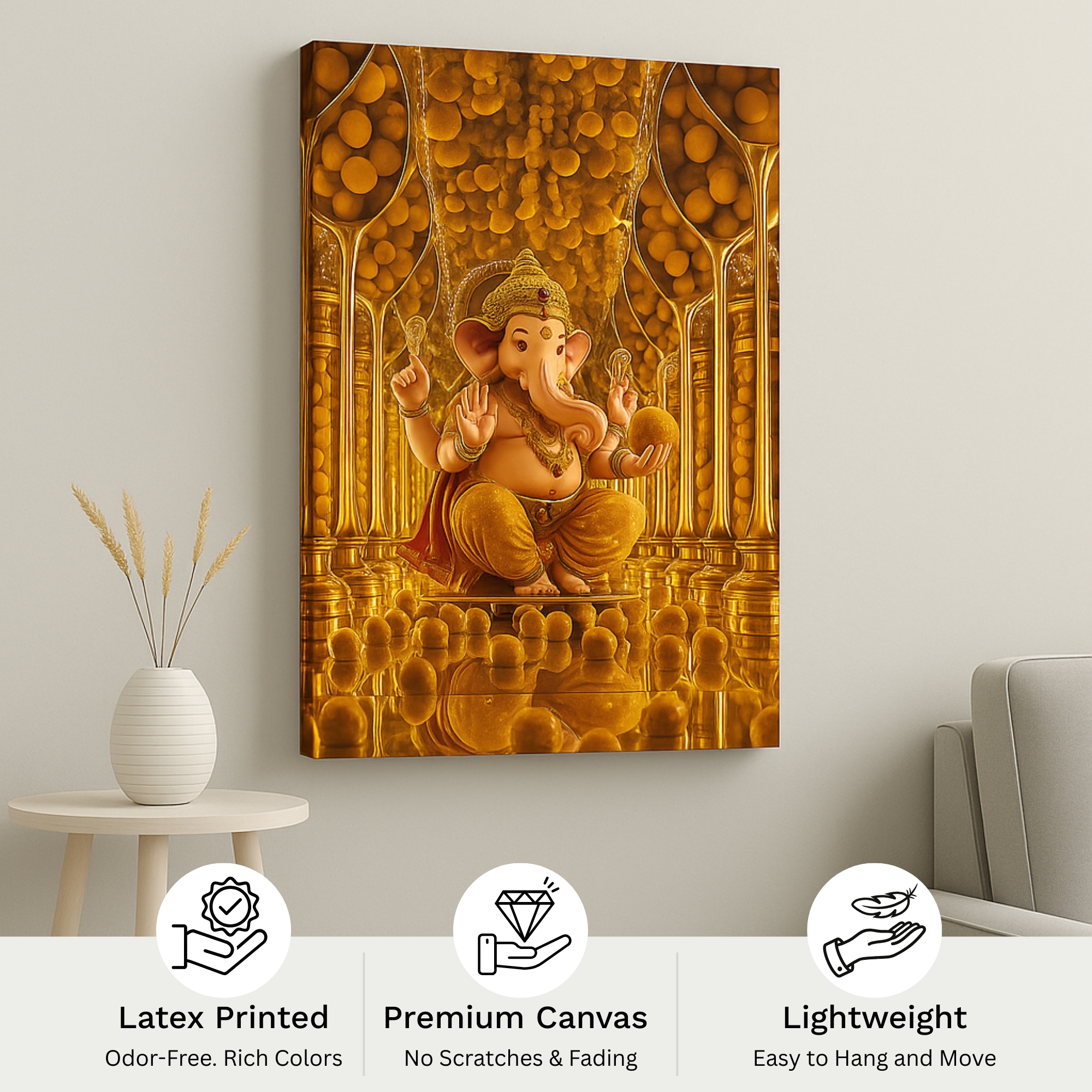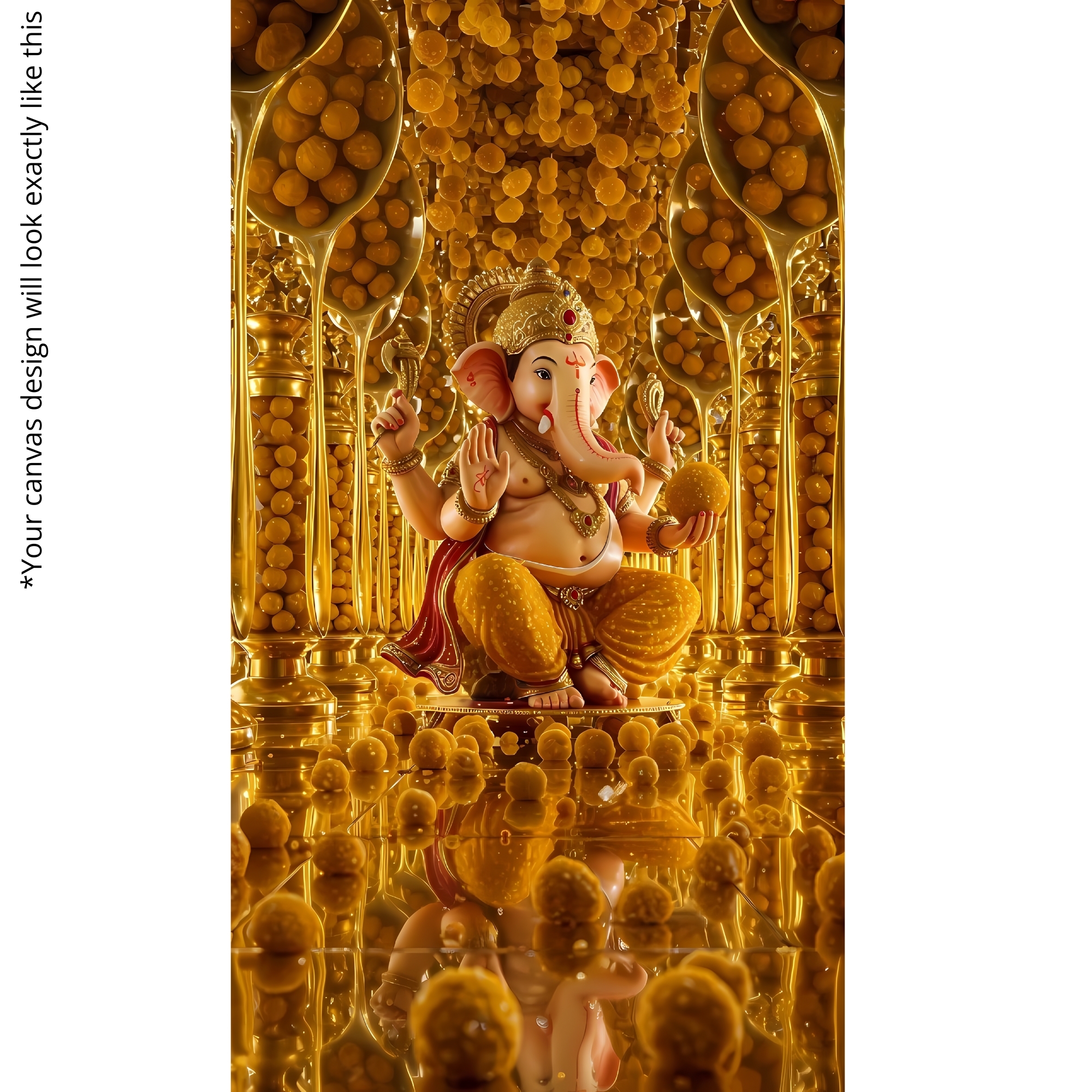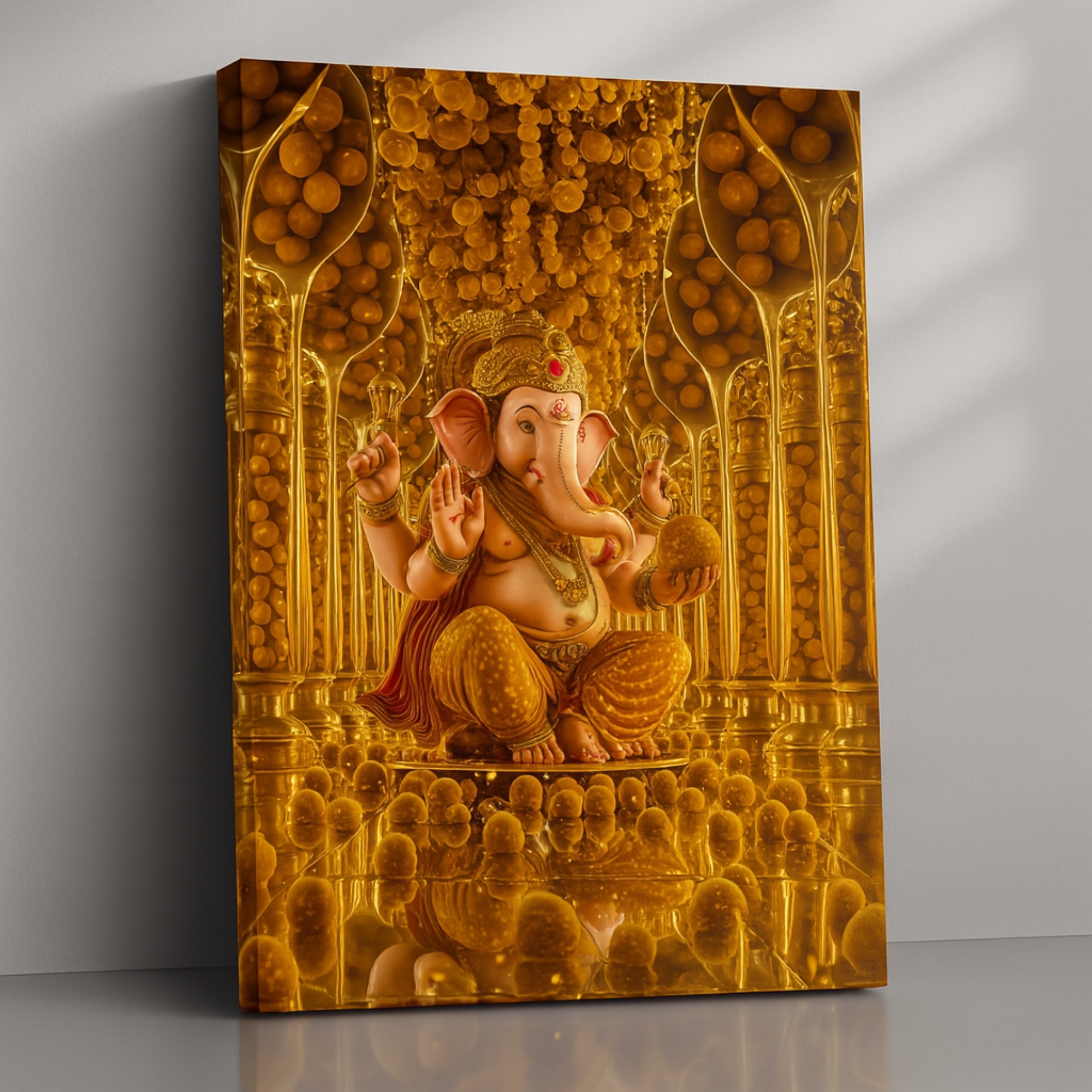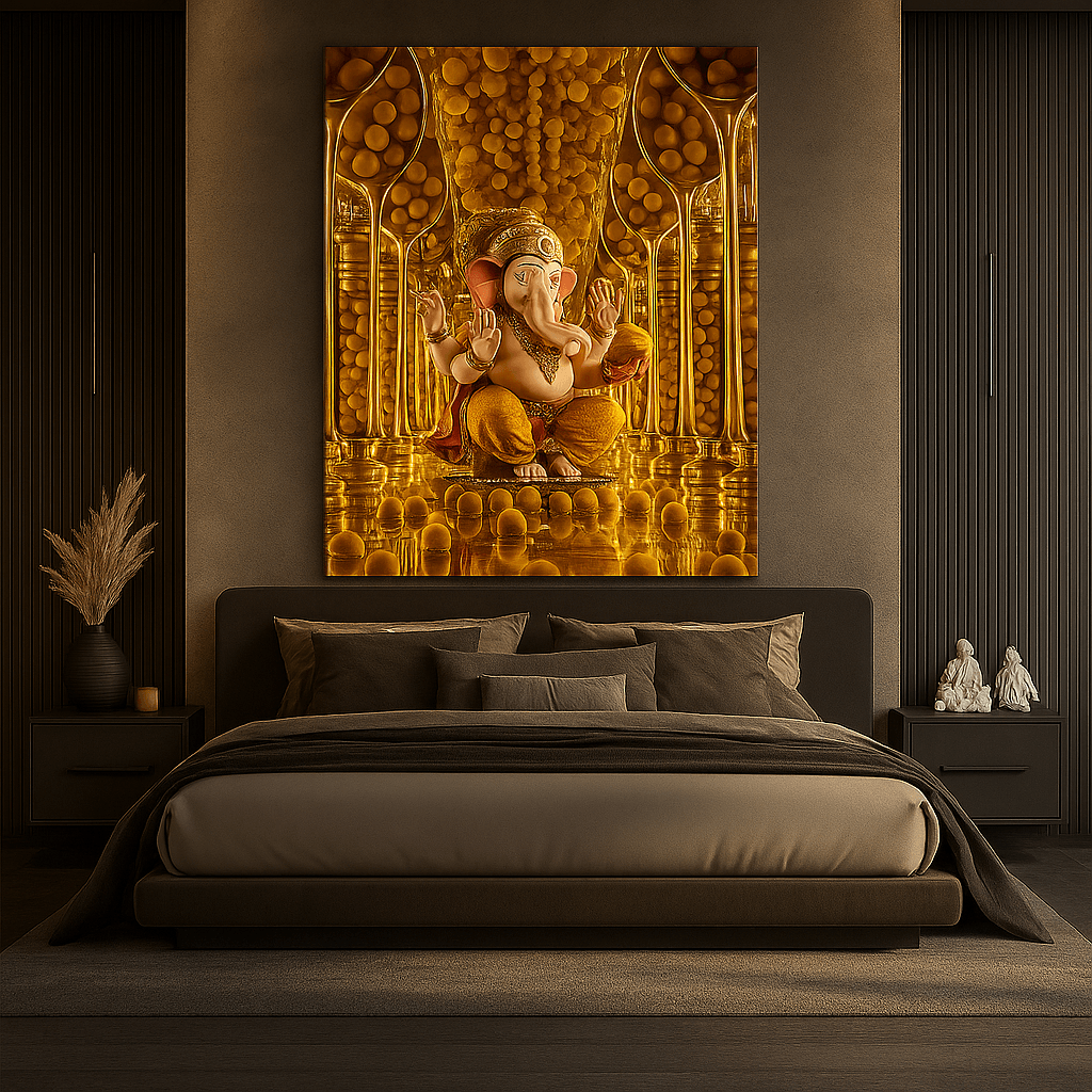 Golden Laddoo Reverence Ganesha Canvas Print captures joy, abundance, and prosperity. Lord Ganesha is surrounded by golden laddoos, symbolizing celebration, devotion, and fulfillment. This cheerful artwork brightens kitchens, sweet shops, and devotional homes, serving as a symbol of sweetness in life and divine blessings.