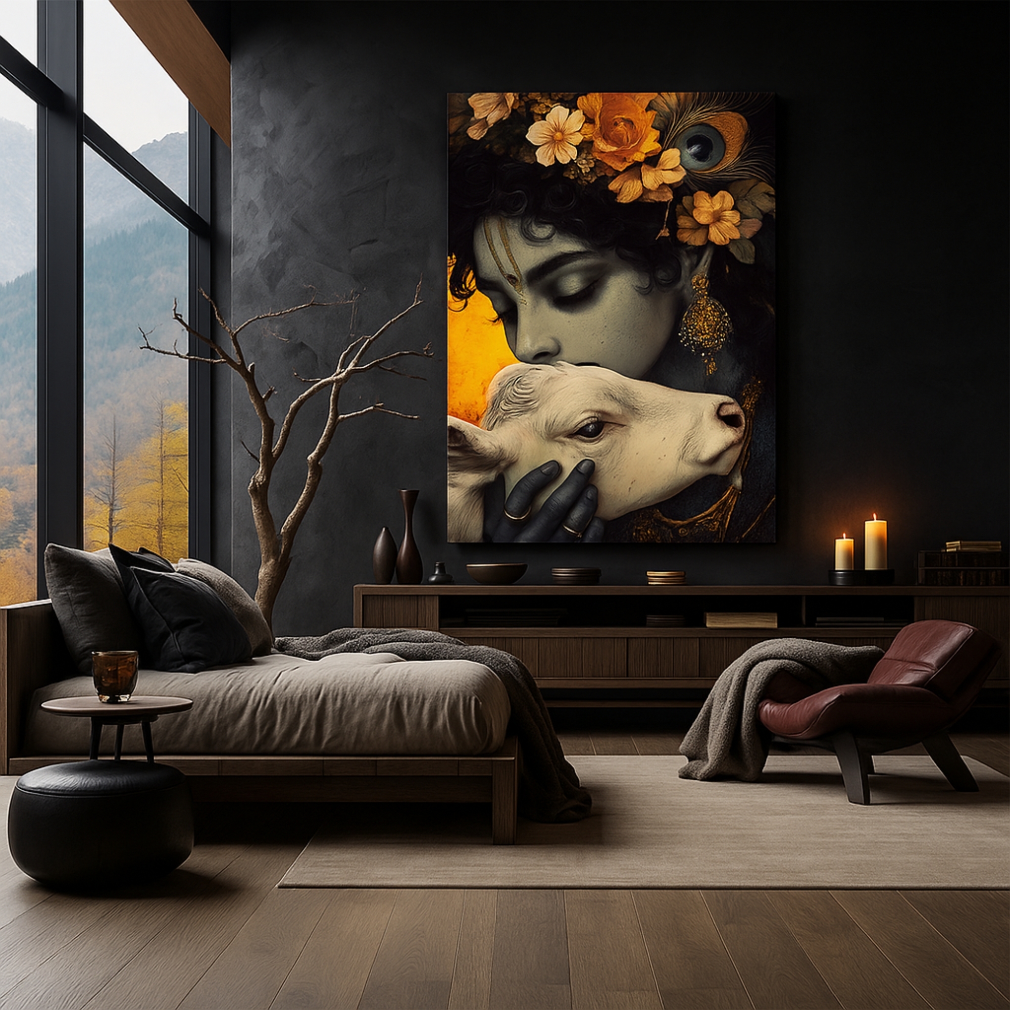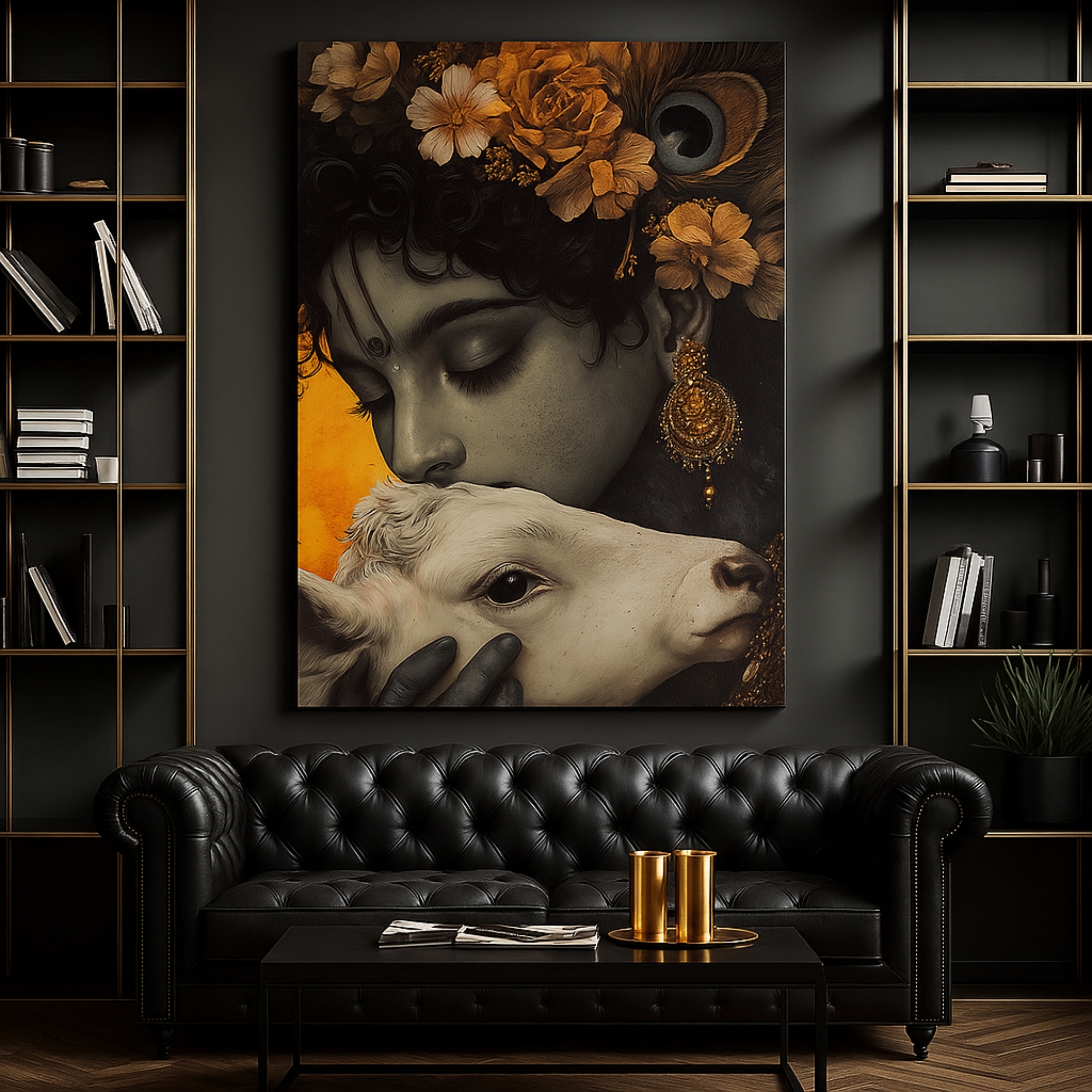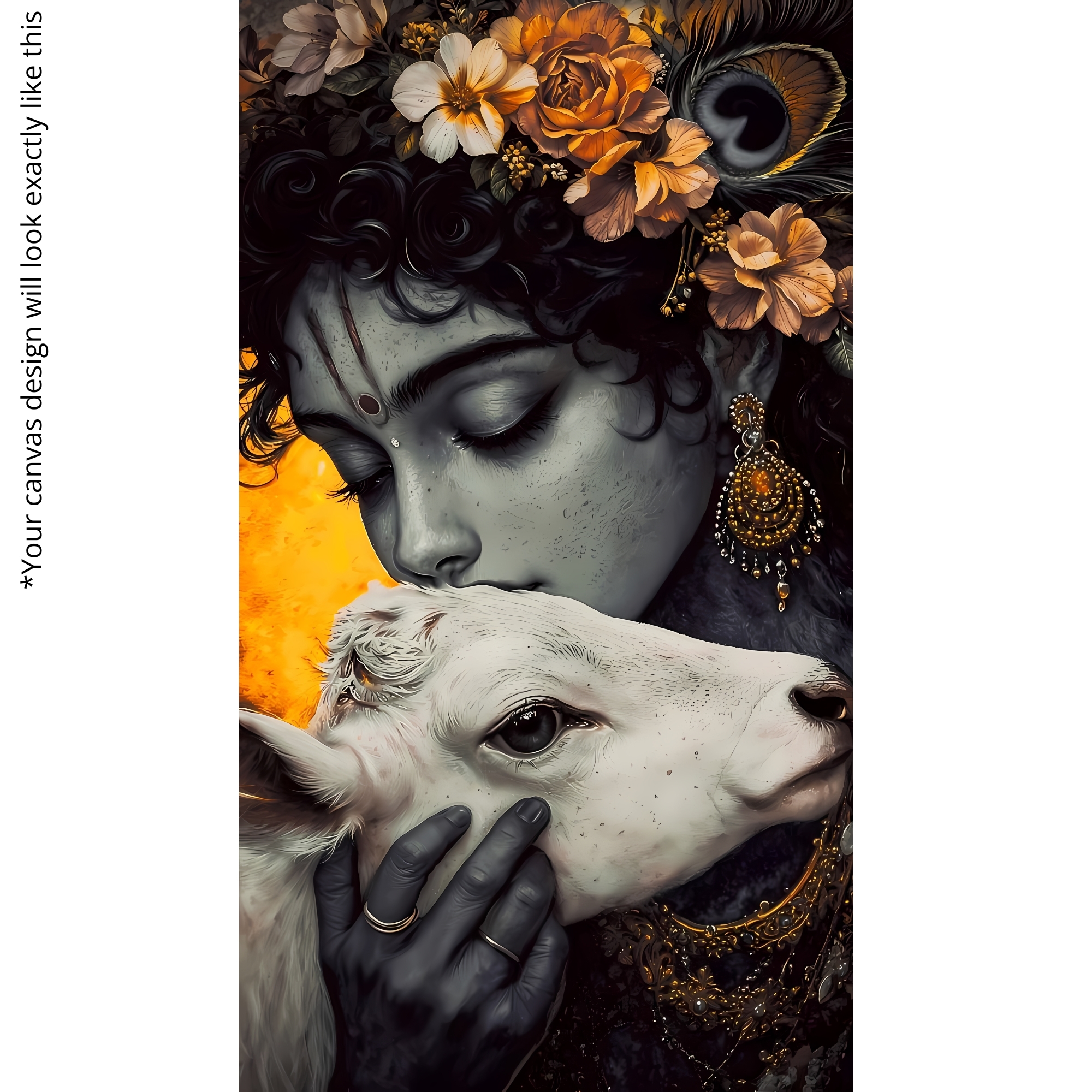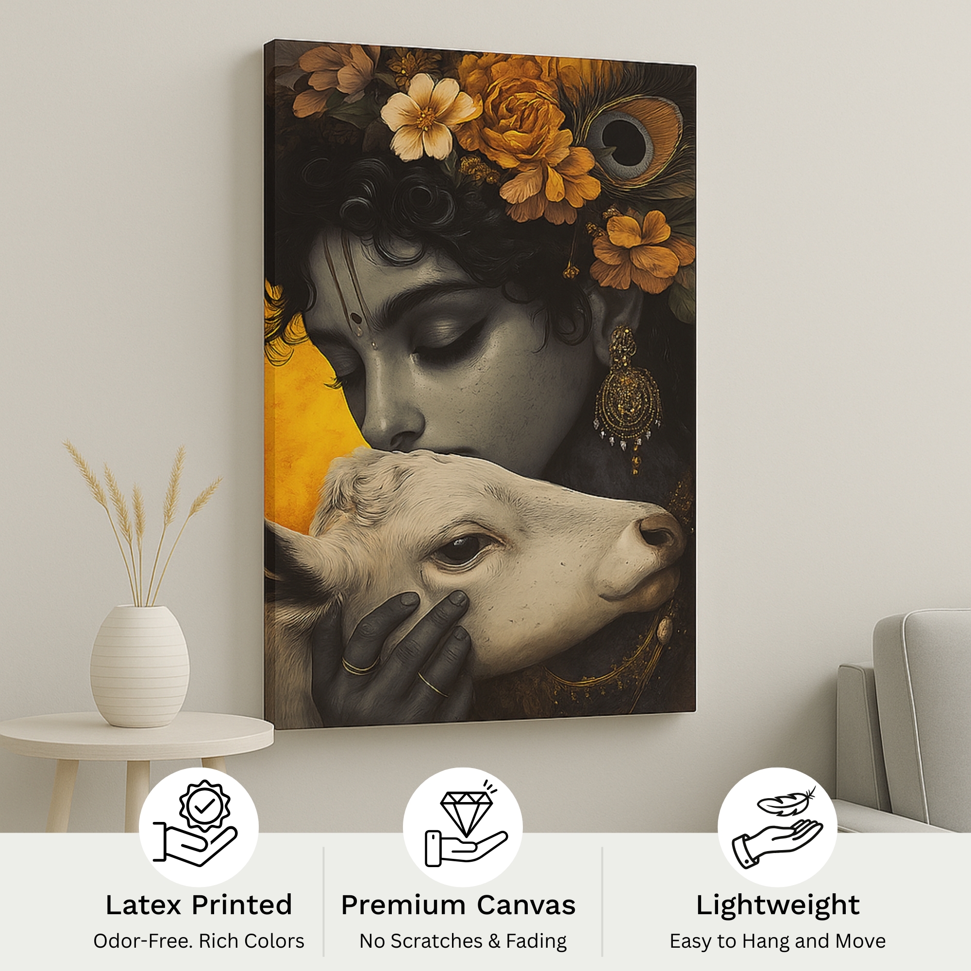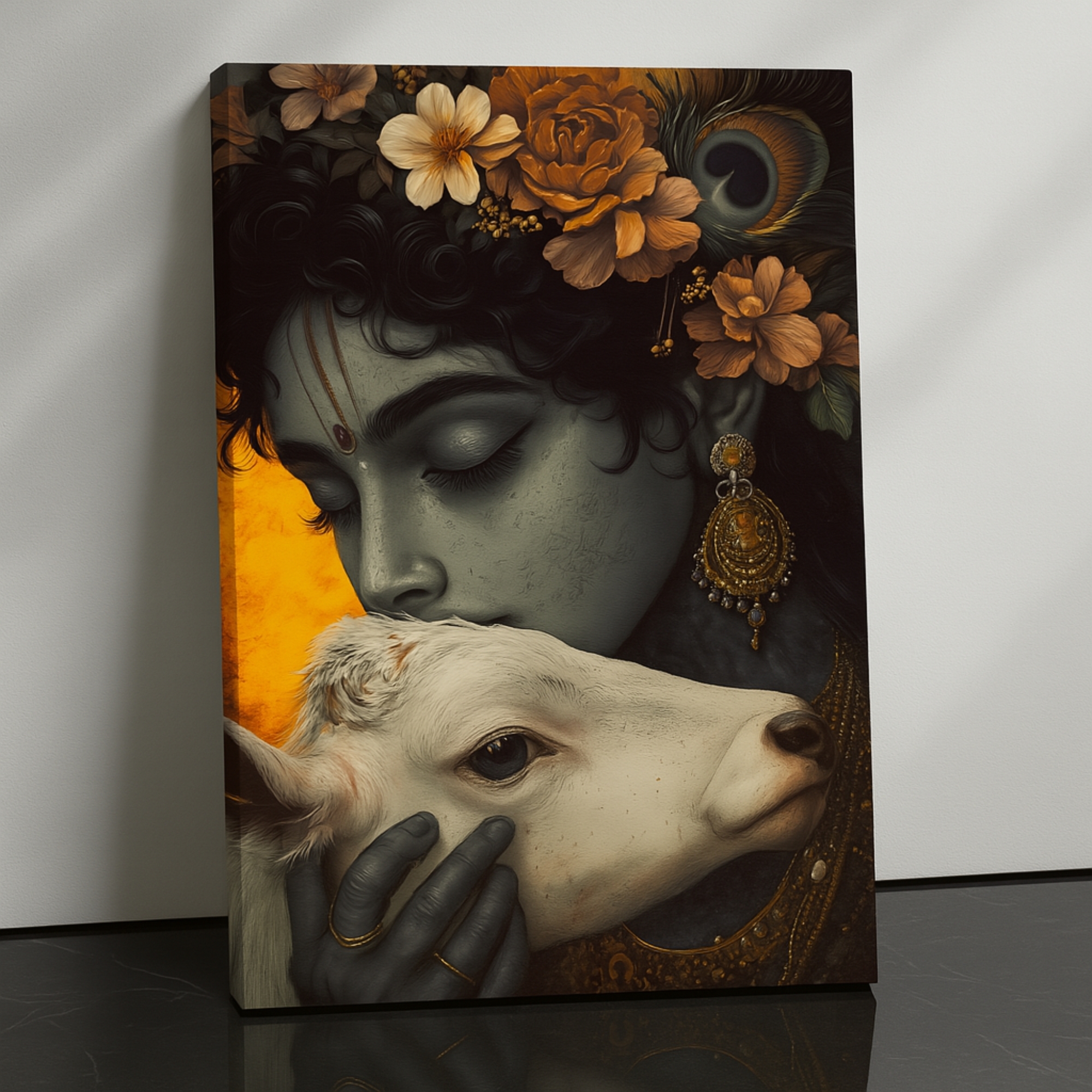 Golden Reverie Krishna Canvas Print beautifully depicts Lord Krishna gently kissing a calf, symbolizing compassion, devotion, and divine affection. Set against a regal golden backdrop with earthy floral details, this artwork radiates warmth and spiritual elegance. Its harmonious tones make it perfect for sacred spaces, prayer corners, or gifting on festive occasions.
