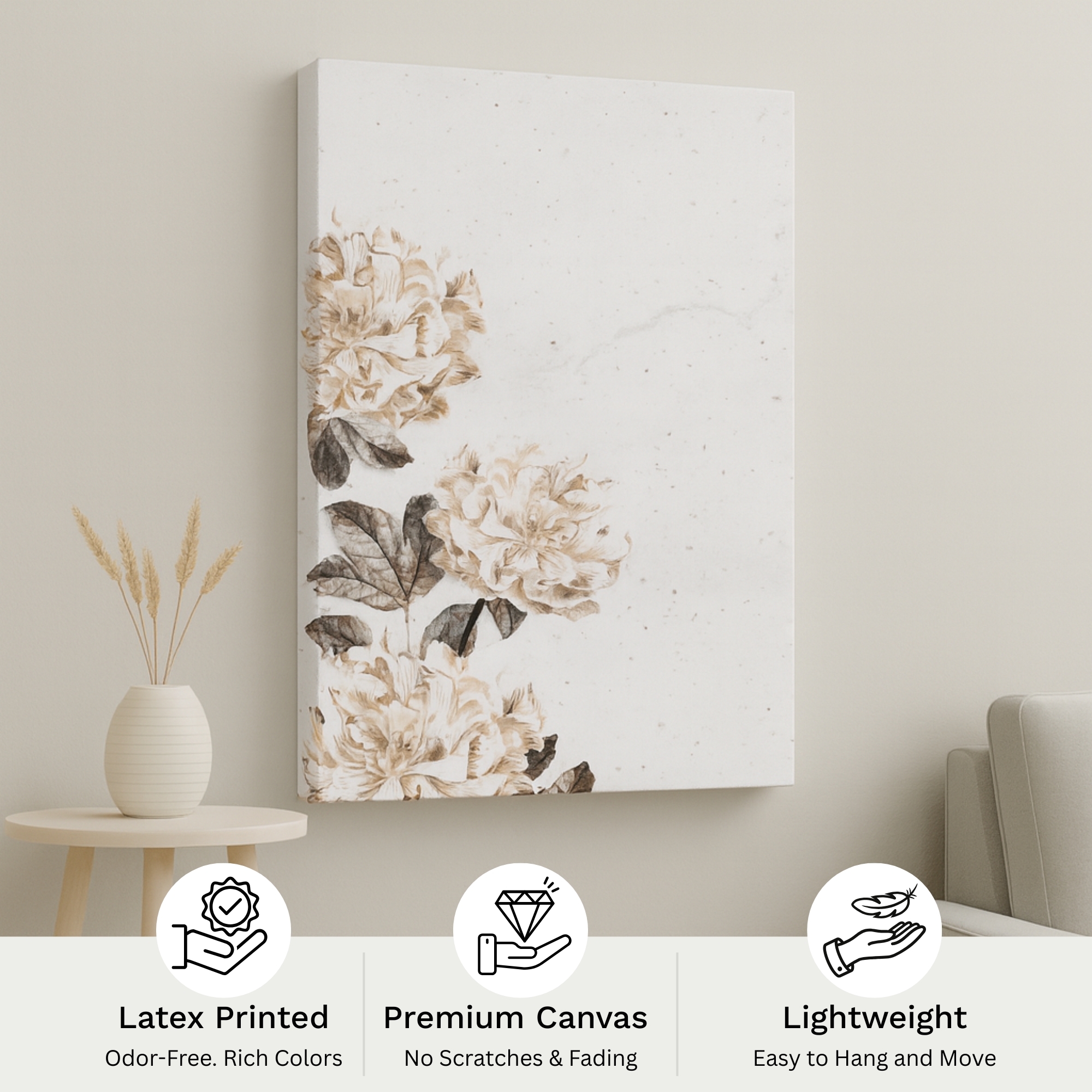 Because of its neutral elegance, this floral canvas wall art suits bedrooms, living rooms, and refined interiors. In addition, it makes a graceful gift for weddings and anniversaries.