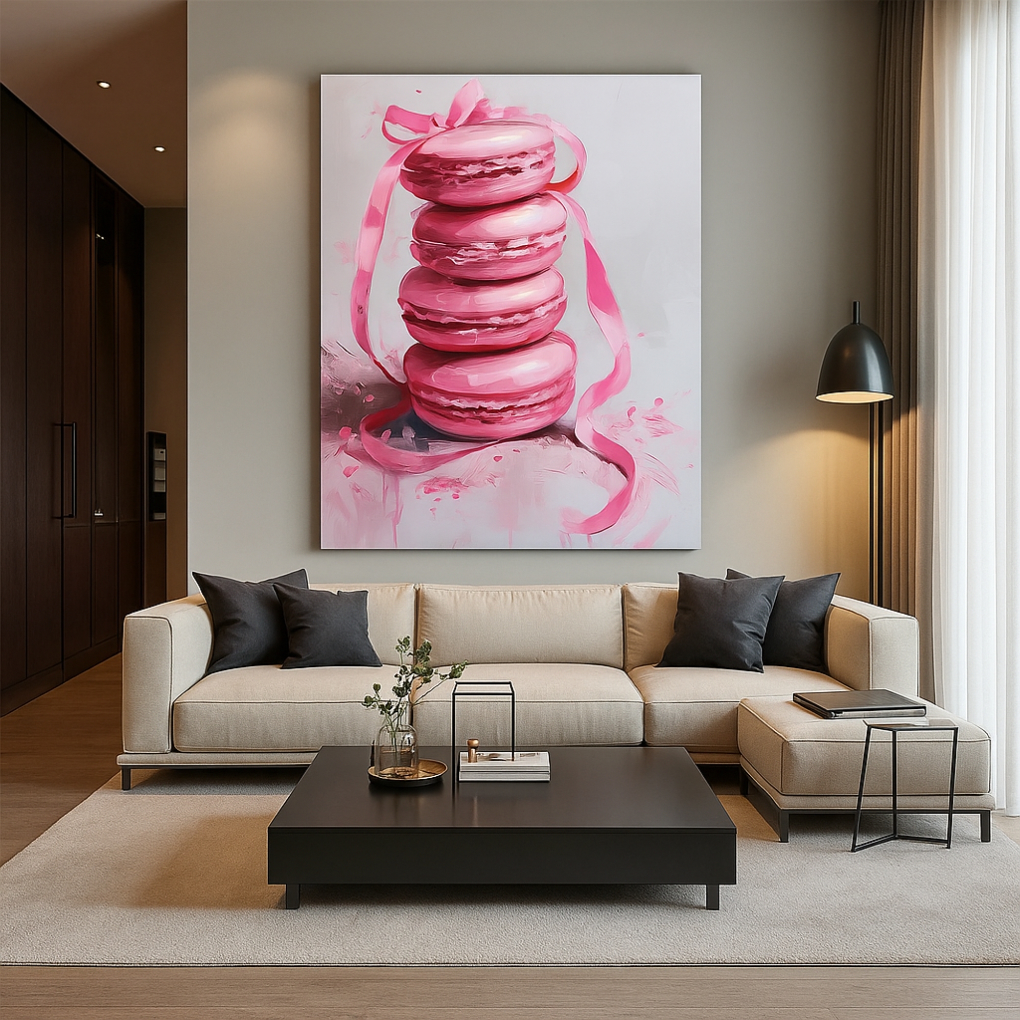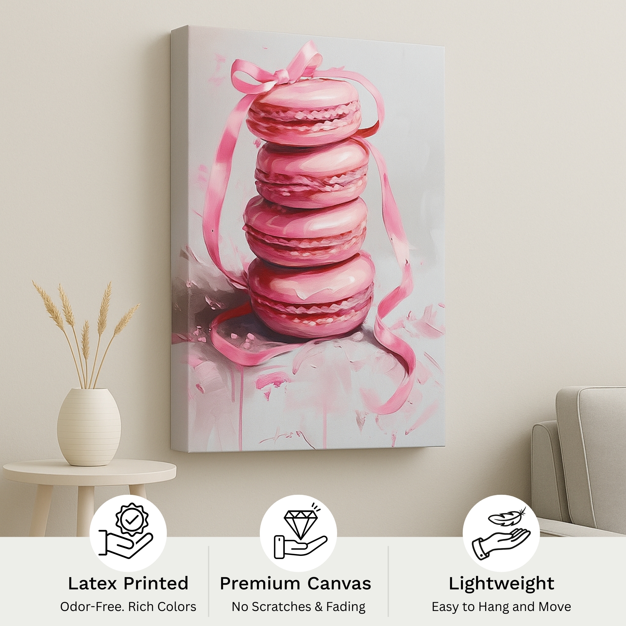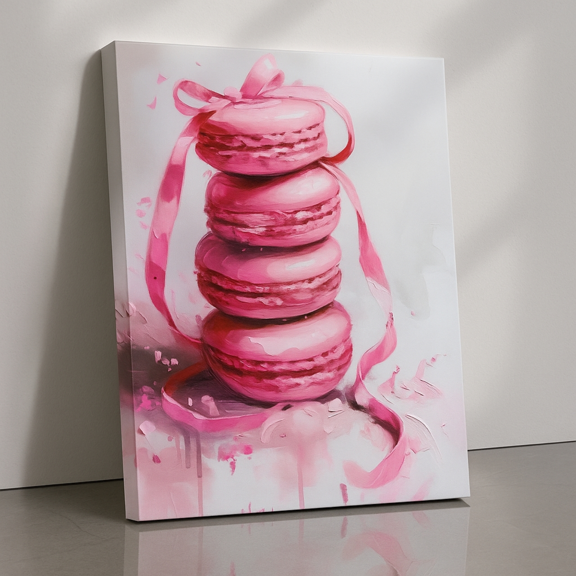 Satisfy your sweet side with the Canvas Print of Macaron Drizzle. Featuring a playful ribbon-tied stack of pink macarons, this dessert-inspired pop art brings chic whimsy to kitchens, cafés, and bakeries. With soft pastel hues and delicate detail, it brightens interiors with lighthearted charm and appetite appeal.