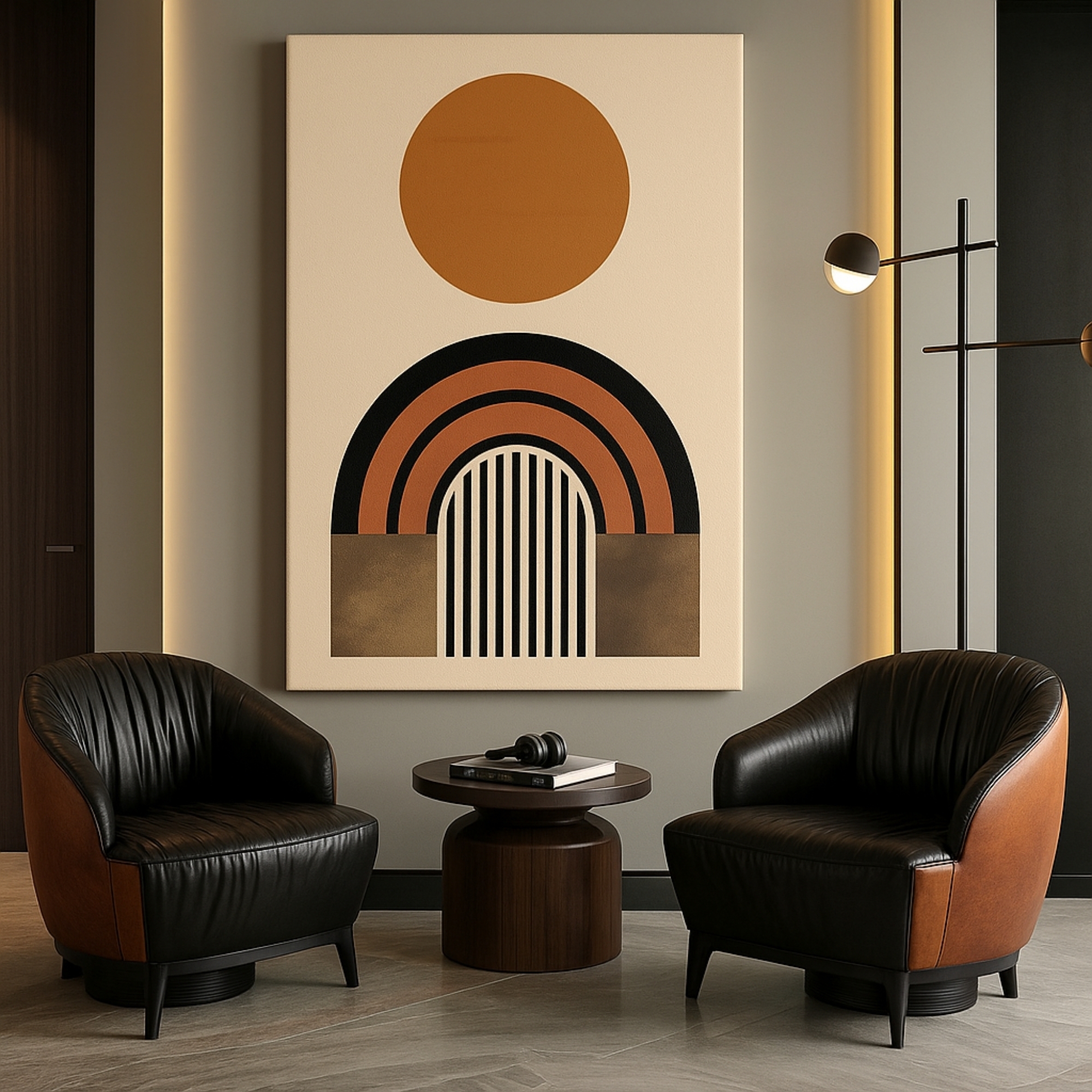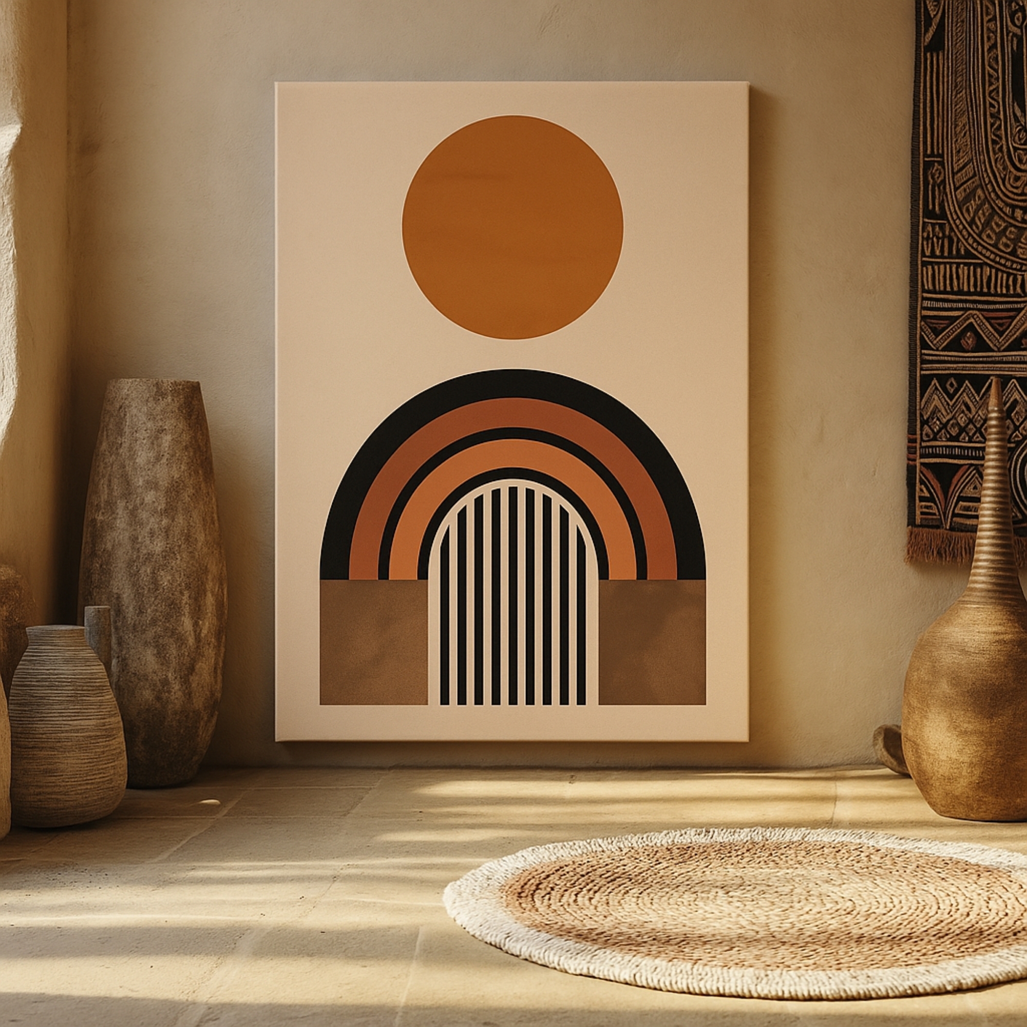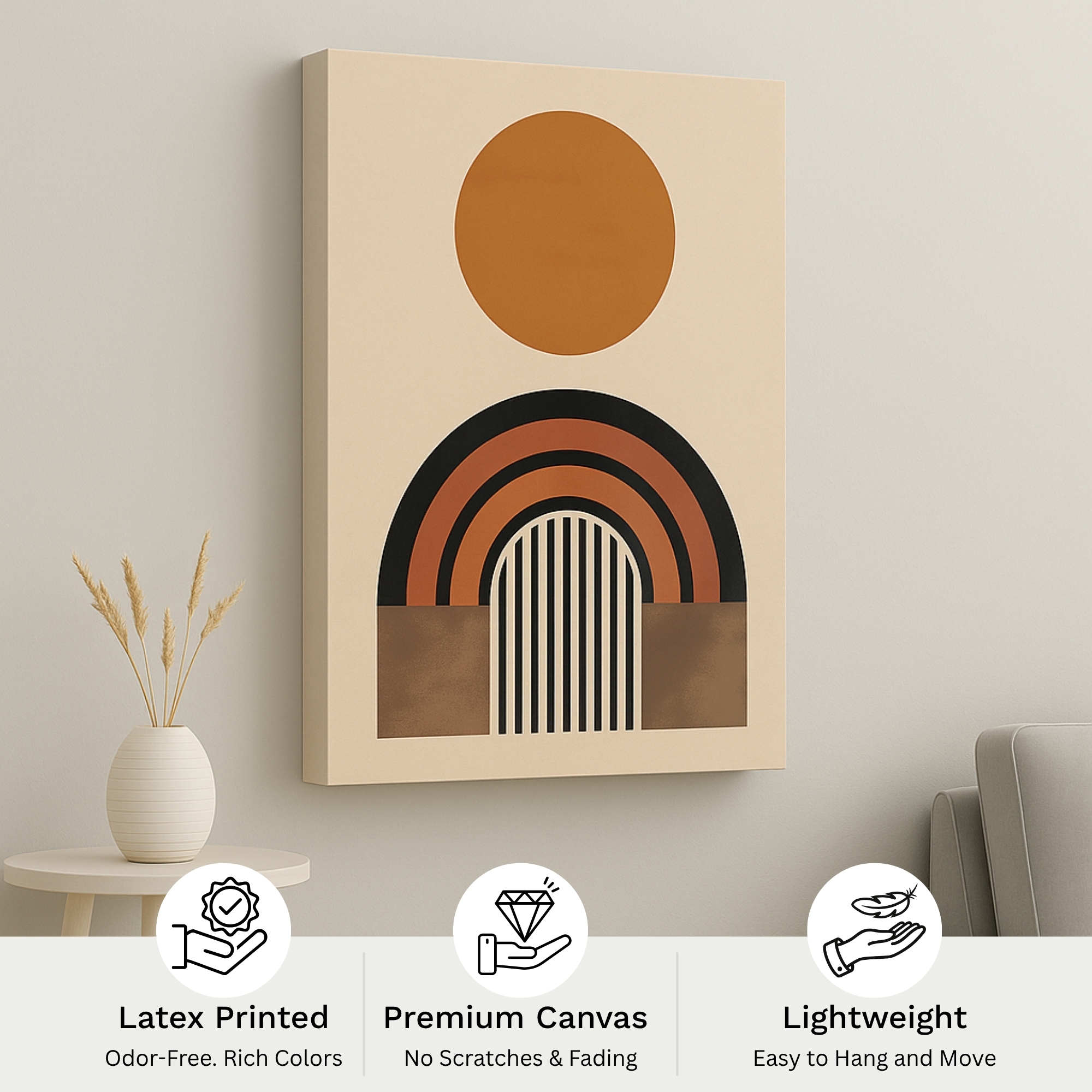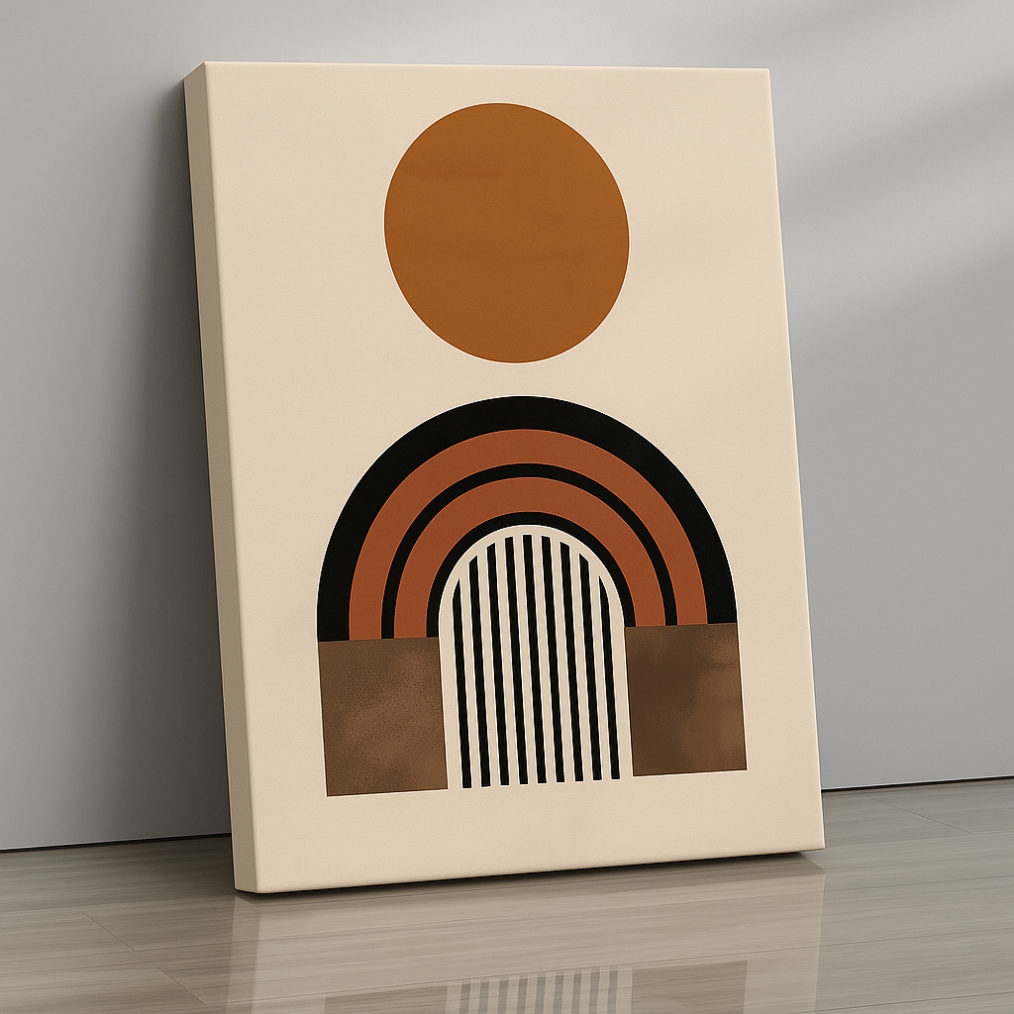 Capture celestial calm with the Minimal Eclipse Canvas Print. A textured black circle rises above a terracotta arch, creating a refined eclipse effect in minimalist geometric style. With its earthy palette and simple yet dramatic form, it’s a versatile piece for homes that embrace clean design.