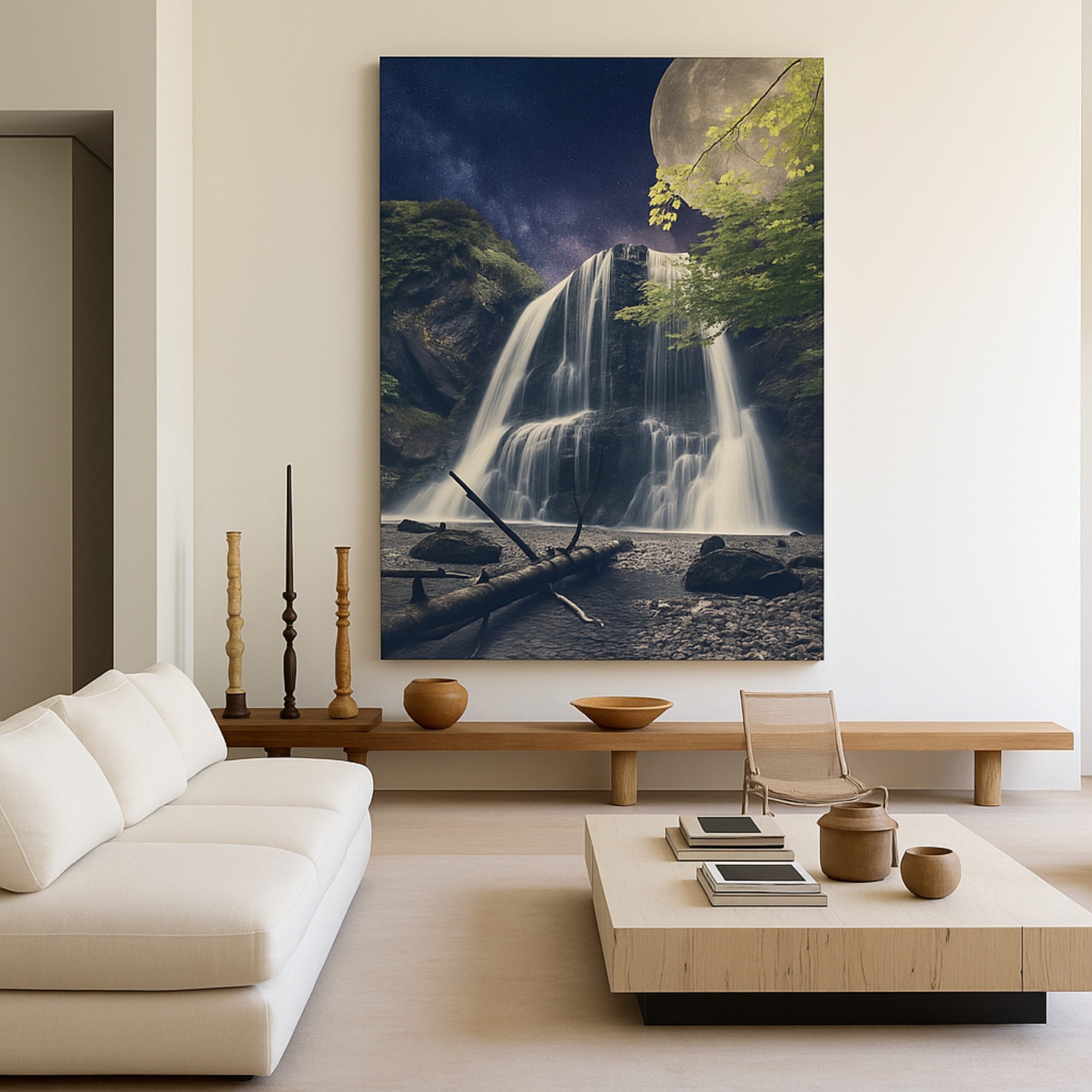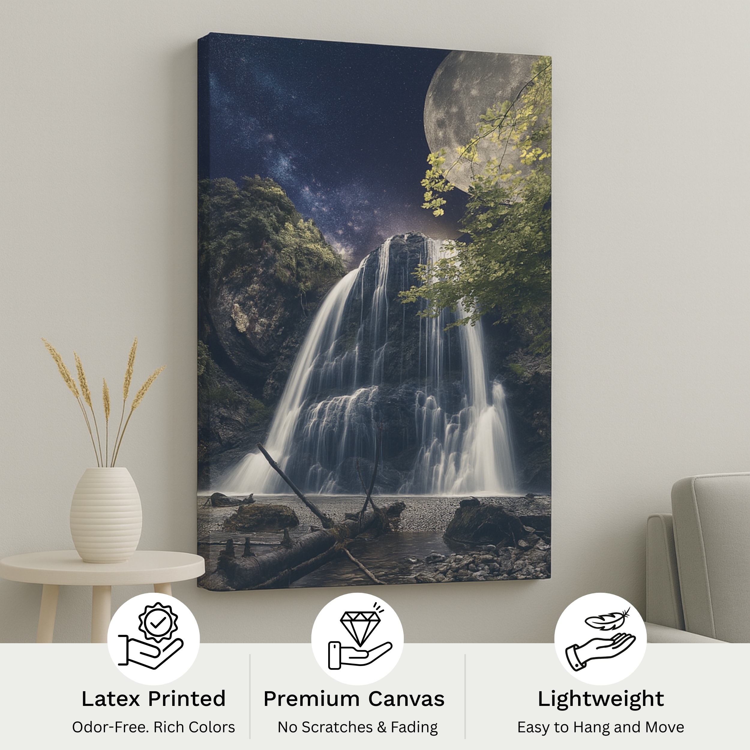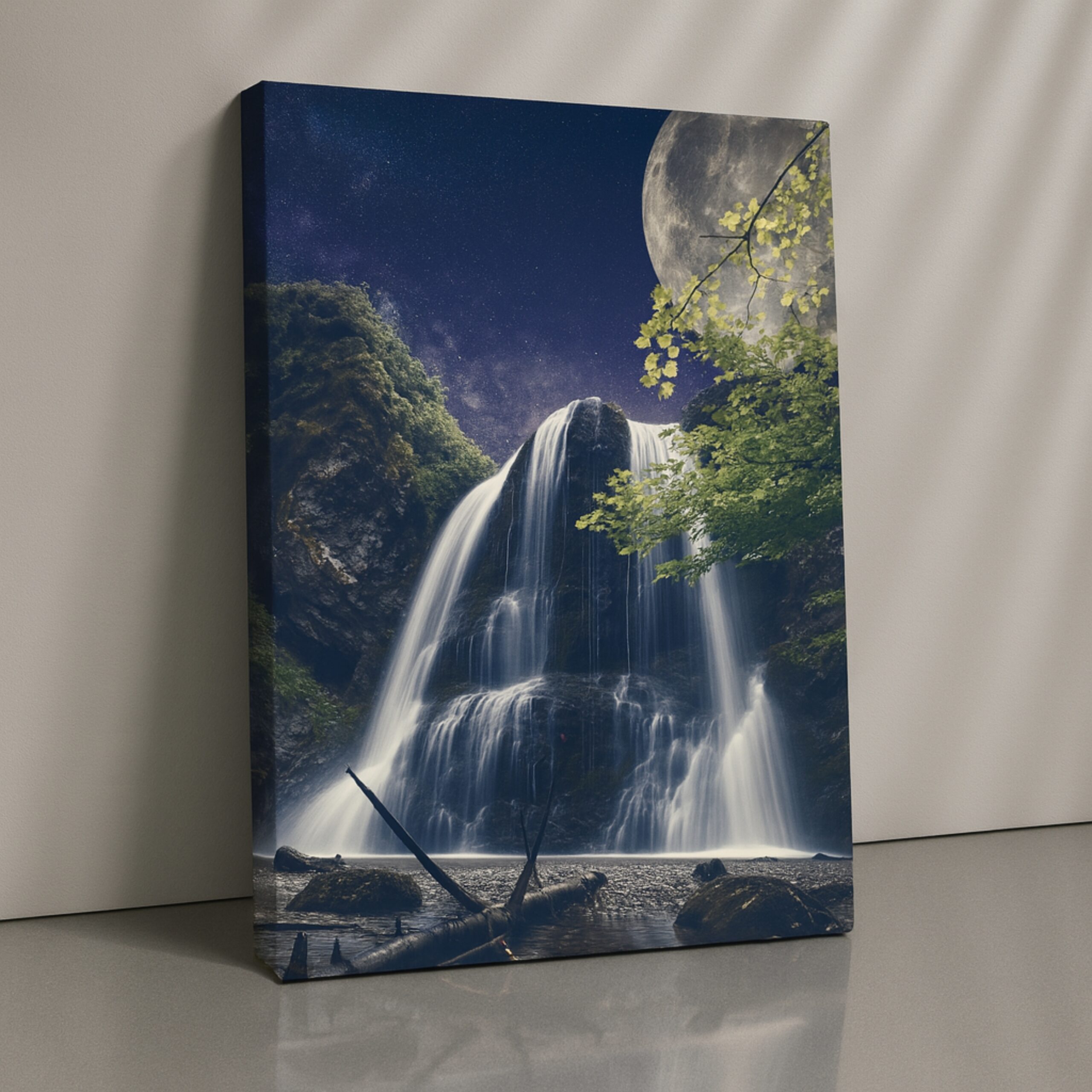 Awaken wonder with the Canvas Print of Moonlit Falls. This dreamy artwork features cascading waterfalls illuminated under a glowing full moon, merging celestial wonder with natural elegance. A piece that inspires awe, romance, and tranquility in every space.