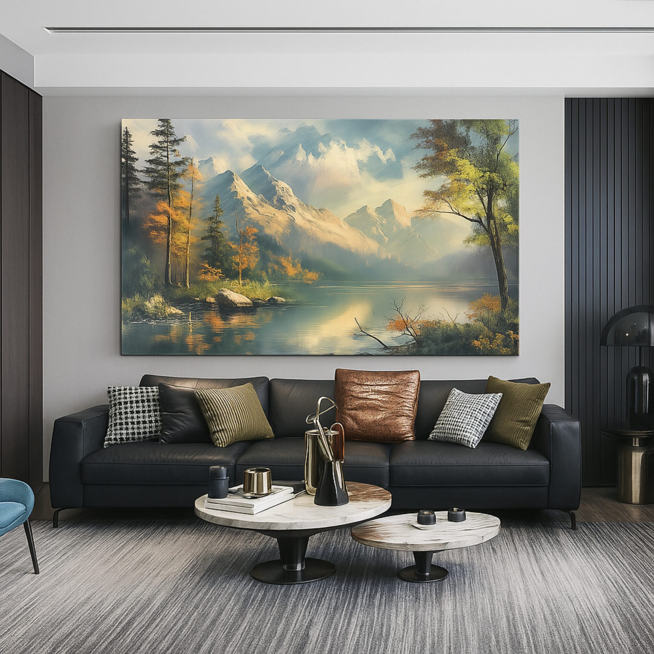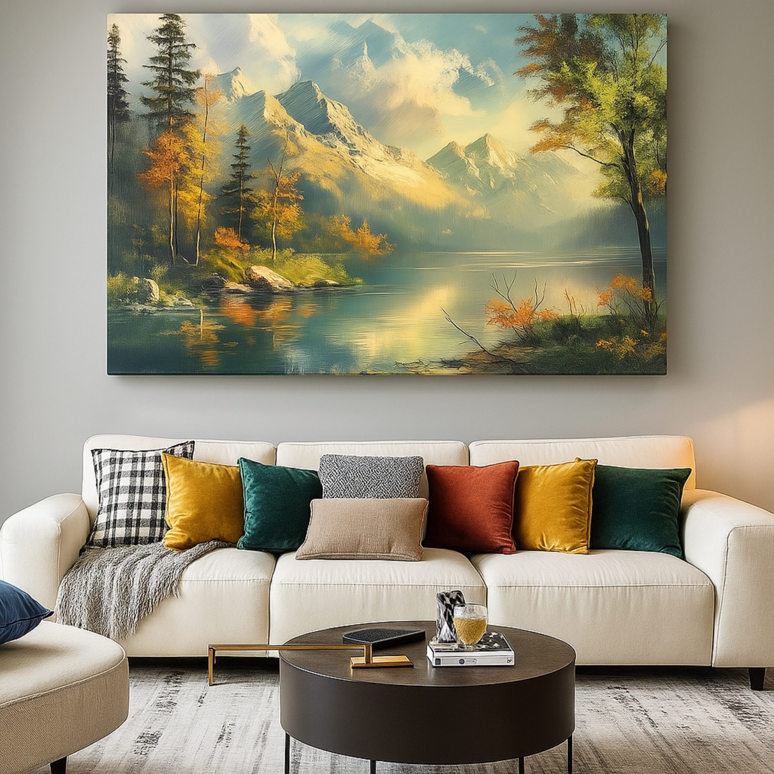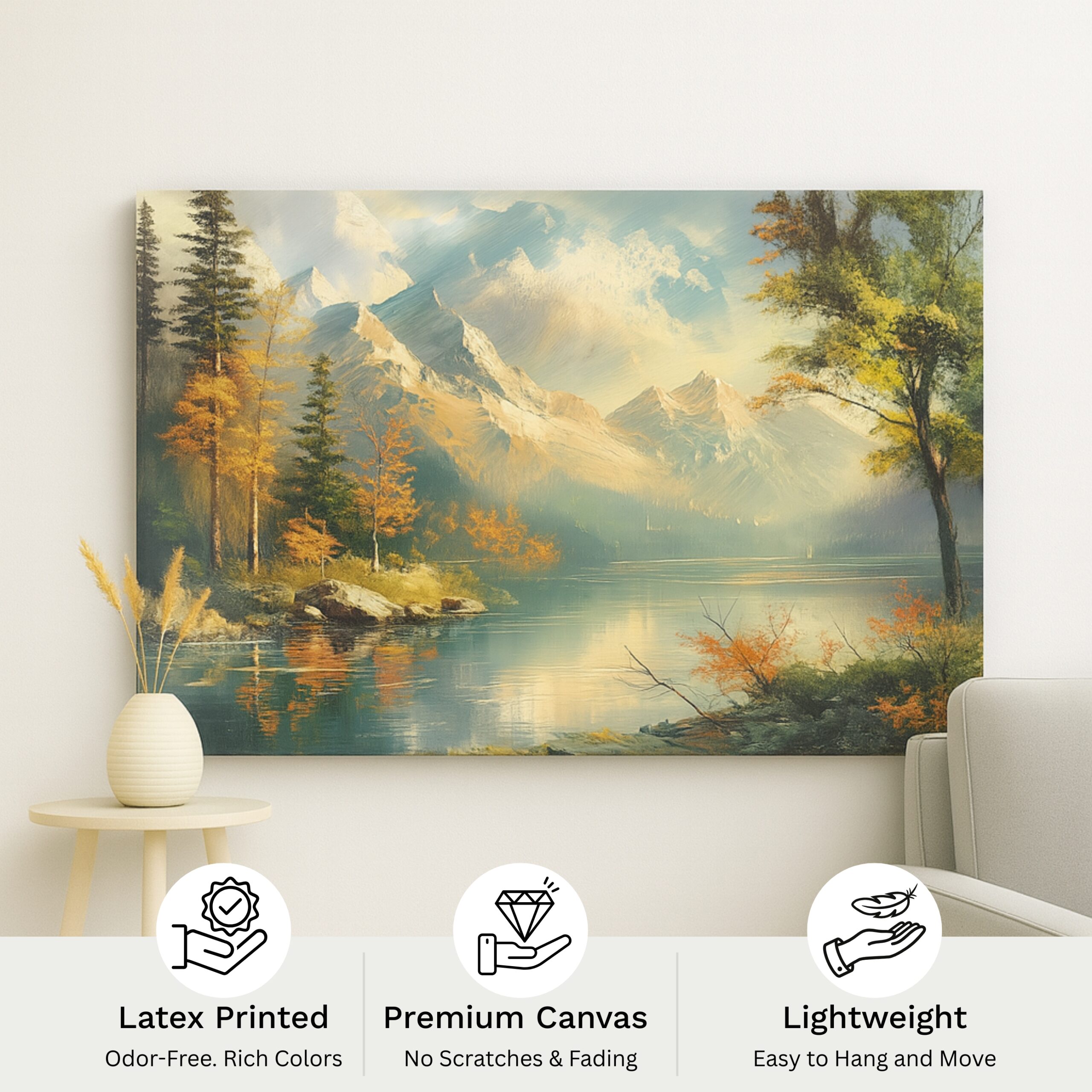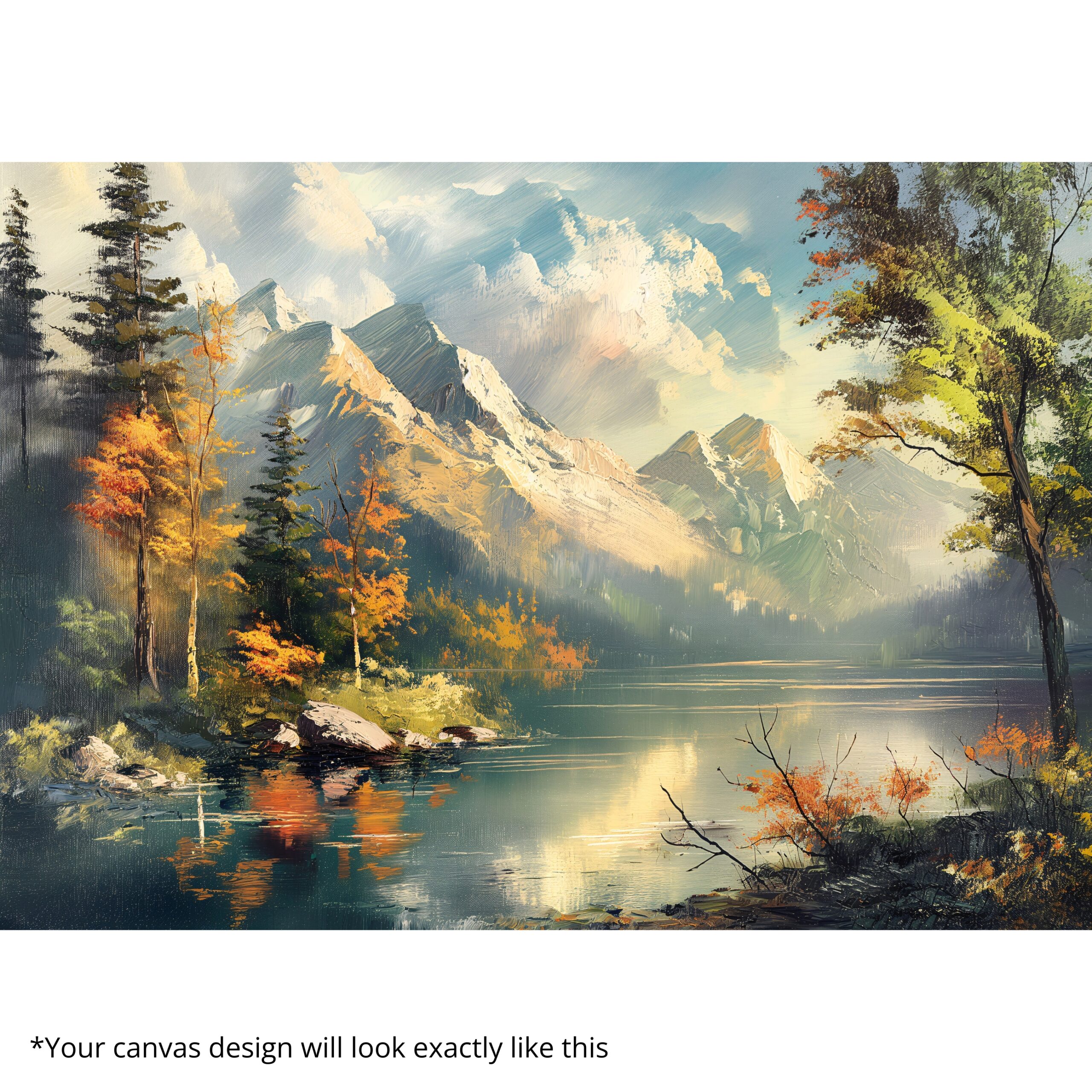Canvas Print of Neural Vista captures the grandeur of autumn in sweeping brushstrokes of golden light and serene reflection. Towering mountains rise above a tranquil lake, their mirrored beauty blending with mist and deep forest tones. This artwork conveys harmony, balance, and a meditative calm that resonates with nature lovers. A timeless celebration of landscapes, this canvas print brings the restorative peace of the outdoors into modern living spaces, turning any room into a retreat of serenity.