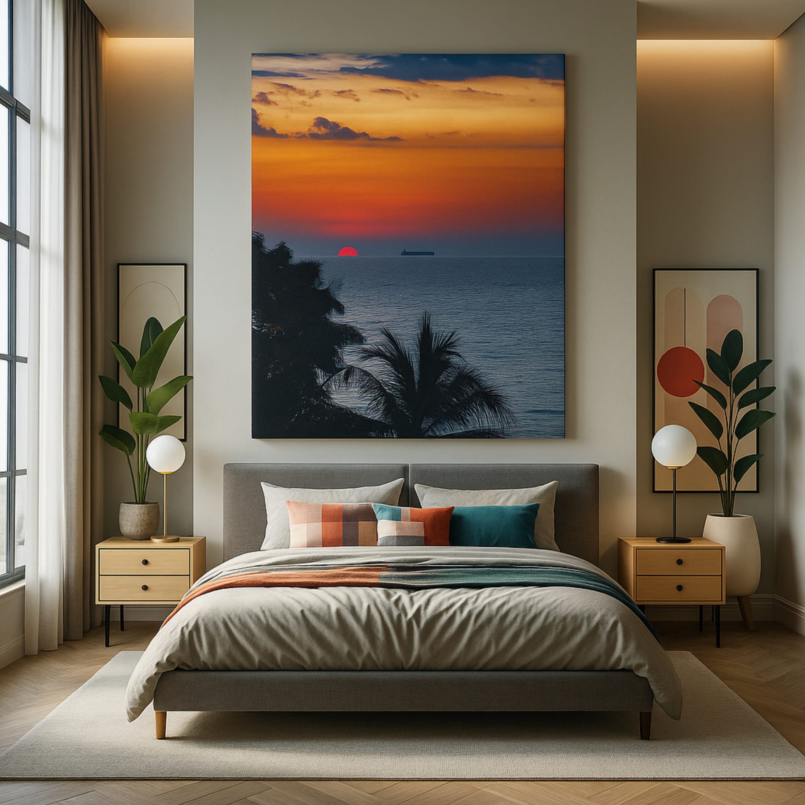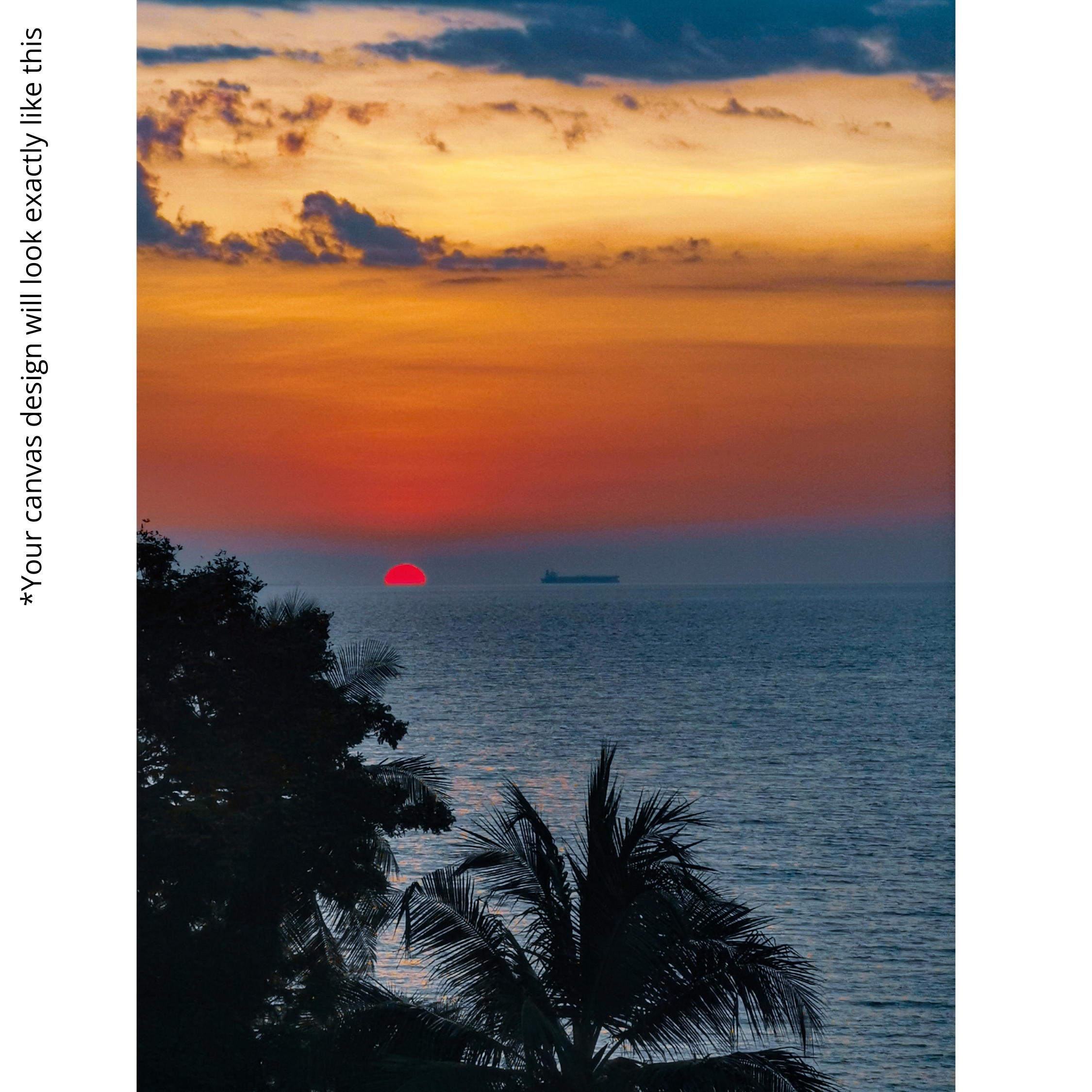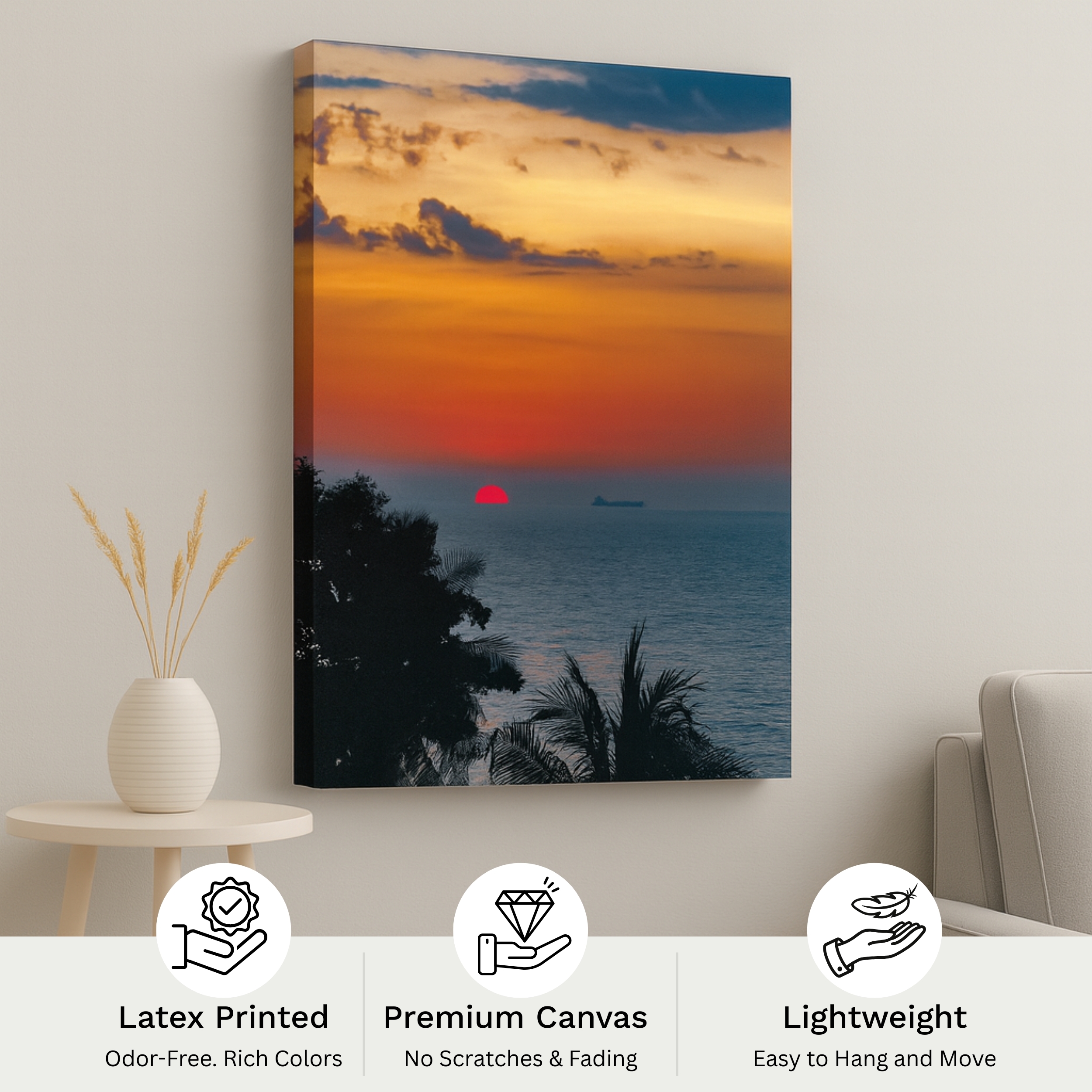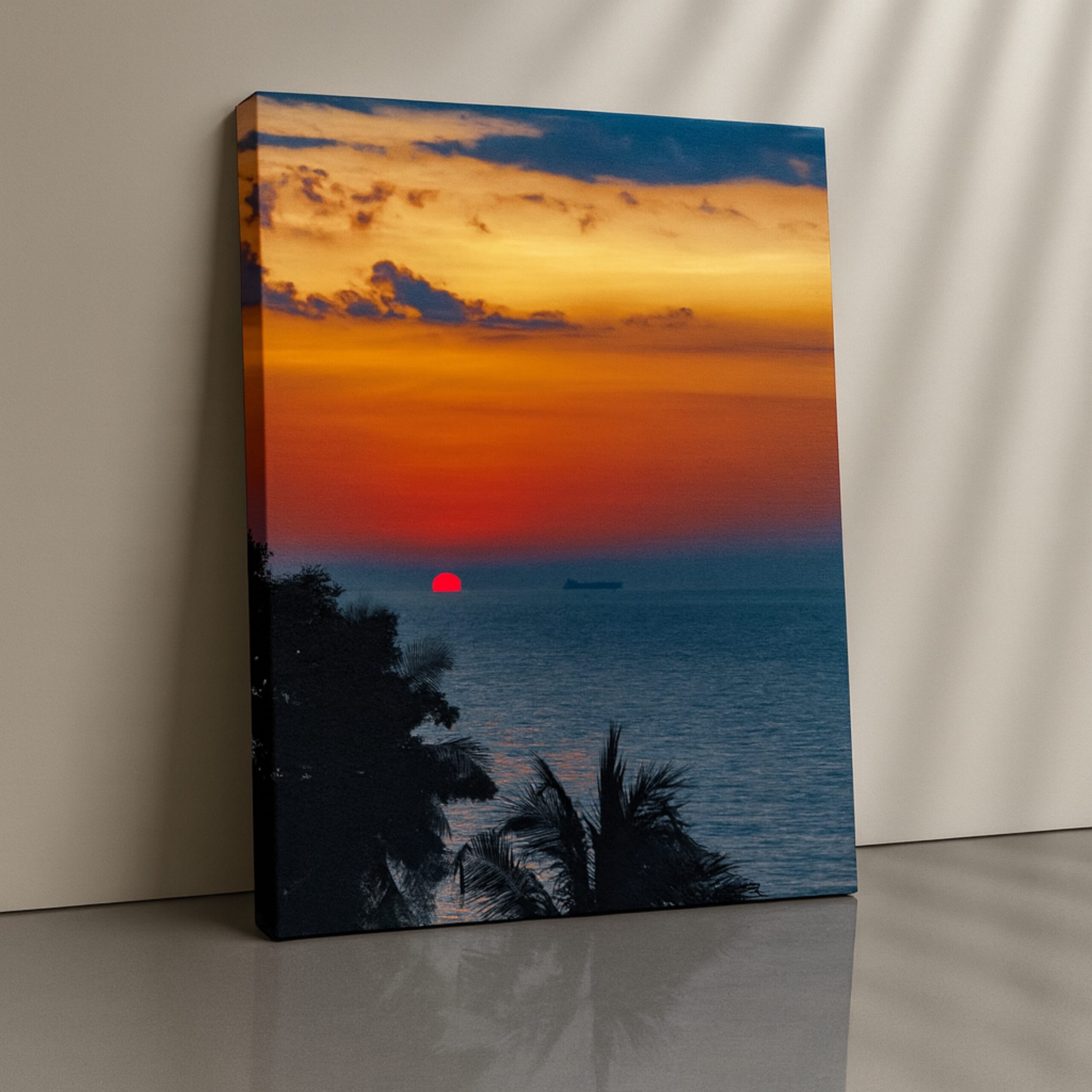 Ignite warmth with the Canvas Print of Ocean Ember. This vibrant artwork depicts a fiery sunset over calm seas, blending orange, red, and blue gradients in a mesmerizing seascape. A perfect tribute to renewal and the beauty of horizons, it is ideal for sunset and ocean lovers.