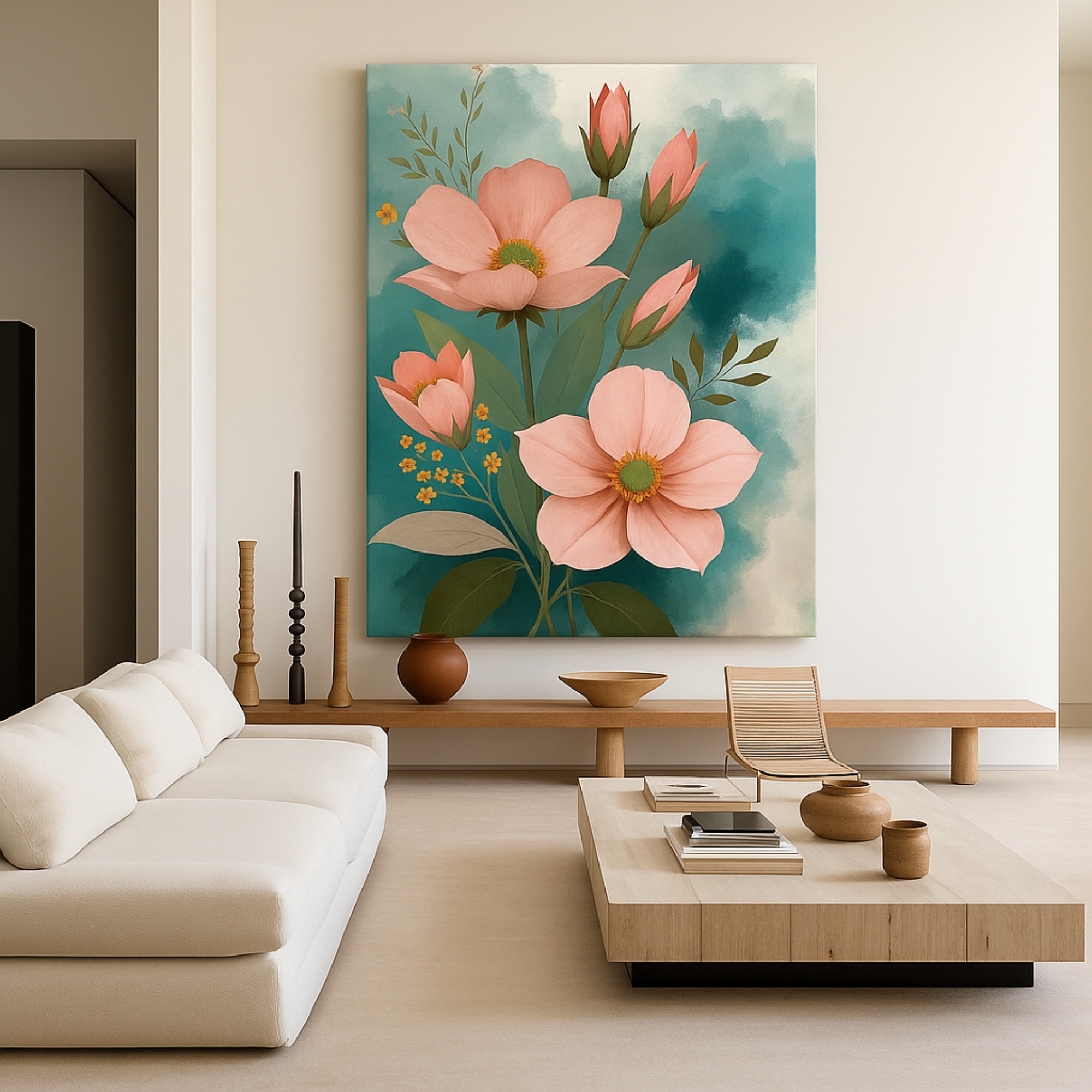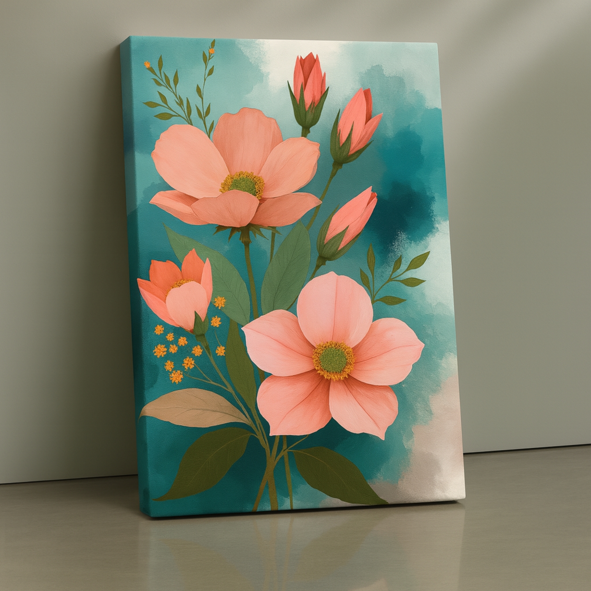 Bring gentle warmth into your space with the Peach Garden Glow Canvas Print. This refined floral artwork features soft peach blossoms set against a calming teal background. As a result, it creates a peaceful and uplifting atmosphere. The balanced composition feels light and elegant while still drawing attention.
