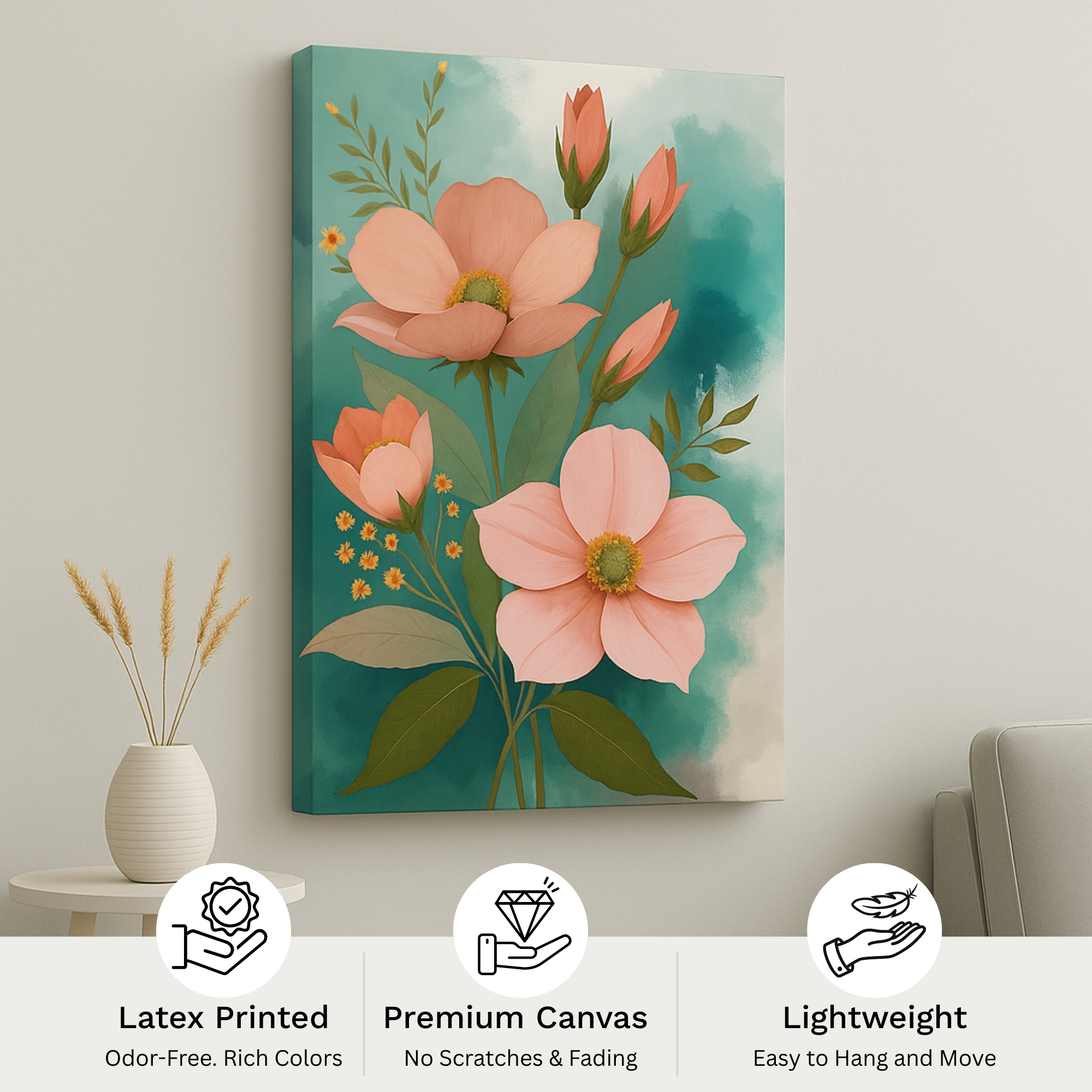 Because of its soft palette, this floral canvas wall art works beautifully in bedrooms, living rooms, and creative spaces. In addition, it makes a thoughtful gift for housewarmings, birthdays, weddings, and special moments.