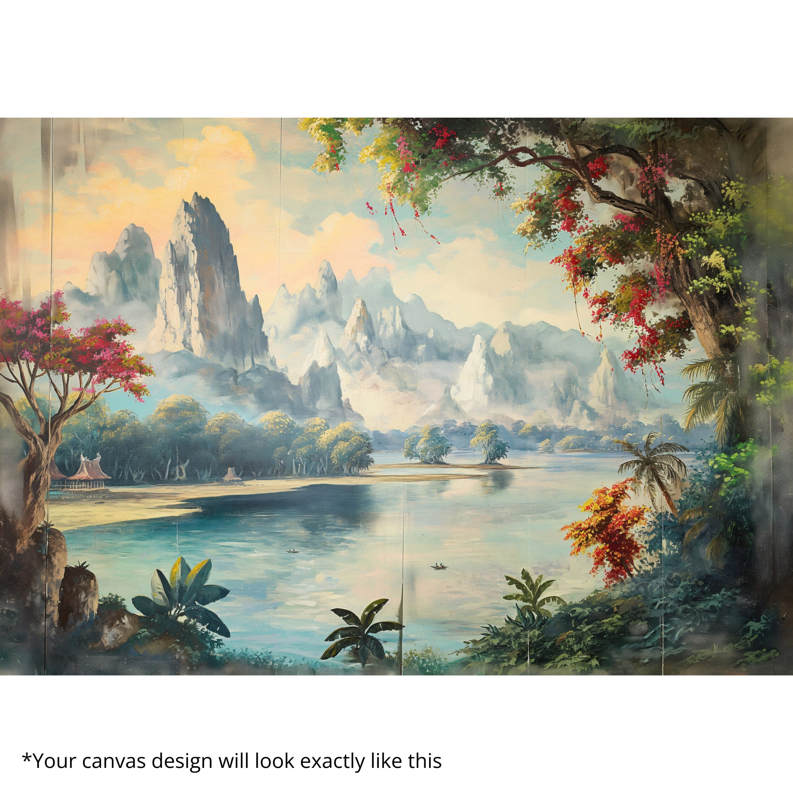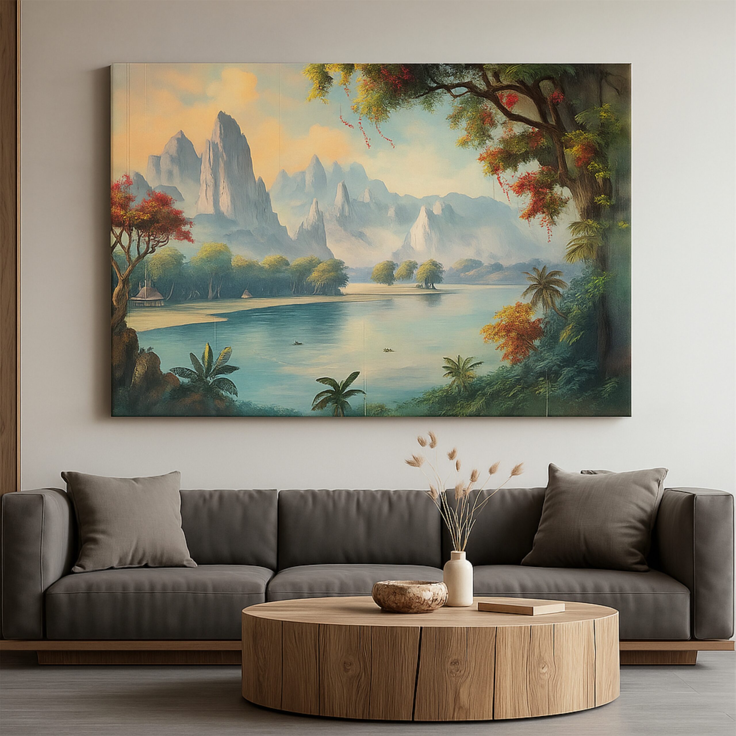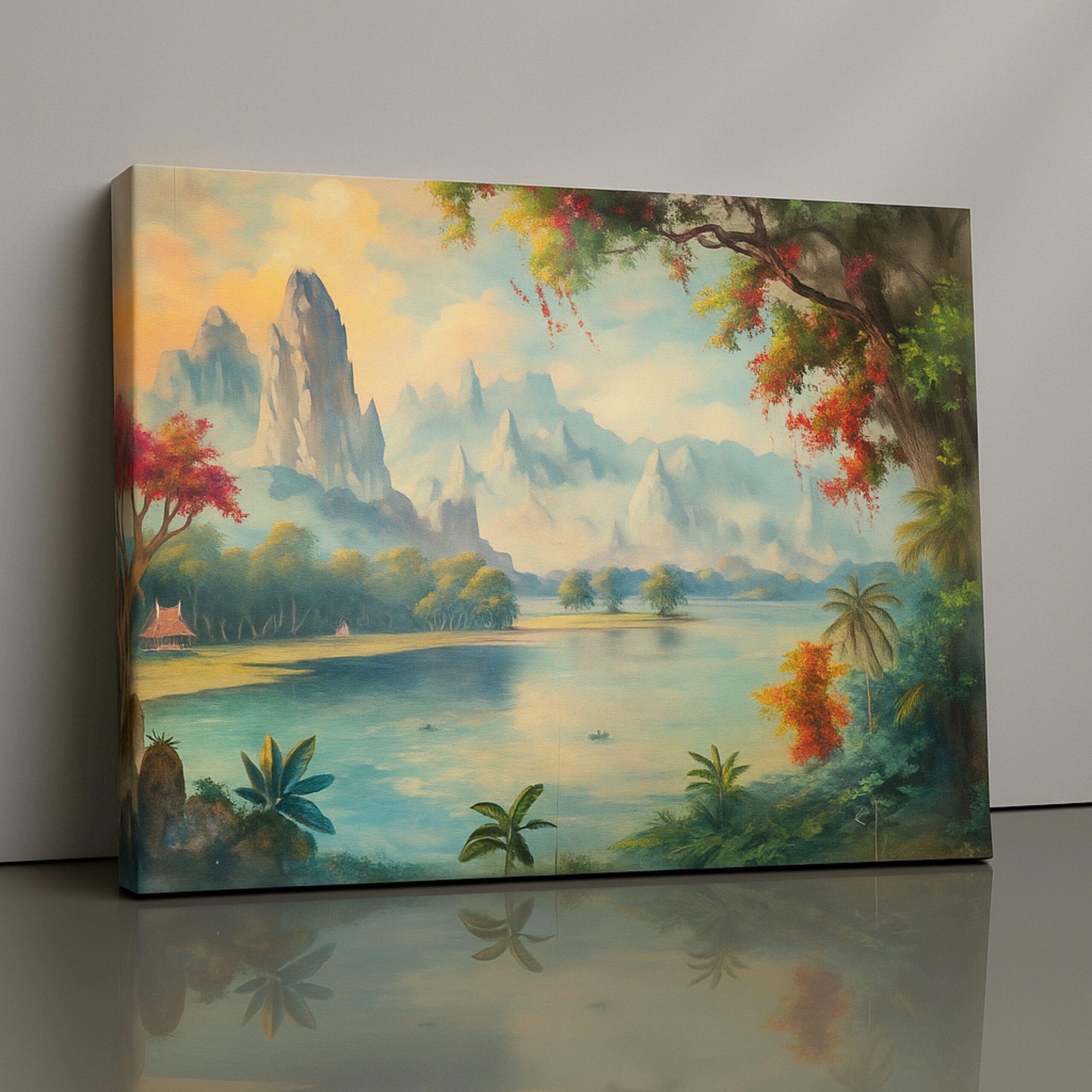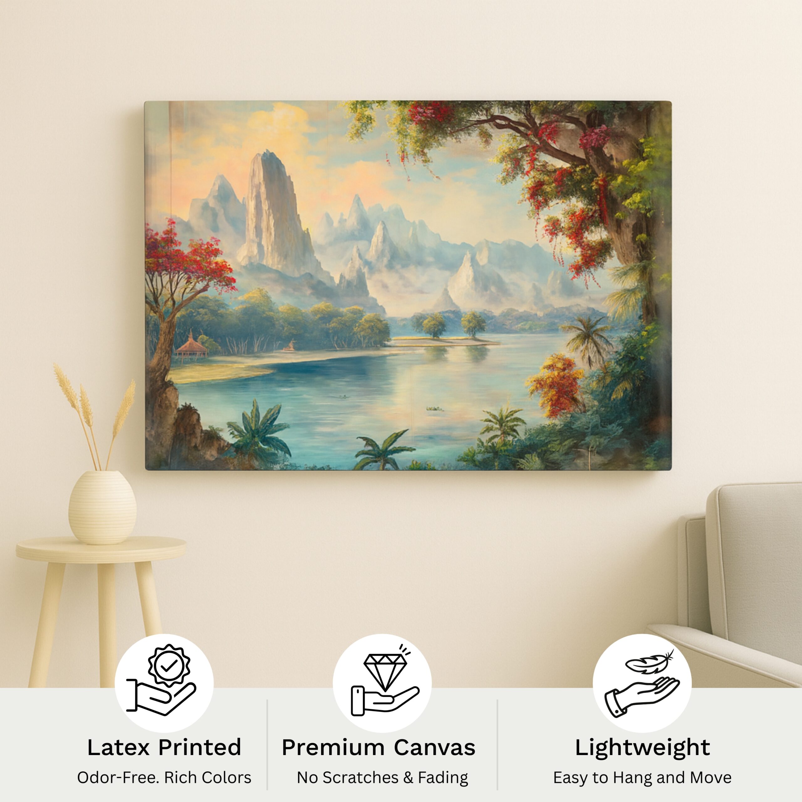 Tropical landscape with mountains and lake. Premium stretched canvas, fade-resistant inks, ready to hang.