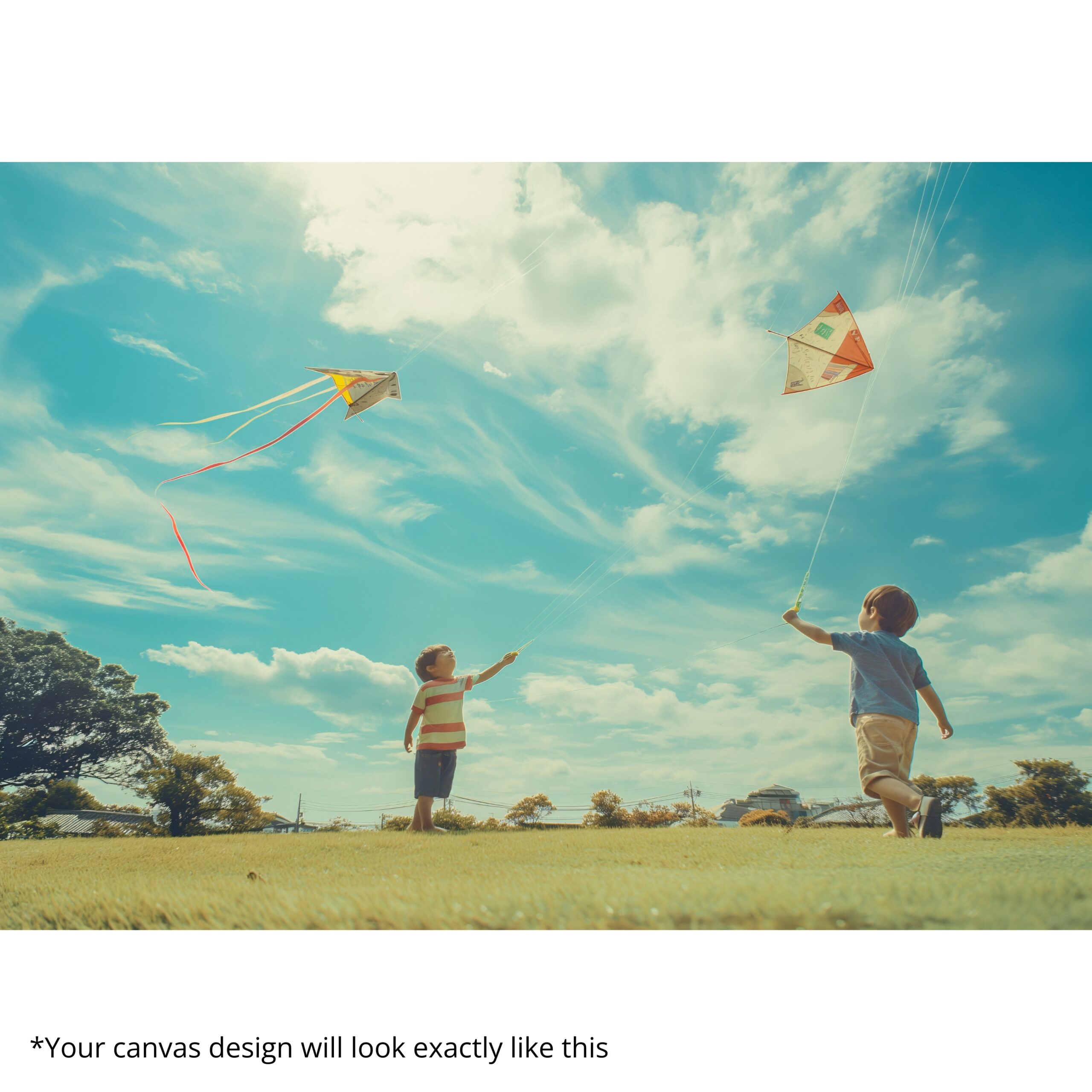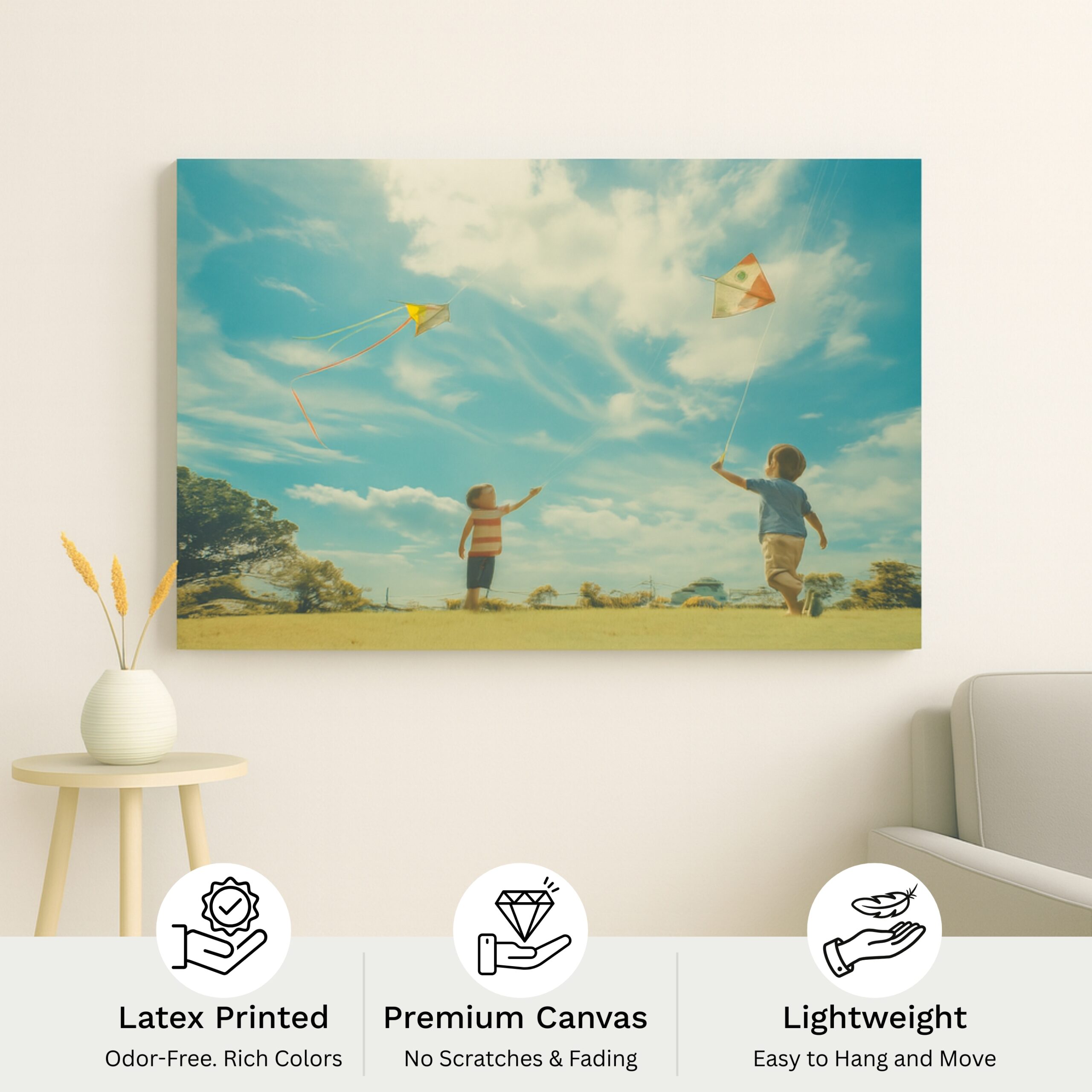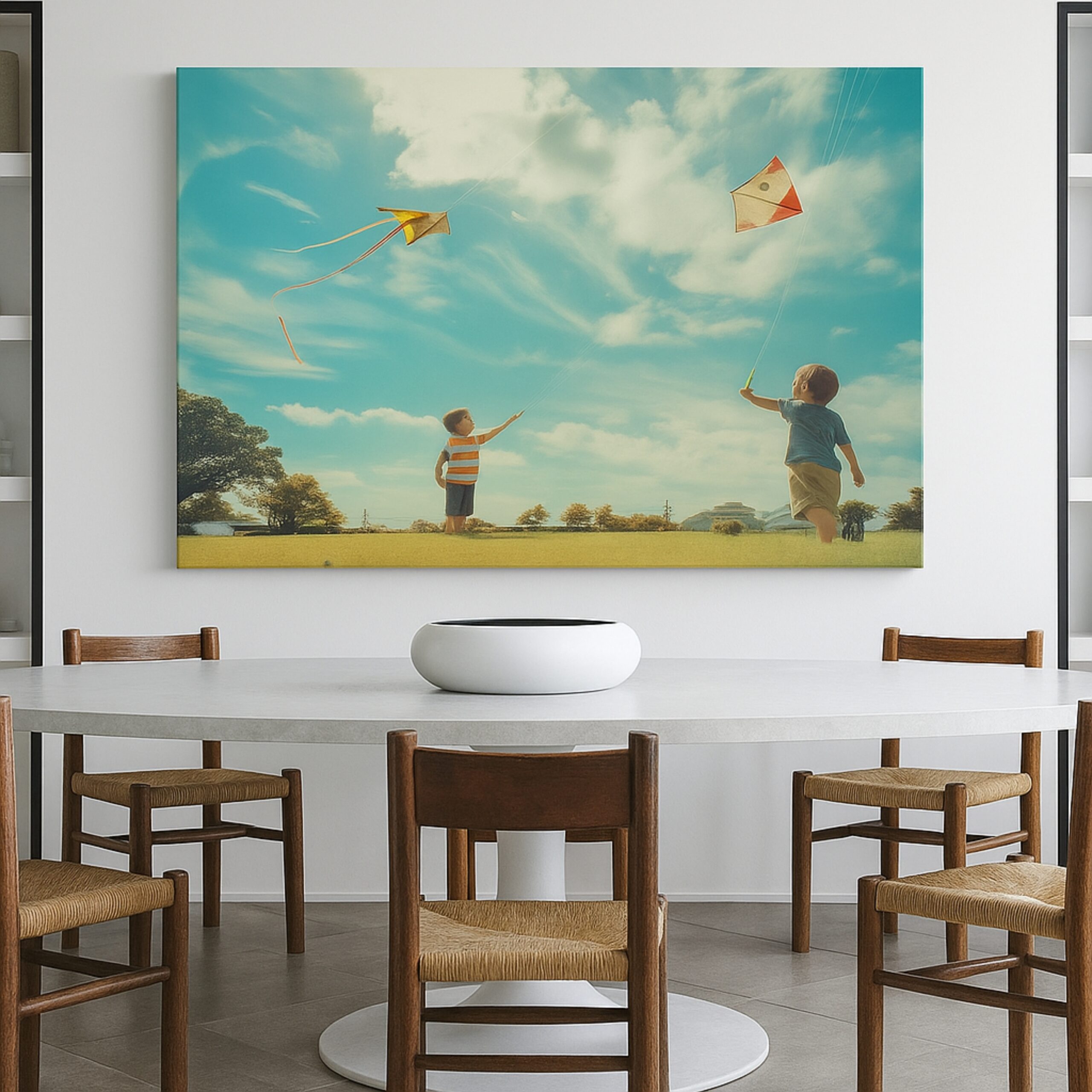 Quantum Breeze radiates the freedom and joy of childhood. Two children fly kites under a vast blue sky, capturing innocence and carefree wonder. This vibrant canvas print turns walls into celebrations of family bonding and the magic of open skies. More than artwork, it is a reminder of the lighthearted beauty of youth.