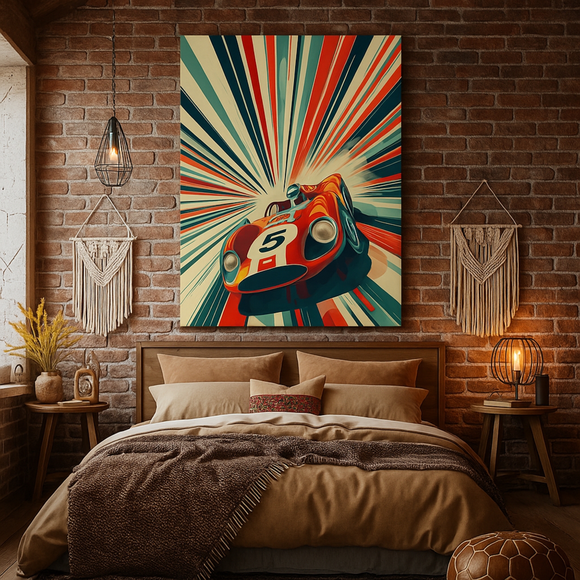 Race back in time with the Canvas Print of Retro Speedster. Featuring a classic race car bursting through a bold backdrop, this artwork celebrates motorsport nostalgia and timeless style. Perfect for man caves, retro enthusiasts, or game rooms, it adds both energy and vintage elegance to interiors.
