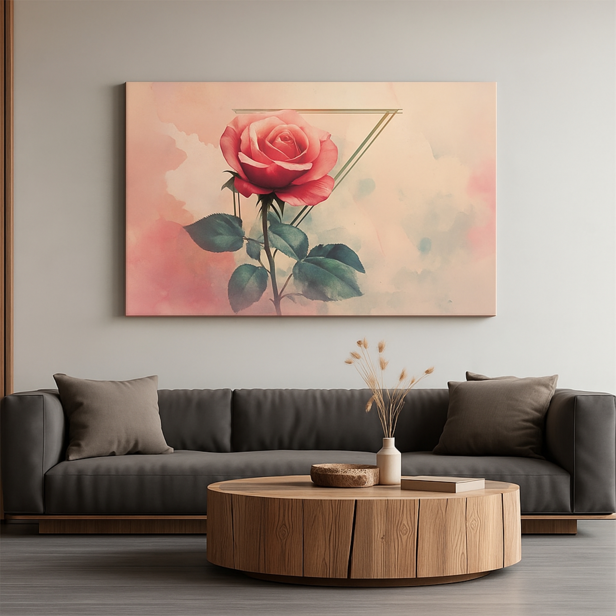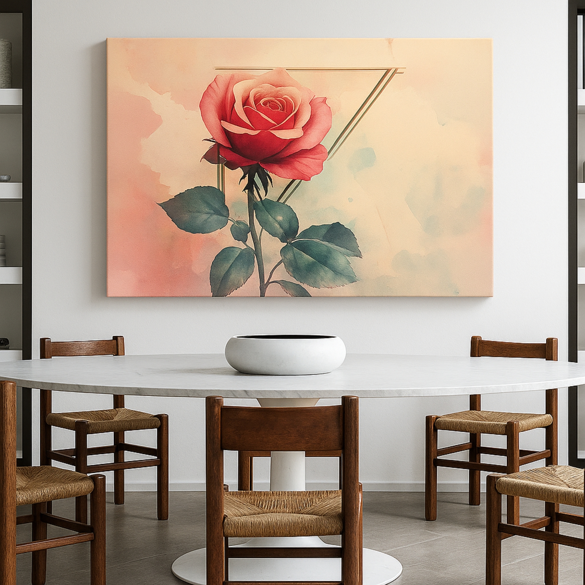 This Canvas Print combines a soft watercolor rose with clean geometric lines to create a fresh, modern look. The Canvas Print feels romantic without being heavy, thanks to its airy pastel background and subtle shapes framing the flower. It works beautifully in bedrooms, dressing areas, studios, and any space where you want a calm, elegant atmosphere with a contemporary twist.