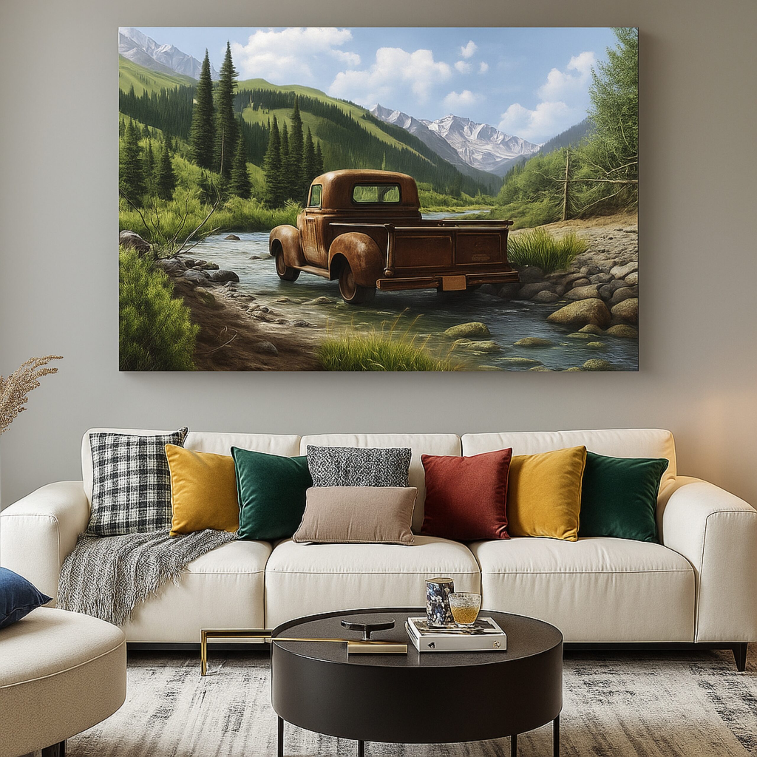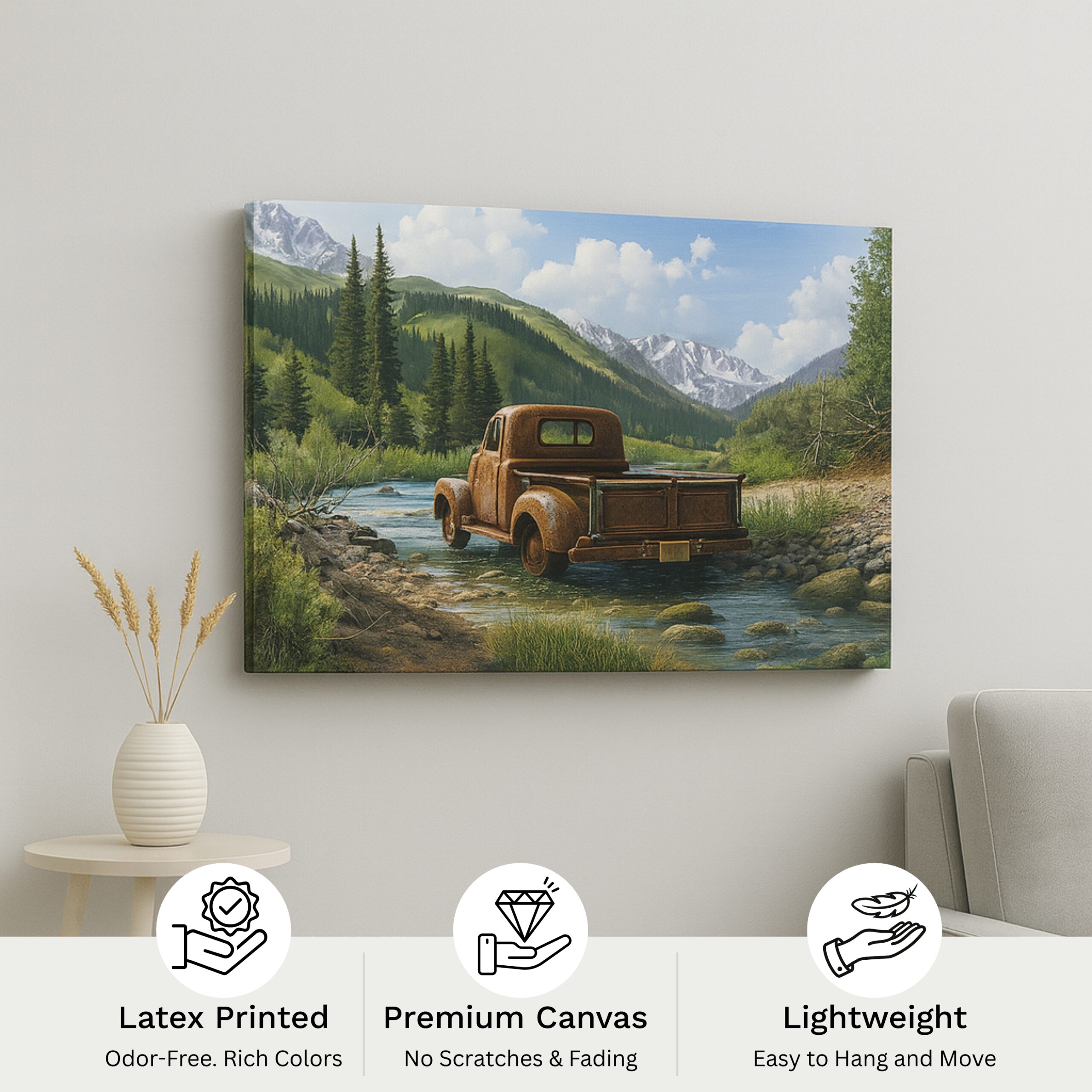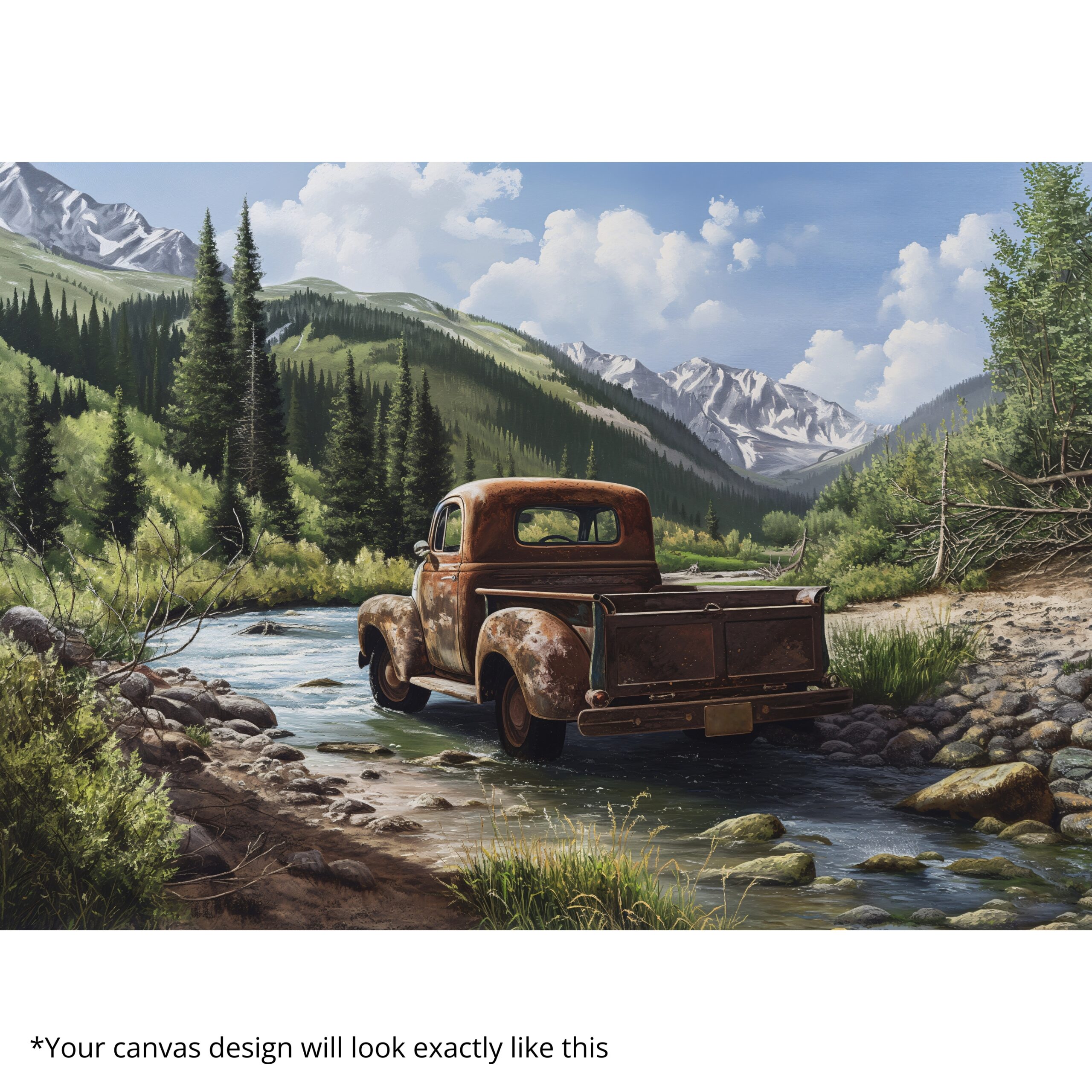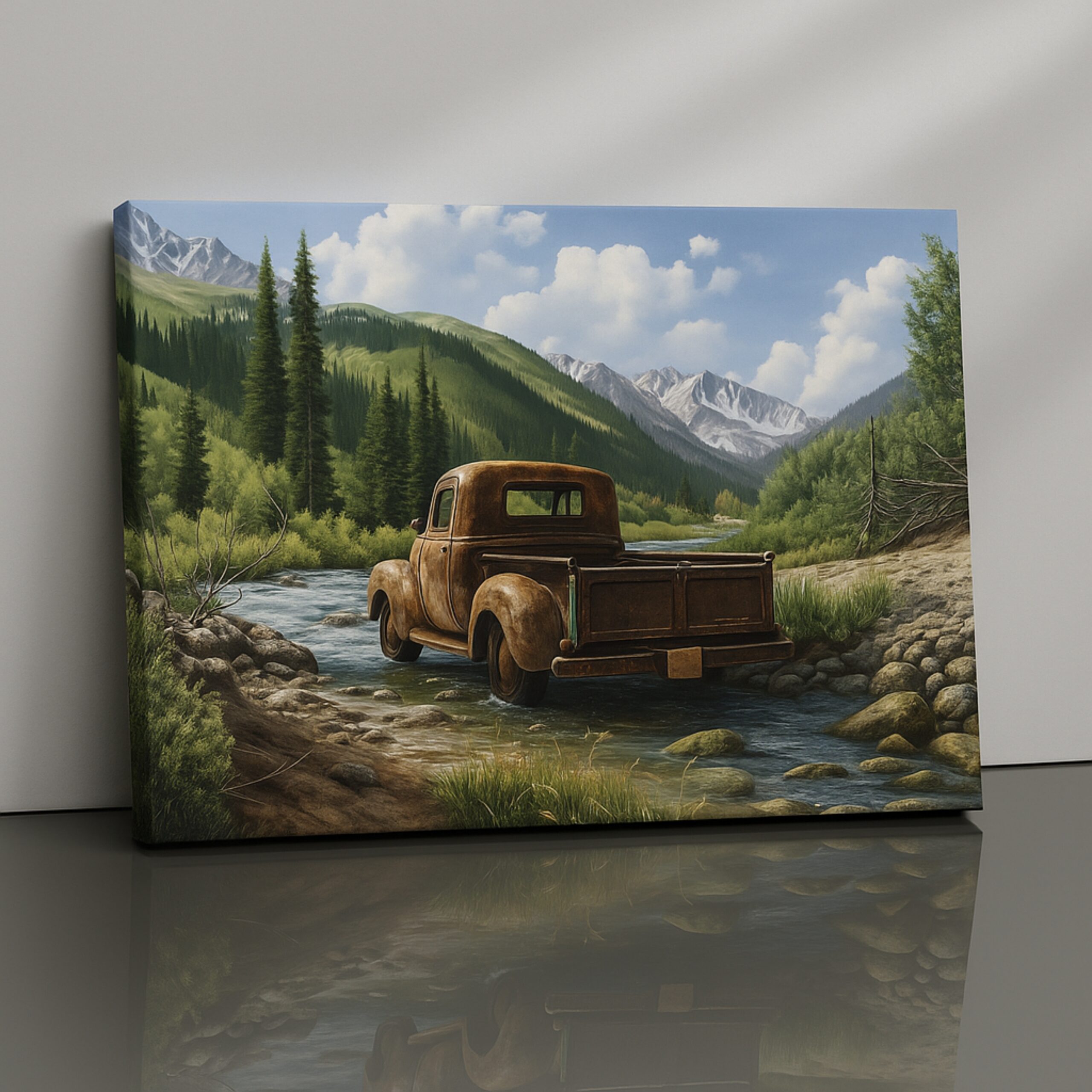 Canvas Print of Rustic Echo captures nostalgia, solitude, and resilience through a vintage truck resting beside a mountain stream. Its weathered metal set against a backdrop of pines and snowy peaks tells stories of journeys, stillness, and endurance. With earthy tones and rustic charm, this artwork creates a warm, nostalgic presence in interiors.