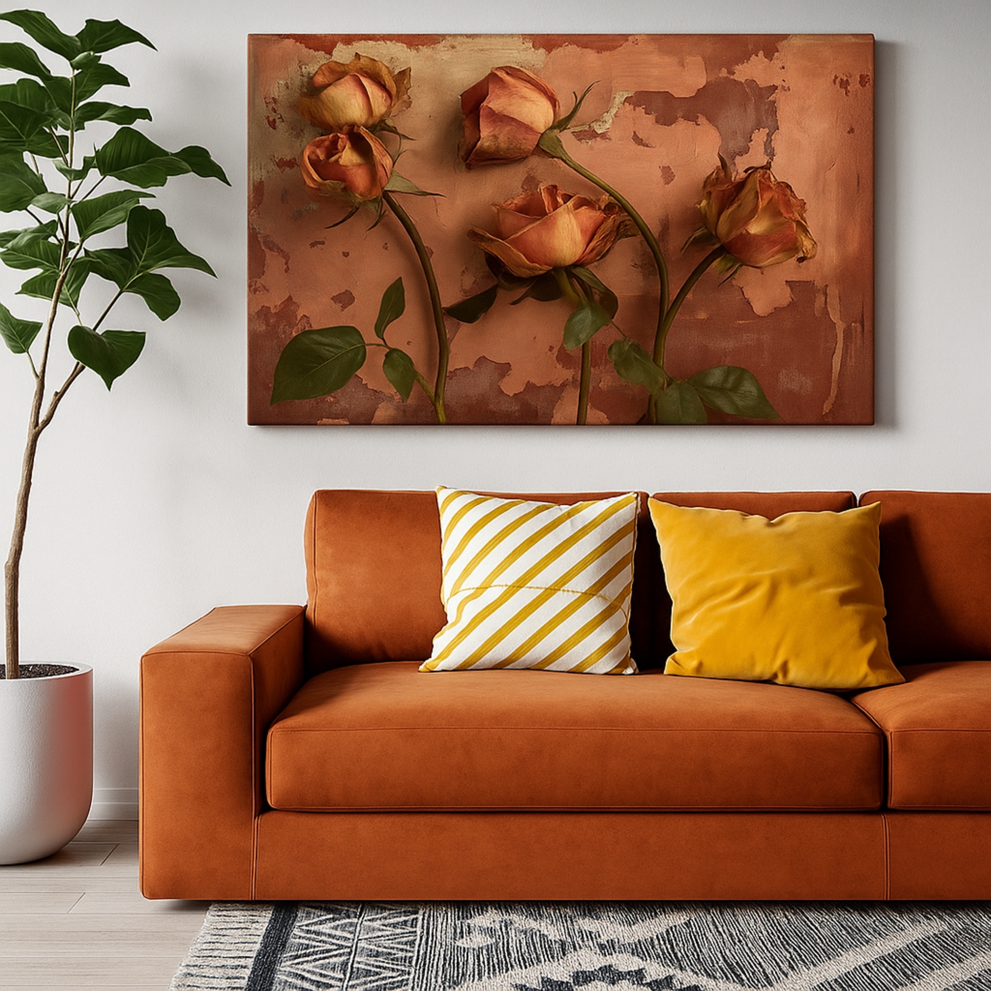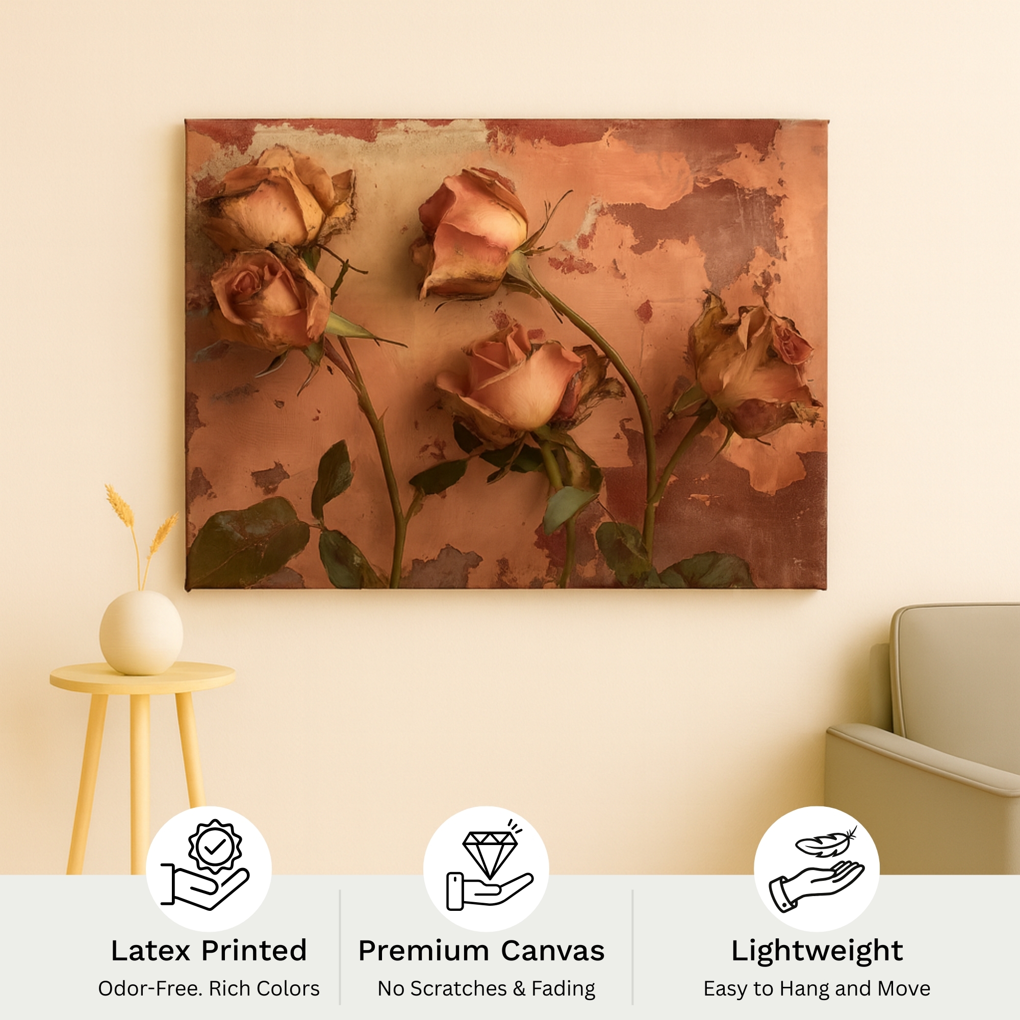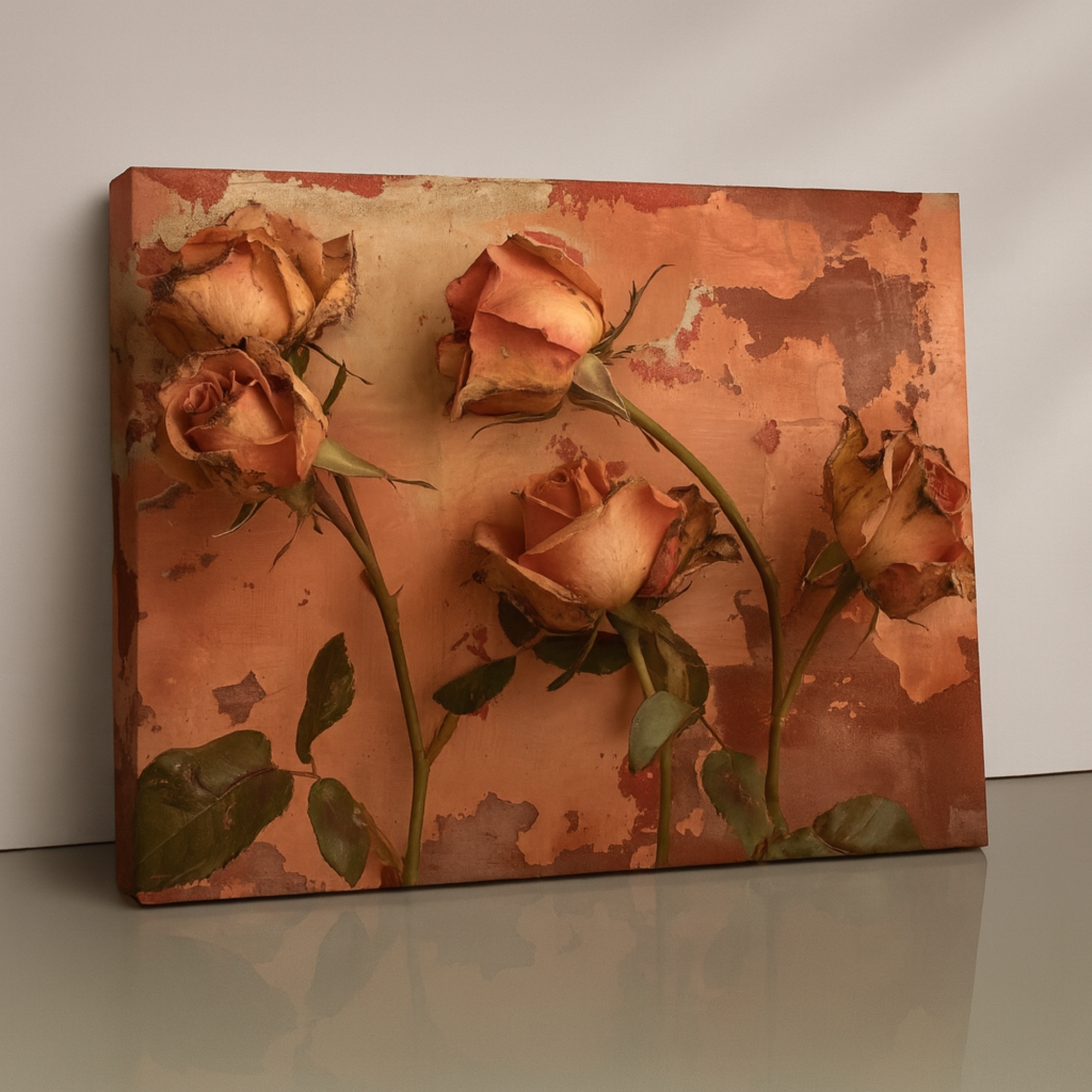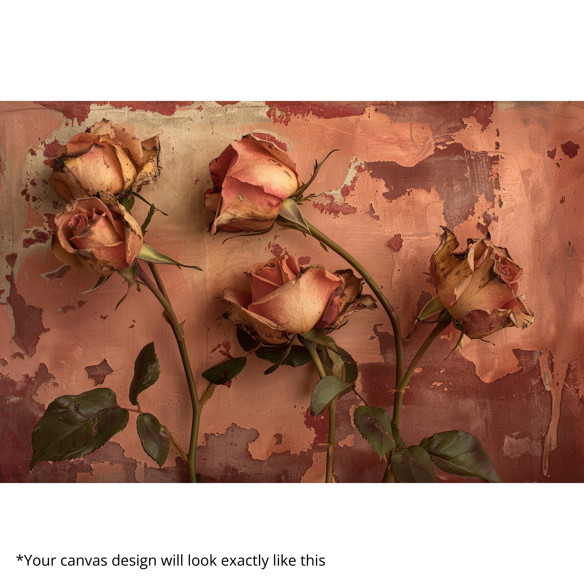 This Canvas Print features weathered roses against a textured, rustic backdrop, capturing the beauty of time-worn petals and aged surfaces. The Canvas Print brings a nostalgic, romantic mood to your space, making it ideal for farmhouse interiors, vintage-inspired bedrooms, and cozy corners. Earthy tones and distressed textures create depth without overpowering the room.