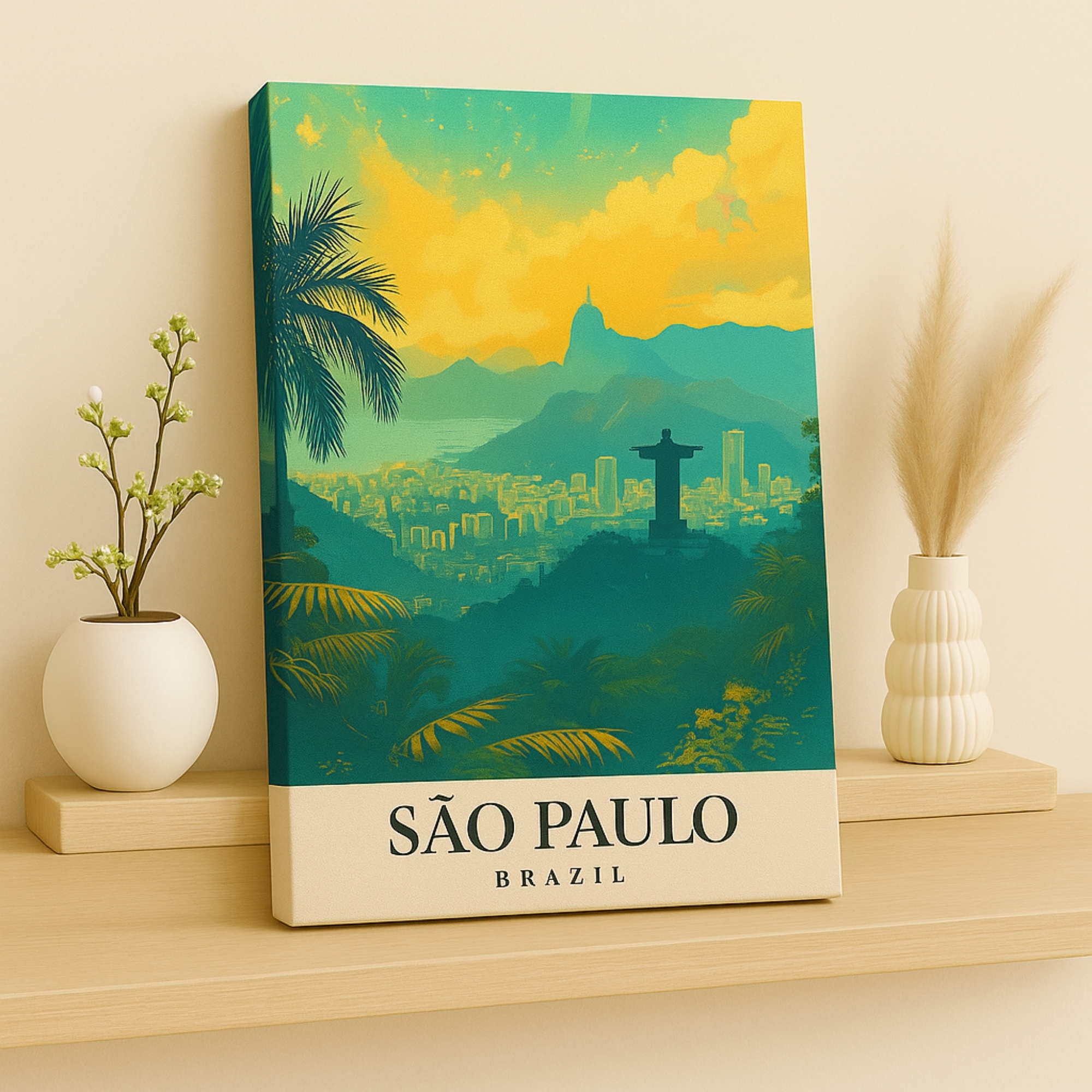 Canvas Print of São Paulo Brazil Cityscape brings the vibrant spirit of South America into your home. A lush jungle foreground frames an urban skyline beneath dramatic skies, capturing the pulse of Brazil’s largest metropolis—its creativity, contrasts, and unstoppable energy. Designed to inspire travelers and city-lovers alike, this artwork blends nature and architecture for a globally modern focal point that sparks conversation and wanderlust.
