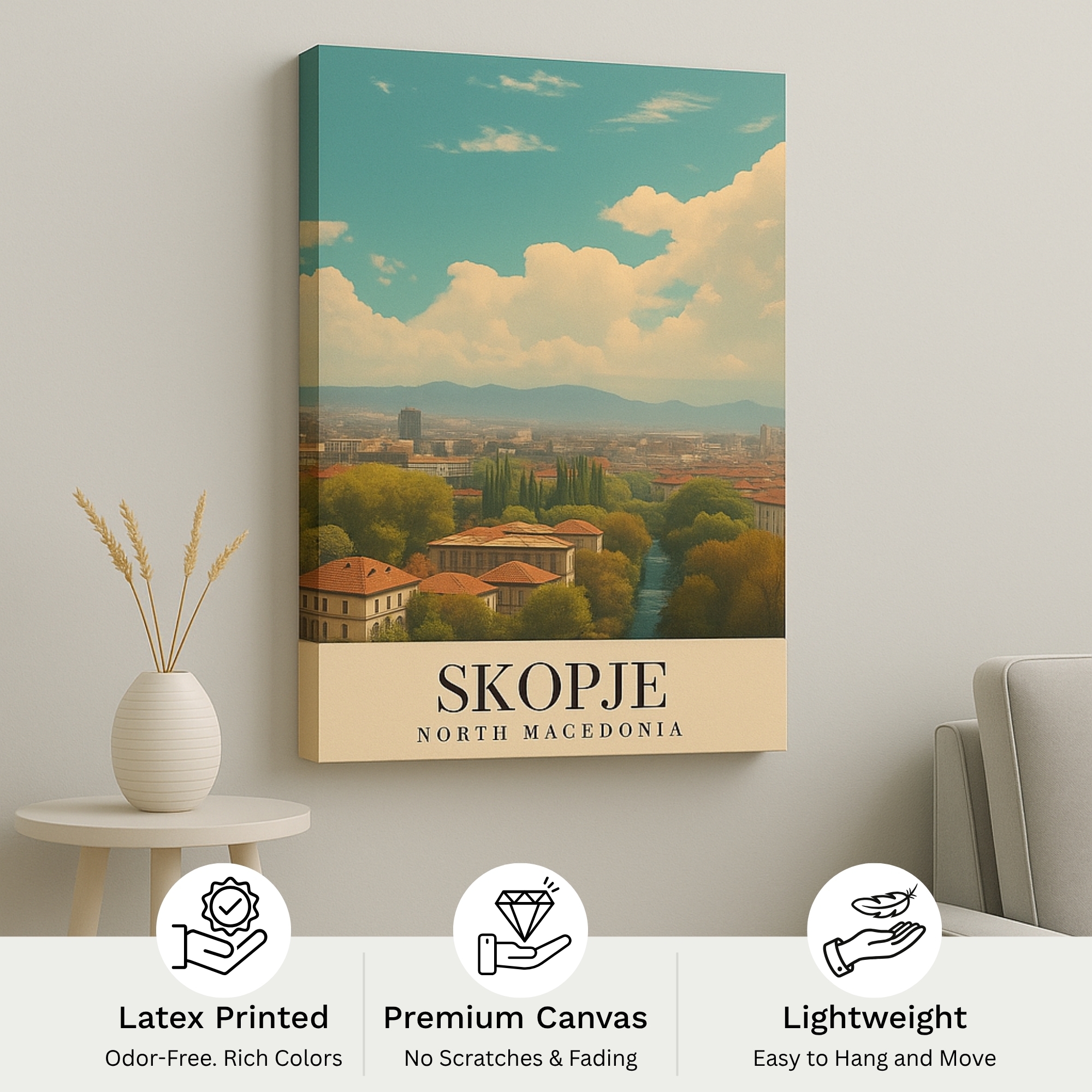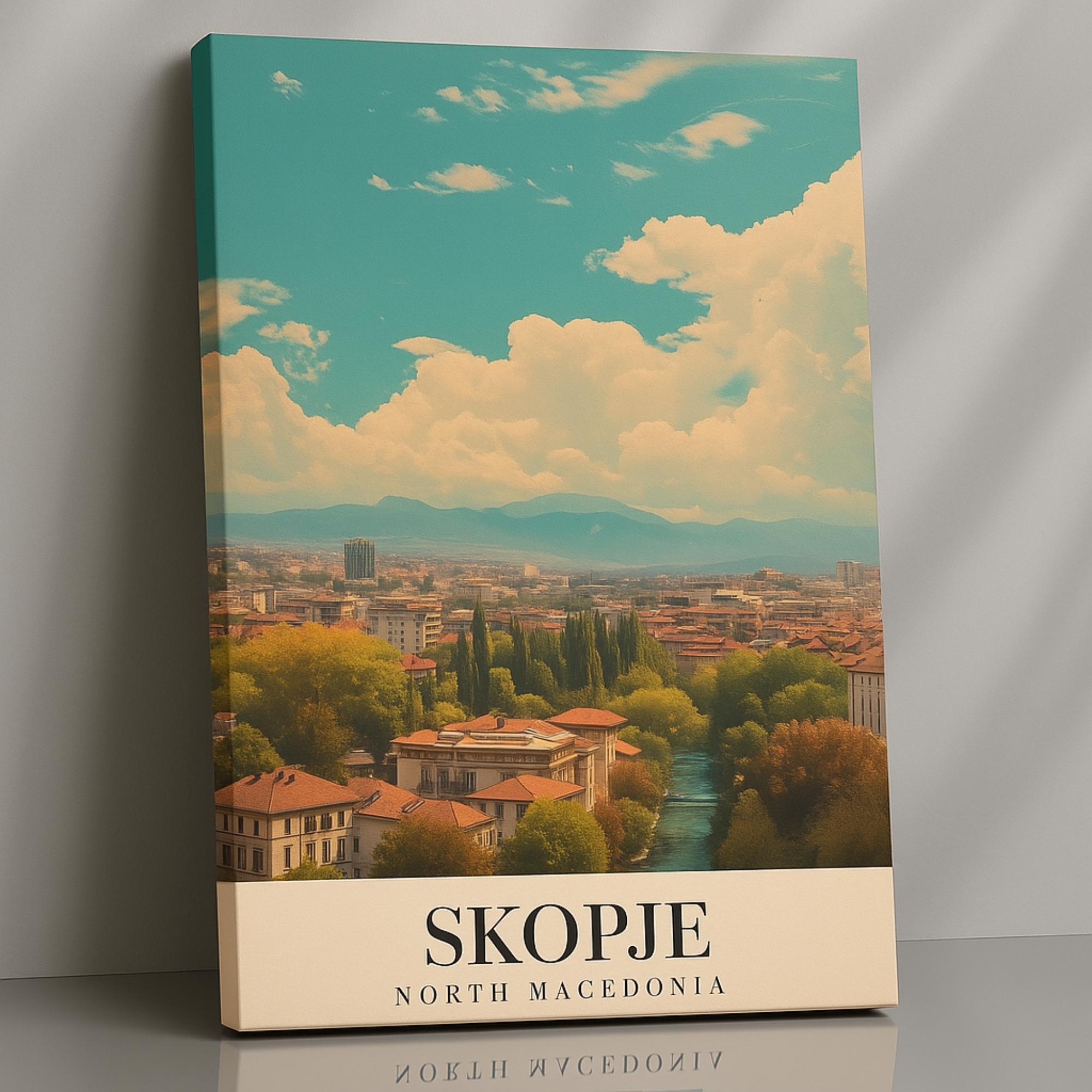 Canvas Print of Skopje North Macedonia celebrates Balkan charm with a vibrant cityscape—historic bridges, dynamic plazas, and cultural landmarks rendered in spirited color. Energetic yet refined, it adds cosmopolitan pride to modern homes and offices.