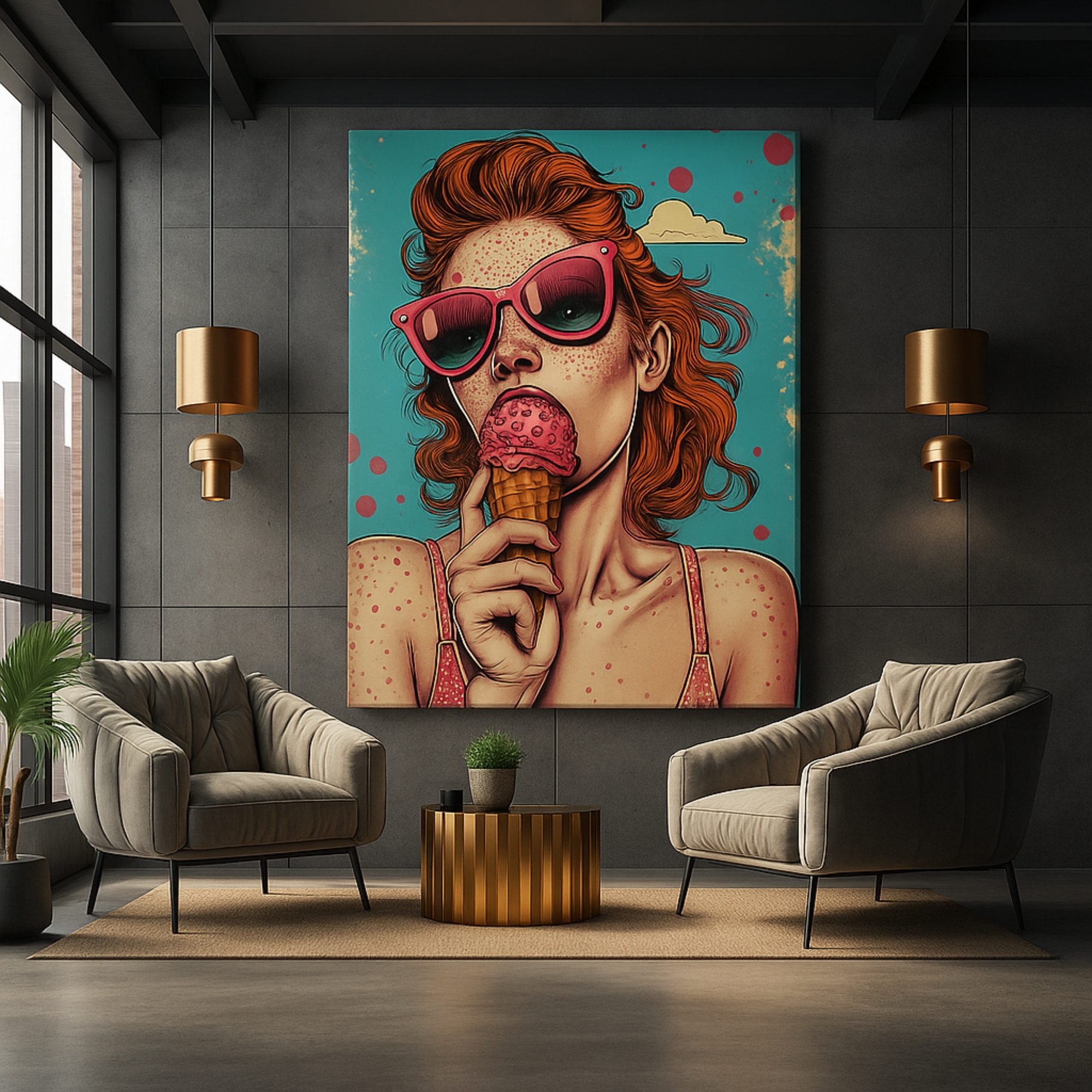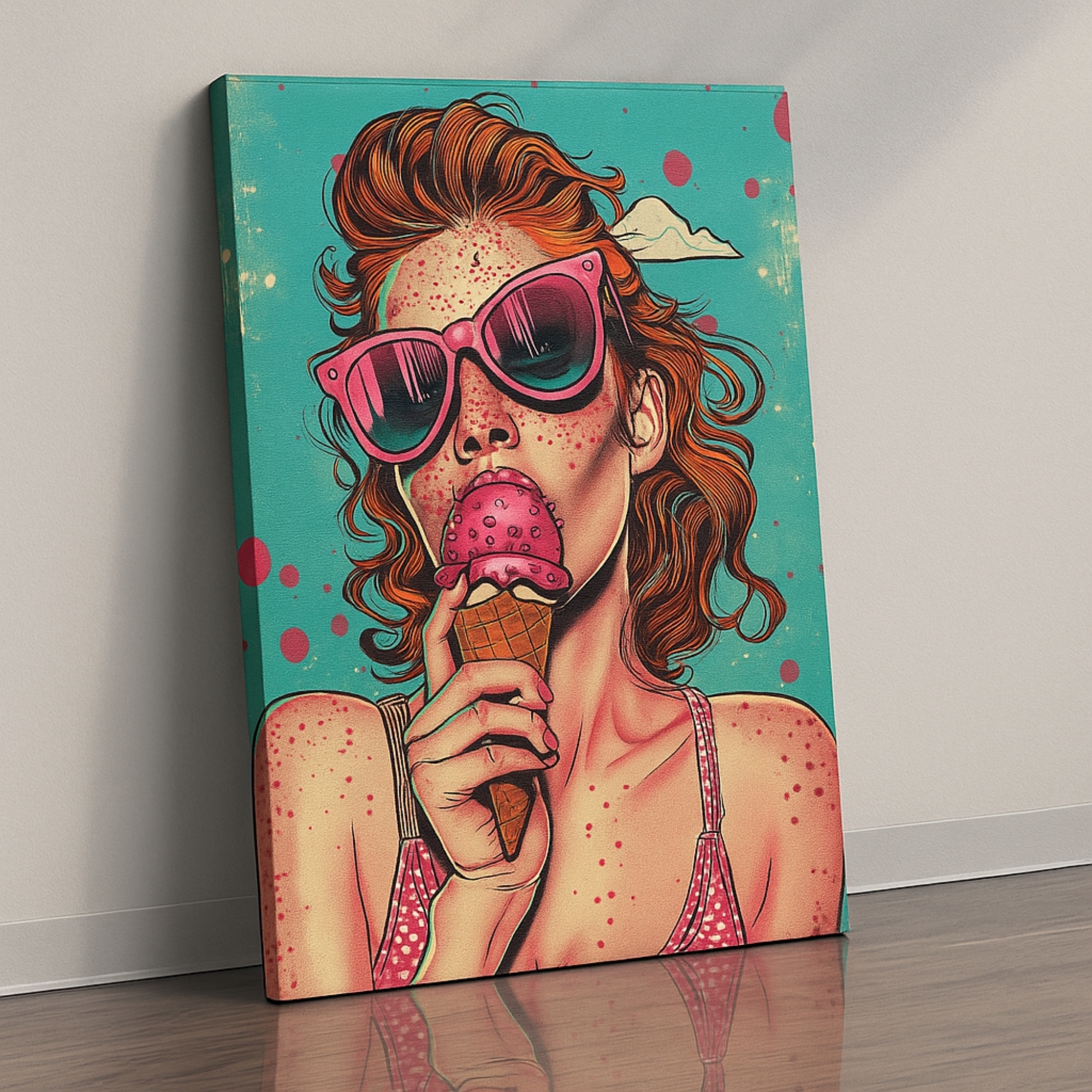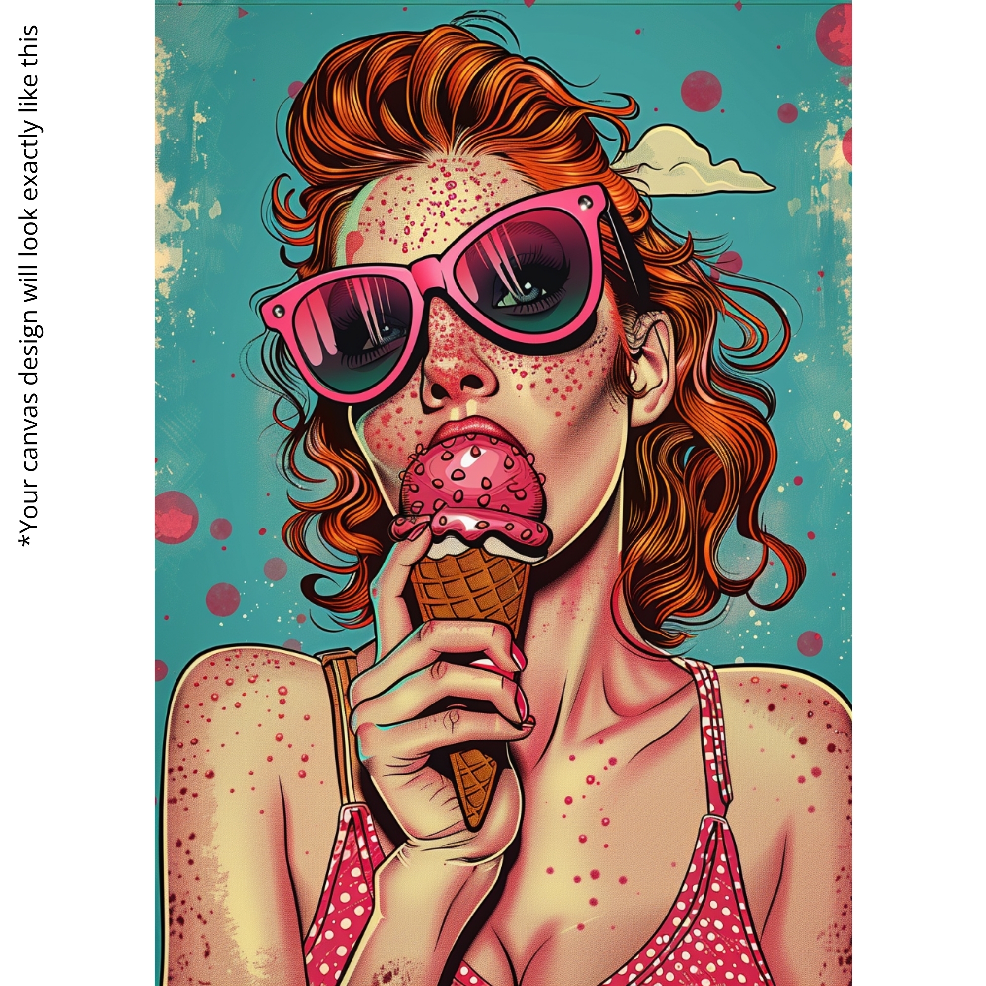 Bring sweet nostalgia with the Canvas Print of Strawberry Summer. Featuring a retro-inspired girl in pink shades enjoying strawberry ice cream, this pop art piece bursts with summer vibes, humor, and joy. Its playful design adds personality and color to kitchens, cafés, dorms, or funky modern spaces, becoming an instant conversation piece.