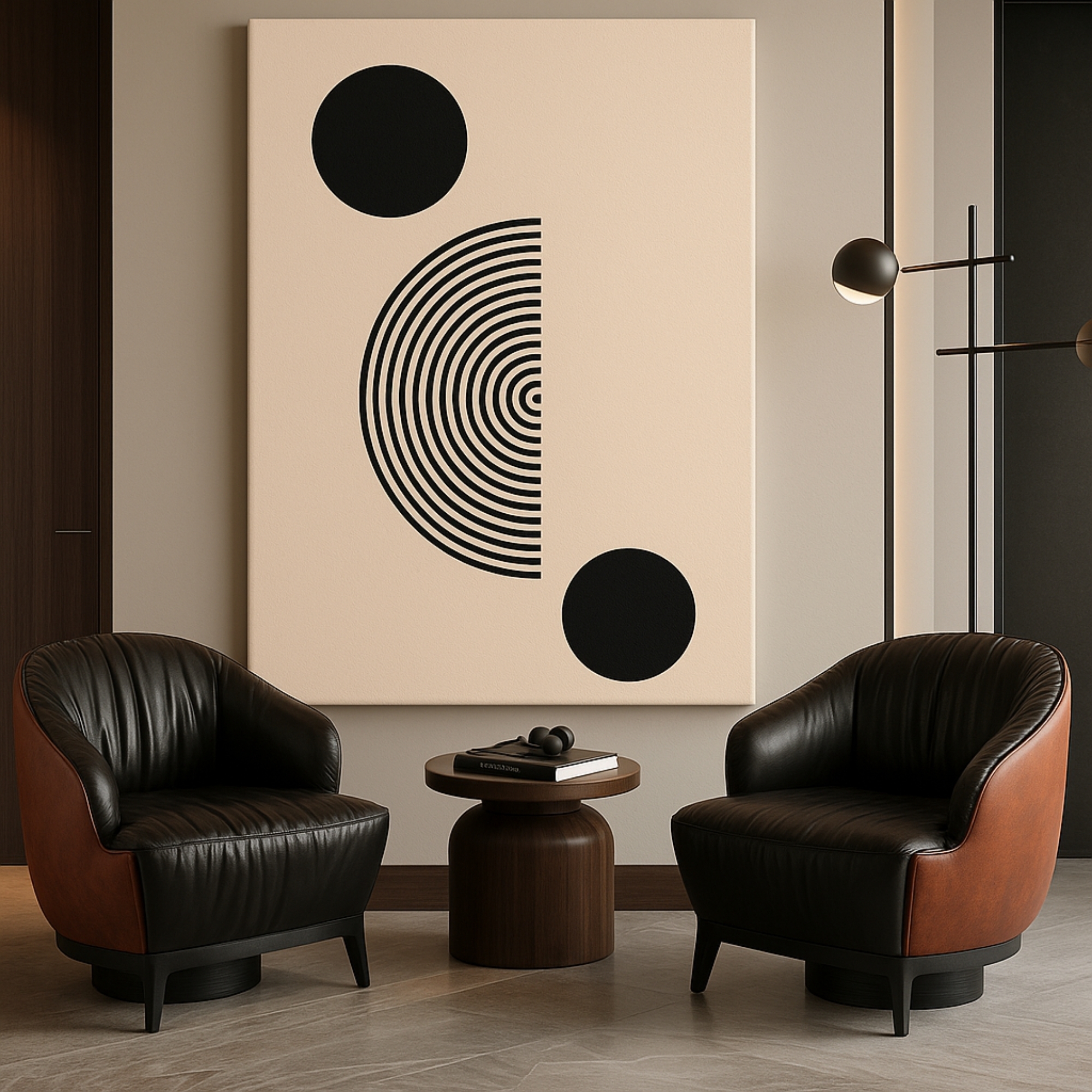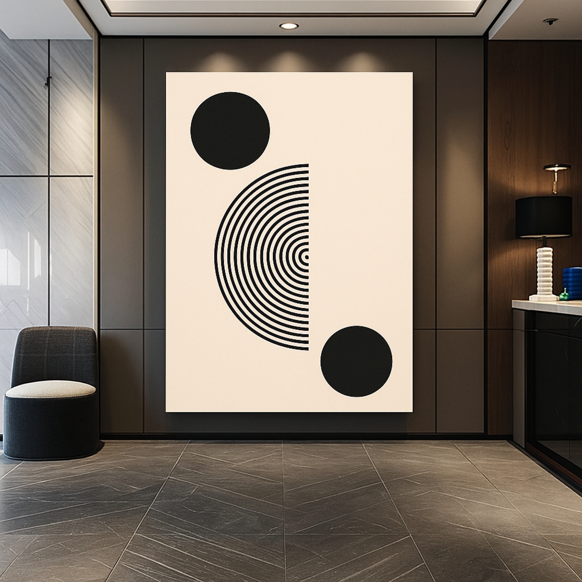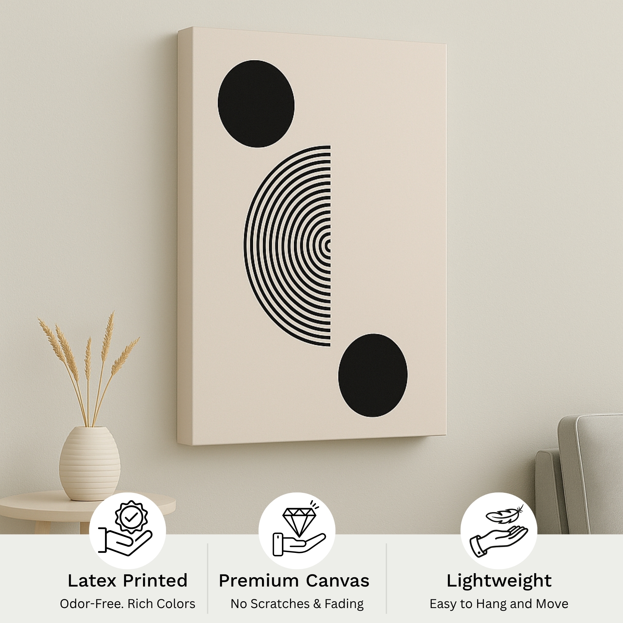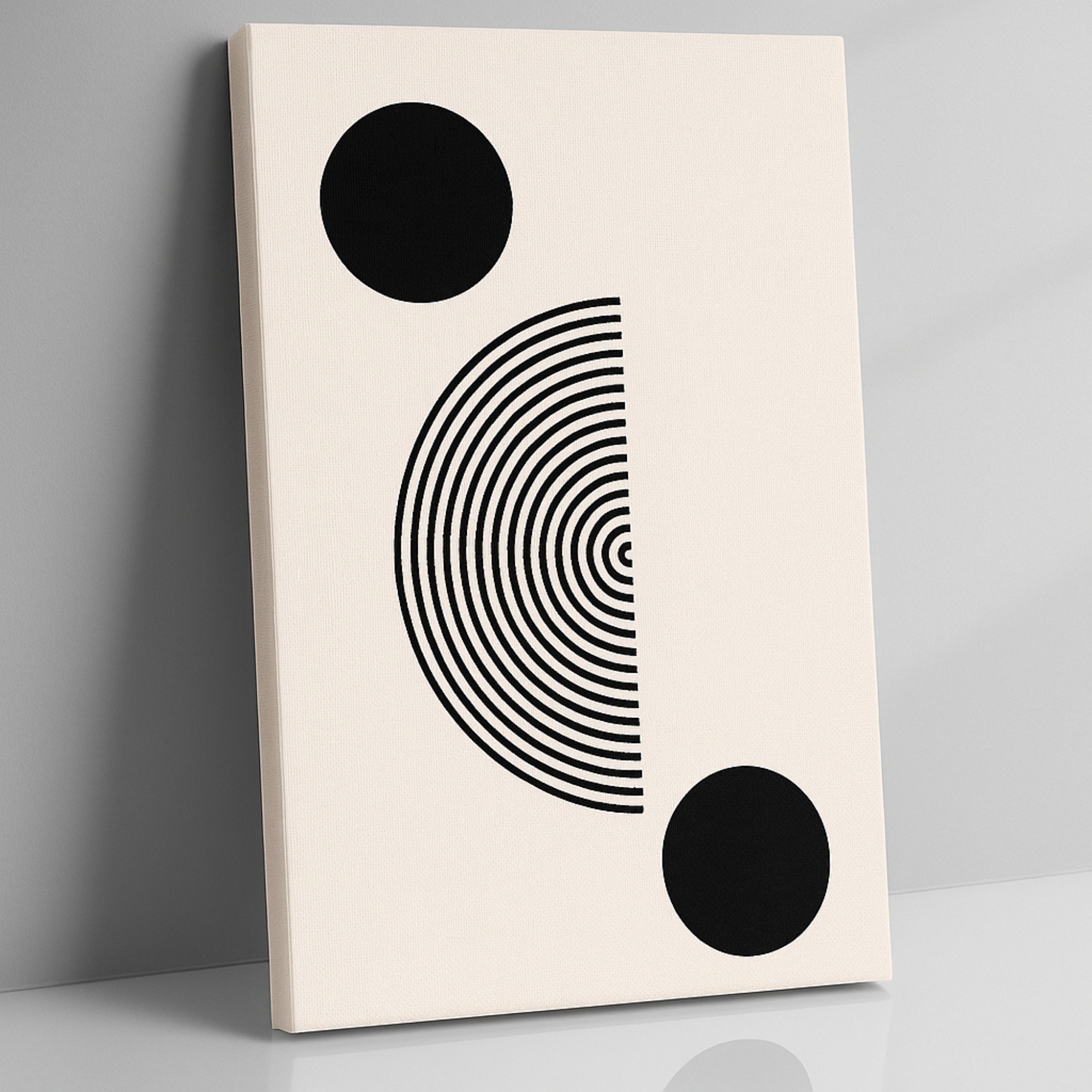 Discover balance with the Symmetry Eclipse Canvas Print. This timeless monochrome piece showcases bold half-circles and concentric black lines arranged in a minimalist eclipse form, symbolizing strength and simplicity. Its modern design makes it a versatile choice for interiors seeking refinement and bold style.